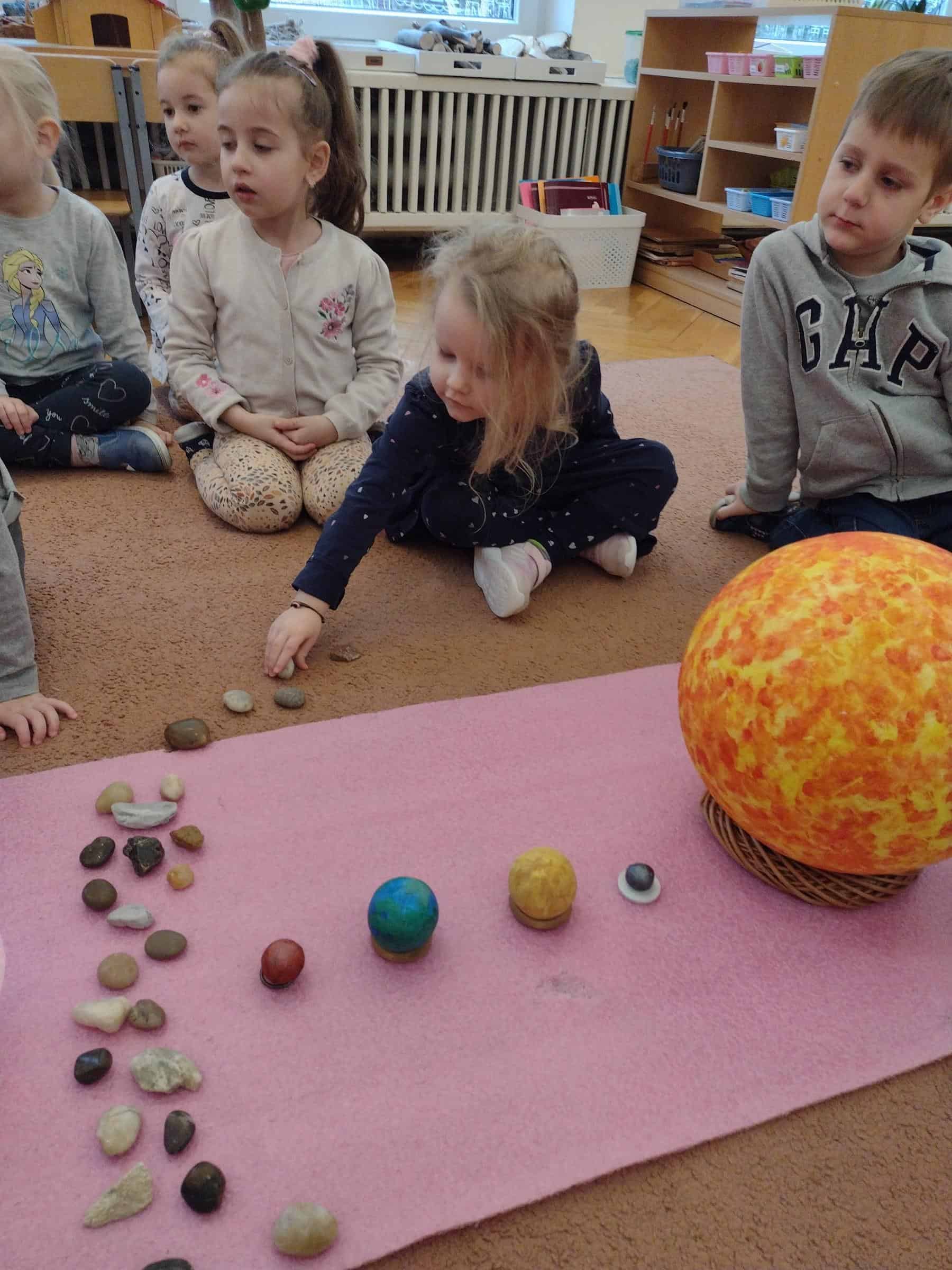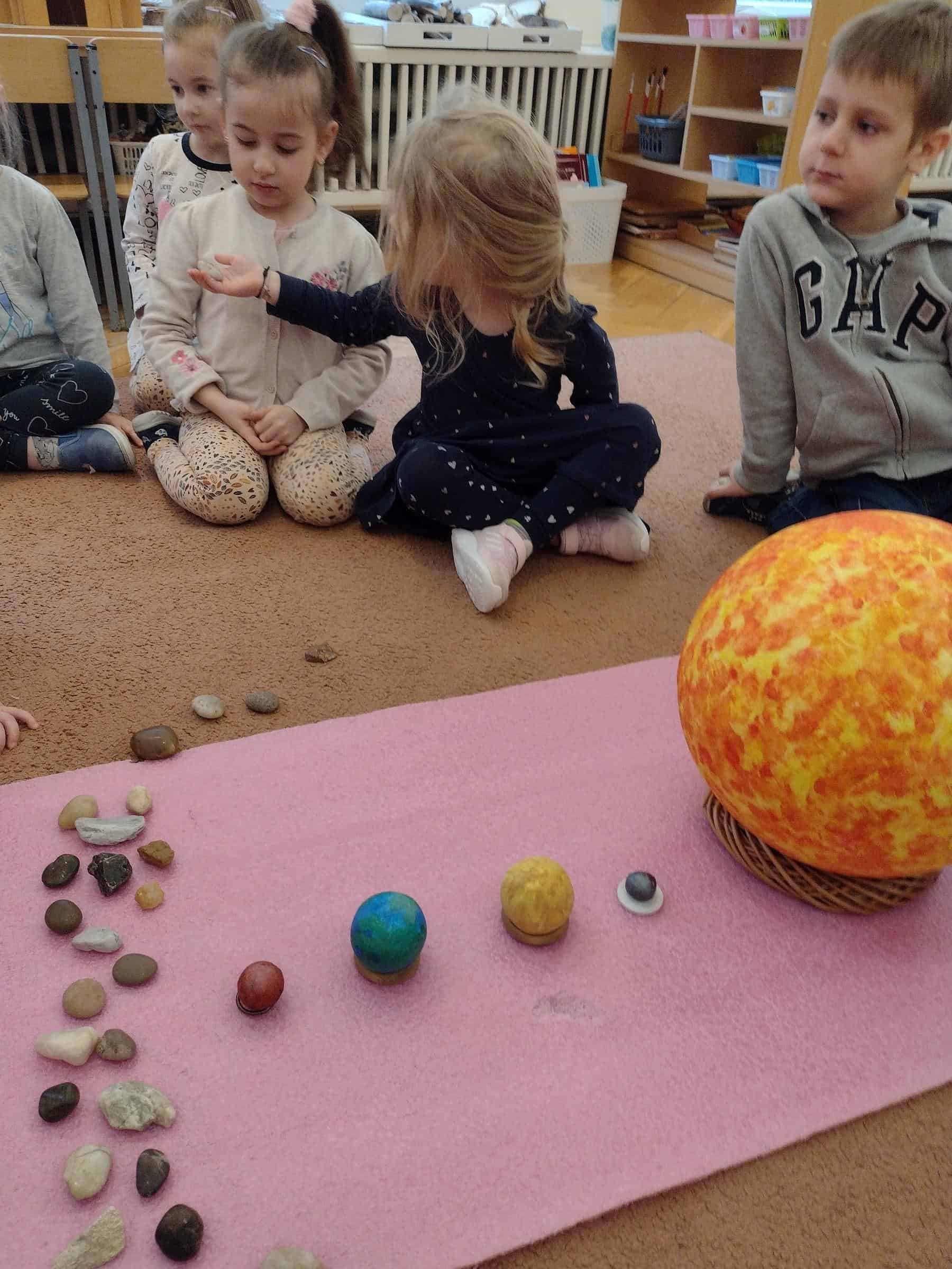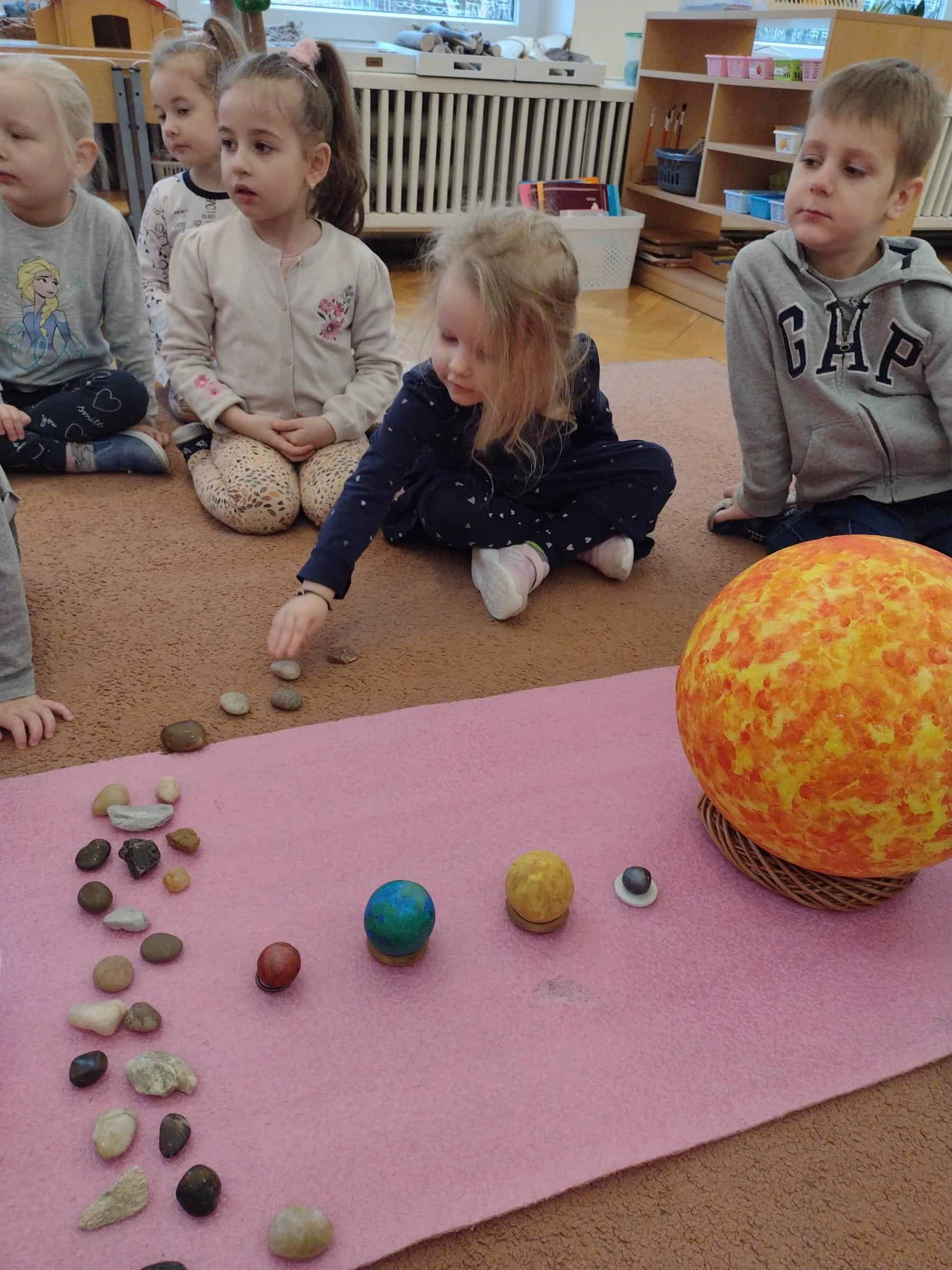 W ostatnim czasie, wraz z przedszkolakami z grupy pomarańczowej wybraliśmy się w przestrzeń kosmiczną. Dzieci poznały planety Układu Słonecznego (także w języku angielskim), dowiedziały się które planety mają powierzchnię skalistą, a które zbudowane są z gazów. Poznały także planety, które mają pierścienie oraz odkryły jakie inne ciała niebieskie oprócz gwiazd i planet krążą w kosmosie. Niektóre dzieci posiadały już wiedzę na temat planet, a dzięki zajęciom mogły ją poszerzyć i uzupełnić. Dzieci malowały też planety Układu Słonecznego farbami na dużym formacie i wykonały książeczki o planetach, które mogły zabrać do domu.