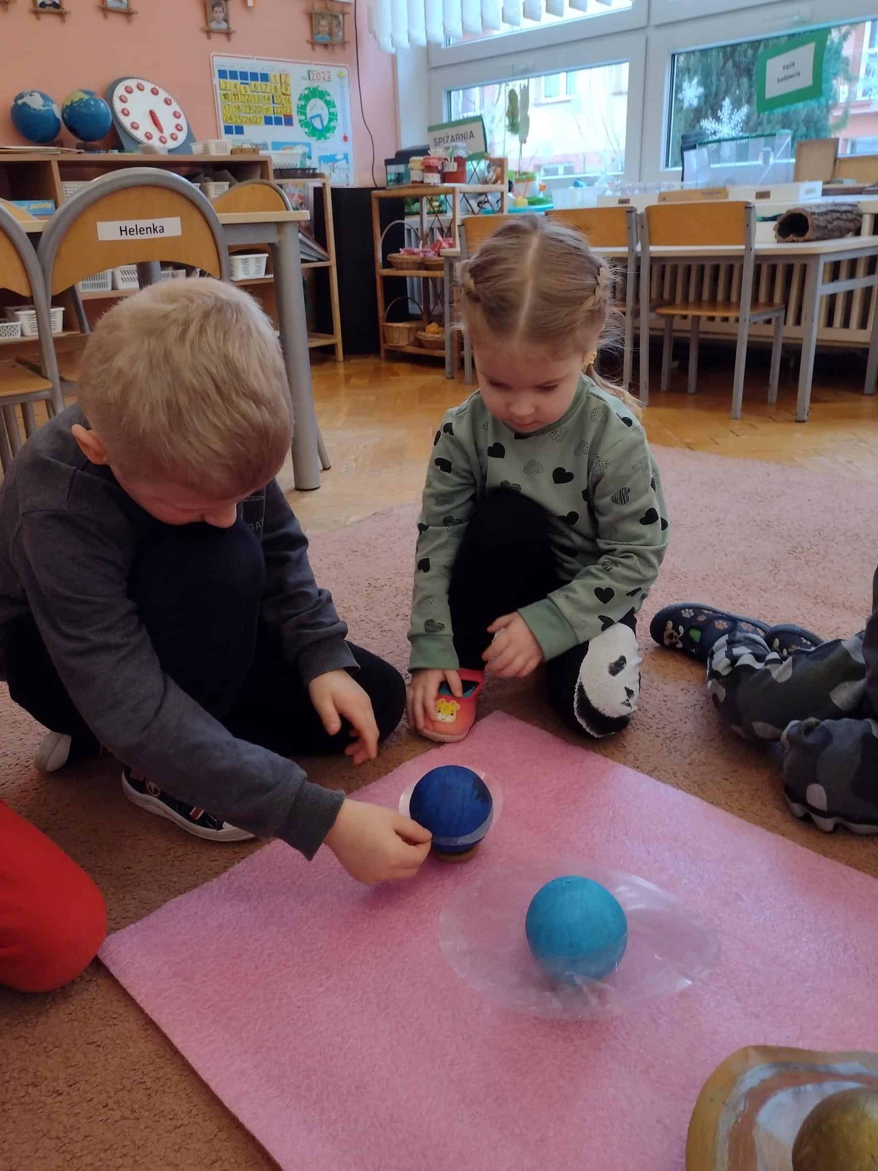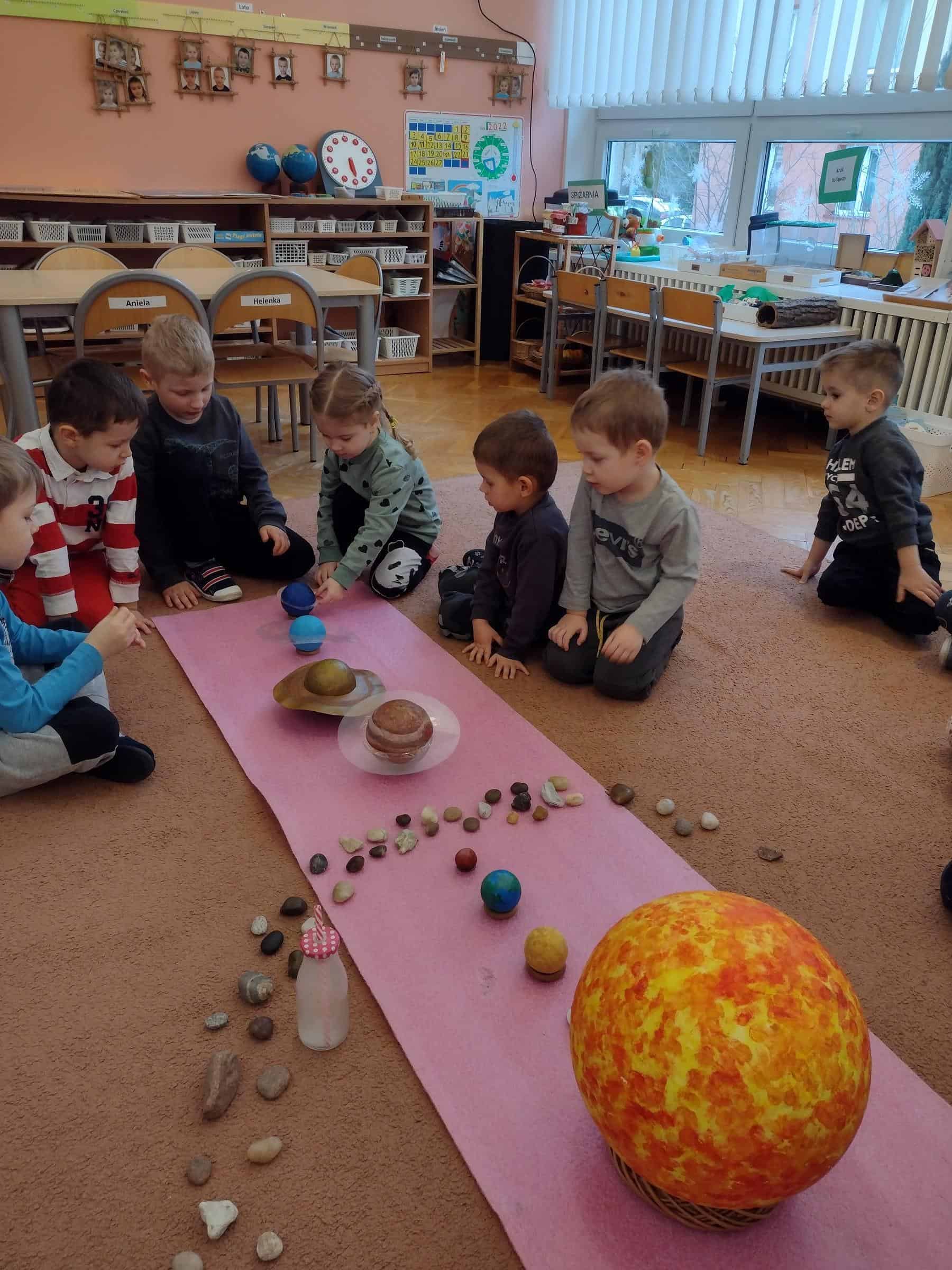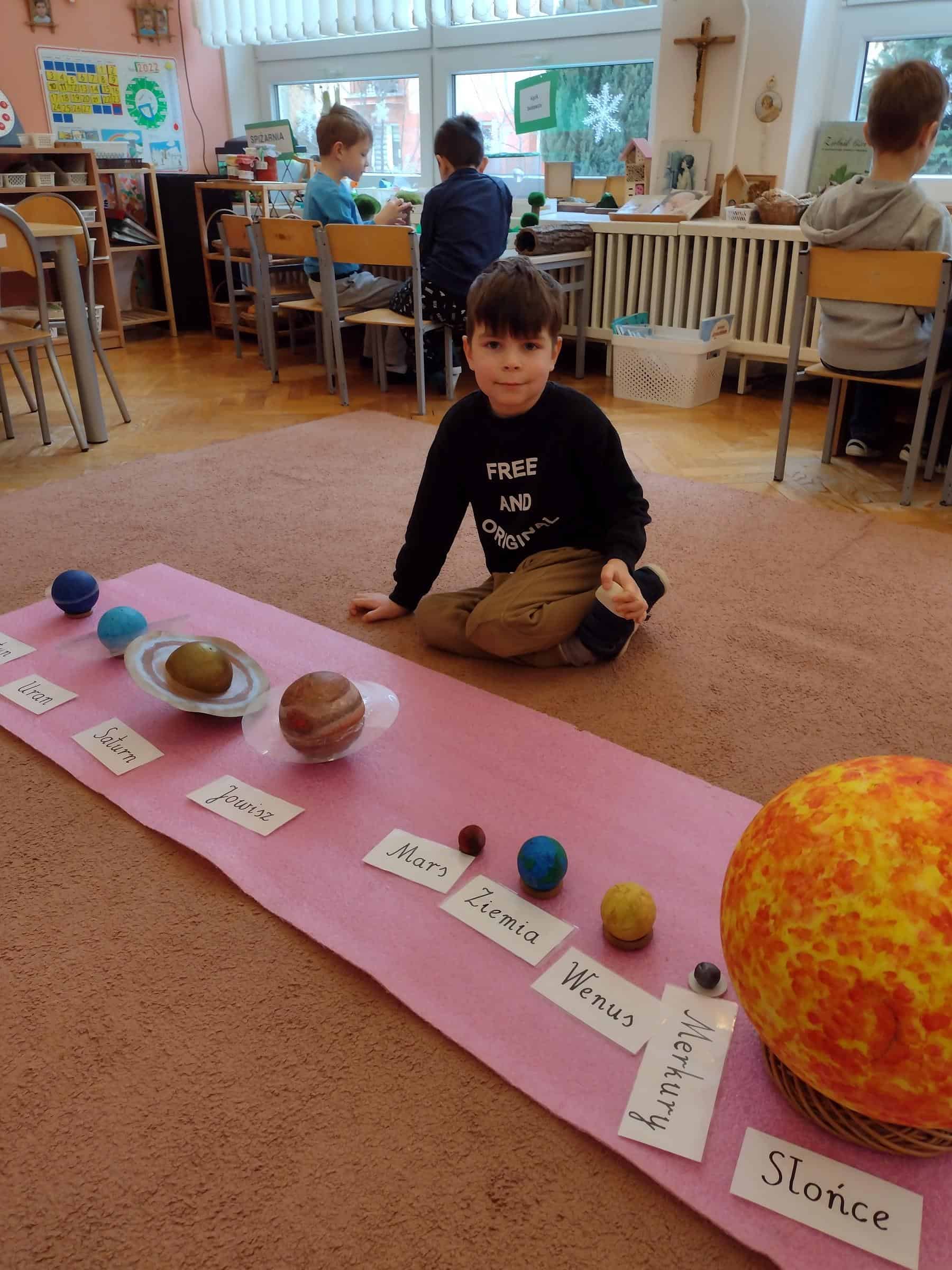 W ostatnim czasie, wraz z przedszkolakami z grupy pomarańczowej wybraliśmy się w przestrzeń kosmiczną. Dzieci poznały planety Układu Słonecznego (także w języku angielskim), dowiedziały się które planety mają powierzchnię skalistą, a które zbudowane są z gazów. Poznały także planety, które mają pierścienie oraz odkryły jakie inne ciała niebieskie oprócz gwiazd i planet krążą w kosmosie. Niektóre dzieci posiadały już wiedzę na temat planet, a dzięki zajęciom mogły ją poszerzyć i uzupełnić. Dzieci malowały też planety Układu Słonecznego farbami na dużym formacie i wykonały książeczki o planetach, które mogły zabrać do domu.