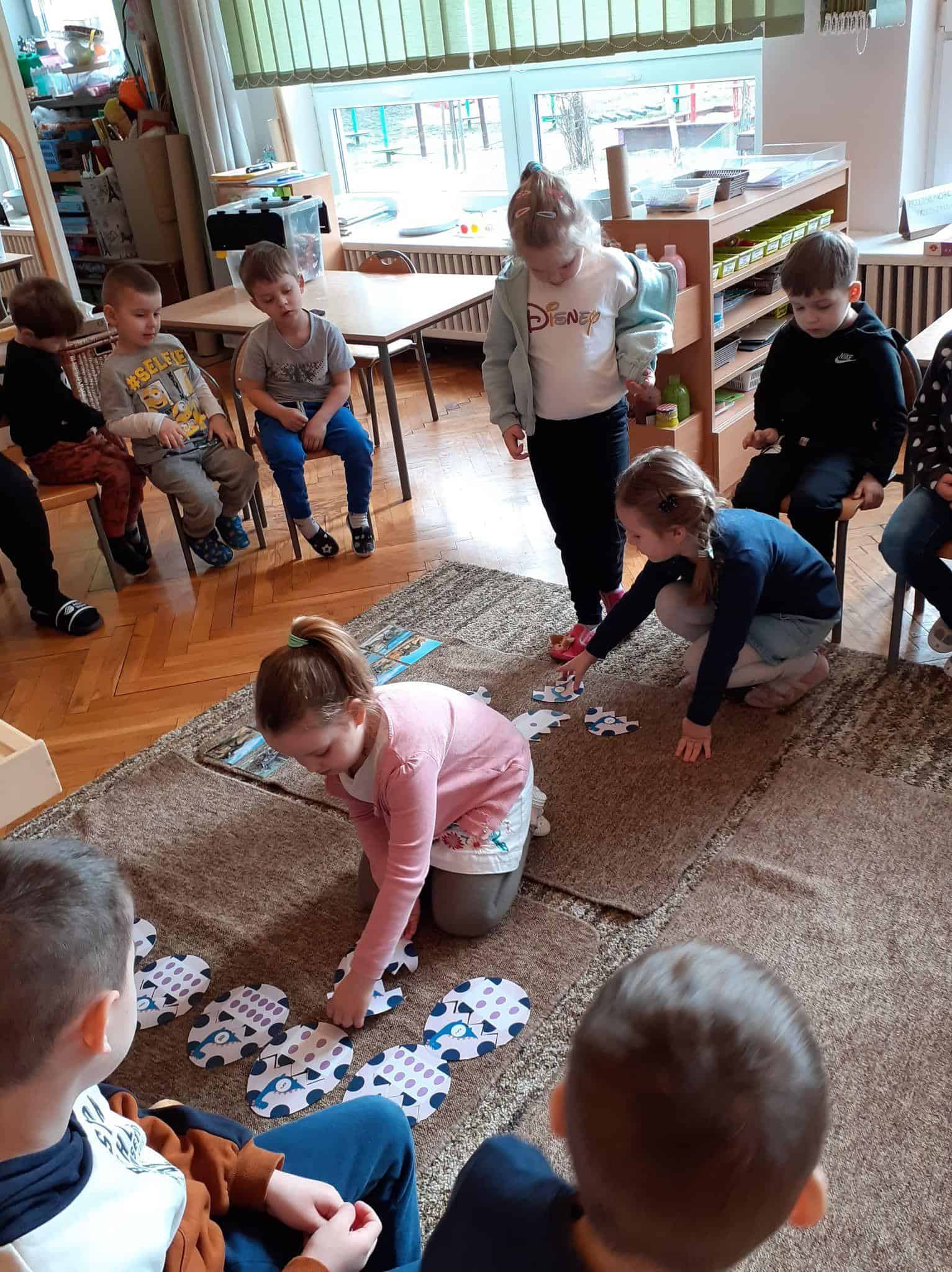 Nasze świętowanie zaczęliśmy od kart trójdzielnych, gdzie dzieci nazywały dinozaury, czytały i układały podpisy do właściwych obrazków, opisywały ich wygląd, określały budowę oraz wielkość. Dopełnieniem tych treści stały się dla nas figurki dinozaurów, które dzieci łączyły z właściwą kartą. Wiedza naszych przedszkolaków w tym zakresie była bardzo duża. Większość dzieci bez problemu operowała nazwami dinozaurów, klasyfikowała, opowiadała ciekawostki o ich życiu. Widać, że był to temat bardzo im bliski.