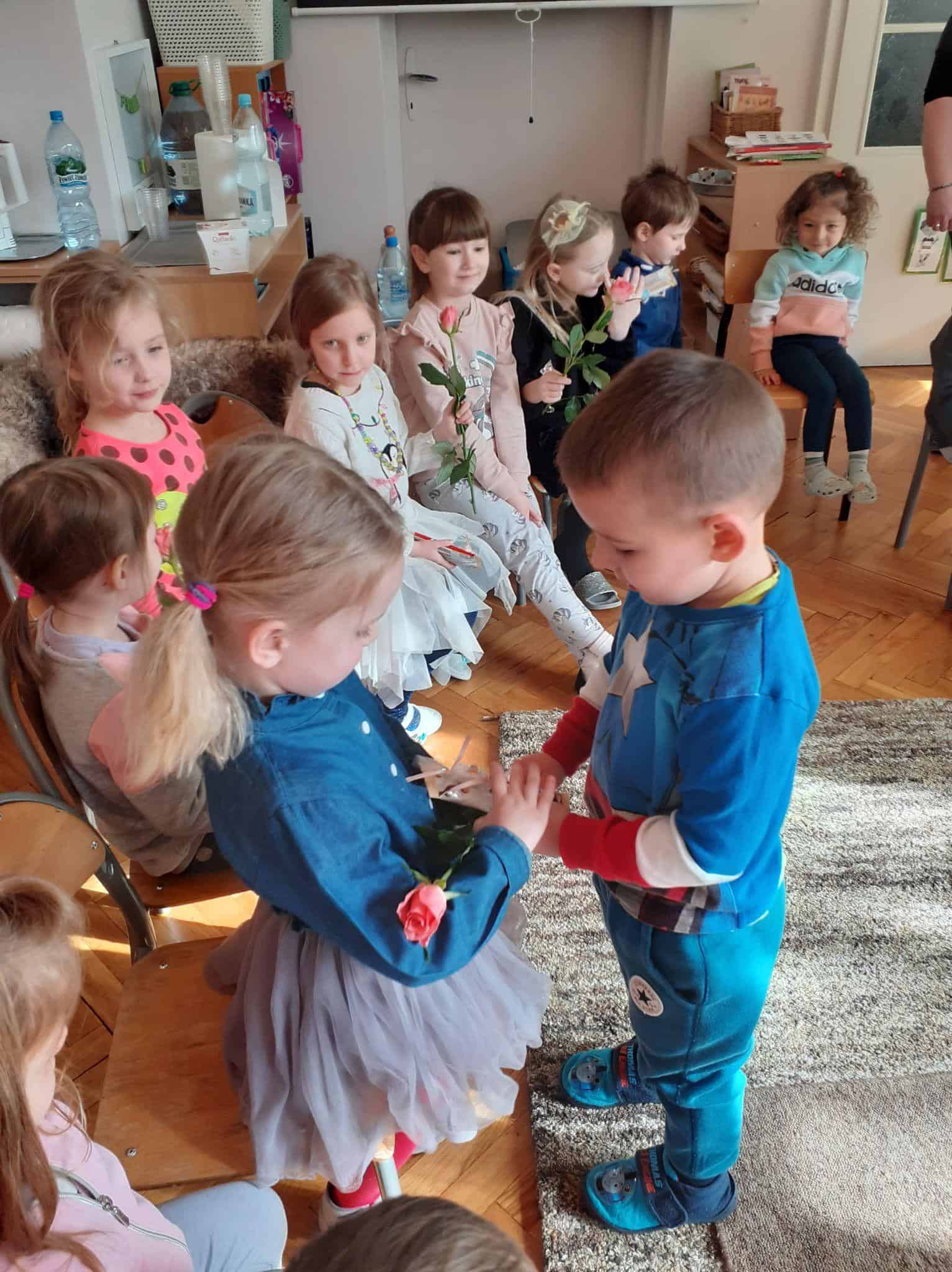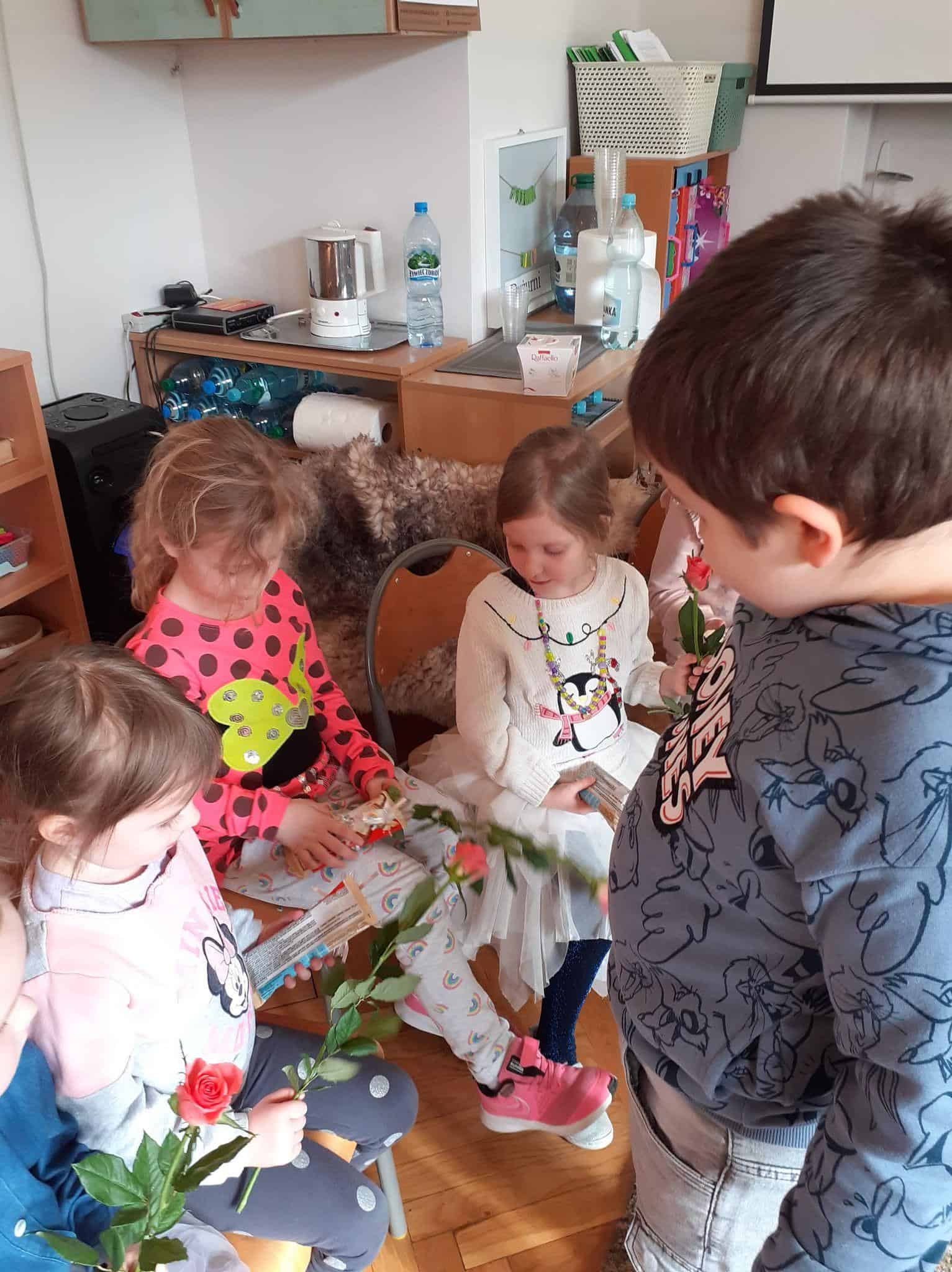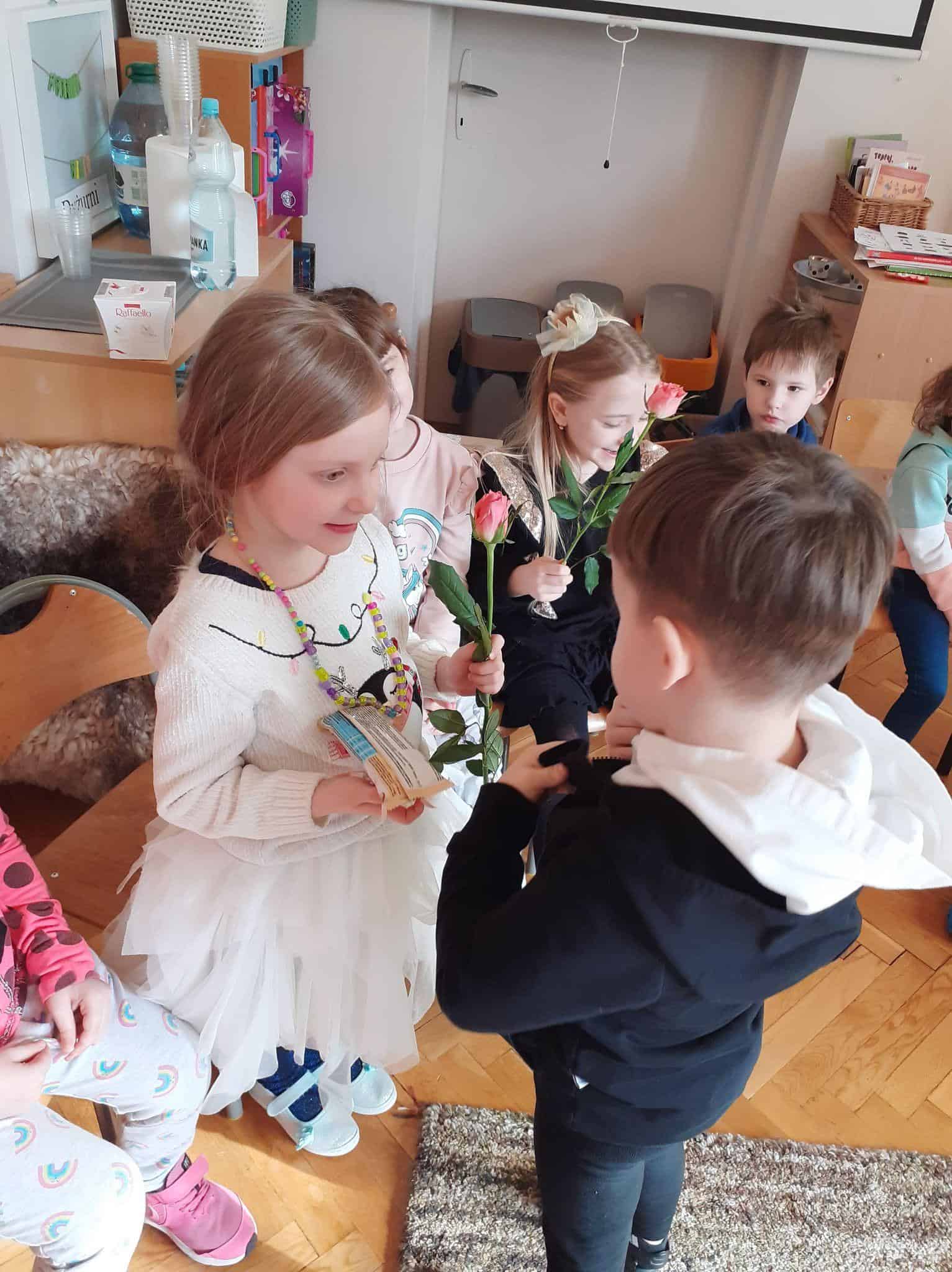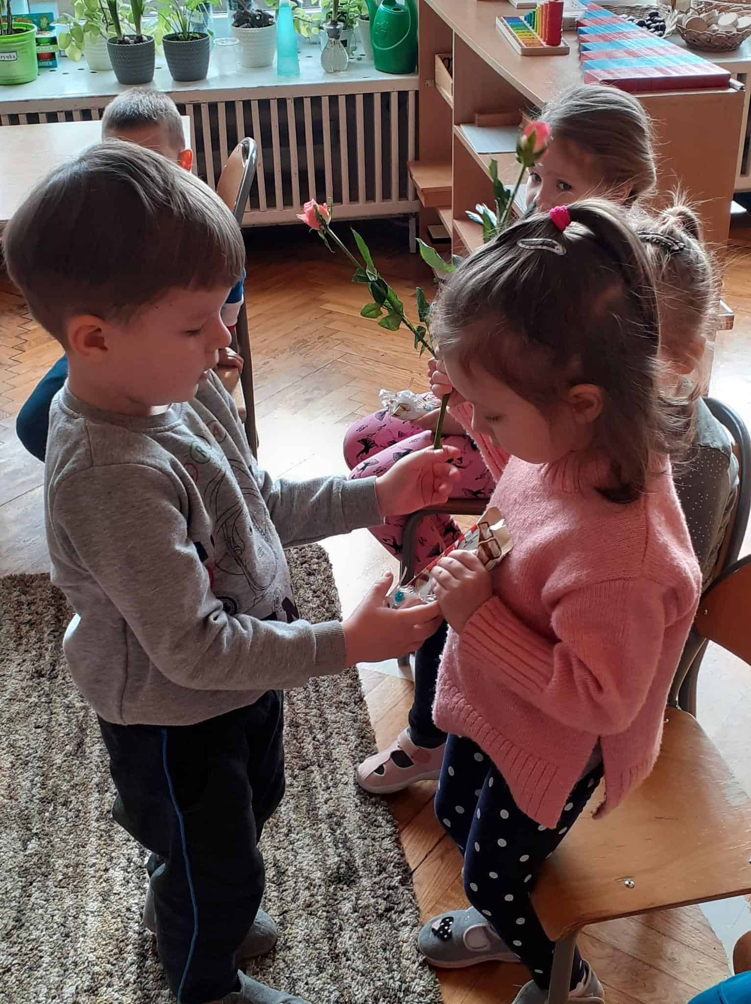 Tak było i w naszej grupie. Męska jej część stanęła na wysokości zadania i spisała się na medal 🙂 Chłopcy złożyli dziewczynkom życzenia, oraz wręczyli przygotowane prezenty. Z dziewczęcych twarzy uśmiech nie schodził przez calutki dzień, a chłopcy zachowywali się jak prawdziwi dżentelmeni. Byli przemili, uczynni i sympatyczni:) Cały dzień upłynął wszystkim w atmosferze radości oraz wzajemnego okazywania przyjaźni i szacunku.