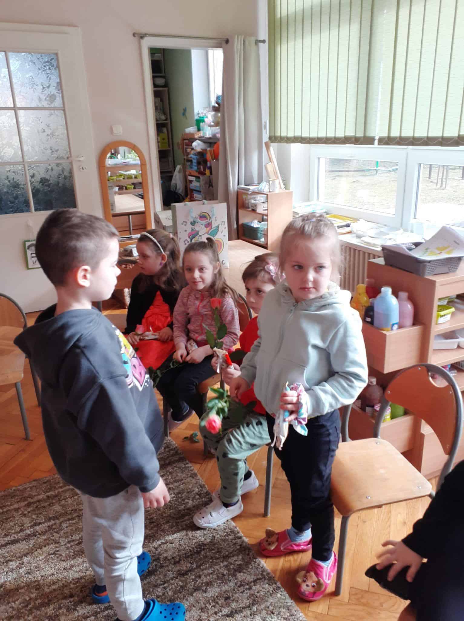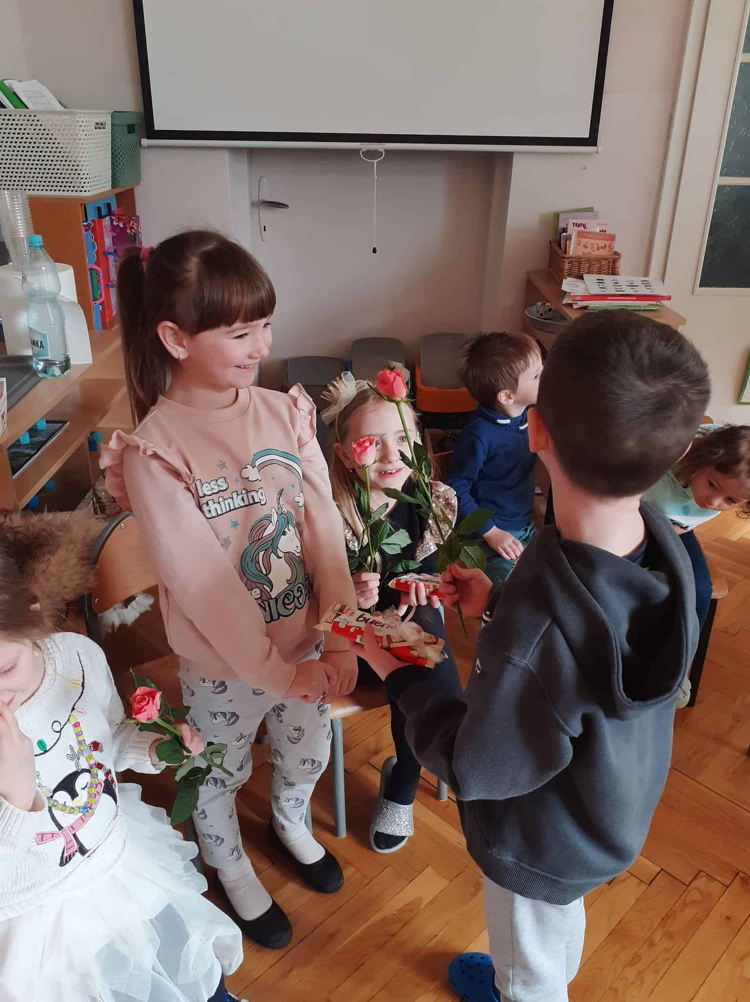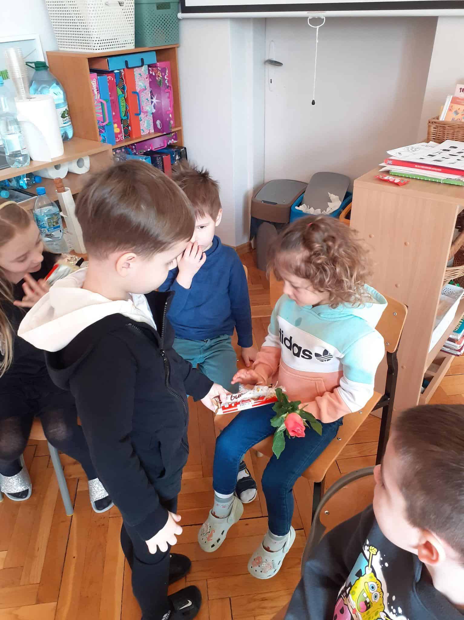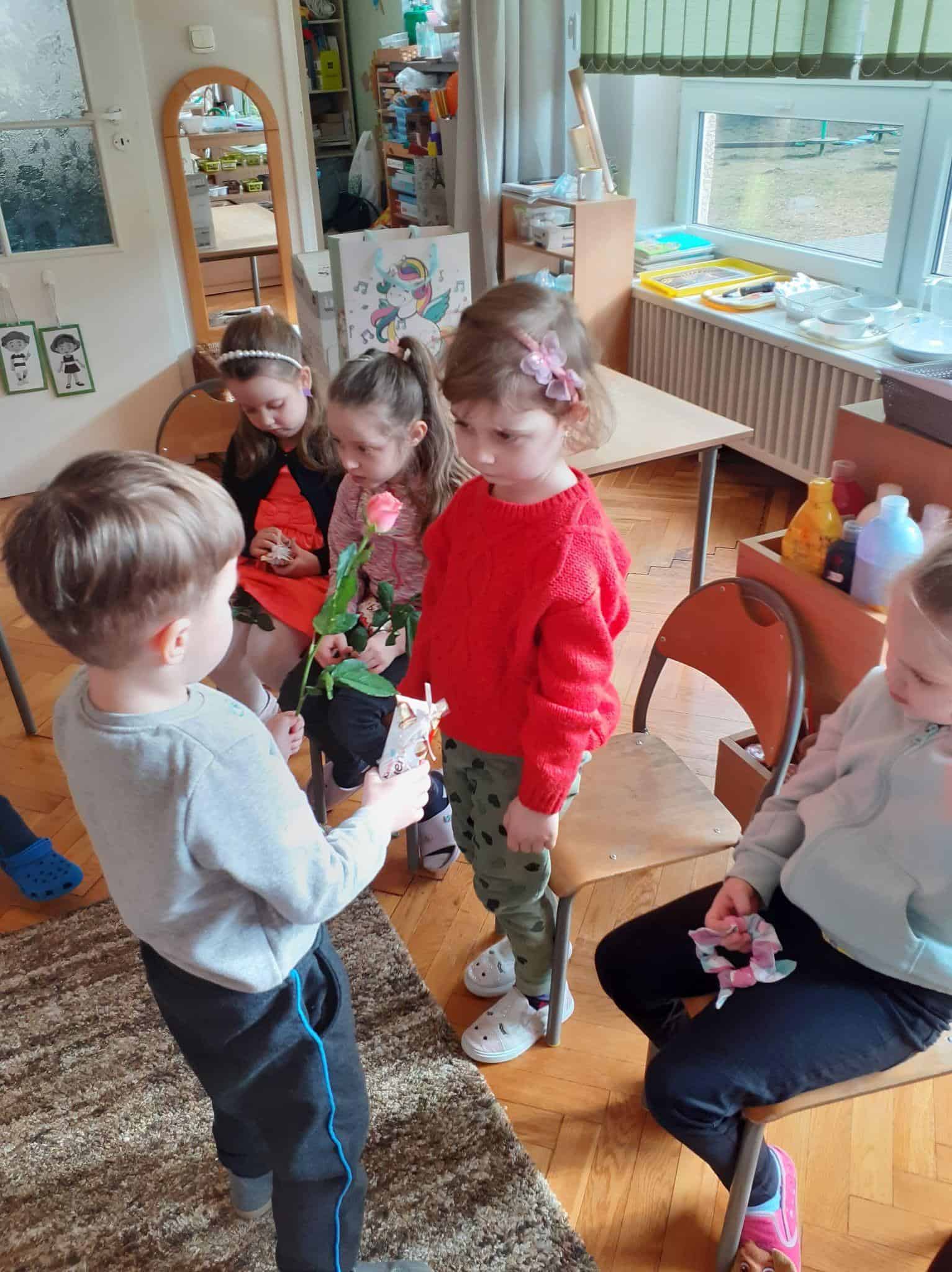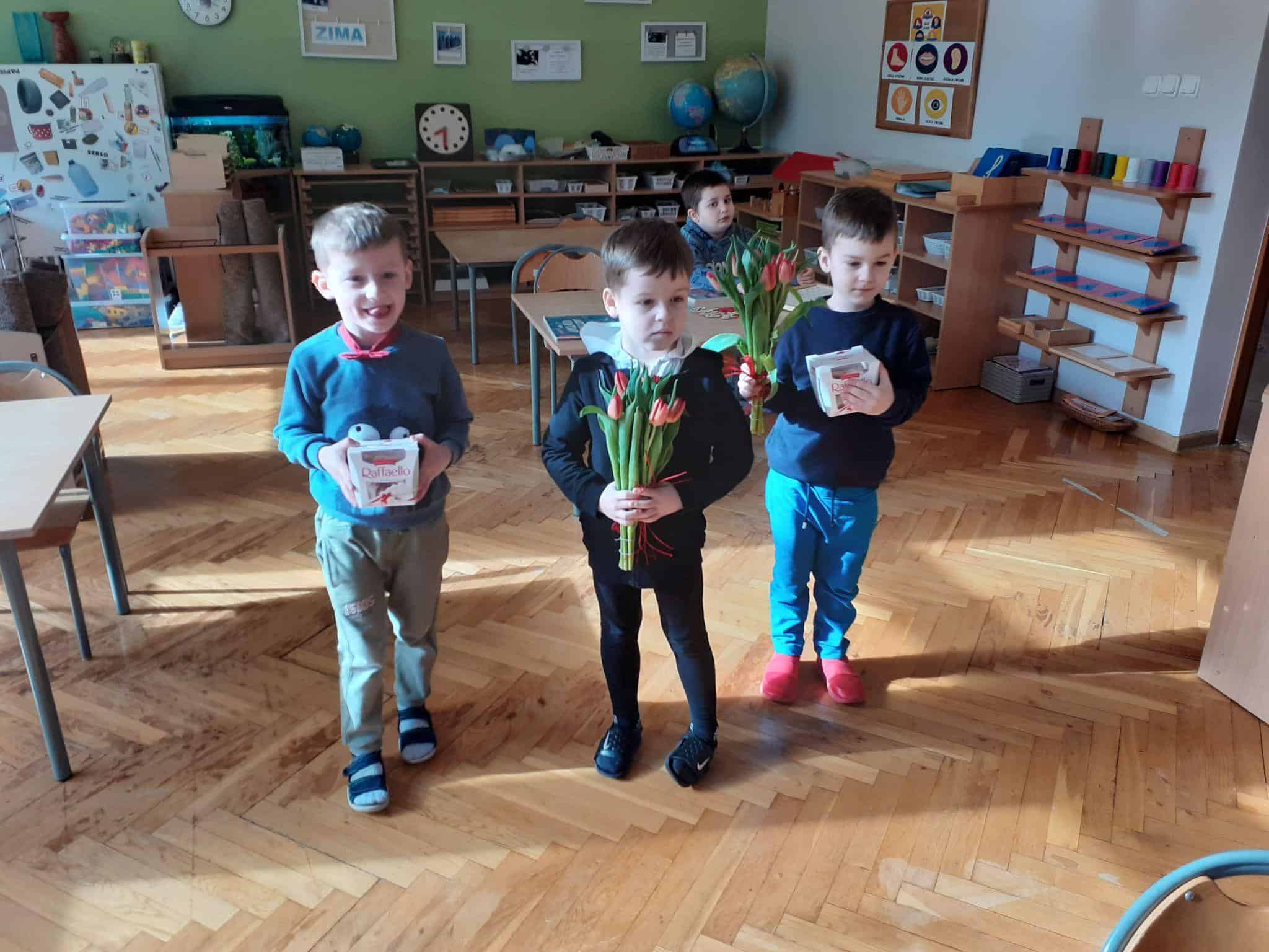Tak było i w naszej grupie. Męska jej część stanęła na wysokości zadania i spisała się na medal 🙂 Chłopcy złożyli dziewczynkom życzenia, oraz wręczyli przygotowane prezenty. Z dziewczęcych twarzy uśmiech nie schodził przez calutki dzień, a chłopcy zachowywali się jak prawdziwi dżentelmeni. Byli przemili, uczynni i sympatyczni:) Cały dzień upłynął wszystkim w atmosferze radości oraz wzajemnego okazywania przyjaźni i szacunku.