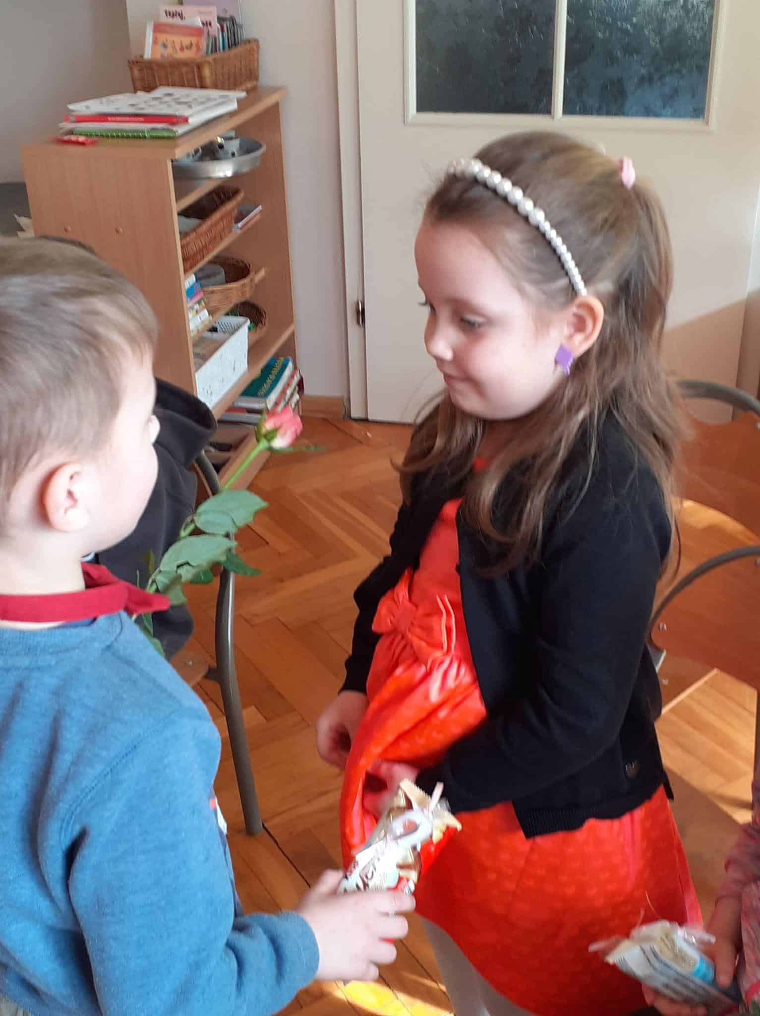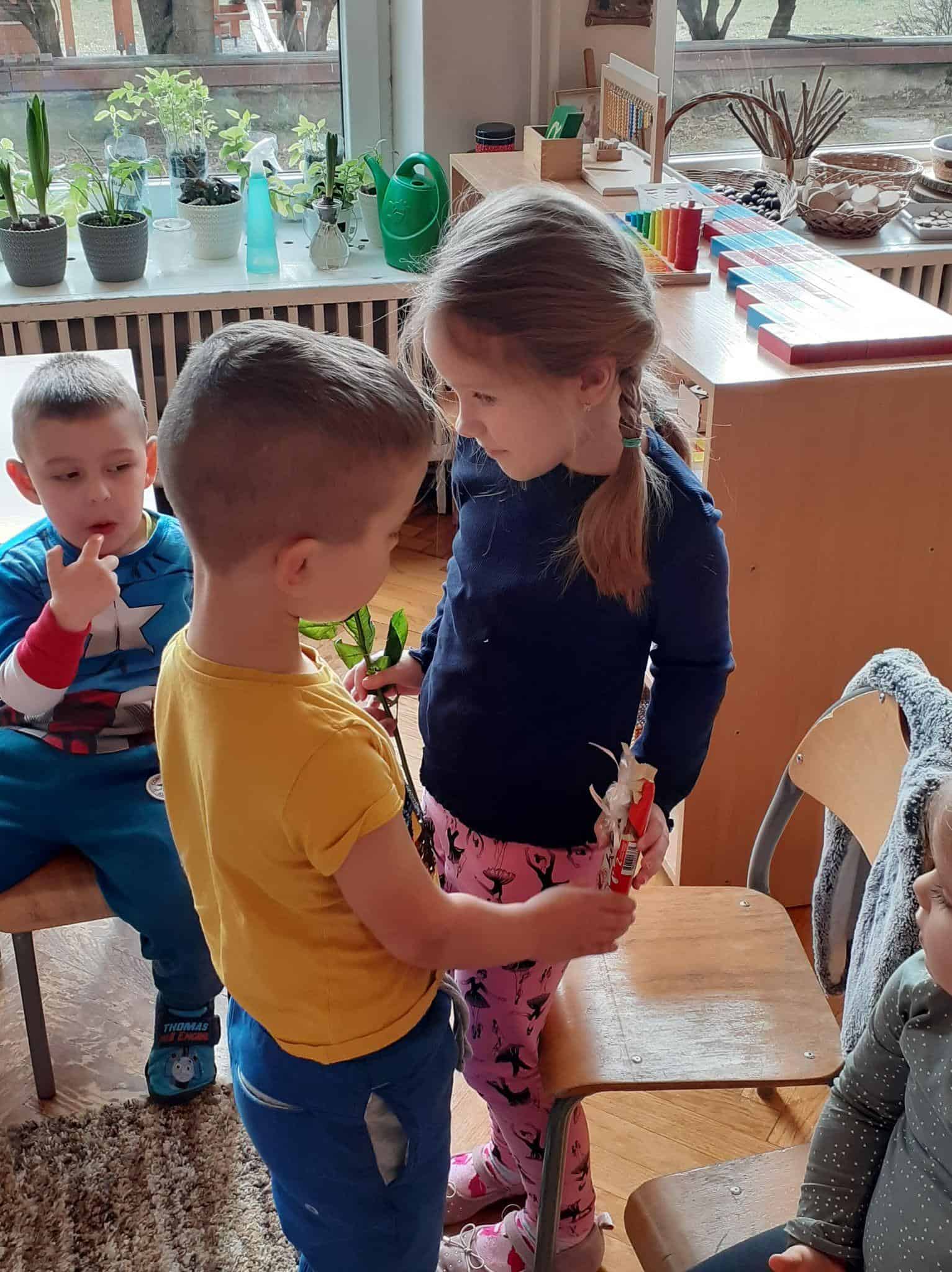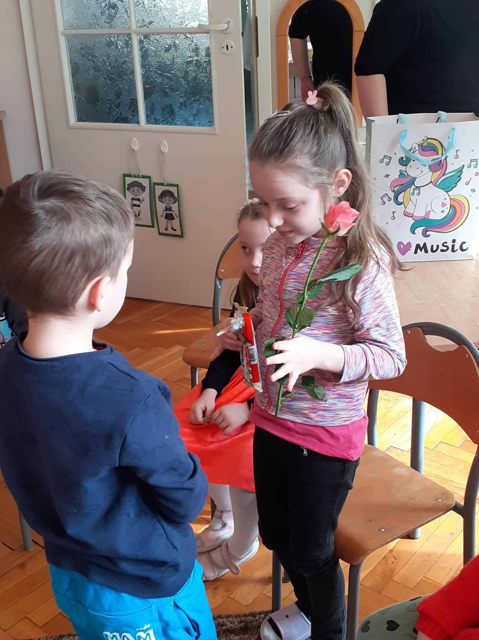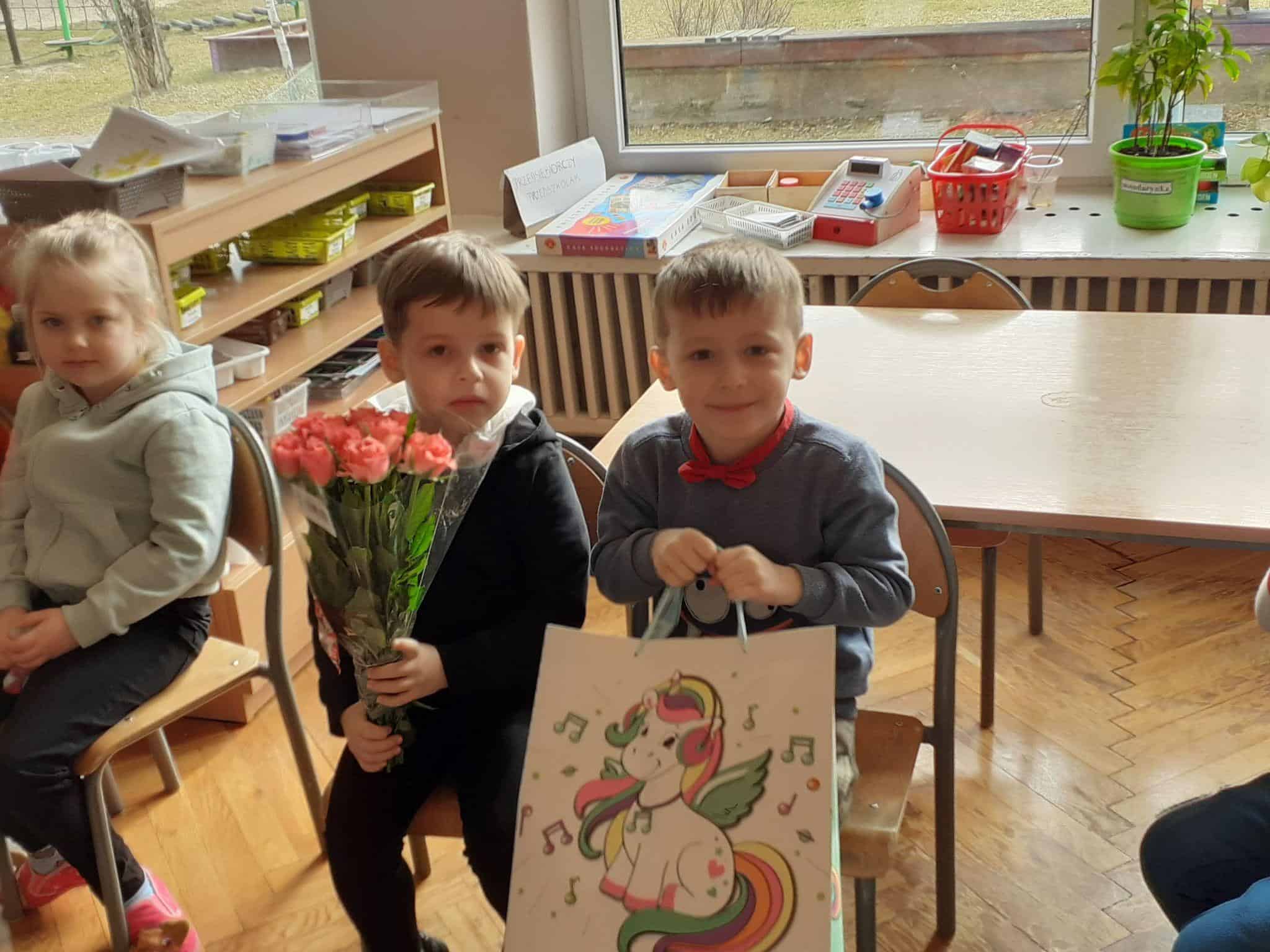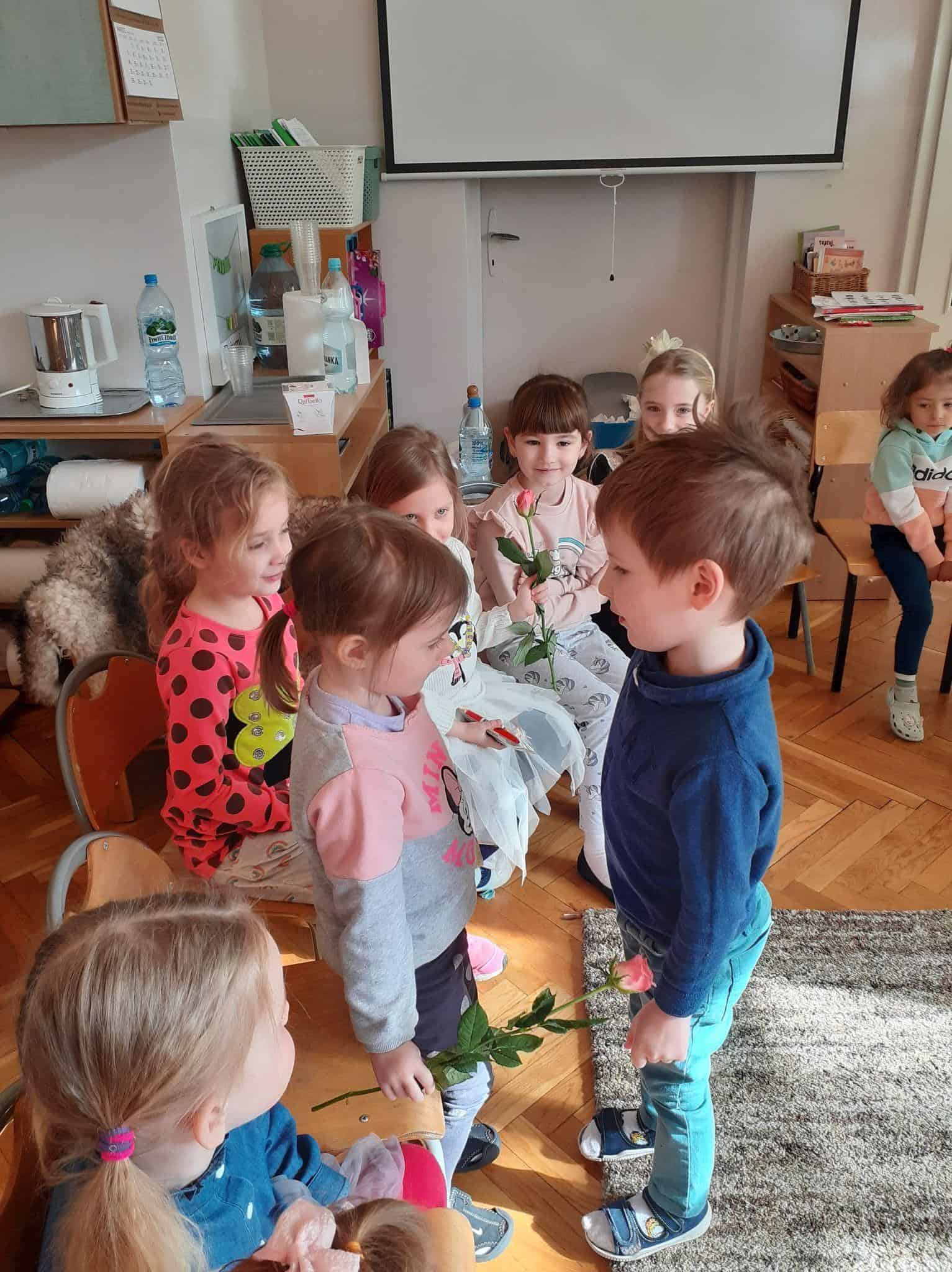 Tak było i w naszej grupie. Męska jej część stanęła na wysokości zadania i spisała się na medal 🙂 Chłopcy złożyli dziewczynkom życzenia, oraz wręczyli przygotowane prezenty. Z dziewczęcych twarzy uśmiech nie schodził przez calutki dzień, a chłopcy zachowywali się jak prawdziwi dżentelmeni. Byli przemili, uczynni i sympatyczni:) Cały dzień upłynął wszystkim w atmosferze radości oraz wzajemnego okazywania przyjaźni i szacunku.