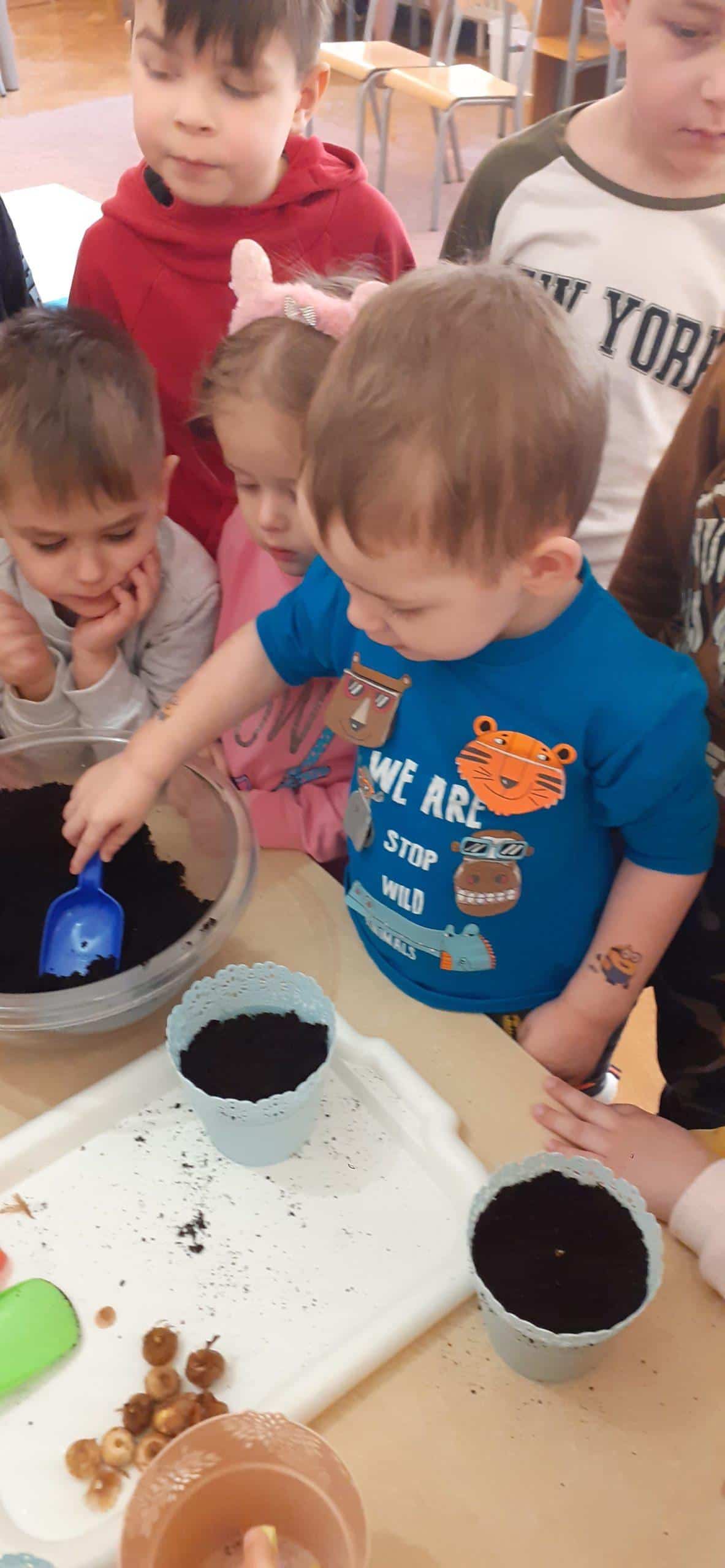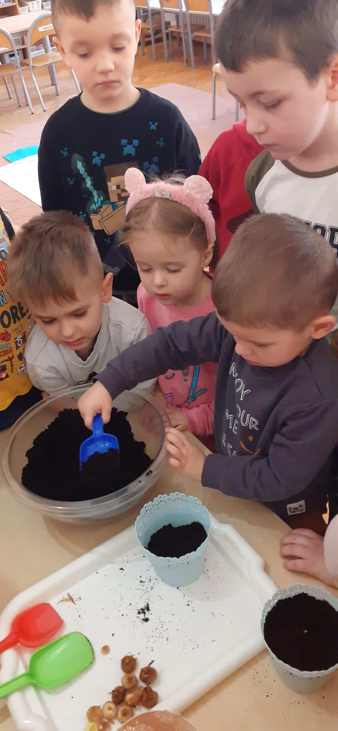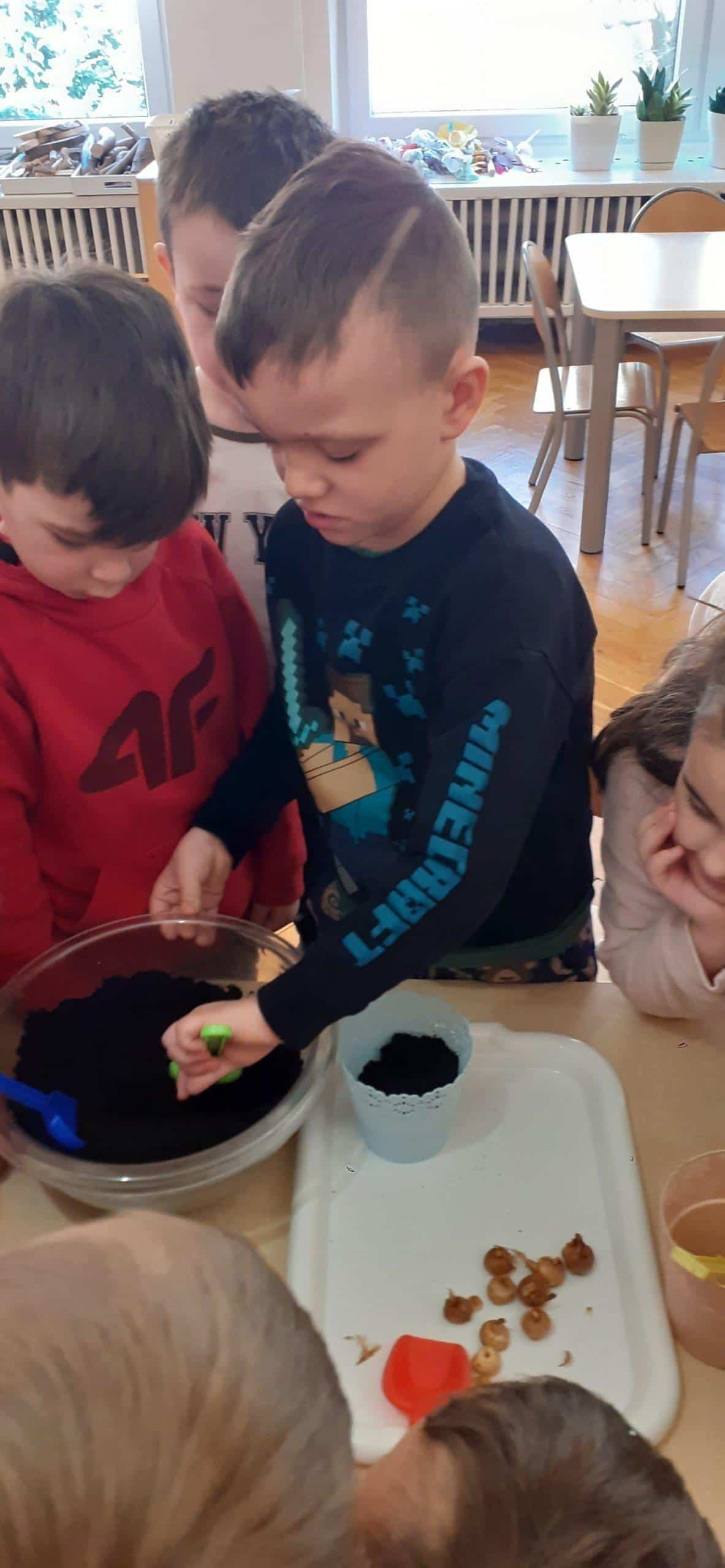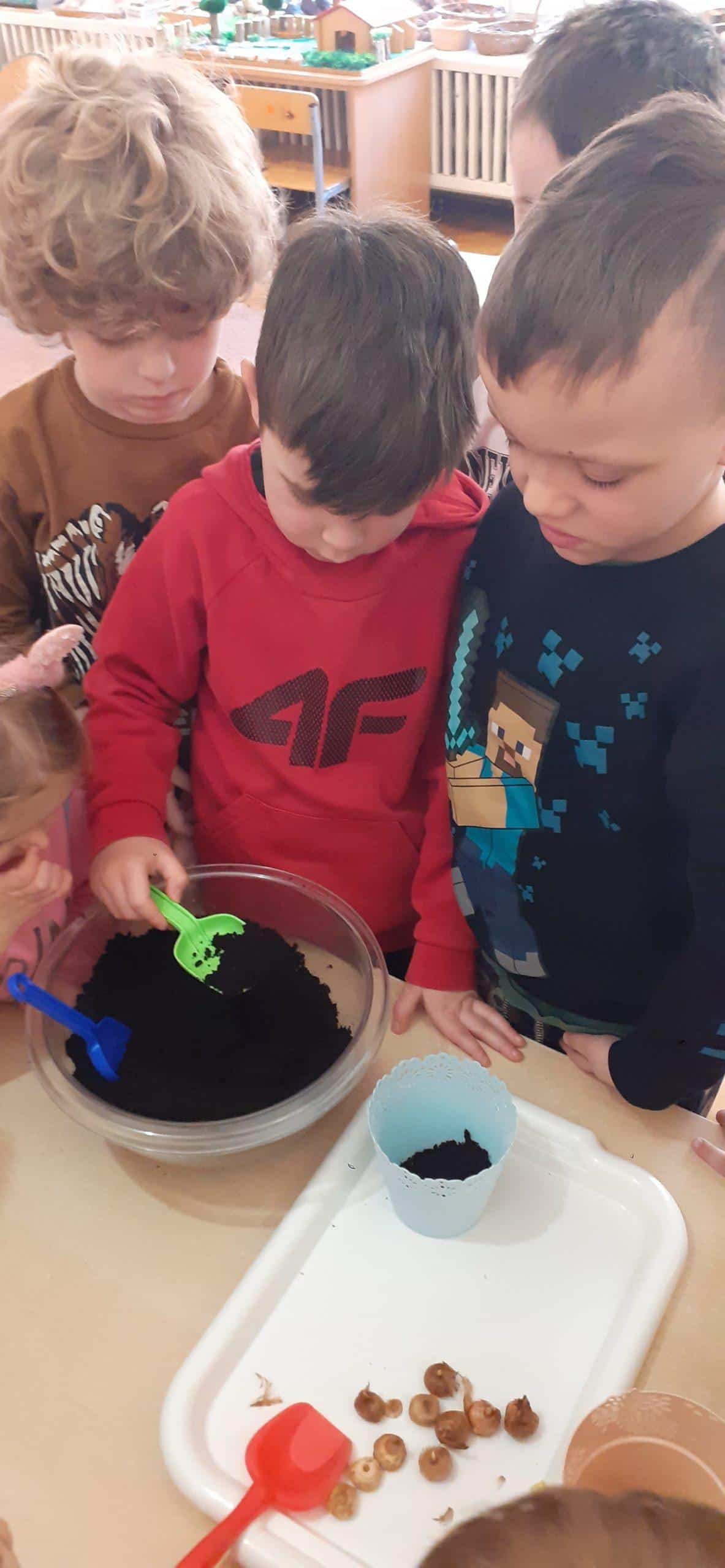 Lekcję o kwiatach cebulowych dzieci mają już za sobą . Odbyła się ona jeszcze jesienią, na terenie przyrodniczej ścieżki edukacyjnej, kiedy to dzieci dowiedziały się , że aby wiosną w ogródku pojawiły się tulipany, szafirki , krokusy, hiacynty , to trzeba jeszcze w czasie jesieni zasadzić je do ziemi. I tak zrobiliśmy , teraz niecierpliwie czekamy na efekty. W tym tygodniu postanowiliśmy założyć hodowlę kwiatów cebulowych w sali zajęć, aby zrobiło się w niej tak wiosennie. Wybór padł na krokusy. Zgromadziliśmy potrzebne rzeczy, obejrzeliśmy cebulki kwiatowe, zasadziliśmy, podlaliśmy , ustawiliśmy na parapecie i teraz tylko czekamy, aż pojawią się piękne kwiaty. Teraz będziemy obserwować proces wzrostu.