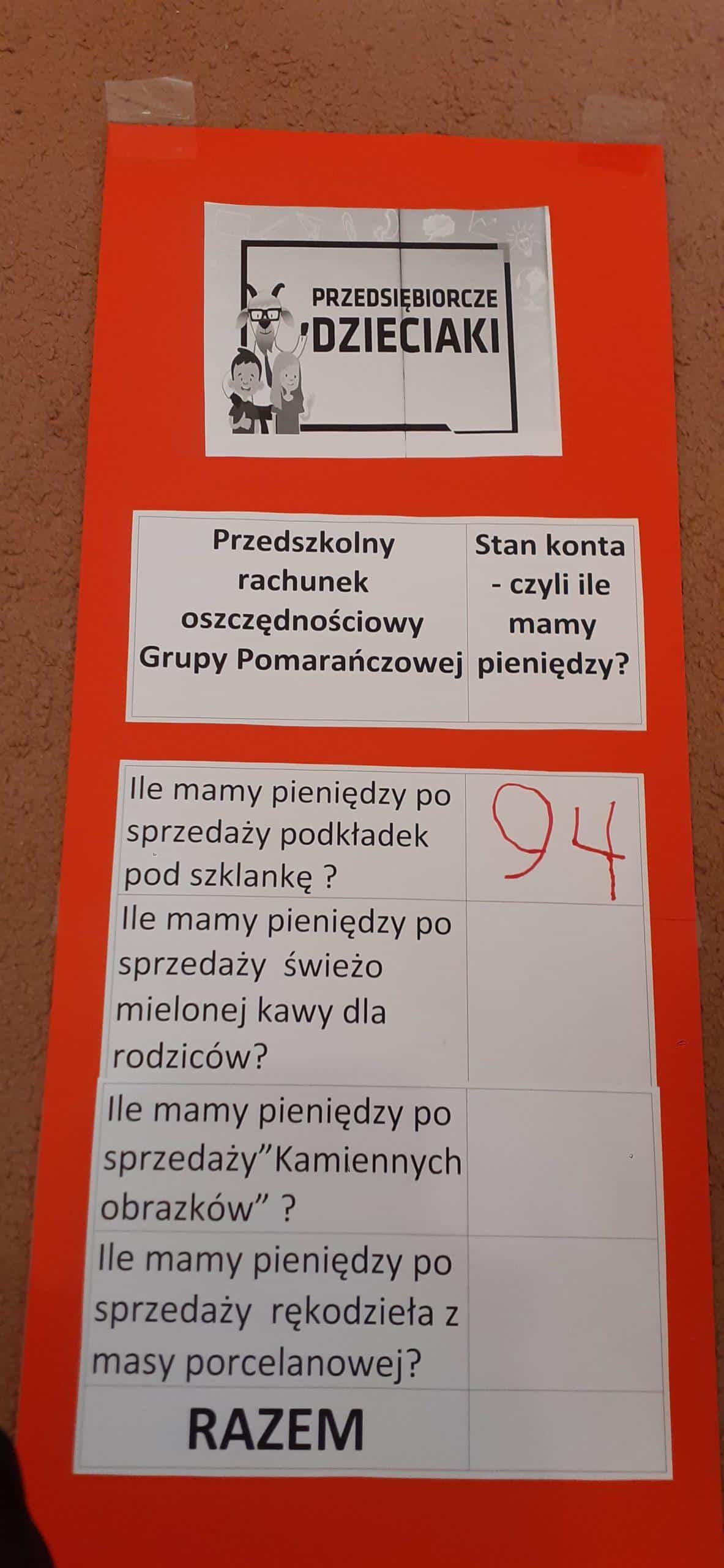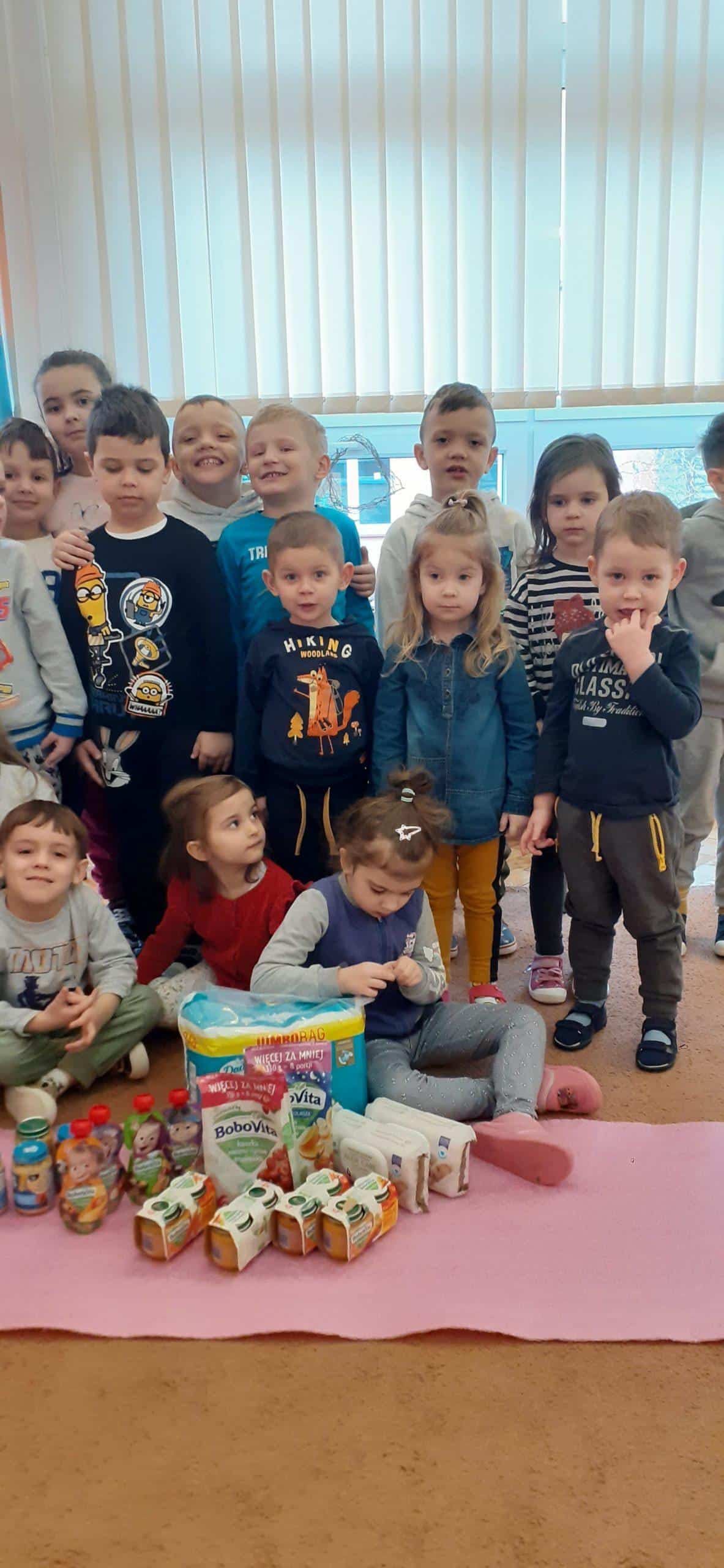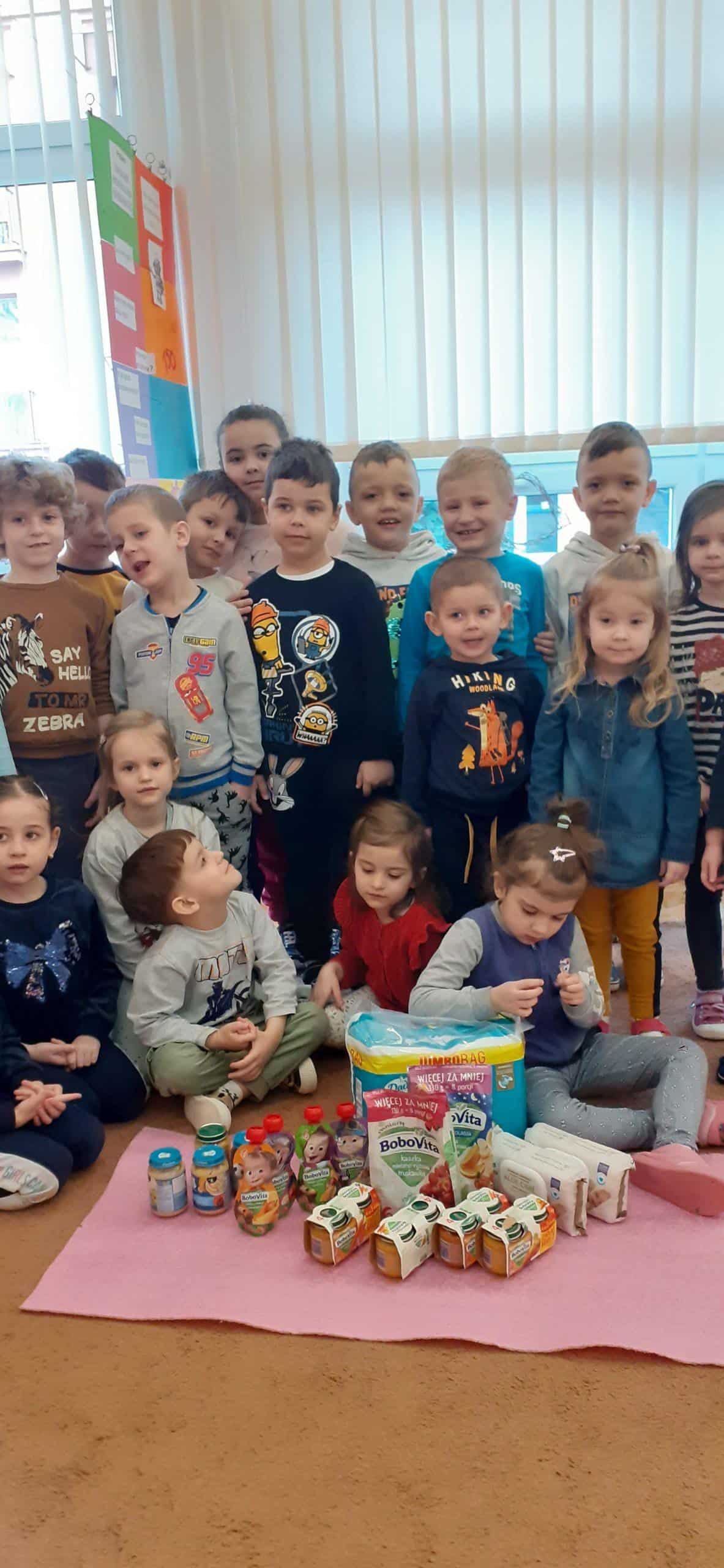 W tym roku szkolnym realizujemy innowację pedagogiczną ” Rozwijanie idei przedsiębiorczości wśród dzieci w wieku przedszkolnym”. W ramach tej innowacji powstał projekt realizowany w naszej grupie pt. ” Przedsiębiorcze dzieciaki”, którego celem jest między innymi odkrycie przez dzieci tajemnic pieniądza, zarabiania, a przede wszystkim oszczędzania. Zorganizowana sprzedaż drewnianych podkładek pod kubeczki przerosła nasze oczekiwania. Dzieci w wyniku sprzedażny podkładek wśród rodziców i pracowników przedszkola zgromadziły 188 zł. To spora kwota. Ale w ostatnim czasie starsze dzieci z naszej grupy inicjowały rozmowy o sytuacji na Ukrainie , opowiadały o tym w jaki sposób Rodzice angażują się w pomoc dla uchodźców. Była to doskonała okazja , aby w tę pomoc zaangażować również dzieci. W wyniku różnych rozmów z dziećmi powstał pomysł przeznaczenia połowy środków finansowych zgromadzonych w toku sprzedaży na zakup najpotrzebniejszych artykułów dla dzieci uchodźców. Kwotę 94 zł zarejestrowano na przedszkolnym koncie oszczędnościowym, drugie 94 zł przeznaczono na zakup pampersów, kaszek , musów owocowych, soczków dla dzieci, dań i deserów w słoiczkach oraz nawilżających chusteczek. To piękna decyzja dzieci świadcząca o ich dużej wrażliwości i umiejętności reagowania na potrzeby innych . BRAWO !