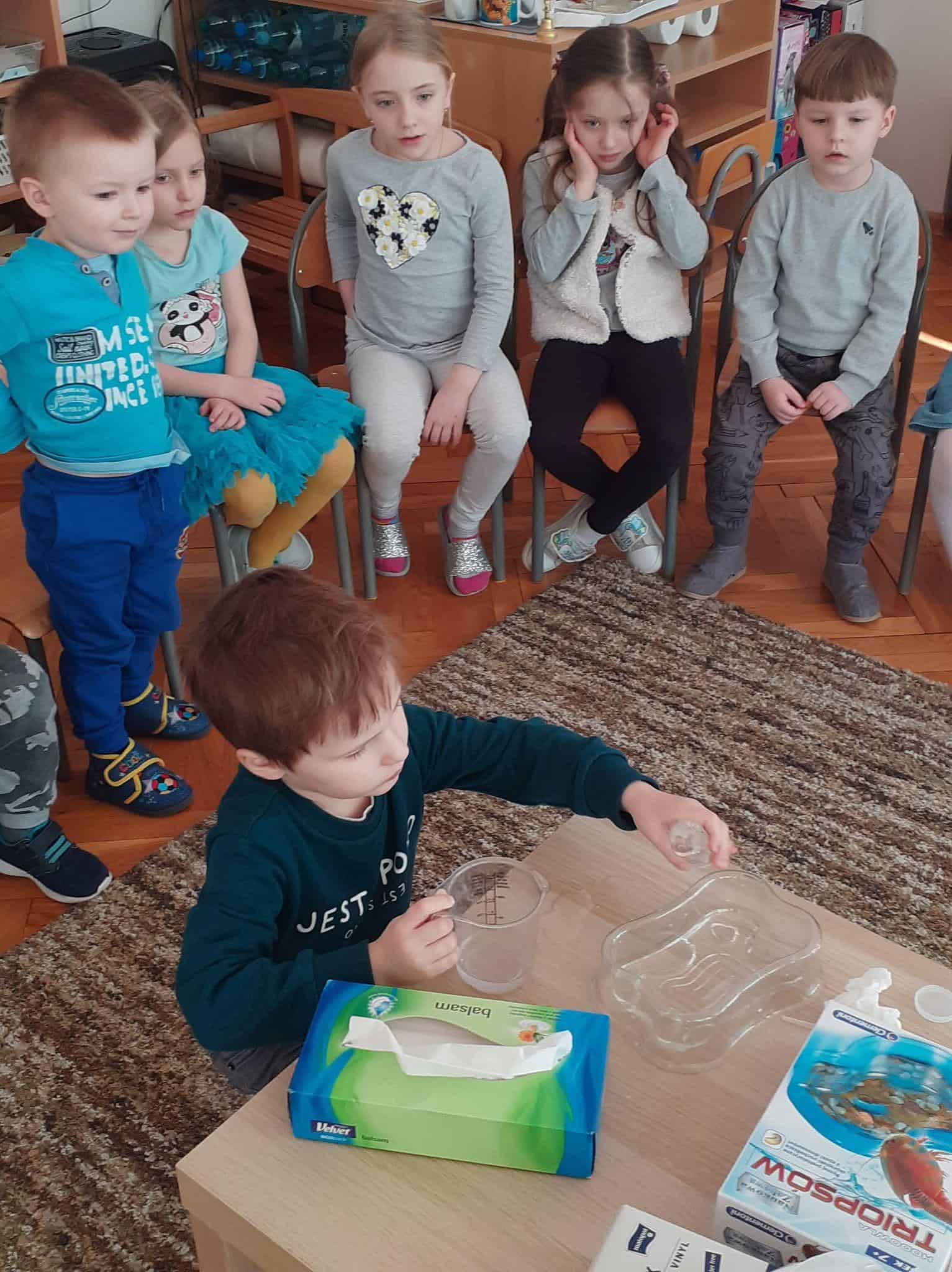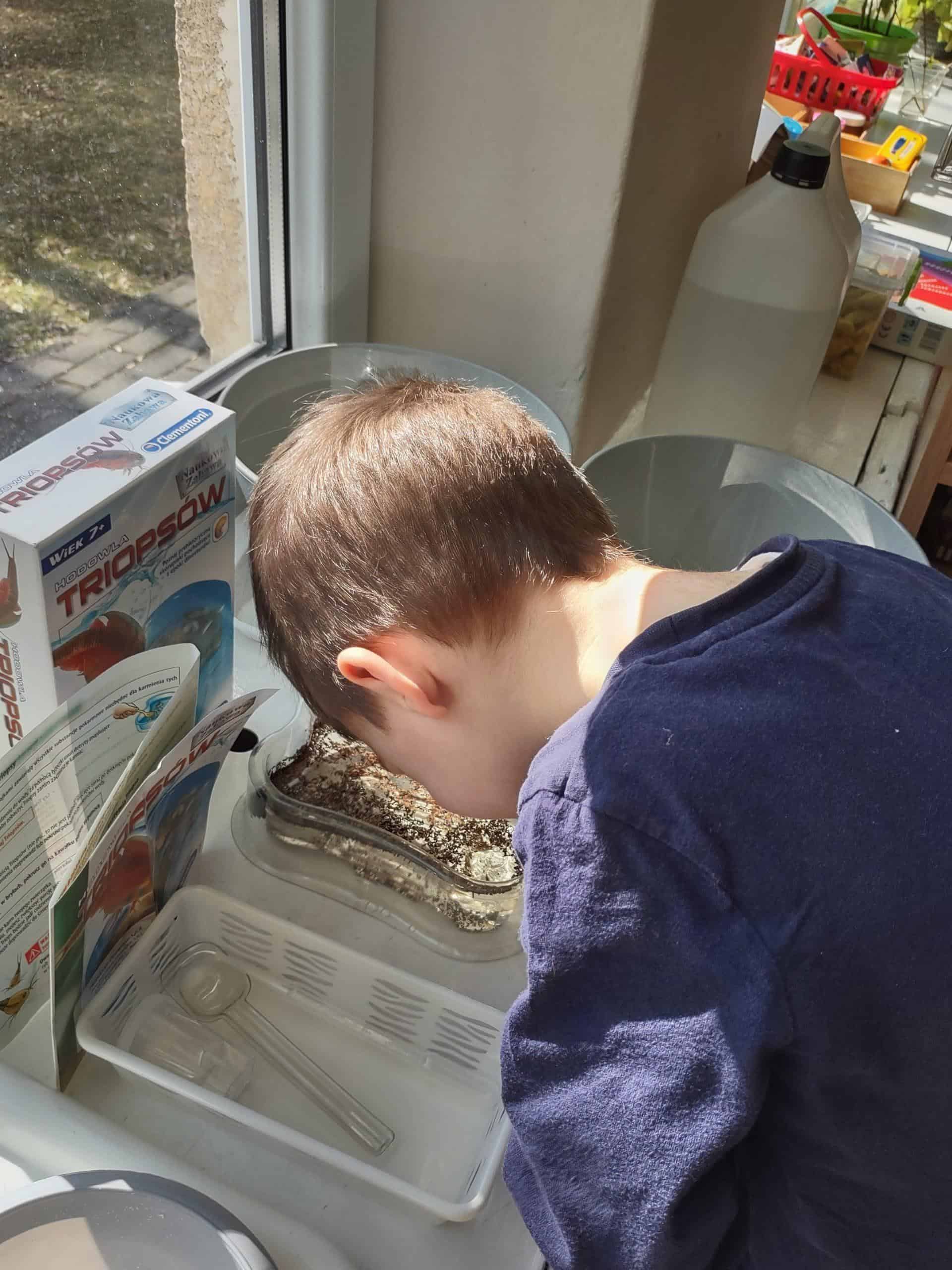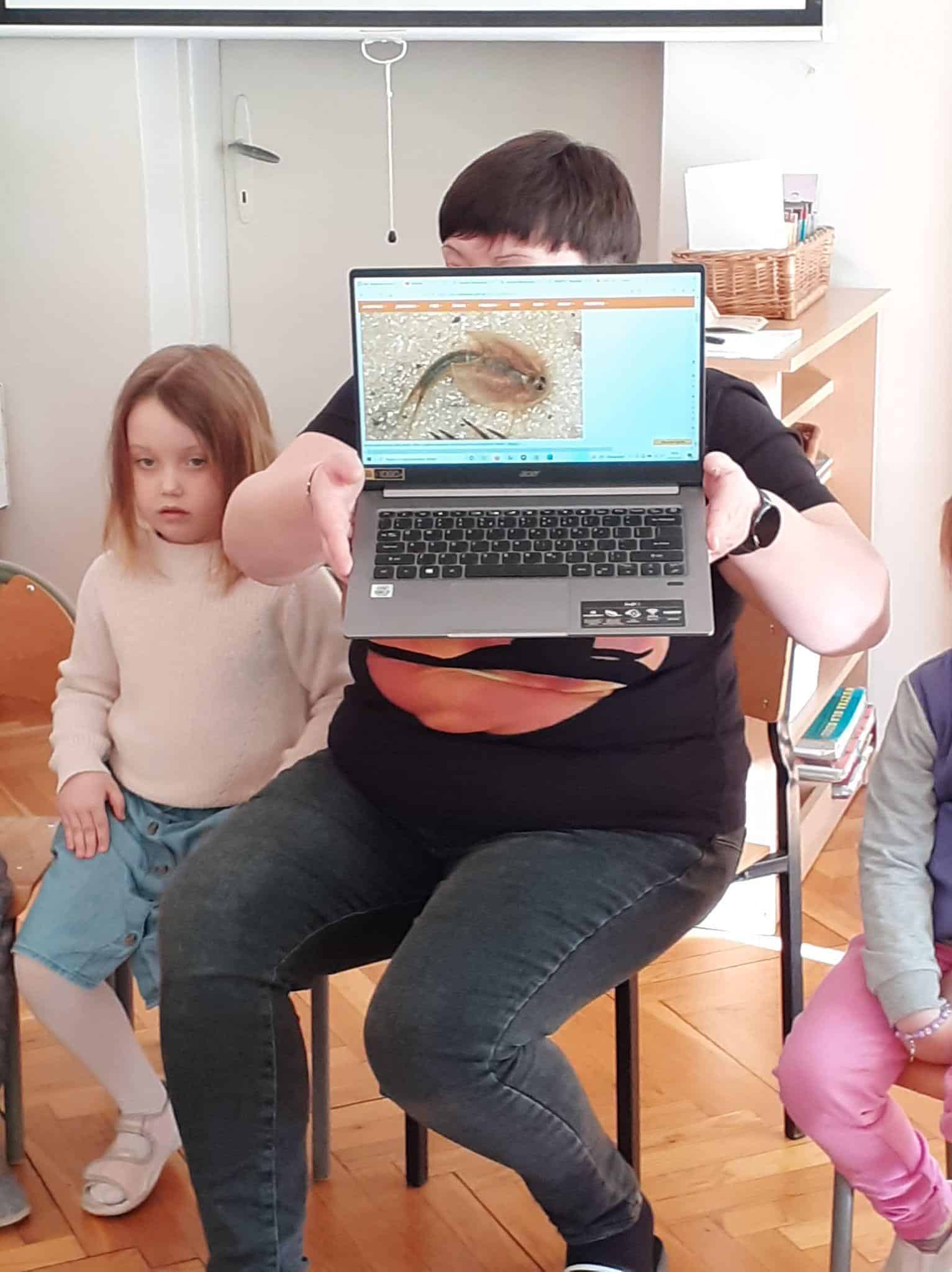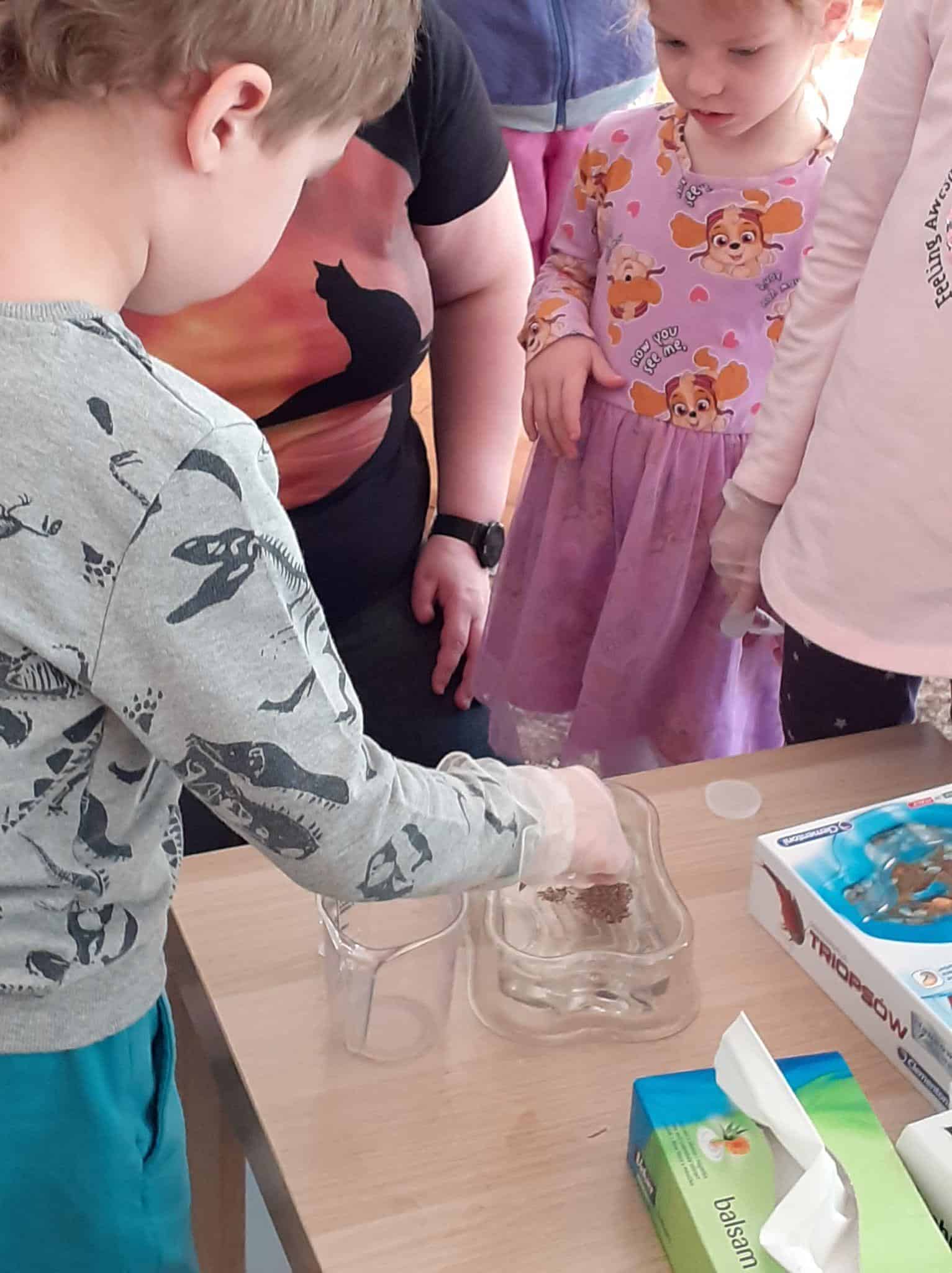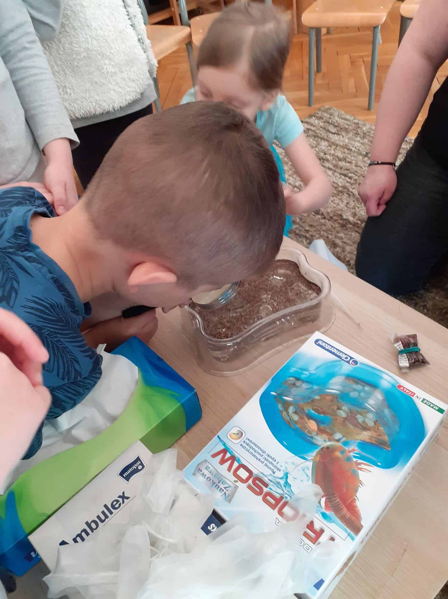 Dzięki przyniesionemu przez Noego wyjątkowemu zestawowi, podjęliśmy się wyhodowania w mini akwarium właśnie tych małych istot. Zanim zabraliśmy się do działań praktycznych zapoznaliśmy się z informacjami na temat Triopsów. Dzieci z uwagą słuchały o ich życiu – opisywały wygląd, sposób poruszania się, odżywianie.