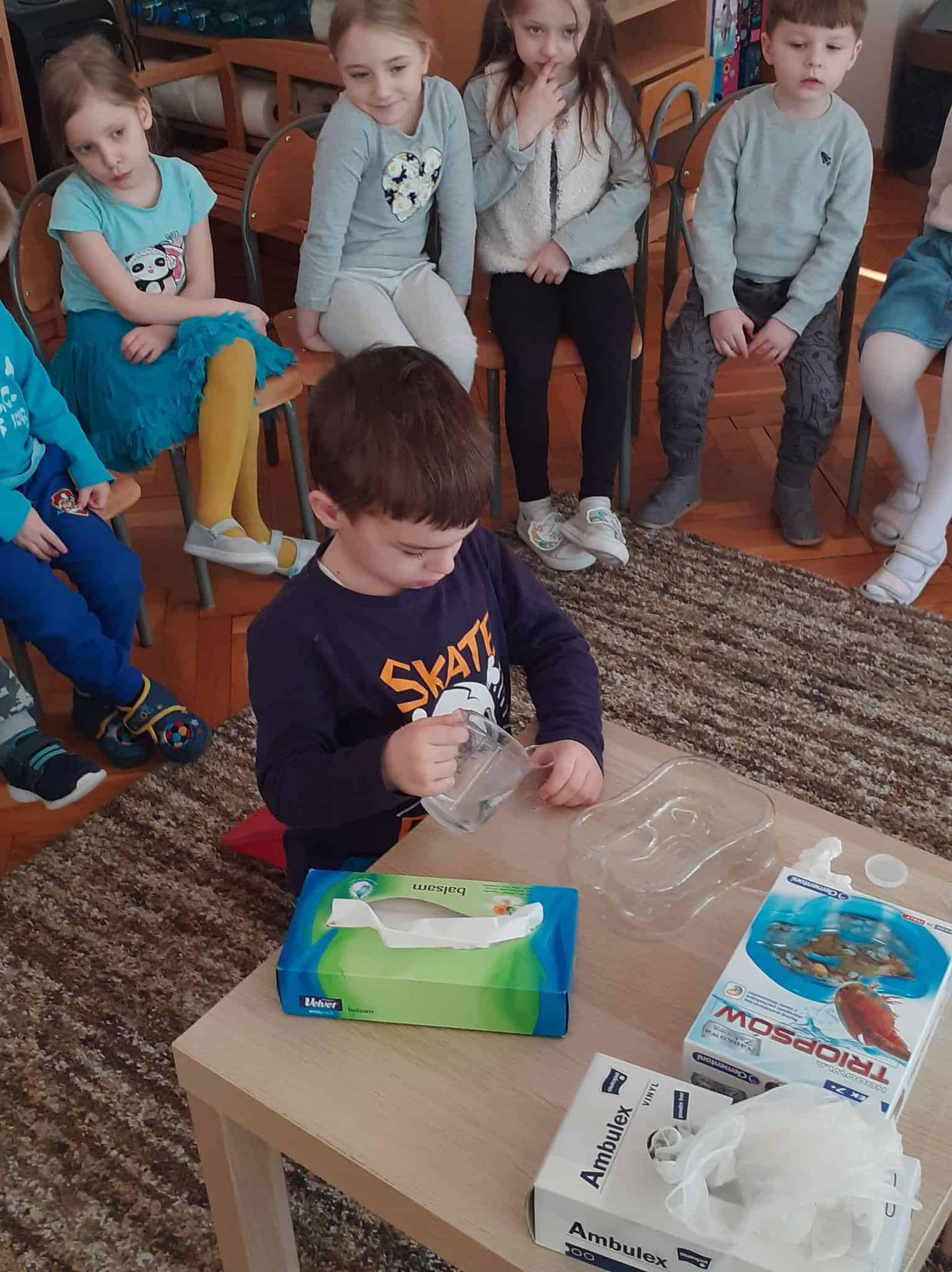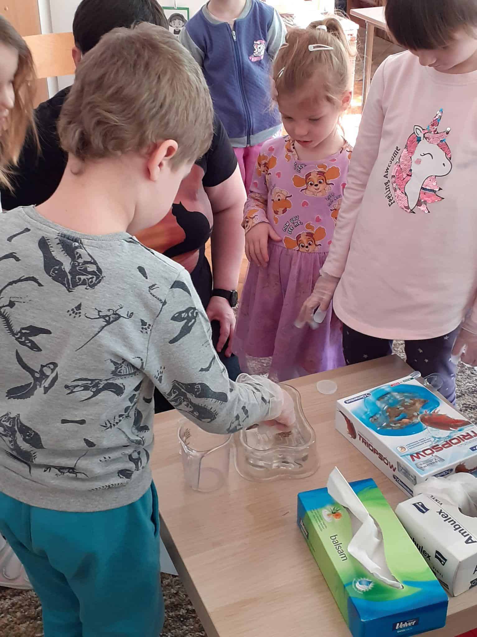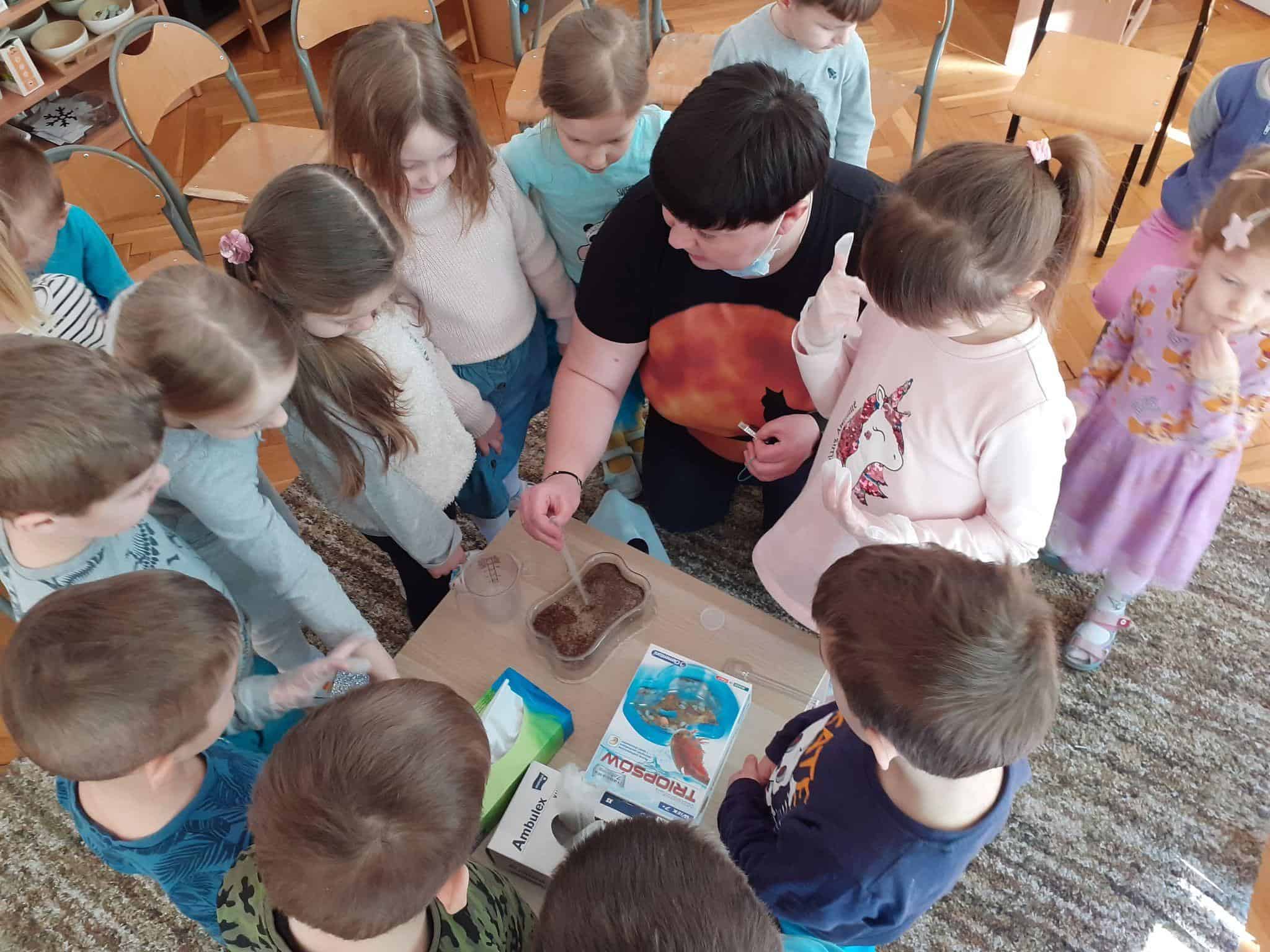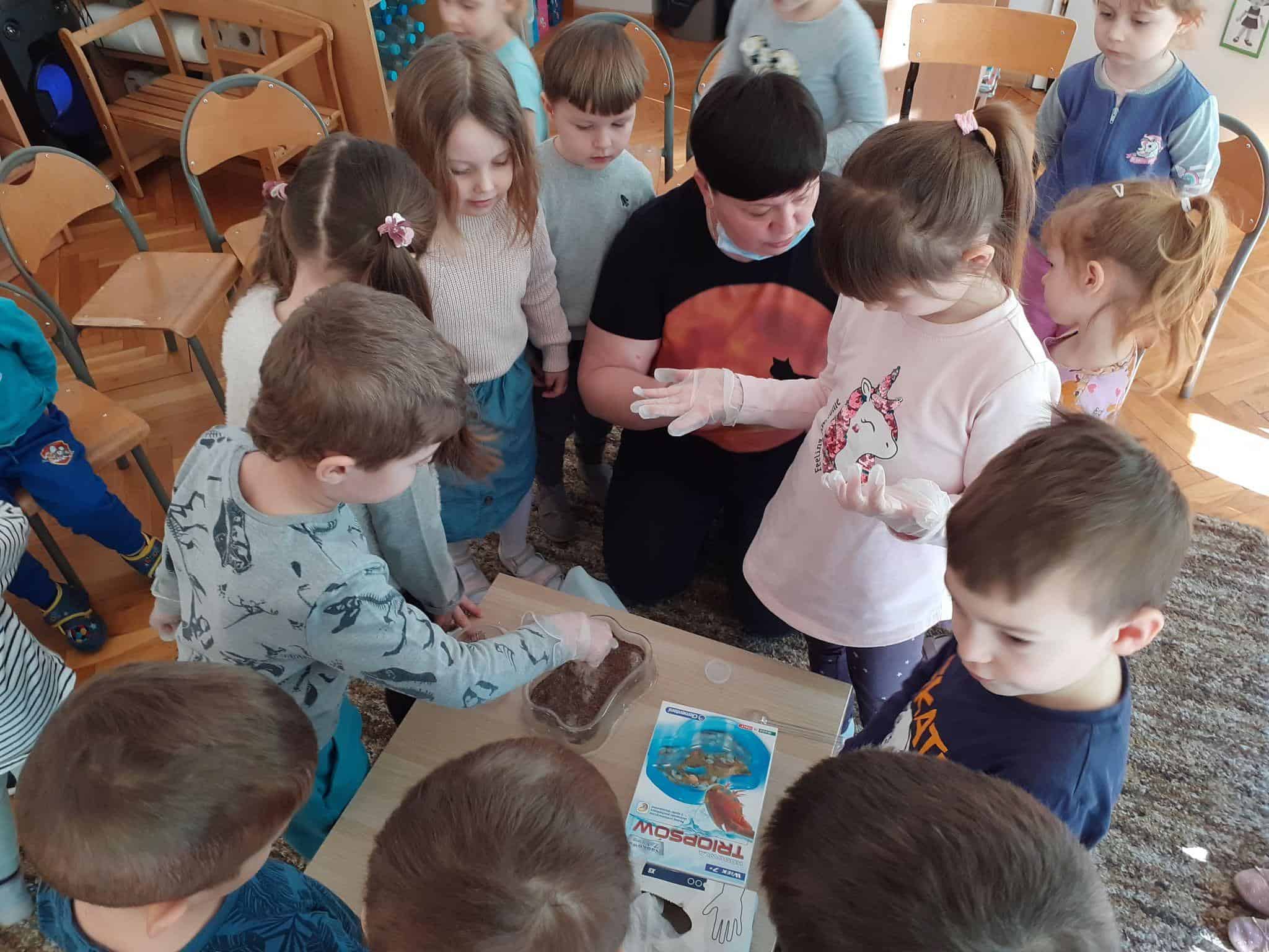 Dzięki przyniesionemu przez Noego wyjątkowemu zestawowi, podjęliśmy się wyhodowania w mini akwarium właśnie tych małych istot. Zanim zabraliśmy się do działań praktycznych zapoznaliśmy się z informacjami na temat Triopsów. Dzieci z uwagą słuchały o ich życiu – opisywały wygląd, sposób poruszania się, odżywianie.
