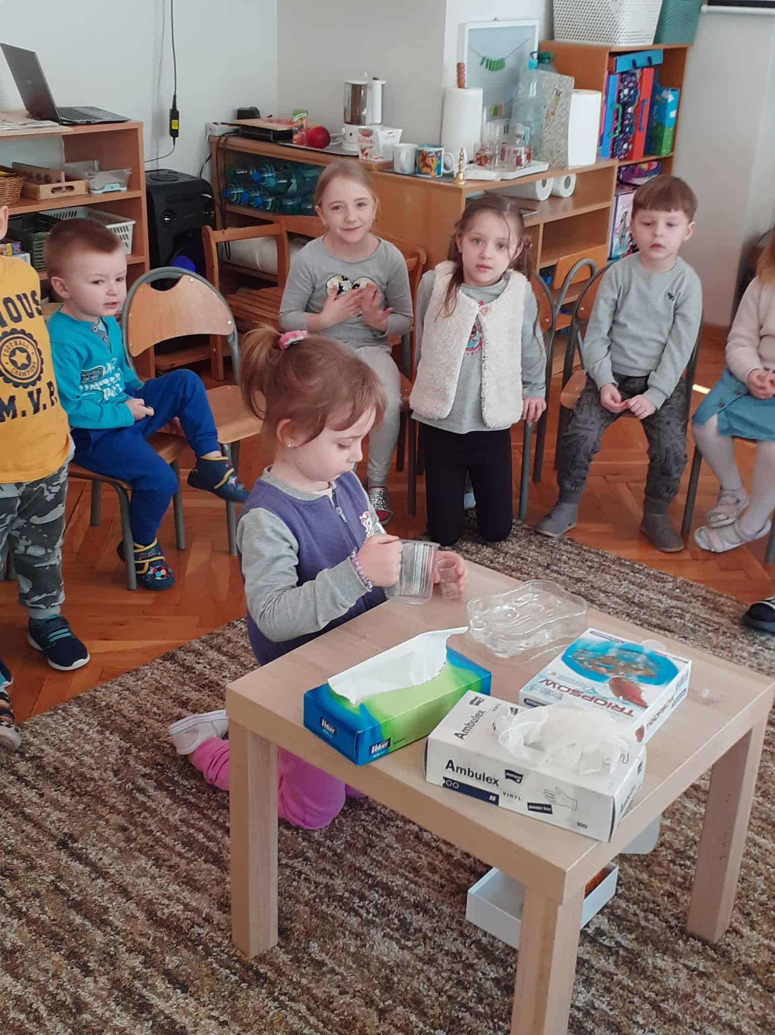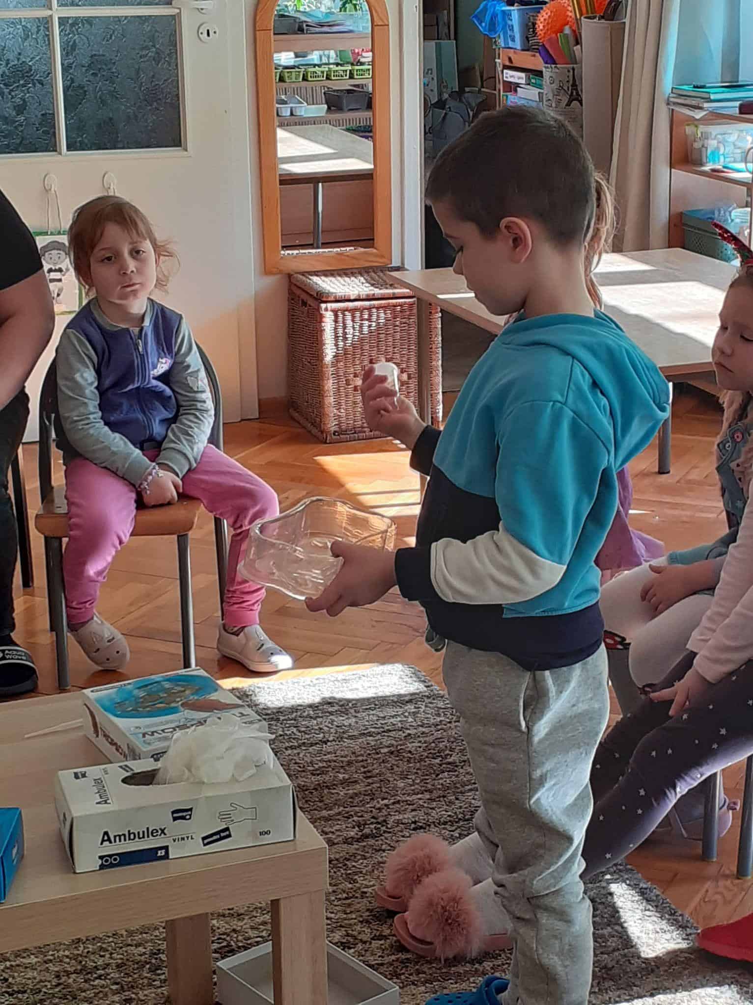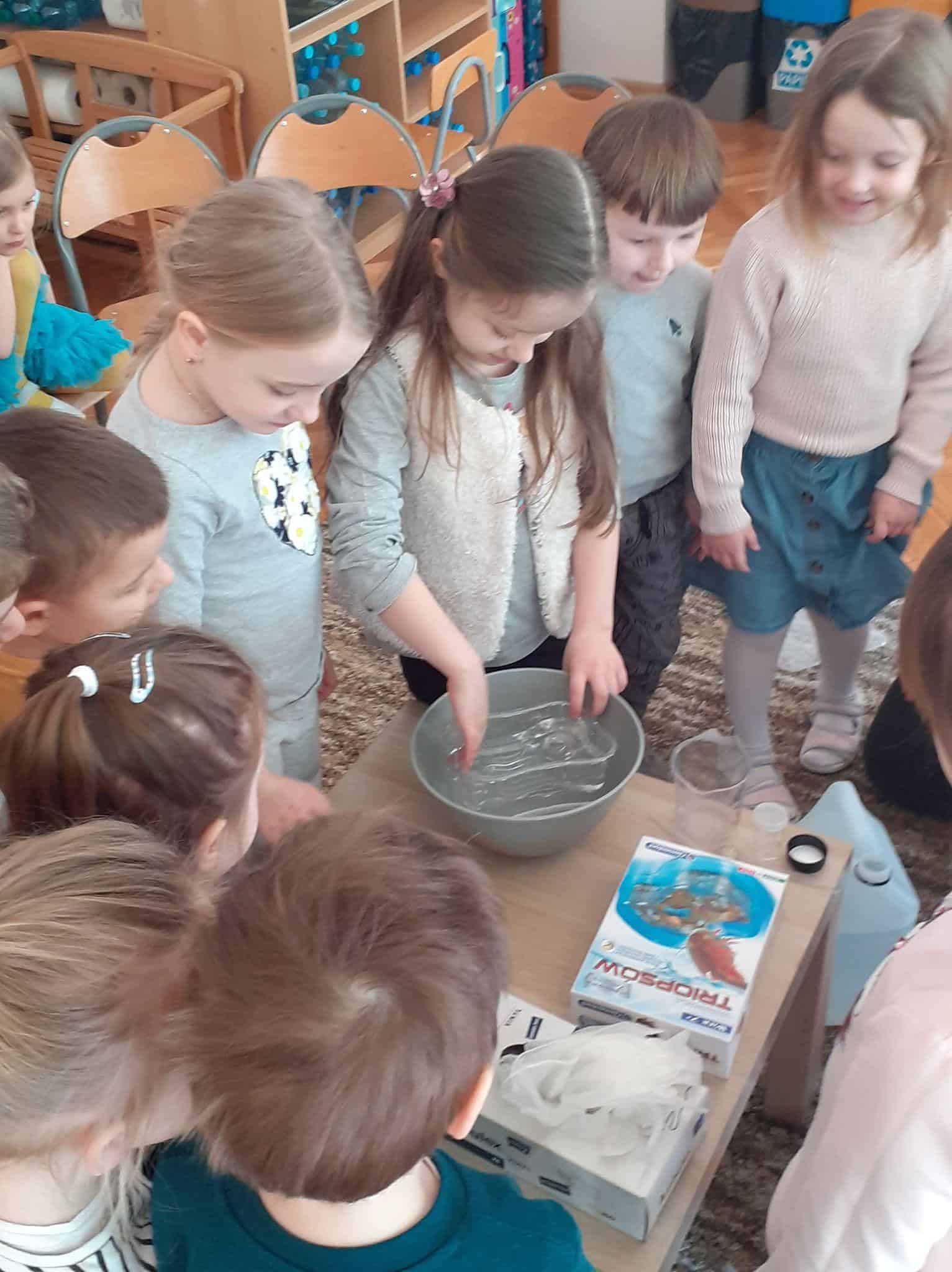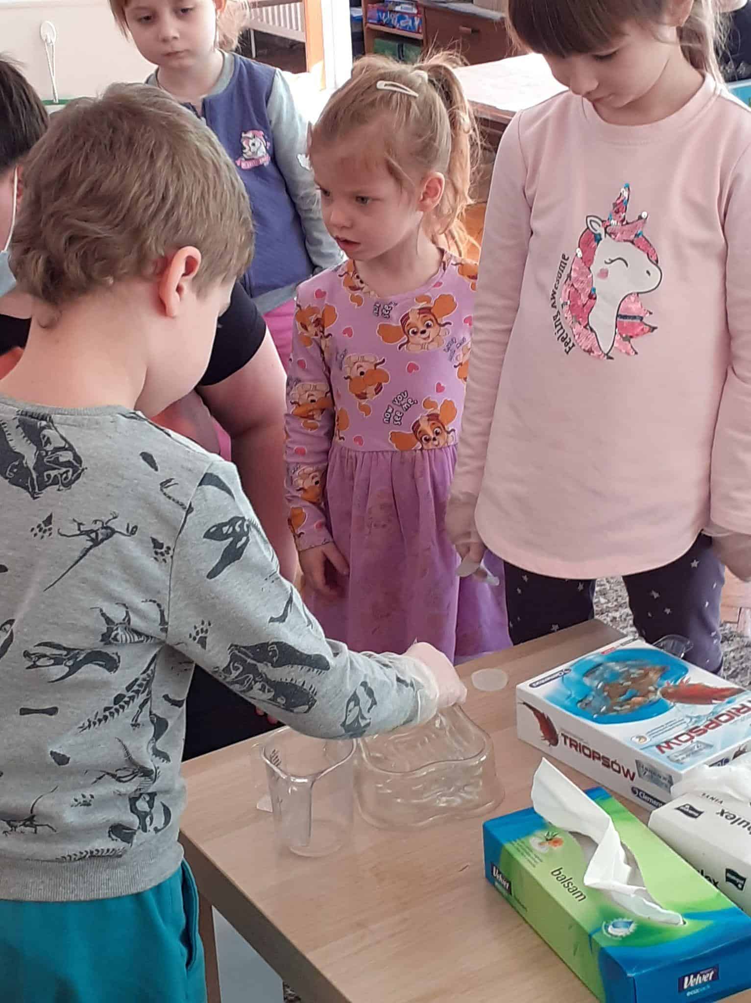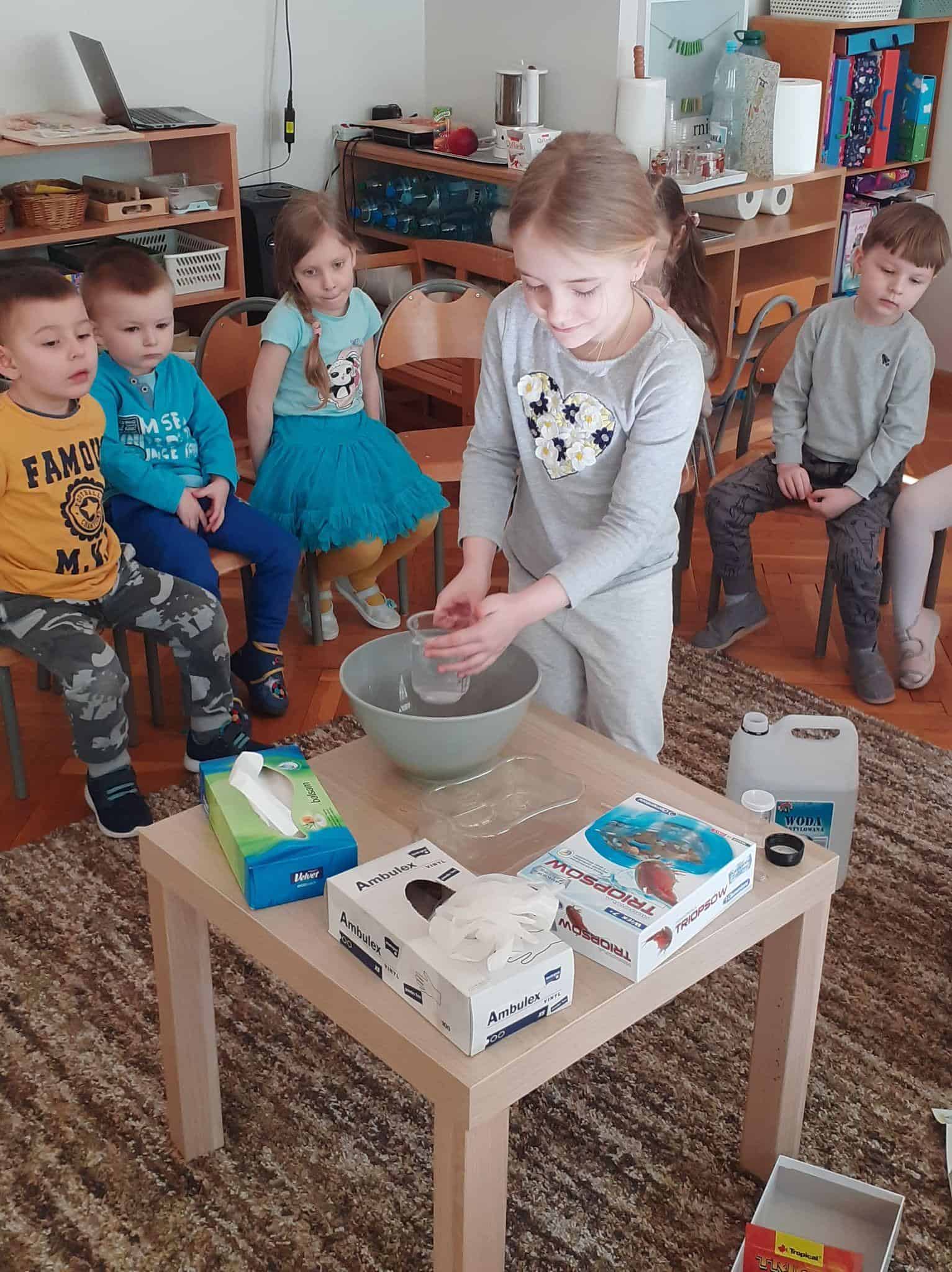 Dzięki przyniesionemu przez Noego wyjątkowemu zestawowi, podjęliśmy się wyhodowania w mini akwarium właśnie tych małych istot. Zanim zabraliśmy się do działań praktycznych zapoznaliśmy się z informacjami na temat Triopsów. Dzieci z uwagą słuchały o ich życiu – opisywały wygląd, sposób poruszania się, odżywianie.