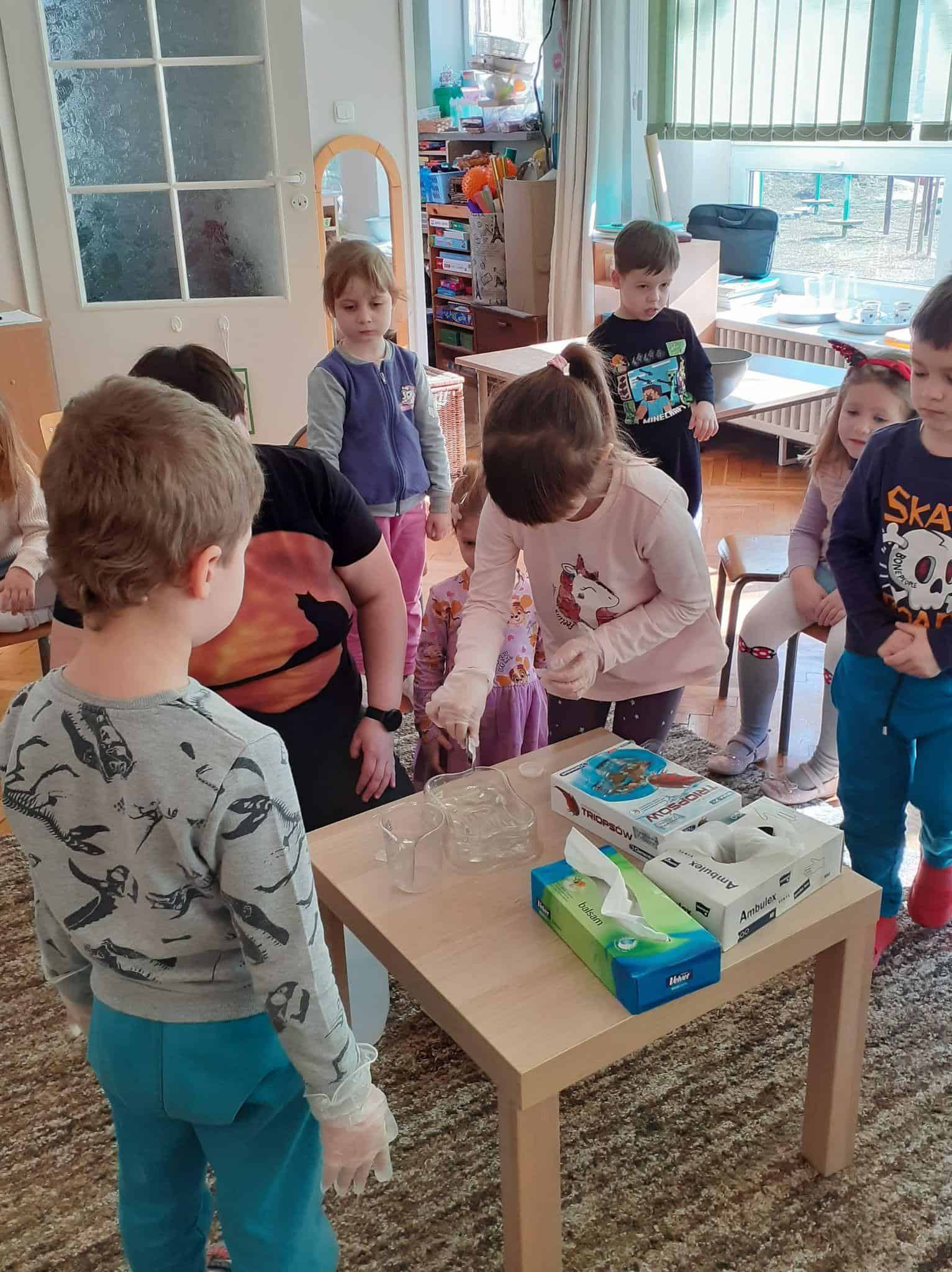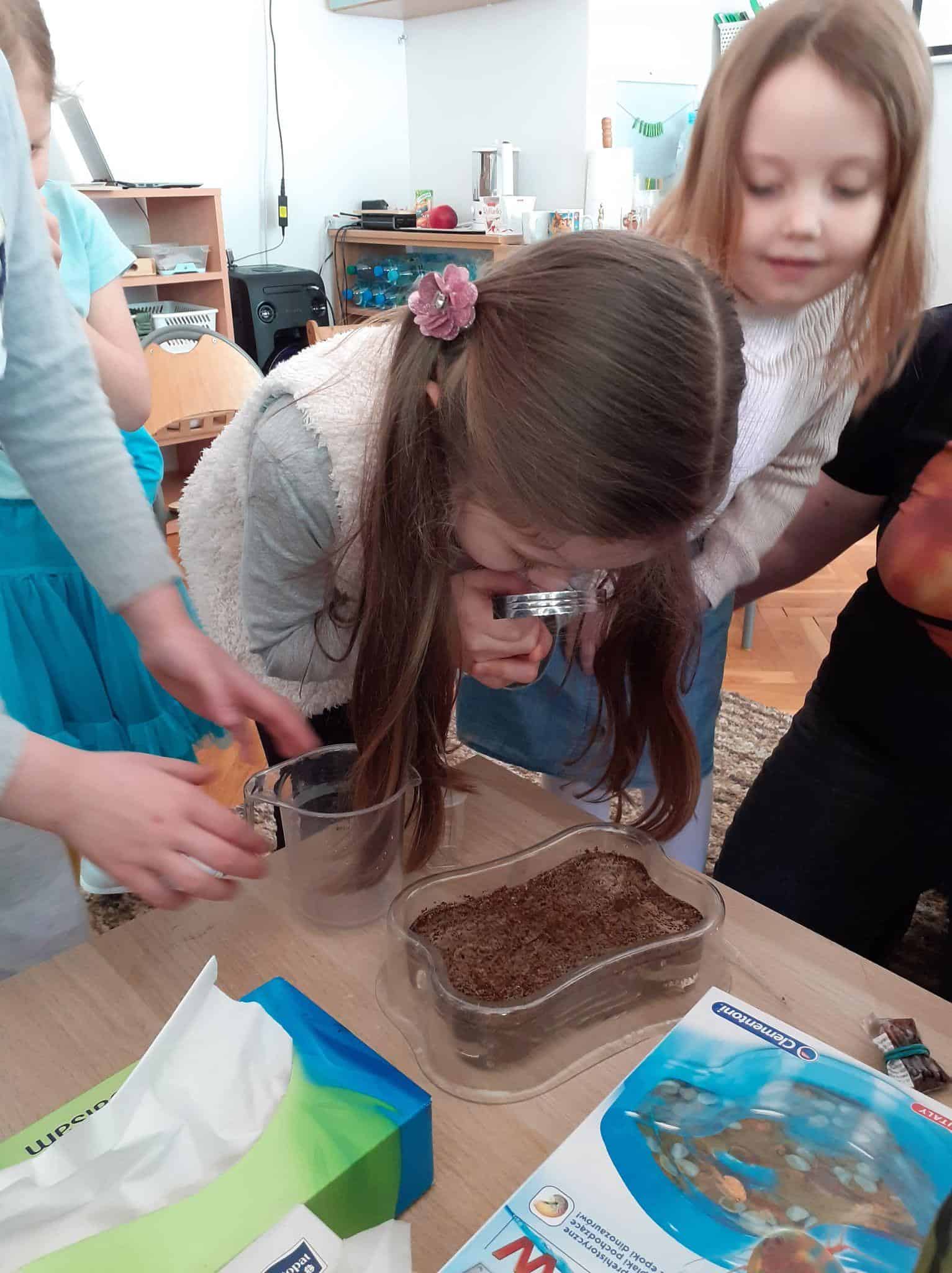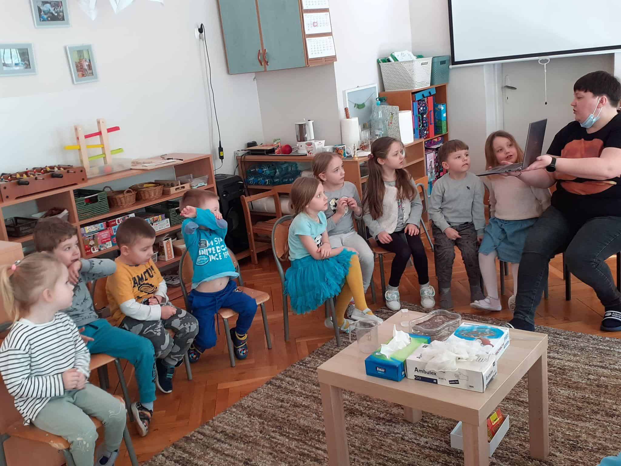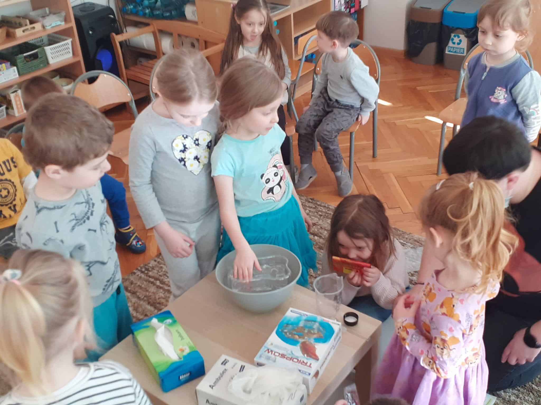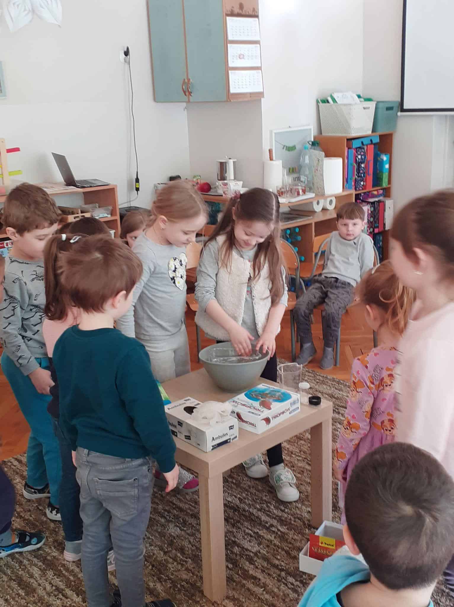 Dzięki przyniesionemu przez Noego wyjątkowemu zestawowi, podjęliśmy się wyhodowania w mini akwarium właśnie tych małych istot. Zanim zabraliśmy się do działań praktycznych zapoznaliśmy się z informacjami na temat Triopsów. Dzieci z uwagą słuchały o ich życiu – opisywały wygląd, sposób poruszania się, odżywianie.