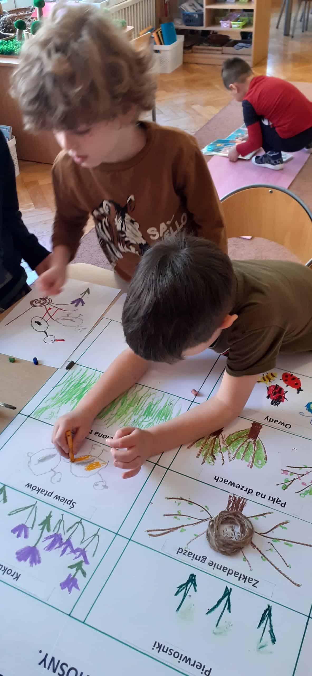 Za przedwiośnie przyjmuje się okres roku na styku zimy i wiosny. Teraz nam właśnie towarzyszy, więc tradycyjnie przyszedł czas na poszukiwanie pierwszych symptomów wiosny. Ale zanim to nastąpiło dzieci wykonały planszę , którą nazwaliśmy „Kartą poszukiwaczy pierwszych oznak wiosny”. Karta ta posłuży nam do zaznaczania zaobserwowanych symptomów wiosny np : słońce, zielona trwa, powroty ptaków, zakładanie gniazd, śpiew ptaków , pierwsze wiosenne kwiaty, pąki na drzewach . Służyć temu będą spacery połączone z obserwacją otoczenia przyrodniczego i wyszukiwaniu zamian związanych z wiosną. Każdy zaobserwowany symptom wiosny zostanie zaznaczony na planszy. Stąd dziś pobyt dzieci na terenie edukacyjnej ścieżki edukacyjnej i poszukiwanie oznak wiosny .Udało się , to co dzieci zaobserwowały uwidoczniły na zdjęciach , a po powrocie zaznaczyły na planszy.