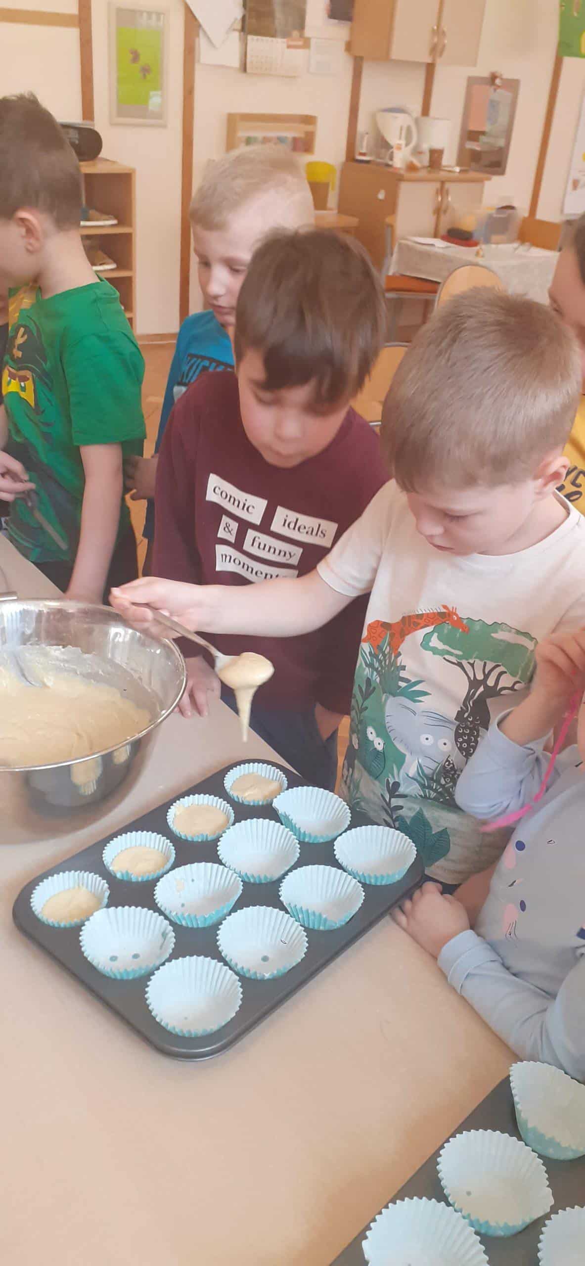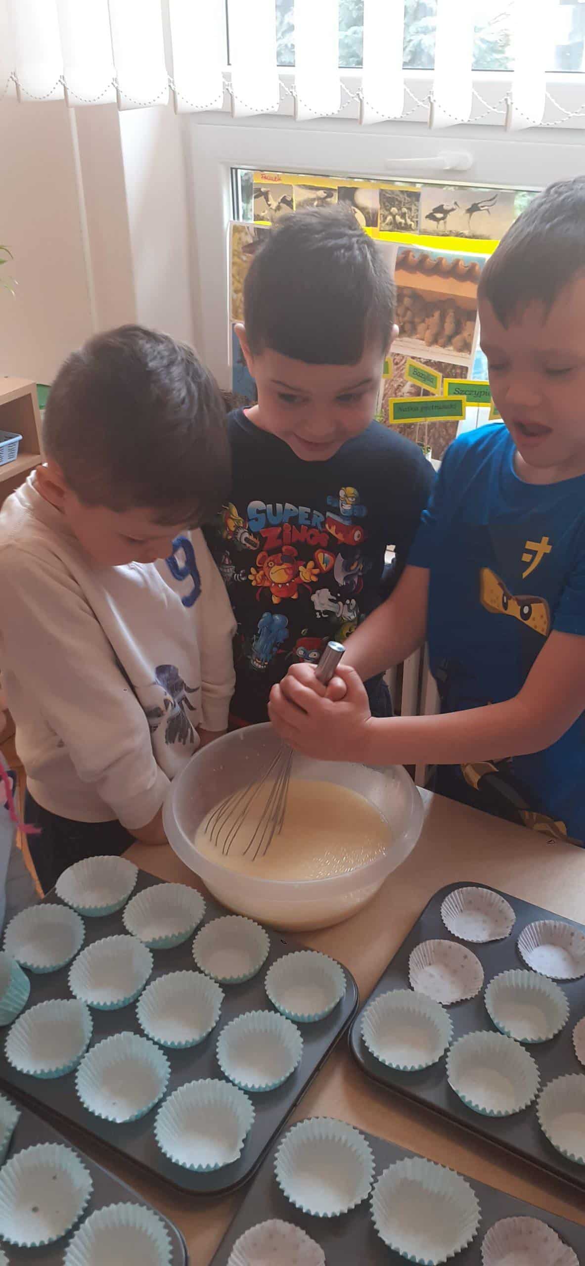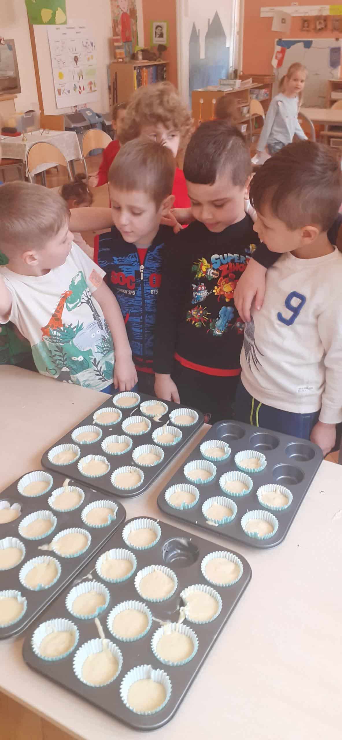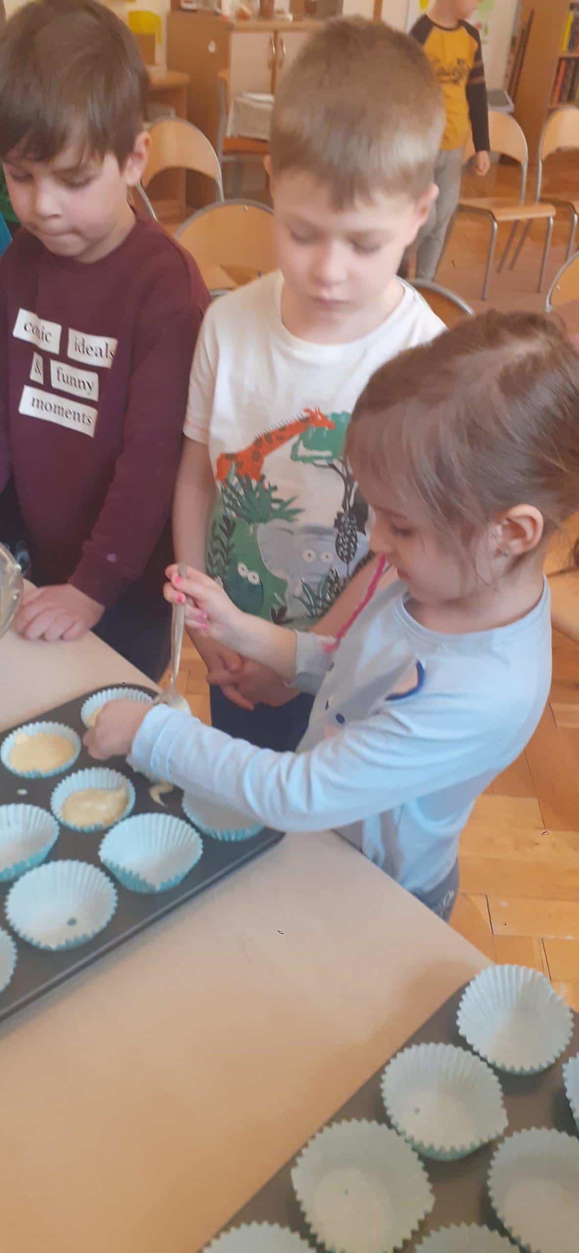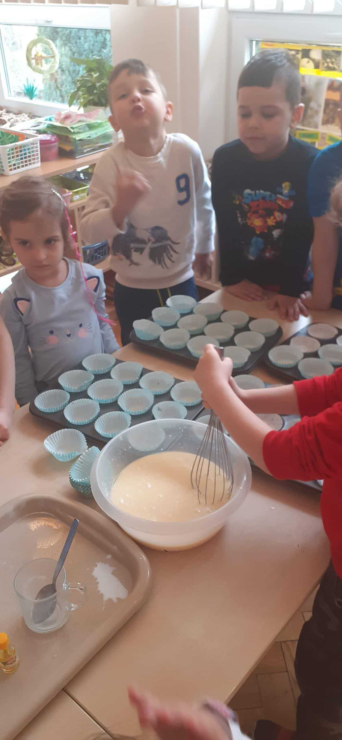 Babeczki wielkanocne to tradycja. W każdym koszyczku wielkanocnym takiej babeczki nie powinno zabraknąć. Baba wielkanocna ta najbardziej rozpoznawany symbol Wielkanocy. Tradycja wypiekania tych bab sięga XV wieku. To najstarszy wypiek sporządzany w Polsce. Zwyczaj ten przywędrował do nas z Litwy i Białorusi. Baba wielkanocna jest symbolem dostatku i umiejętności kucharskich, wypiekano je ze szczególną starannością, aby były jak najbardziej dorodne. Dzieci z grupy Pomarańczowej dzisiaj też wykazały się ogromną starannością. Dokładnie odmierzały wszystkie składniki zawarte w przepisie, dokładnie łączyły składniki suche z mokrymi, z pietyzmem dodawały aromatu pomarańczowego i całą masę mieszały. A potem nakładały do małych foremek. Dobrze, że czas pieczenia nie był zbyt długi , bo niektóre dzieci nie mogły się doczekać, kiedy babeczki się upieką i wystygną. No i wreszcie degustacja -babeczki smakowały wszystkim wyśmienicie.