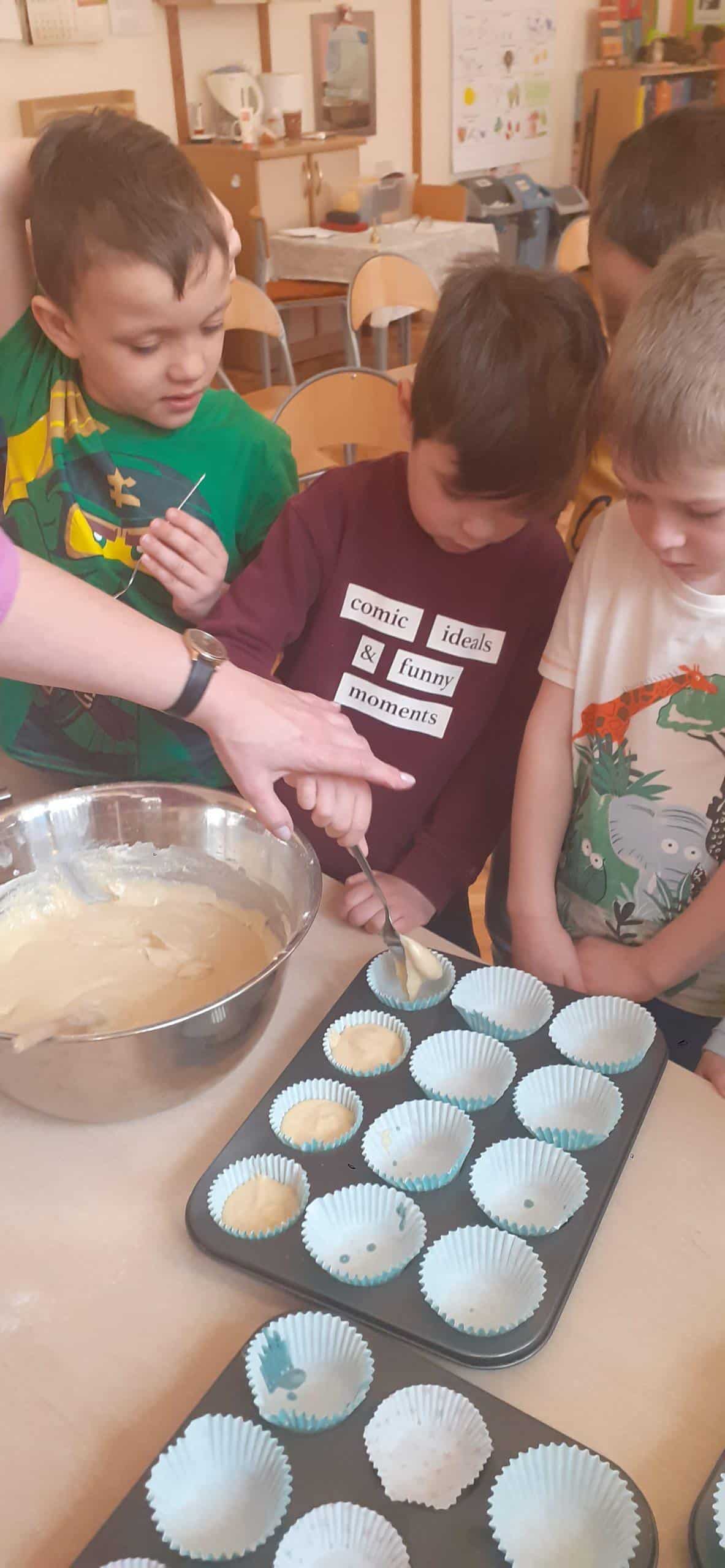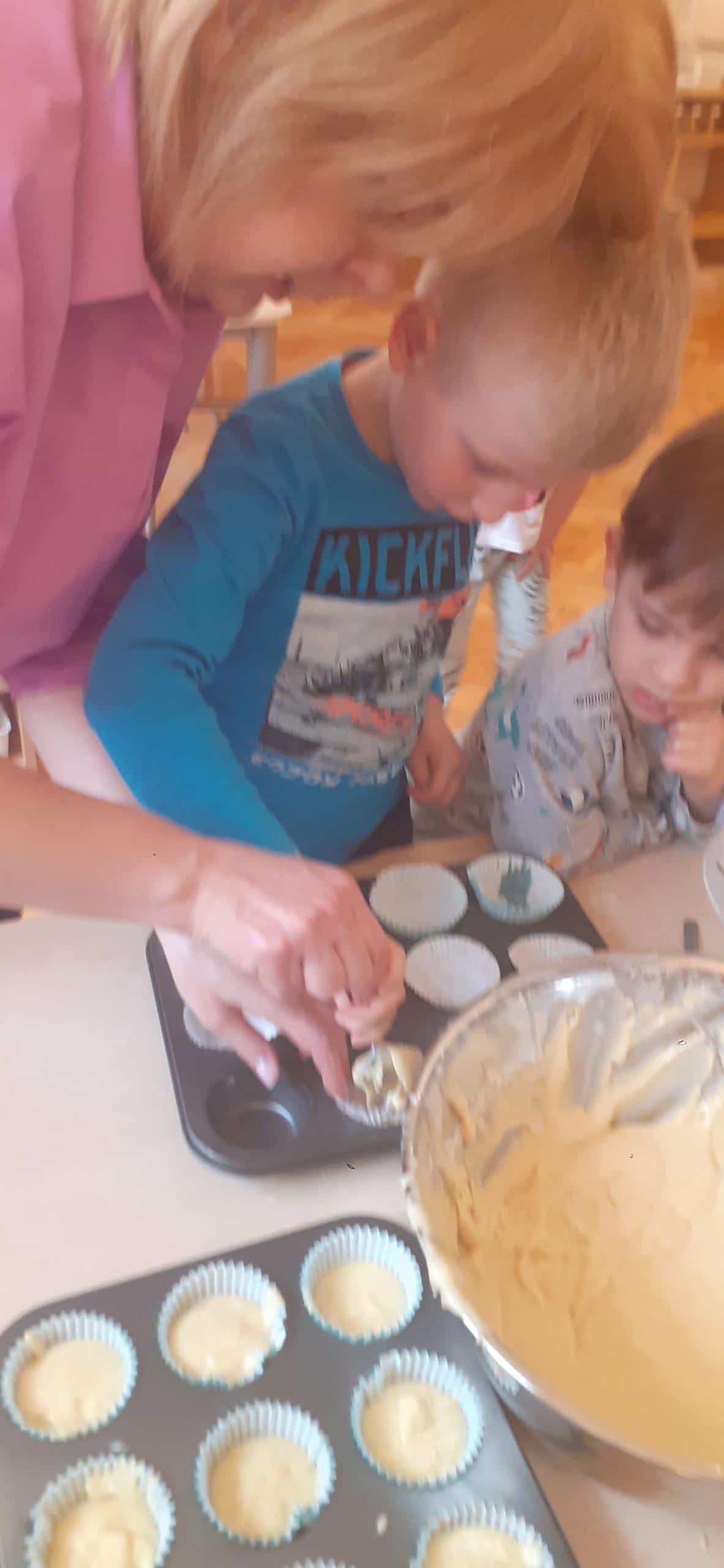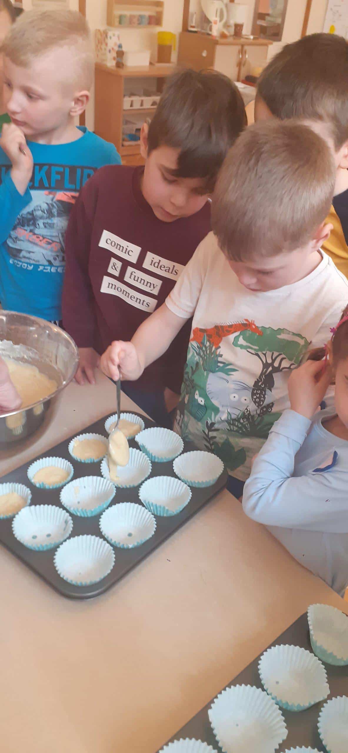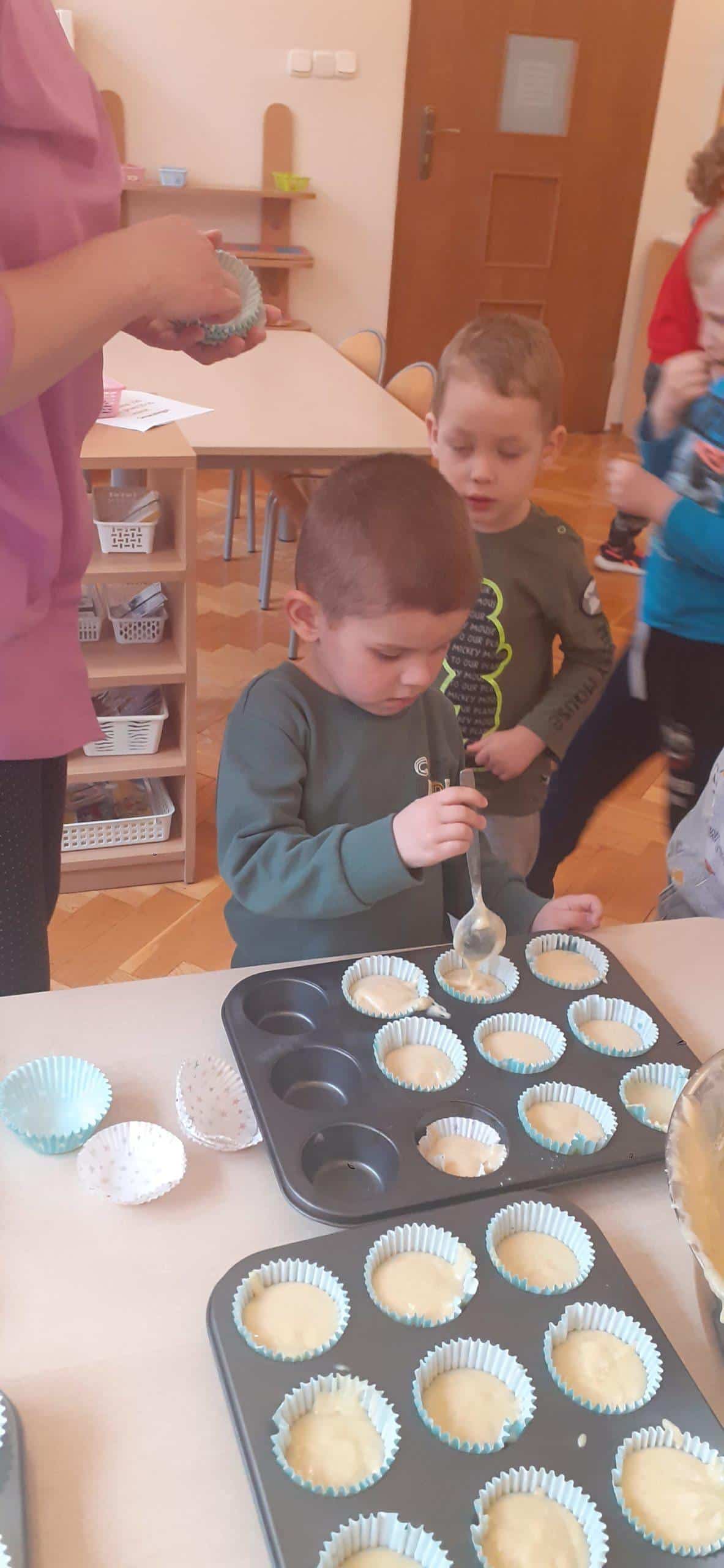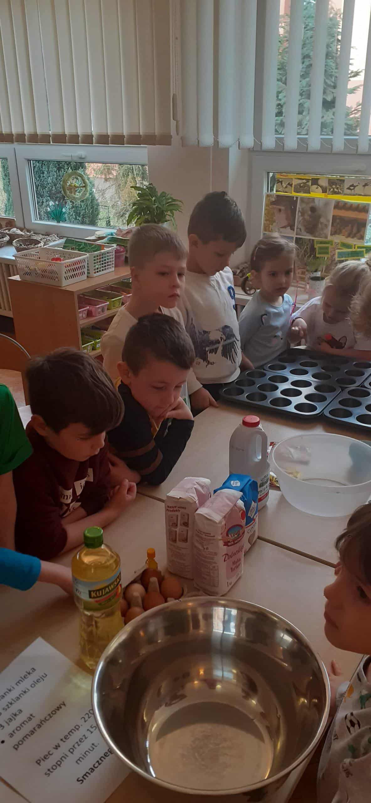 Babeczki wielkanocne to tradycja. W każdym koszyczku wielkanocnym takiej babeczki nie powinno zabraknąć. Baba wielkanocna ta najbardziej rozpoznawany symbol Wielkanocy. Tradycja wypiekania tych bab sięga XV wieku. To najstarszy wypiek sporządzany w Polsce. Zwyczaj ten przywędrował do nas z Litwy i Białorusi. Baba wielkanocna jest symbolem dostatku i umiejętności kucharskich, wypiekano je ze szczególną starannością, aby były jak najbardziej dorodne. Dzieci z grupy Pomarańczowej dzisiaj też wykazały się ogromną starannością. Dokładnie odmierzały wszystkie składniki zawarte w przepisie, dokładnie łączyły składniki suche z mokrymi, z pietyzmem dodawały aromatu pomarańczowego i całą masę mieszały. A potem nakładały do małych foremek. Dobrze, że czas pieczenia nie był zbyt długi , bo niektóre dzieci nie mogły się doczekać, kiedy babeczki się upieką i wystygną. No i wreszcie degustacja -babeczki smakowały wszystkim wyśmienicie.