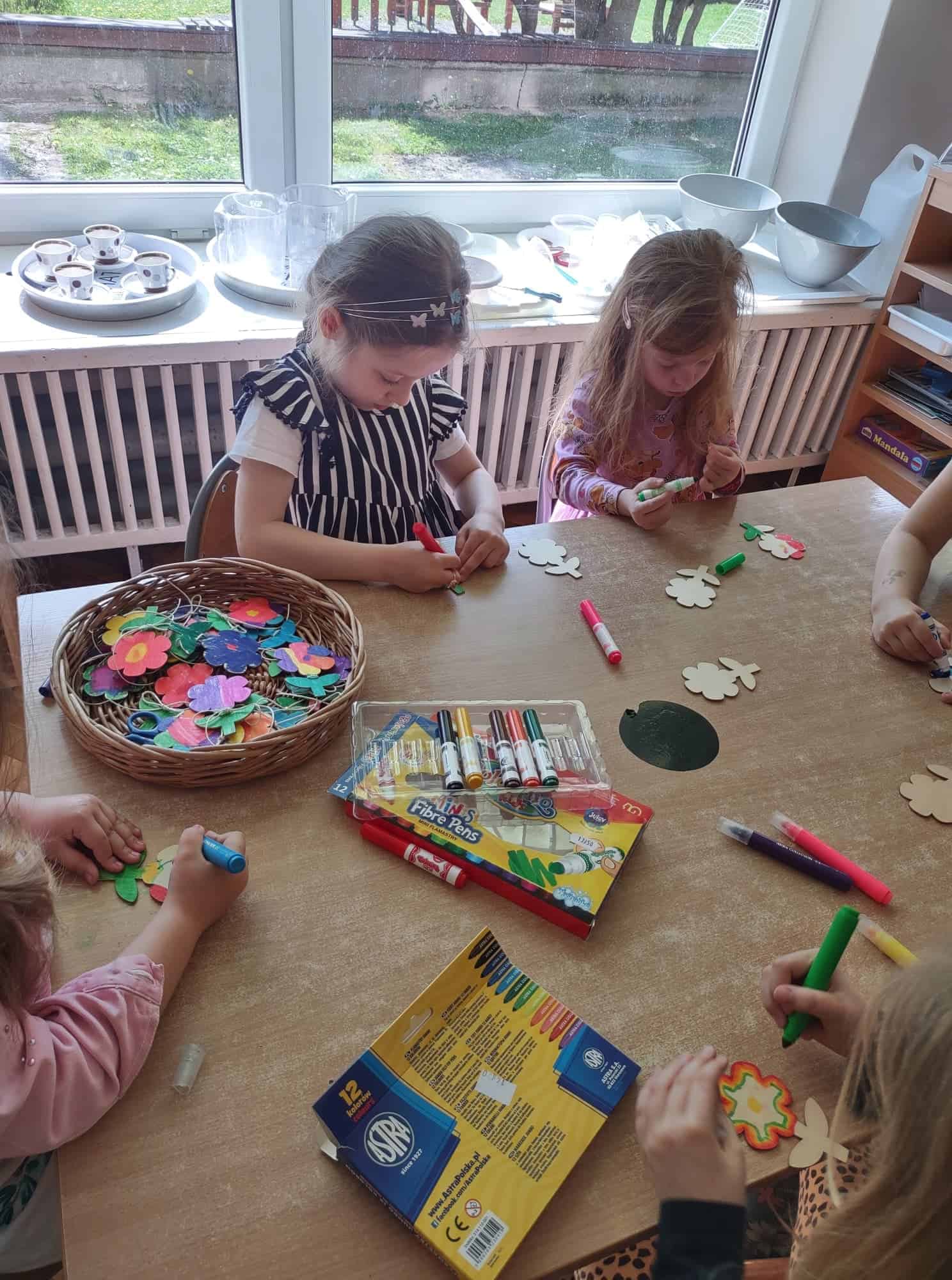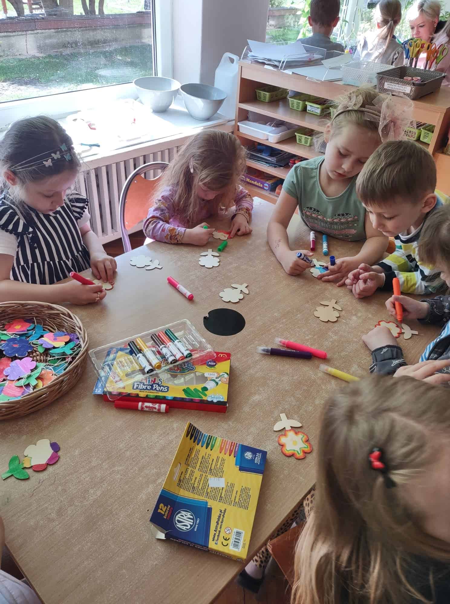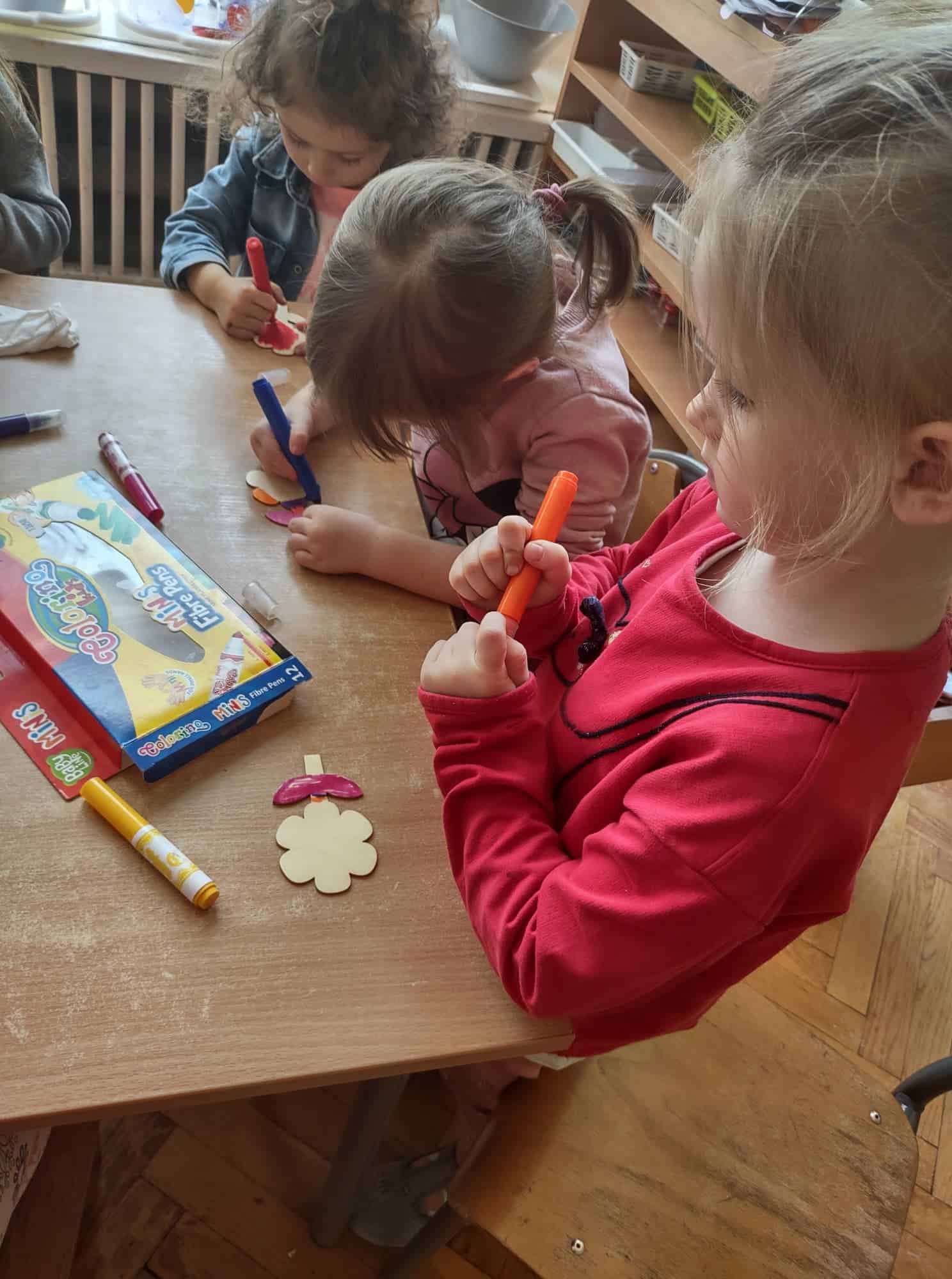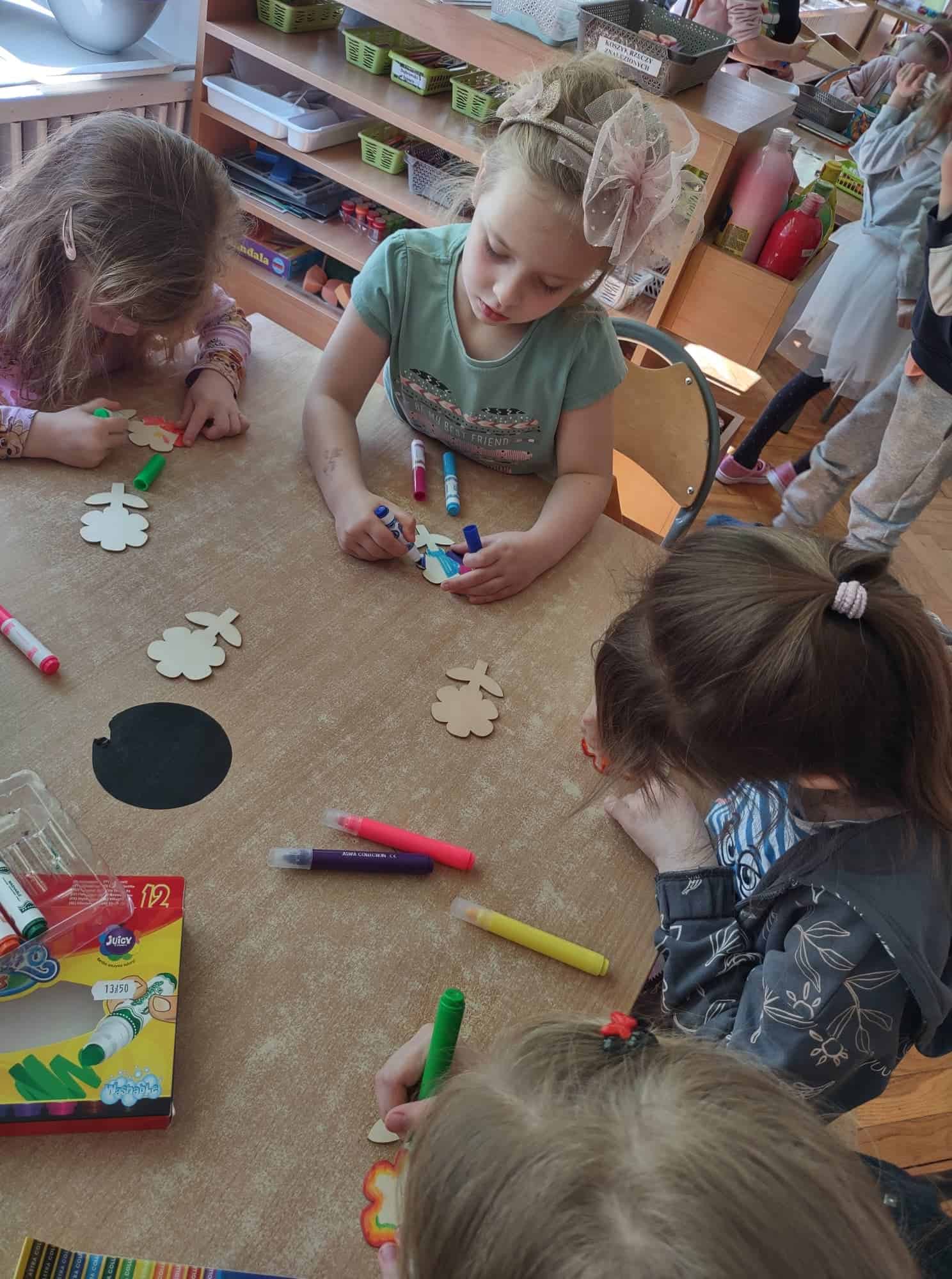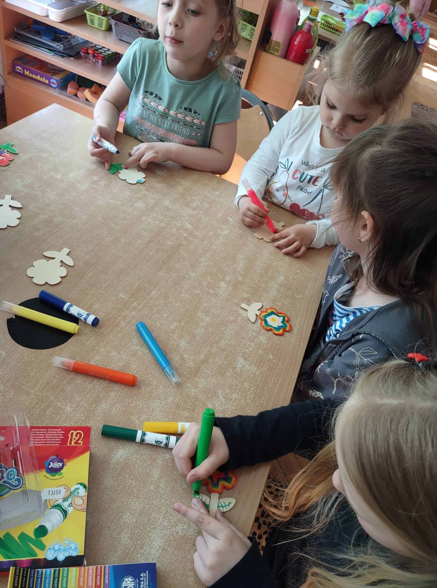 Mądrzejsi o nowe umiejętności, chcąc stać się prawdziwie przedsiębiorczymi przedszkolakami, postanowiliśmy wykorzystać naszą wiedzę w praktyce, czyli jak to zrobić, żeby coś zarobić 🙂 Korzystając z wiosennej pory roku doszliśmy do wniosku, iż dobrym produktem do sprzedaży będą wiosenne kwiaty; przecież kwiaty kocha każdy, więc pomysł powinien mieć wzięcie:) Zabraliśmy się za ich ozdabianie. Po skończonej pracy zastanawialiśmy się nad odbiorcą naszych wytworów. Pomysłów było bardzo dużo – od sprzedawania ich na przedszkolnym parkingu, po wystawienie naszych kwiatków na aukcje Allegro 🙂 Koniec końców, po uwzględnieniu wszystkich za i przeciw dzieci postanowiły, iż będą sprzedawać swoje rękodzieła rodzicom, którzy przy dobrej reklamie produktu z pewnością je kupią 🙂