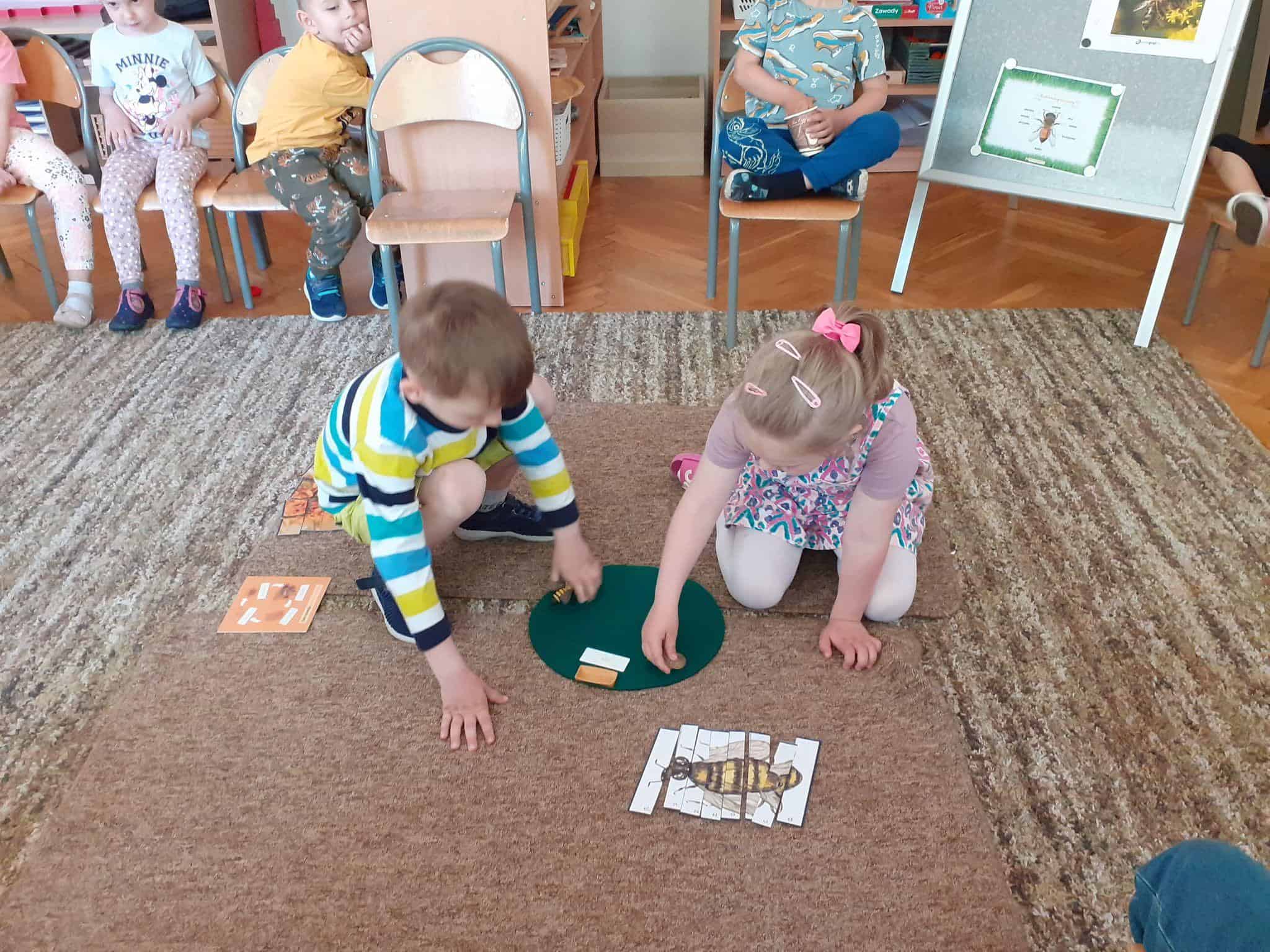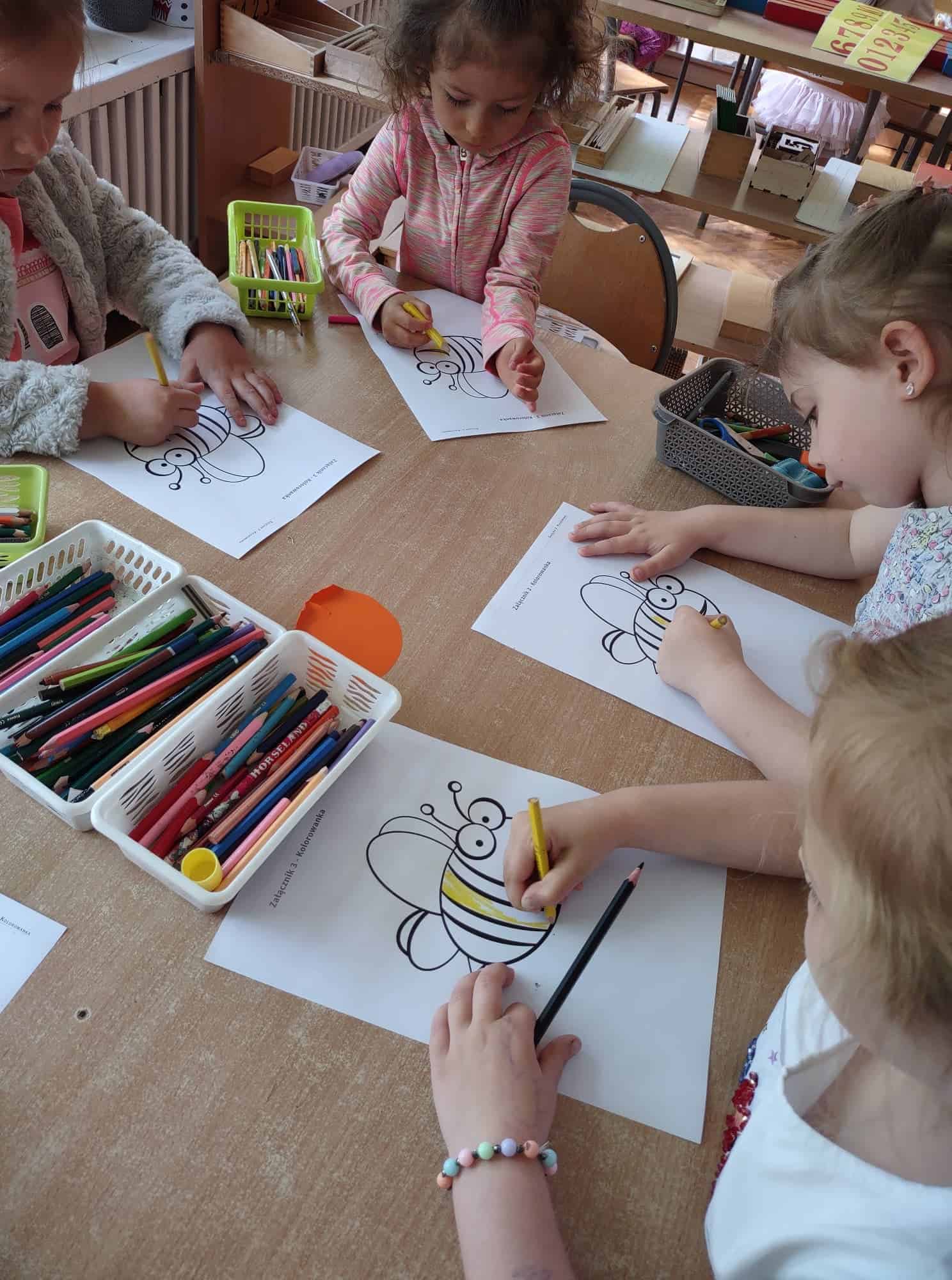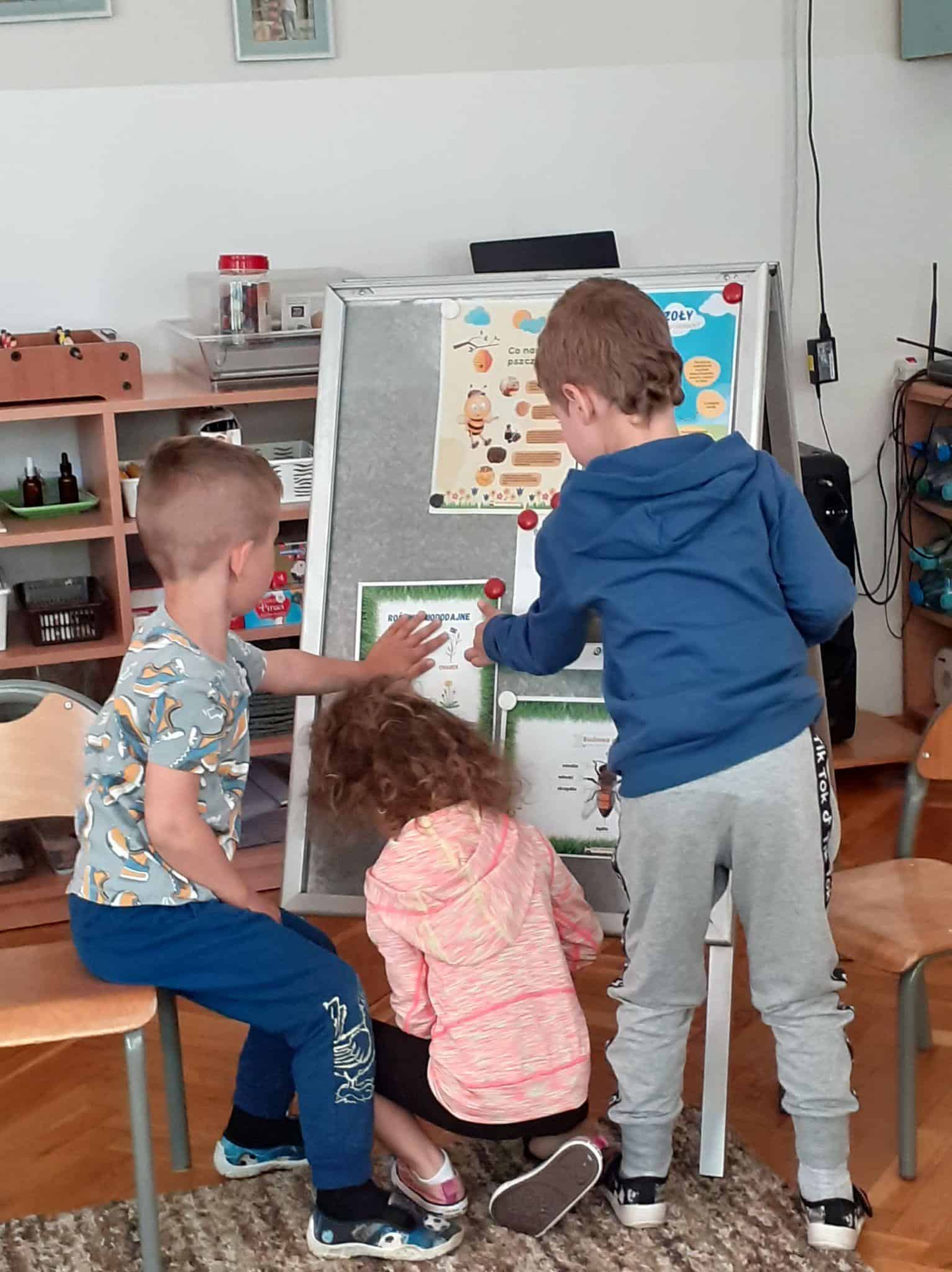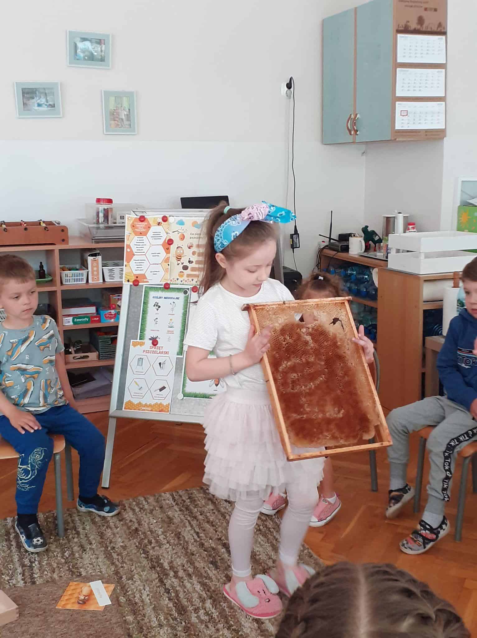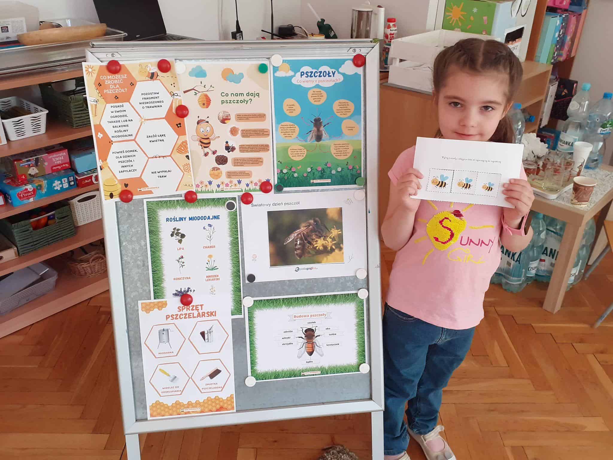 20 maja przypada Światowy Dzień Pszczół. Z tej okazji dzieci z Grupy Zielonej aktywnie włączyły się w działania, których celem było budzenie świadomości na temat pożyteczności pszczół, pokonywanie strachu przed tymi owadami, ale również pomoc pszczołom w ich przetrwaniu. Podążając za myślą Alberta Einsteina, że: “jeśli z Ziemi zniknie pszczoła, człowiekowi pozostaną tylko cztery lata życia; nie ma więcej pszczół, nie ma więcej zapylania, nie ma więcej roślin, nie ma więcej zwierząt, nie ma więcej ludzi…” dlatego ważne jest, aby rolę i znaczenie tych owadów poznawać już od najmłodszych lat. Przedszkolaki dowiedziały się, jakie znaczenie ma praca pszczół dla świata przyrody, poznały cykl rozwojowy pszczoły, rozmawialiśmy na temat pracy pszczelarza – poznaliśmy narzędzia jego pracy oraz strój, którym musi zabezpieczyć się podczas wykonywania swoich zajęć. Dzięki filmowi edukacyjnemu „Życie pszczół” przedszkolaki obserwowały życie toczące się na łące. Zabawy ruchowe, zagadki, puzzle, działania matematyczne i językowe podkreśliły atrakcyjność zajęć. Podsumowaniem naszych działań było stworzenie pięknej, sensorycznej pszczoły 🙂 Efekty naszej pracy w poniższej fotorelacji 🙂