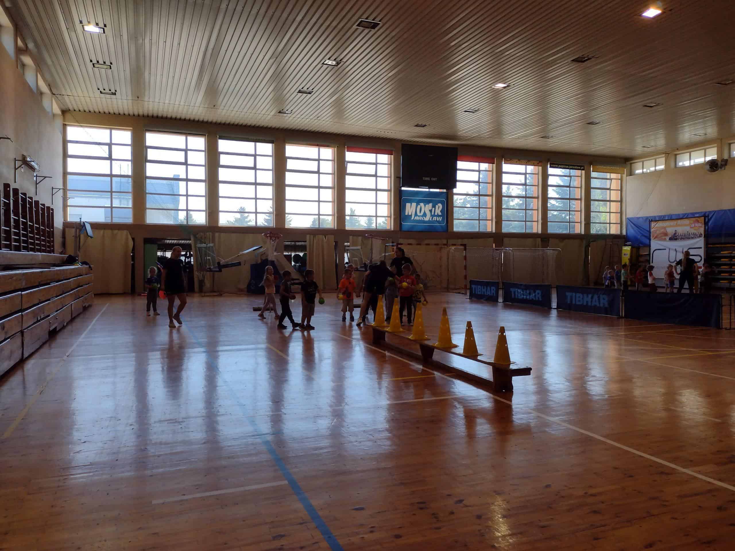 W dniu 18 maja starszaki z naszego przedszkola wybrały się na zajęcia sportowe ogólnorozwojowe do Hali Sportowo – Widowiskowej MOSiR w Jarosławiu, gdzie czekały na nie piłkarki ręczne z drużyny Eurobud Grupa JKS Jarosław, z którymi dzieci mogły tego dnia potrenować. Zajęcia były różnorodne i świetnie przygotowane: hala podzielona została na 4 stanowiska, na których pod okiem profesjonalistów dzieci mogły wykonywać różnorodne ćwiczenia i wzmacniać różne grupy mięśniowe. Na każdym stanowisku ćwiczyła grupa dzieci razem z dziewczynami z drużyny, a po upływie ustalonego czasu dzieci przechodziły na kolejne stanowisko – w ten sposób wszystkie dzieci mogły ćwiczyć na każdym ze stanowisk. Były zabawy rzutne, bieżne, skoczne, zręcznościowe oraz z elementami współzawodnictwa. Dzieci wspaniale się bawiły, a nad wszystkim czuwał pan trener Reidar Moistad i pani trener Monika Cholewa. Po treningu dzieci otrzymały drobne upominki, a na zakończenie oczywiście musieliśmy zrobić wspólne zdjęcie 🙂