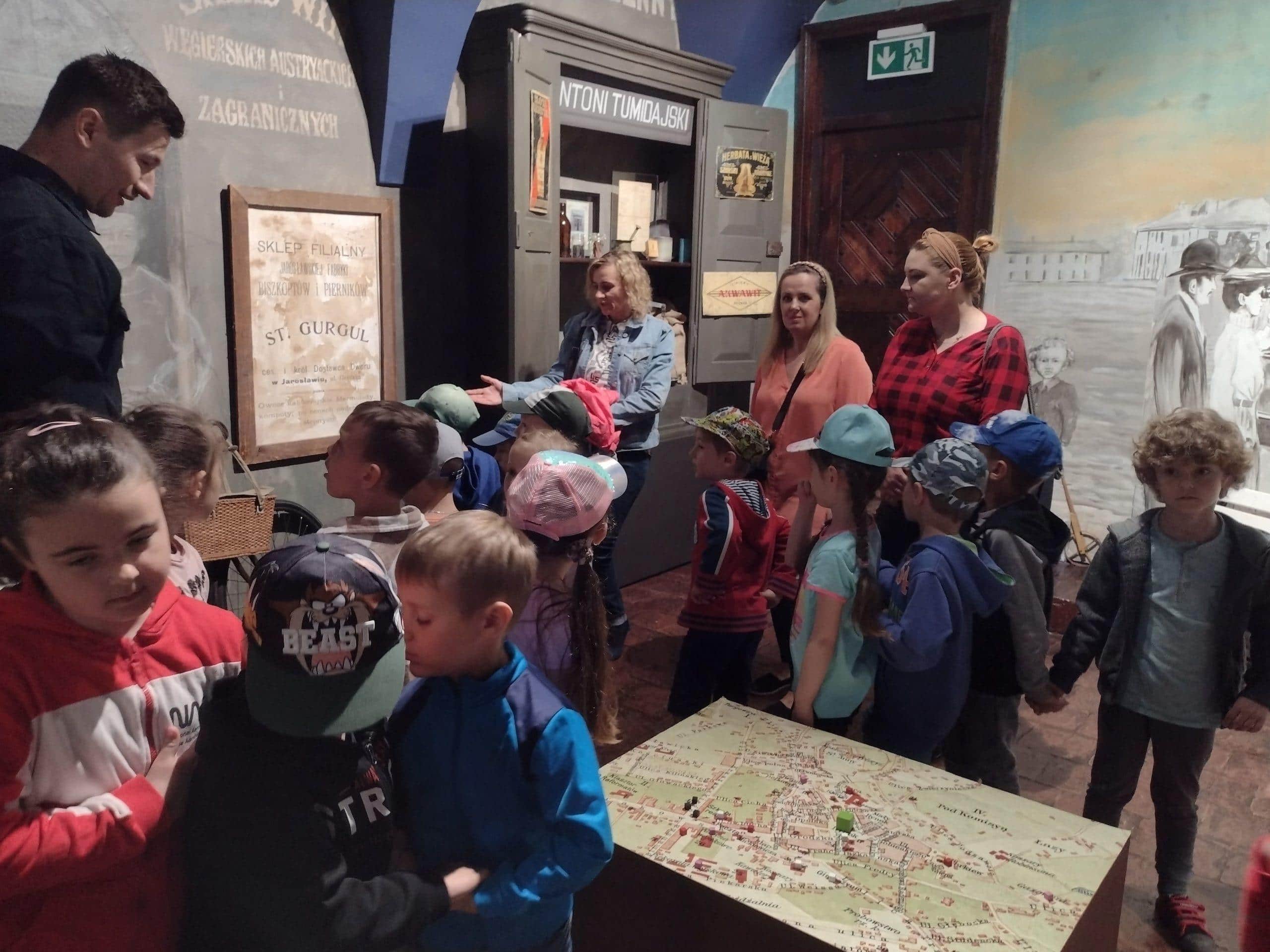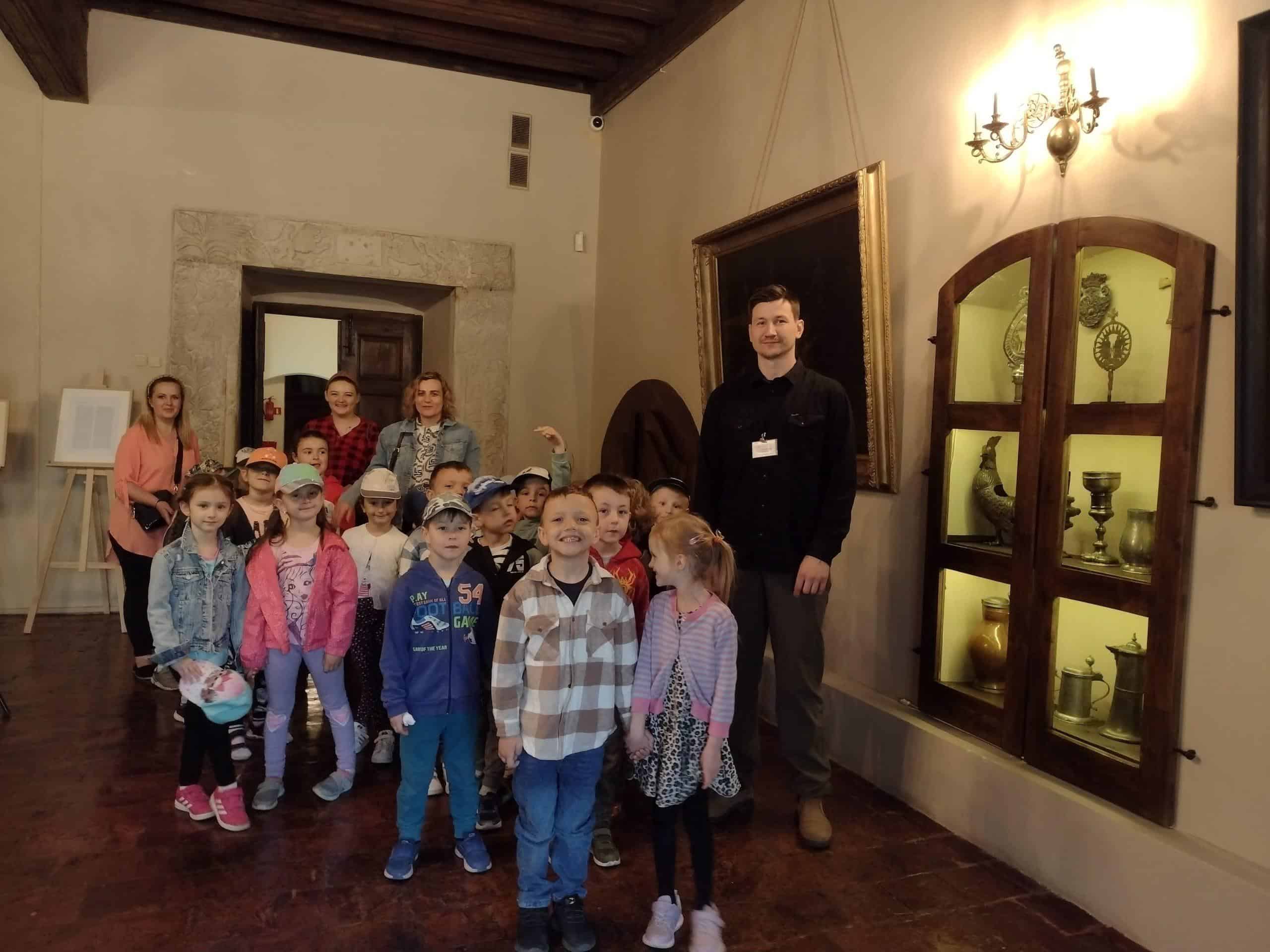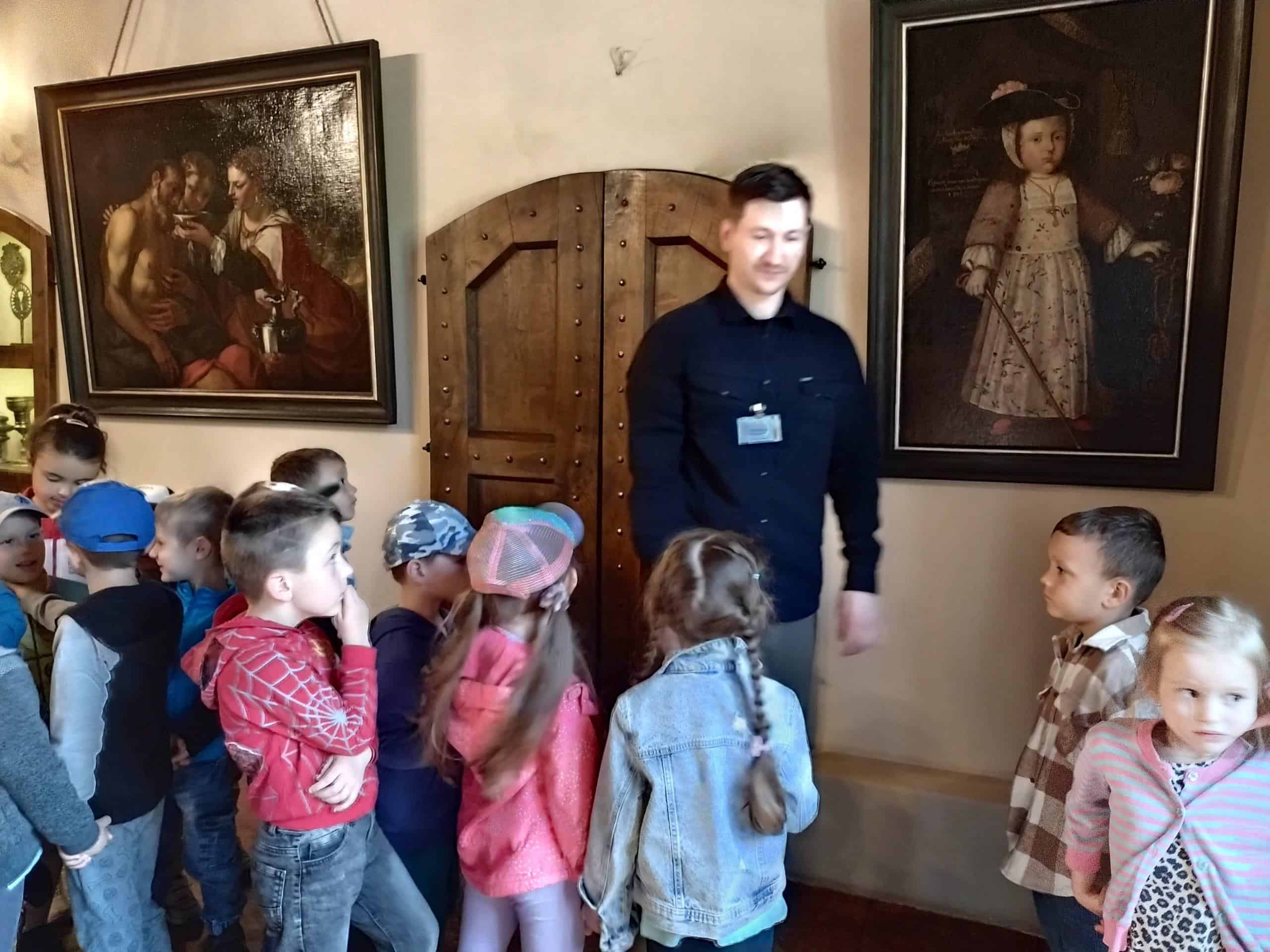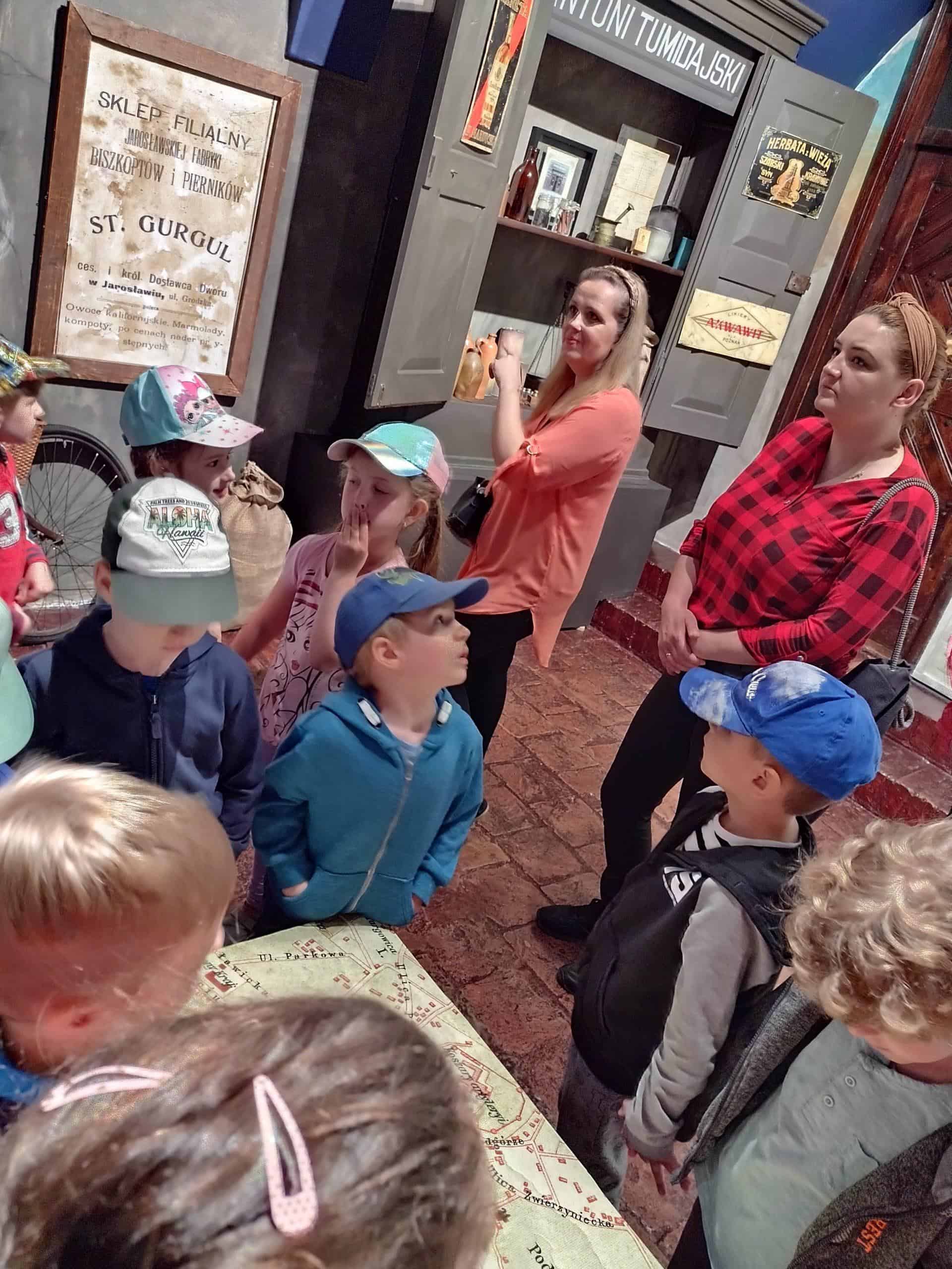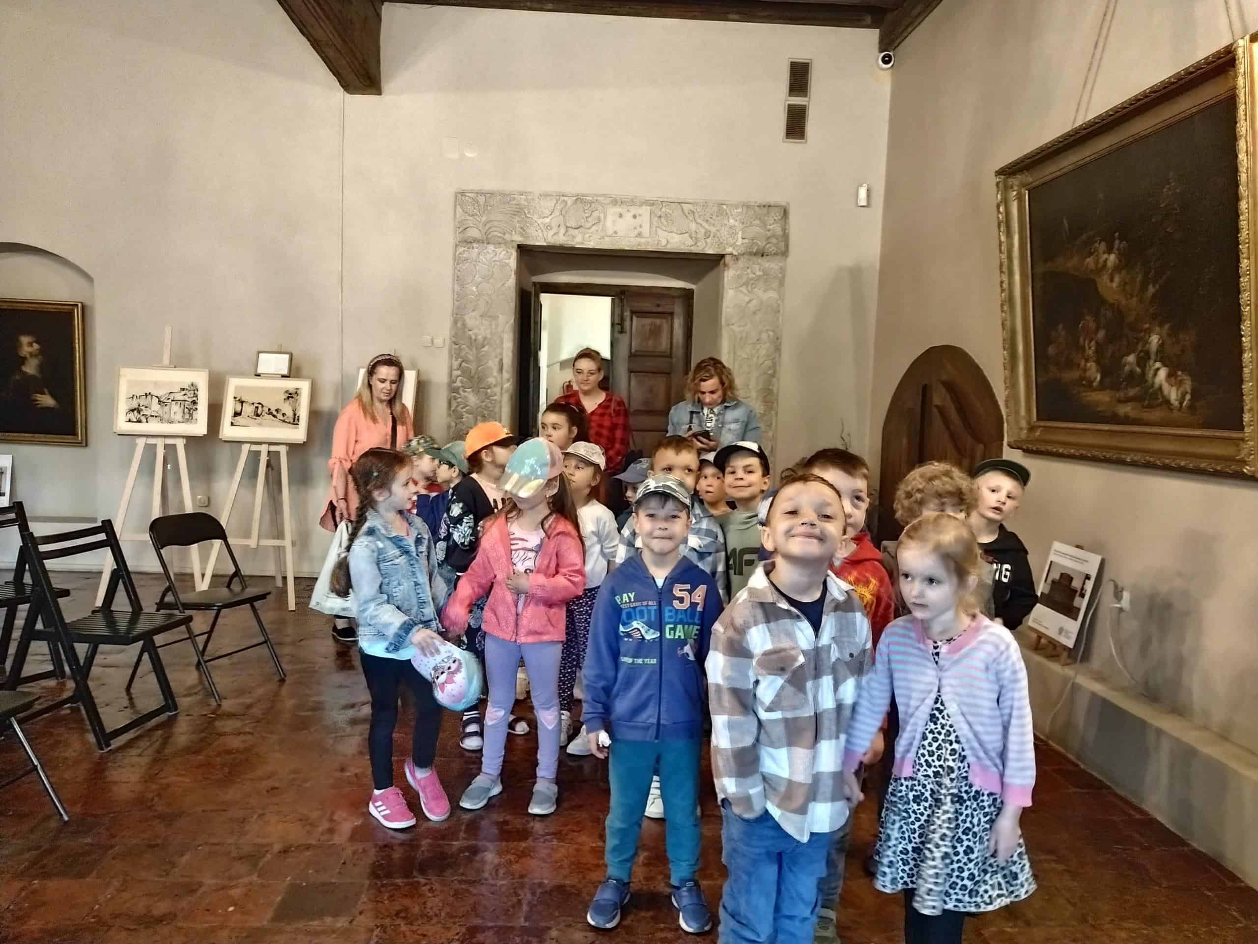 W dniu 19 maja starszaki z naszej grupy i grupy niebieskiej wybrały się razem na pieszą wycieczkę do jarosławskiego muzeum. Gdy dotarliśmy na rynek, nie mogliśmy się oprzeć urokowi pięknych, kolorowych kamieniczek otaczających rynek. Dzieci wypatrywały ozdobnych detali na fasadach kamienic, w różnych kształtach przypominających kwiaty i liście. Obejrzeliśmy także ratusz stojący w centralnym miejscu rynku, podziwialiśmy wieżę ratuszową i zegar na niej umieszczony. Największym zainteresowaniem cieszyła się jednak fontanna wyrzucająca raz po raz wodę. Gdy weszliśmy do muzeum, przywitała nas przewodnik, który oprowadzał dzieci po kupieckiej kamienicy Orsettich w Jarosławiu. Dzieci były zauroczone wnętrzami, zadawały dużo pytań i uważnie przyglądały się przedmiotom. Największą trudność sprawiło im nie dotykanie eksponatów, gdyż jak wiadomo dzieci, aby poznać – chcą dotknąć. Zwiedzaliśmy Wielką Izbę, gdzie właściciel gościł swoich partnerów w interesach i podpisywał ważne umowy kupieckie. Weszliśmy także na piętro, gdzie właściciele kamienicy mieli swoje prywatne pomieszczenia. Dzieci stwierdziły, że jest tam jak w zamku i dało się słyszeć głosy zachwytu nad wnętrzami. Co rusz odkrywały ciekawe przedmioty, które na pierwszy rzut oka nie zdradzały swojego przeznaczenia, dopiero po wyjaśnieniach pana przewodnika wszystko stawało się jasne. Na zakończenie dzieci mogły przenieść się starodawnego sklepu z zabytkową kasą, a także samodzielnie wykonać kartki pamiątkowe, a także otrzymały przewodniki dla dzieci „Jarosław (nie) do poznania. Wycieczka była bardzo udana i dzieci jeszcze do końca dnia wspominały, co ciekawego widziały w muzeum.