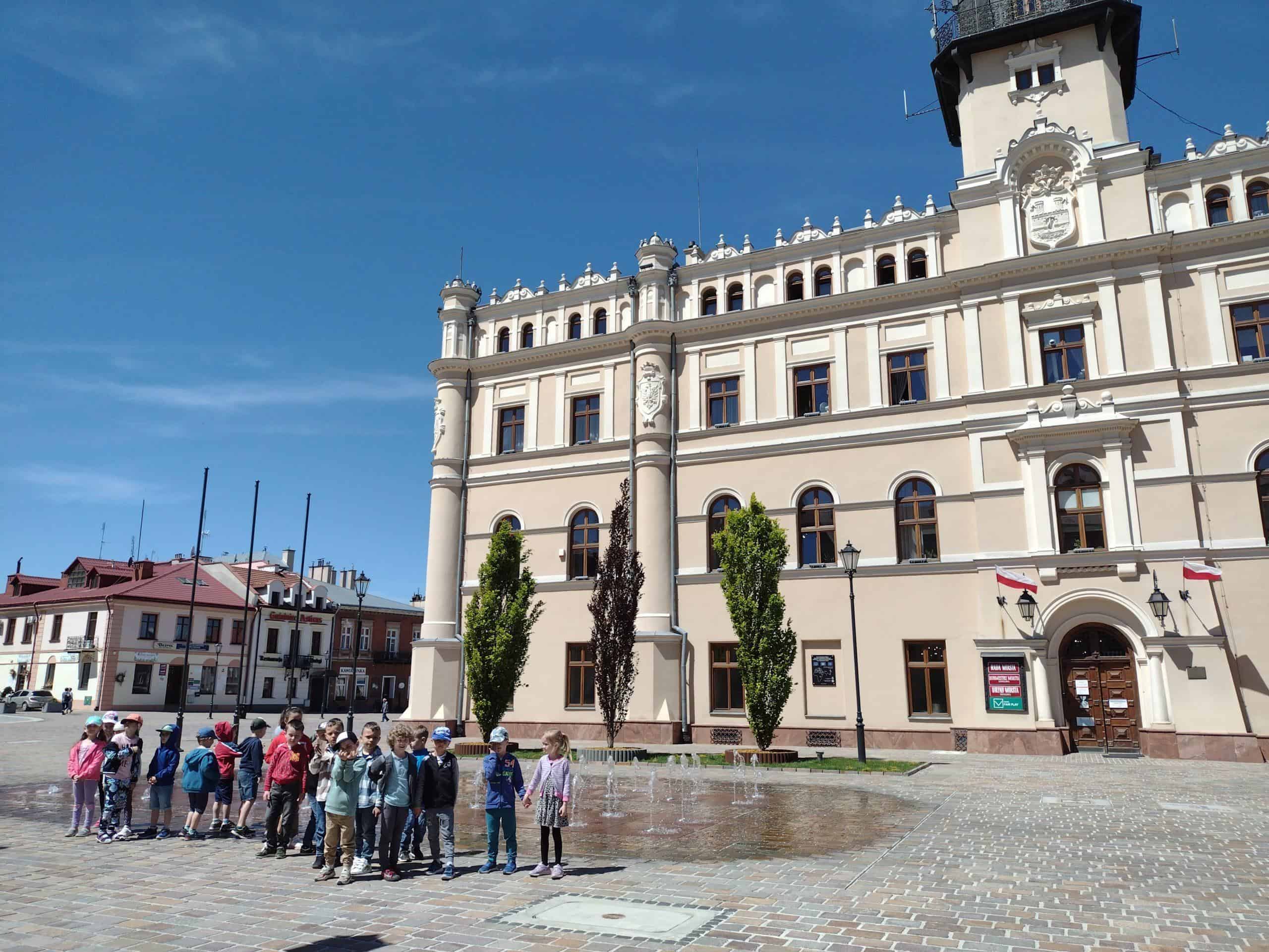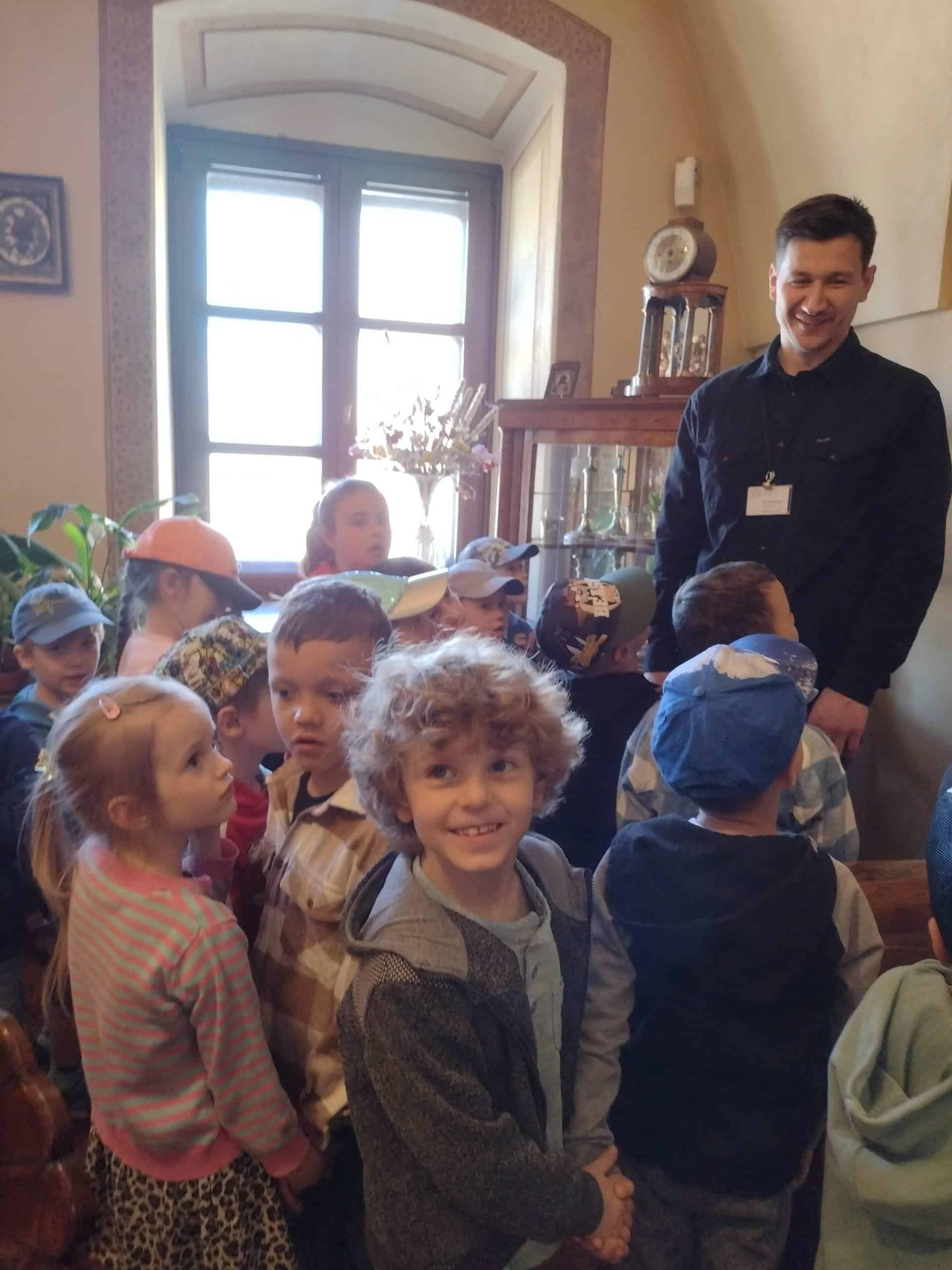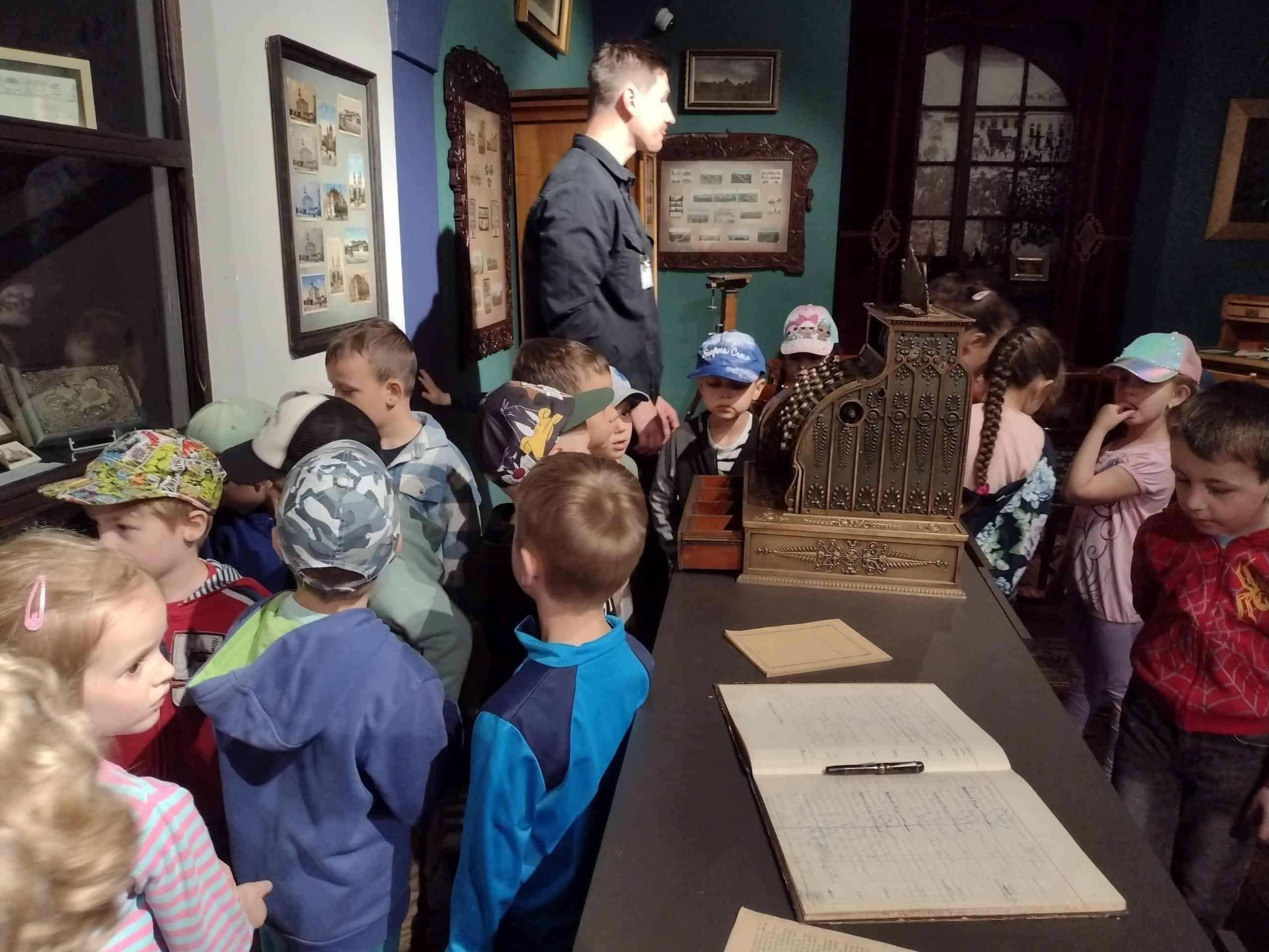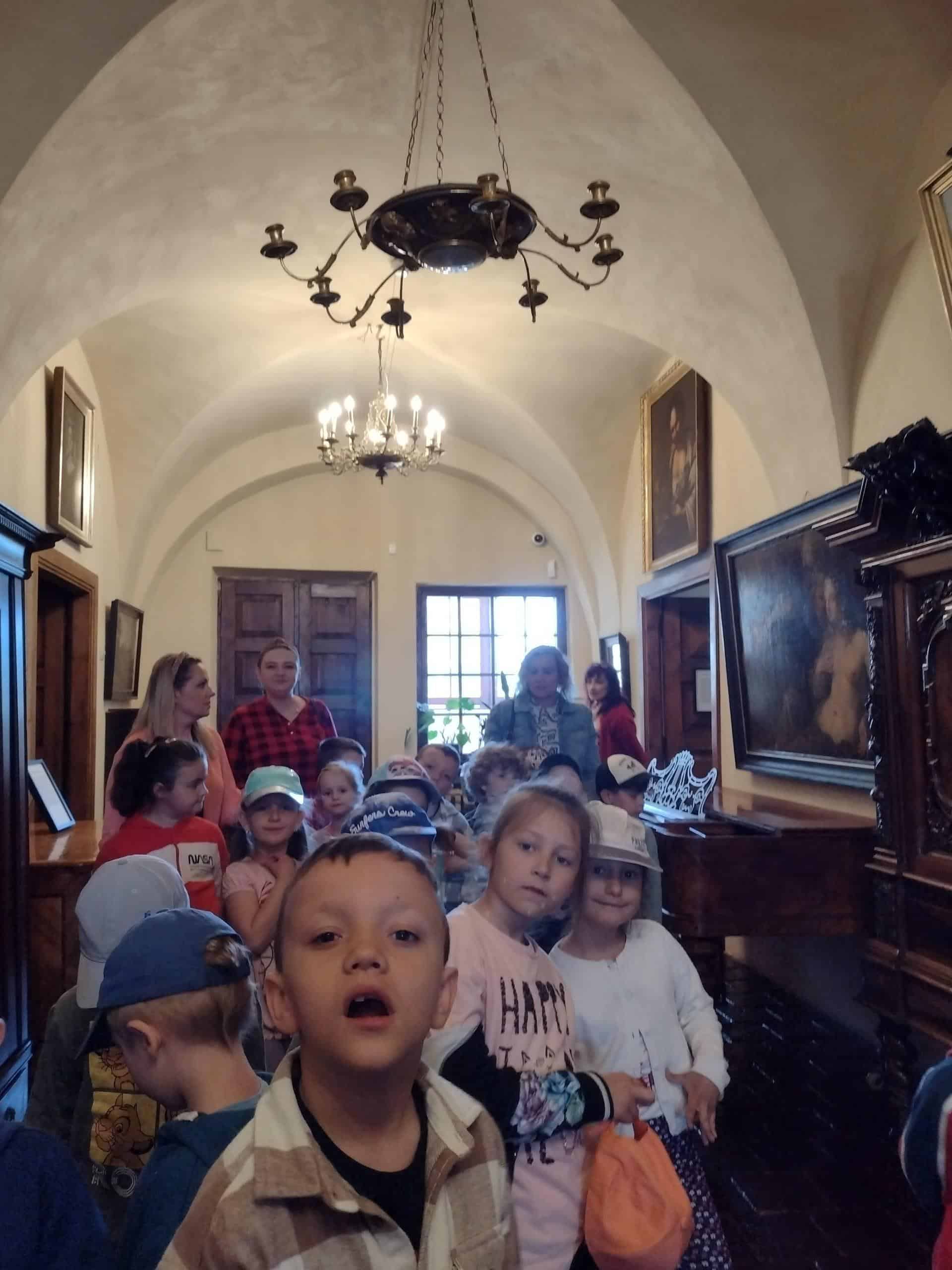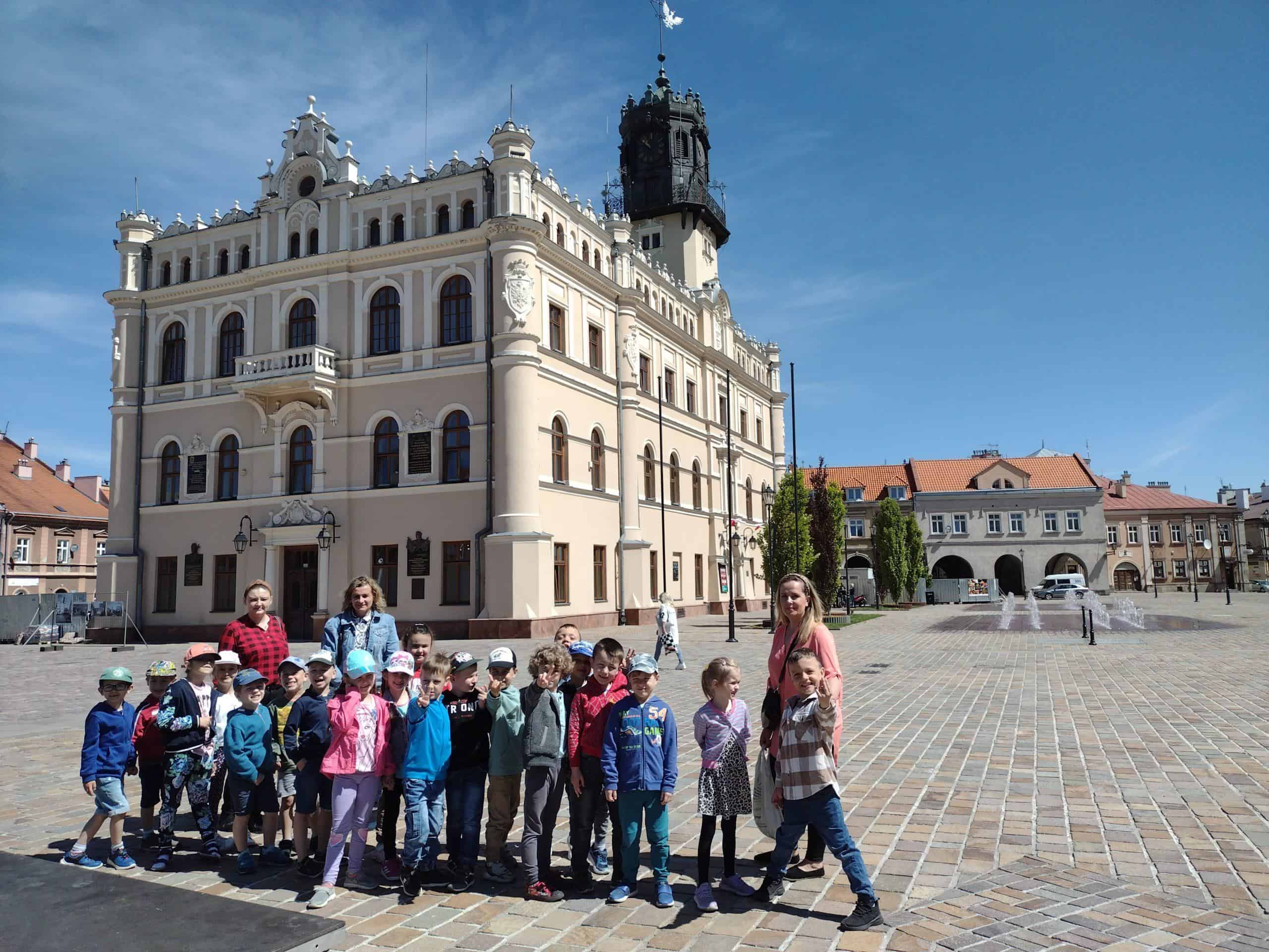 W dniu 19 maja starszaki z naszej grupy i grupy niebieskiej wybrały się razem na pieszą wycieczkę do jarosławskiego muzeum. Gdy dotarliśmy na rynek, nie mogliśmy się oprzeć urokowi pięknych, kolorowych kamieniczek otaczających rynek. Dzieci wypatrywały ozdobnych detali na fasadach kamienic, w różnych kształtach przypominających kwiaty i liście. Obejrzeliśmy także ratusz stojący w centralnym miejscu rynku, podziwialiśmy wieżę ratuszową i zegar na niej umieszczony. Największym zainteresowaniem cieszyła się jednak fontanna wyrzucająca raz po raz wodę. Gdy weszliśmy do muzeum, przywitała nas przewodnik, który oprowadzał dzieci po kupieckiej kamienicy Orsettich w Jarosławiu. Dzieci były zauroczone wnętrzami, zadawały dużo pytań i uważnie przyglądały się przedmiotom. Największą trudność sprawiło im nie dotykanie eksponatów, gdyż jak wiadomo dzieci, aby poznać – chcą dotknąć. Zwiedzaliśmy Wielką Izbę, gdzie właściciel gościł swoich partnerów w interesach i podpisywał ważne umowy kupieckie. Weszliśmy także na piętro, gdzie właściciele kamienicy mieli swoje prywatne pomieszczenia. Dzieci stwierdziły, że jest tam jak w zamku i dało się słyszeć głosy zachwytu nad wnętrzami. Co rusz odkrywały ciekawe przedmioty, które na pierwszy rzut oka nie zdradzały swojego przeznaczenia, dopiero po wyjaśnieniach pana przewodnika wszystko stawało się jasne. Na zakończenie dzieci mogły przenieść się starodawnego sklepu z zabytkową kasą, a także samodzielnie wykonać kartki pamiątkowe, a także otrzymały przewodniki dla dzieci „Jarosław (nie) do poznania. Wycieczka była bardzo udana i dzieci jeszcze do końca dnia wspominały, co ciekawego widziały w muzeum.