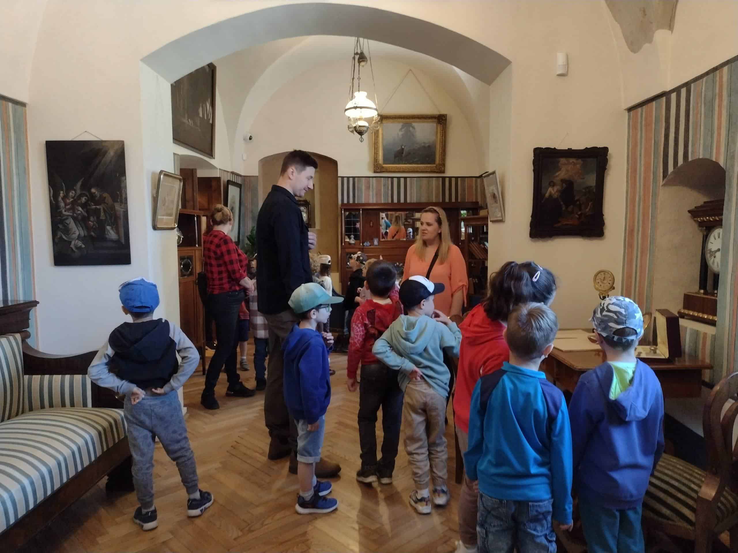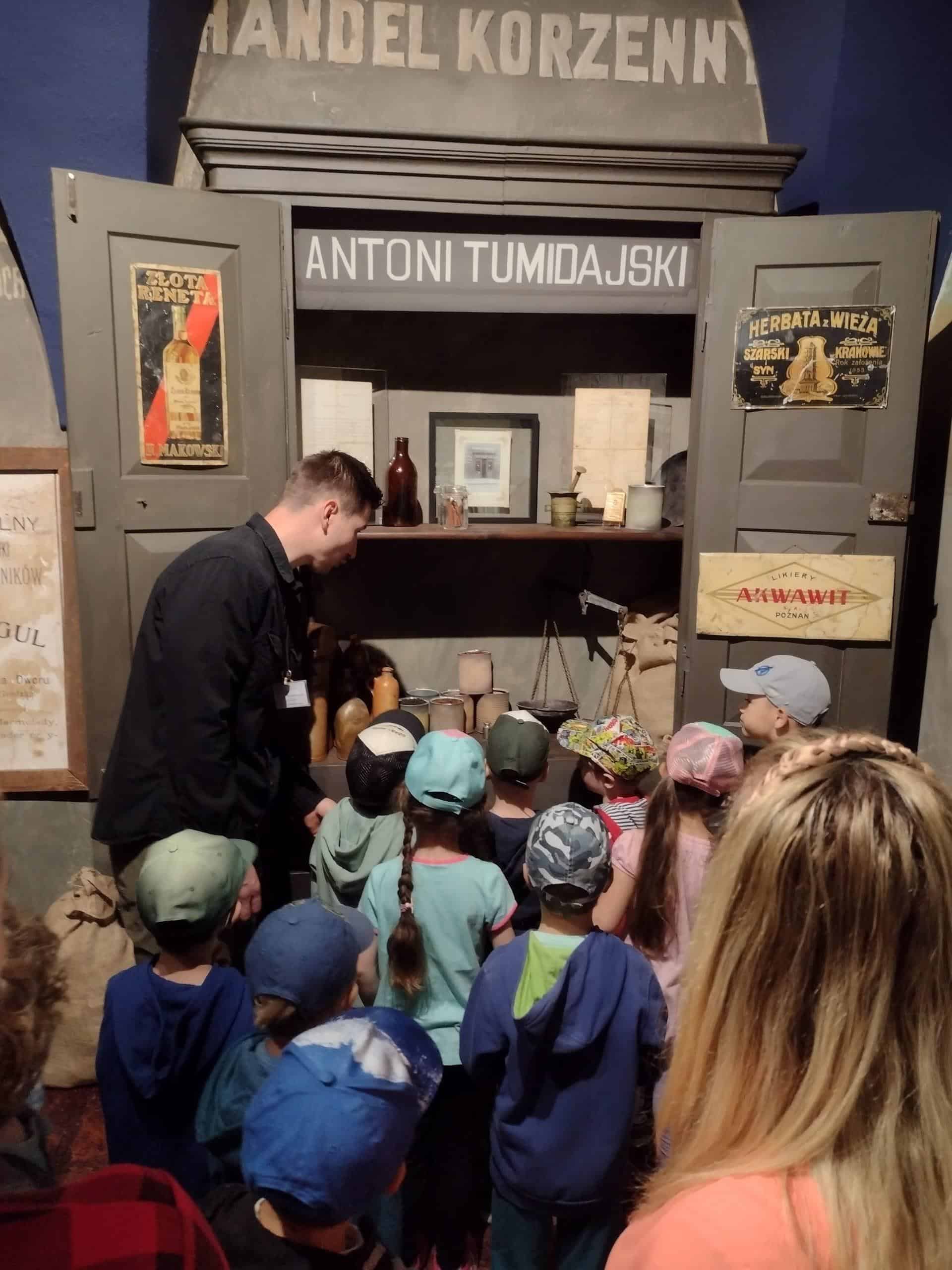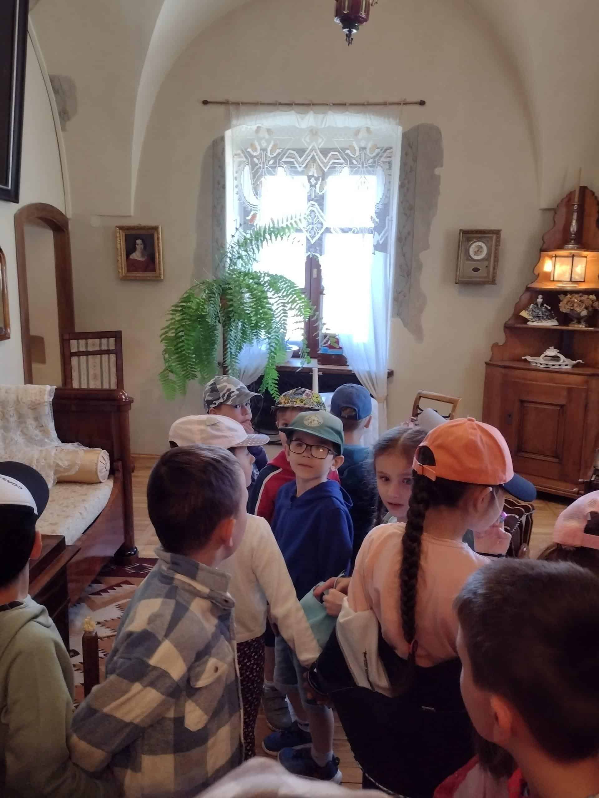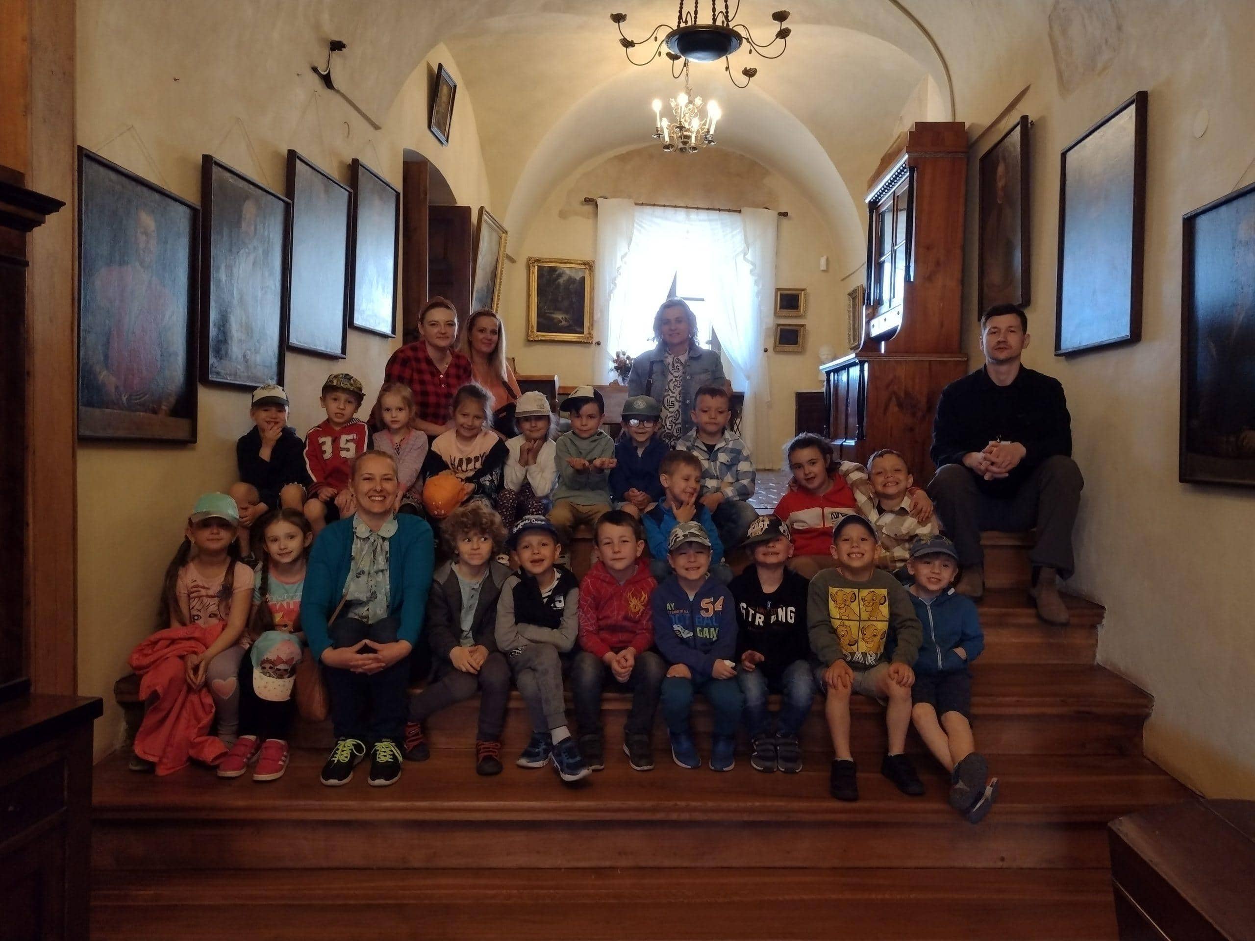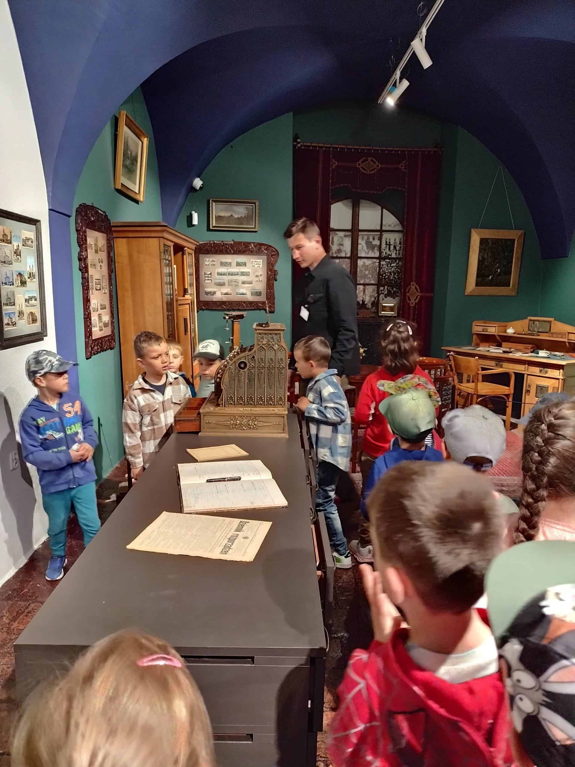 W dniu 19 maja starszaki z naszej grupy i grupy niebieskiej wybrały się razem na pieszą wycieczkę do jarosławskiego muzeum. Gdy dotarliśmy na rynek, nie mogliśmy się oprzeć urokowi pięknych, kolorowych kamieniczek otaczających rynek. Dzieci wypatrywały ozdobnych detali na fasadach kamienic, w różnych kształtach przypominających kwiaty i liście. Obejrzeliśmy także ratusz stojący w centralnym miejscu rynku, podziwialiśmy wieżę ratuszową i zegar na niej umieszczony. Największym zainteresowaniem cieszyła się jednak fontanna wyrzucająca raz po raz wodę. Gdy weszliśmy do muzeum, przywitała nas przewodnik, który oprowadzał dzieci po kupieckiej kamienicy Orsettich w Jarosławiu. Dzieci były zauroczone wnętrzami, zadawały dużo pytań i uważnie przyglądały się przedmiotom. Największą trudność sprawiło im nie dotykanie eksponatów, gdyż jak wiadomo dzieci, aby poznać – chcą dotknąć. Zwiedzaliśmy Wielką Izbę, gdzie właściciel gościł swoich partnerów w interesach i podpisywał ważne umowy kupieckie. Weszliśmy także na piętro, gdzie właściciele kamienicy mieli swoje prywatne pomieszczenia. Dzieci stwierdziły, że jest tam jak w zamku i dało się słyszeć głosy zachwytu nad wnętrzami. Co rusz odkrywały ciekawe przedmioty, które na pierwszy rzut oka nie zdradzały swojego przeznaczenia, dopiero po wyjaśnieniach pana przewodnika wszystko stawało się jasne. Na zakończenie dzieci mogły przenieść się starodawnego sklepu z zabytkową kasą, a także samodzielnie wykonać kartki pamiątkowe, a także otrzymały przewodniki dla dzieci „Jarosław (nie) do poznania. Wycieczka była bardzo udana i dzieci jeszcze do końca dnia wspominały, co ciekawego widziały w muzeum.