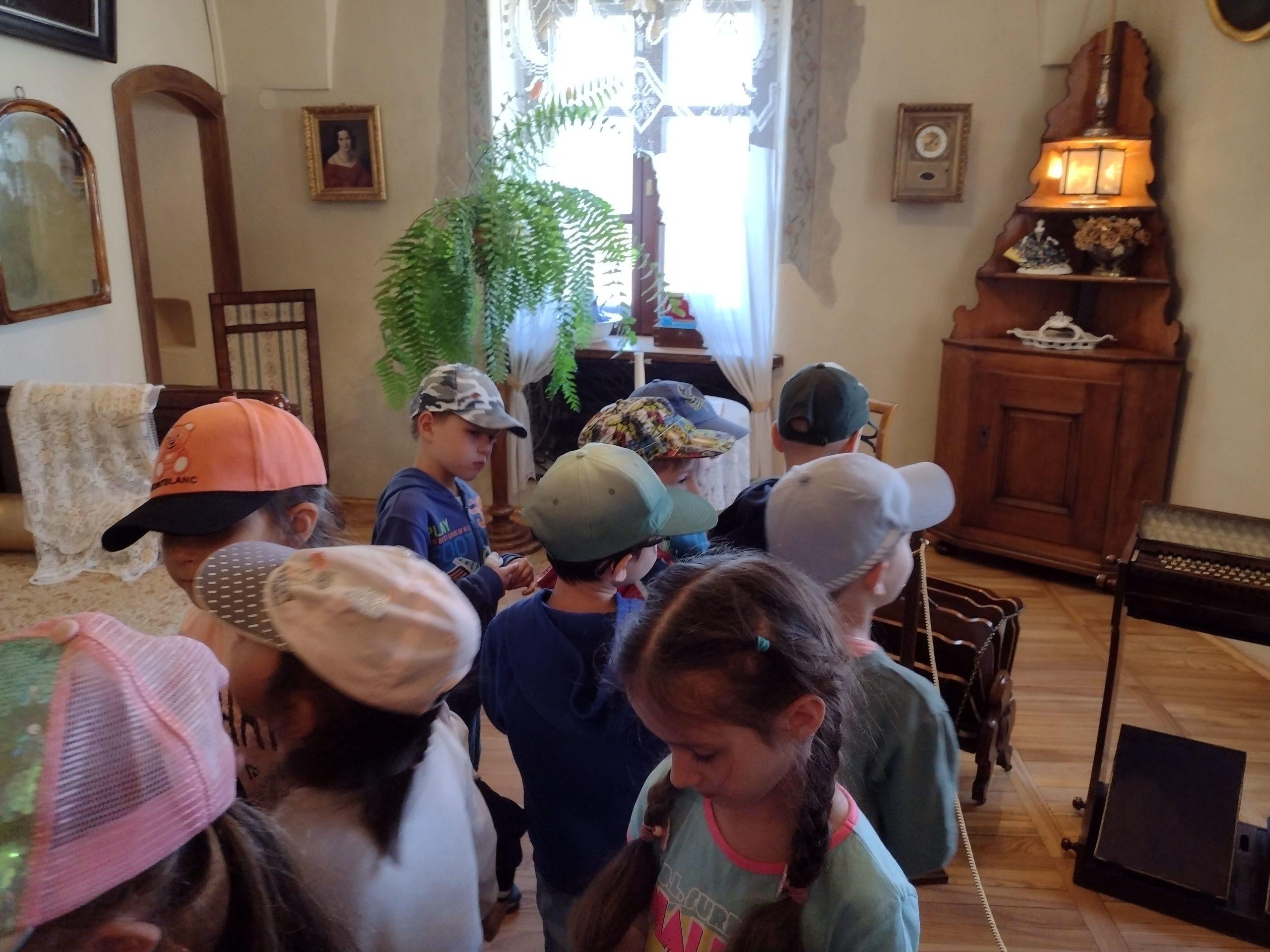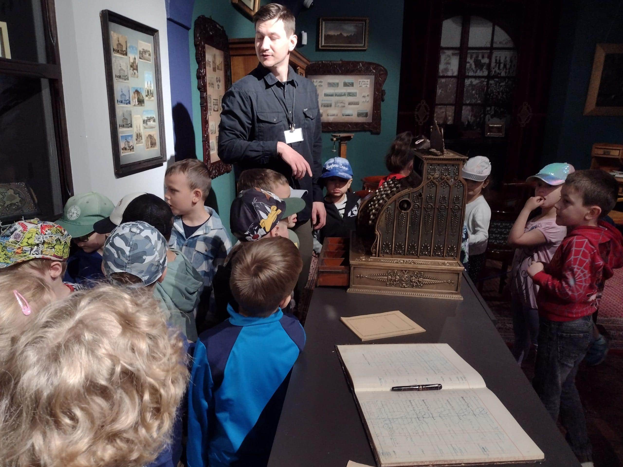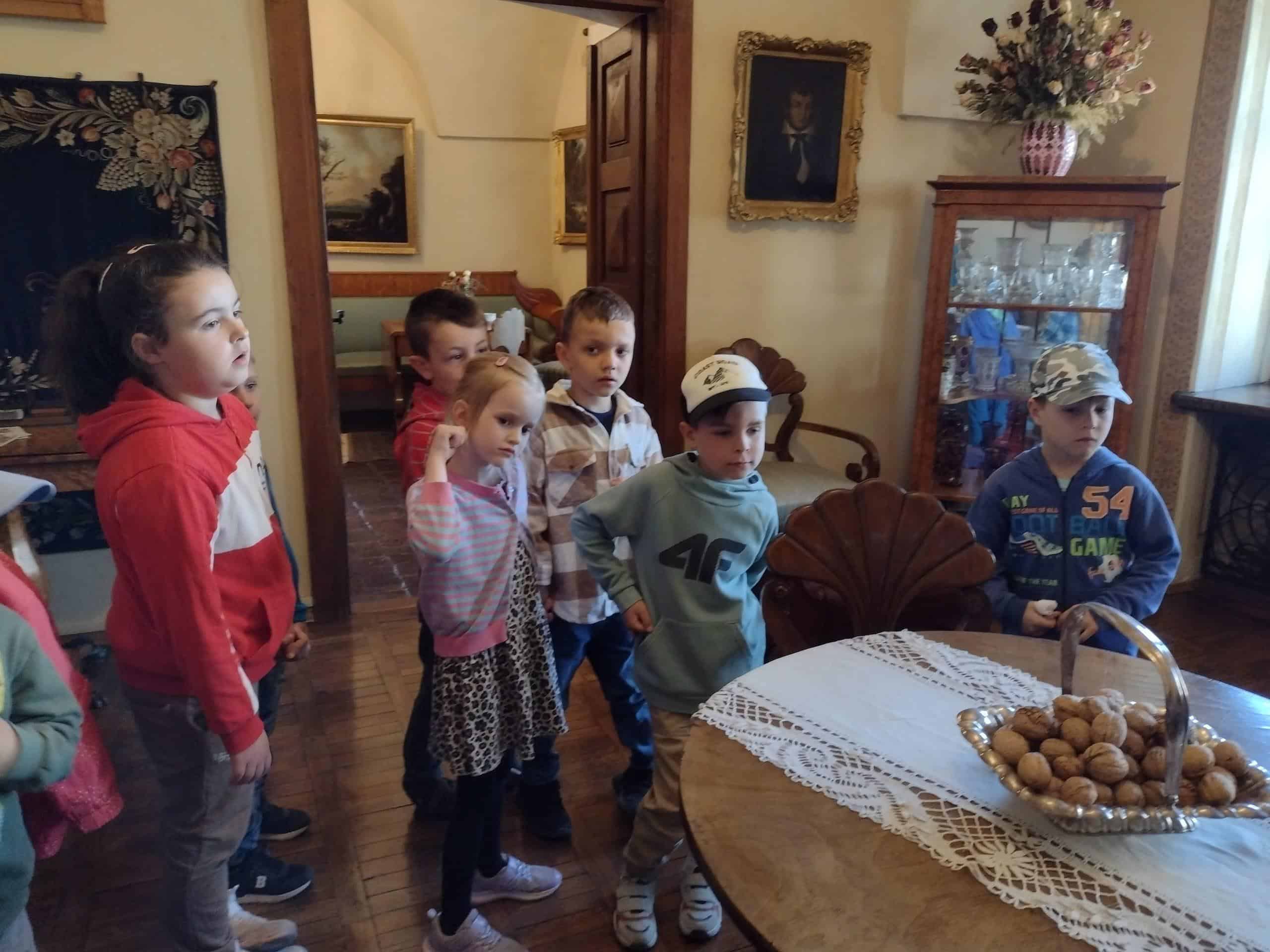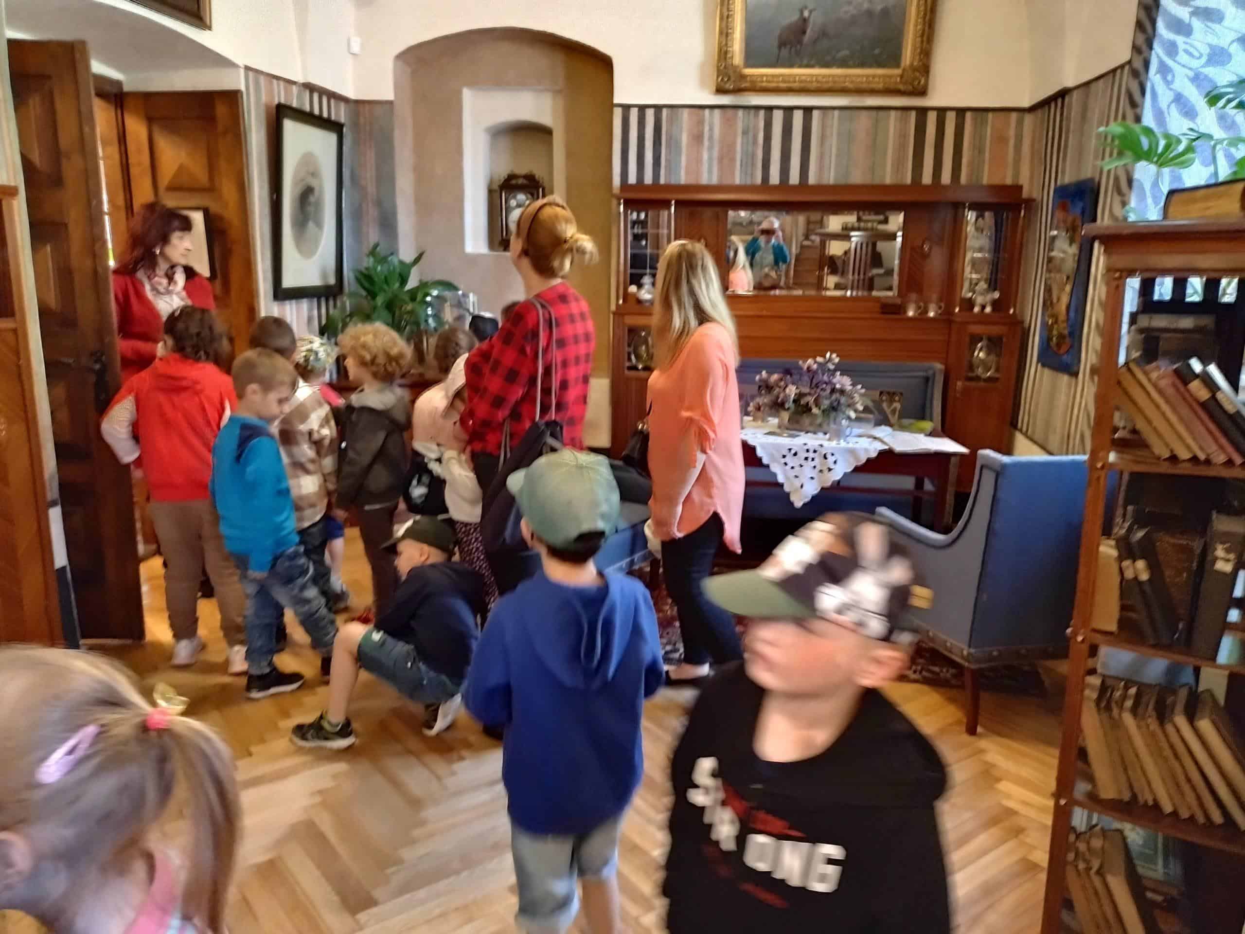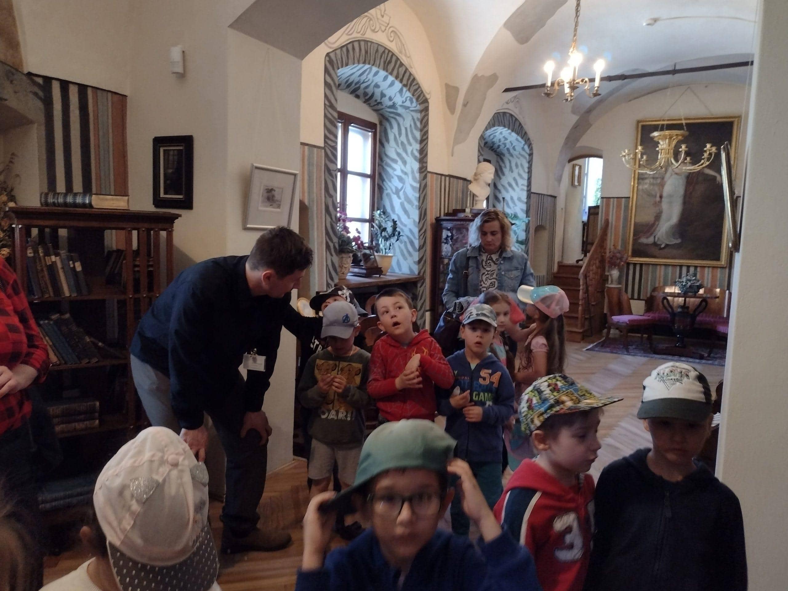 W dniu 19 maja starszaki z naszej grupy i grupy niebieskiej wybrały się razem na pieszą wycieczkę do jarosławskiego muzeum. Gdy dotarliśmy na rynek, nie mogliśmy się oprzeć urokowi pięknych, kolorowych kamieniczek otaczających rynek. Dzieci wypatrywały ozdobnych detali na fasadach kamienic, w różnych kształtach przypominających kwiaty i liście. Obejrzeliśmy także ratusz stojący w centralnym miejscu rynku, podziwialiśmy wieżę ratuszową i zegar na niej umieszczony. Największym zainteresowaniem cieszyła się jednak fontanna wyrzucająca raz po raz wodę. Gdy weszliśmy do muzeum, przywitała nas przewodnik, który oprowadzał dzieci po kupieckiej kamienicy Orsettich w Jarosławiu. Dzieci były zauroczone wnętrzami, zadawały dużo pytań i uważnie przyglądały się przedmiotom. Największą trudność sprawiło im nie dotykanie eksponatów, gdyż jak wiadomo dzieci, aby poznać – chcą dotknąć. Zwiedzaliśmy Wielką Izbę, gdzie właściciel gościł swoich partnerów w interesach i podpisywał ważne umowy kupieckie. Weszliśmy także na piętro, gdzie właściciele kamienicy mieli swoje prywatne pomieszczenia. Dzieci stwierdziły, że jest tam jak w zamku i dało się słyszeć głosy zachwytu nad wnętrzami. Co rusz odkrywały ciekawe przedmioty, które na pierwszy rzut oka nie zdradzały swojego przeznaczenia, dopiero po wyjaśnieniach pana przewodnika wszystko stawało się jasne. Na zakończenie dzieci mogły przenieść się starodawnego sklepu z zabytkową kasą, a także samodzielnie wykonać kartki pamiątkowe, a także otrzymały przewodniki dla dzieci „Jarosław (nie) do poznania. Wycieczka była bardzo udana i dzieci jeszcze do końca dnia wspominały, co ciekawego widziały w muzeum.