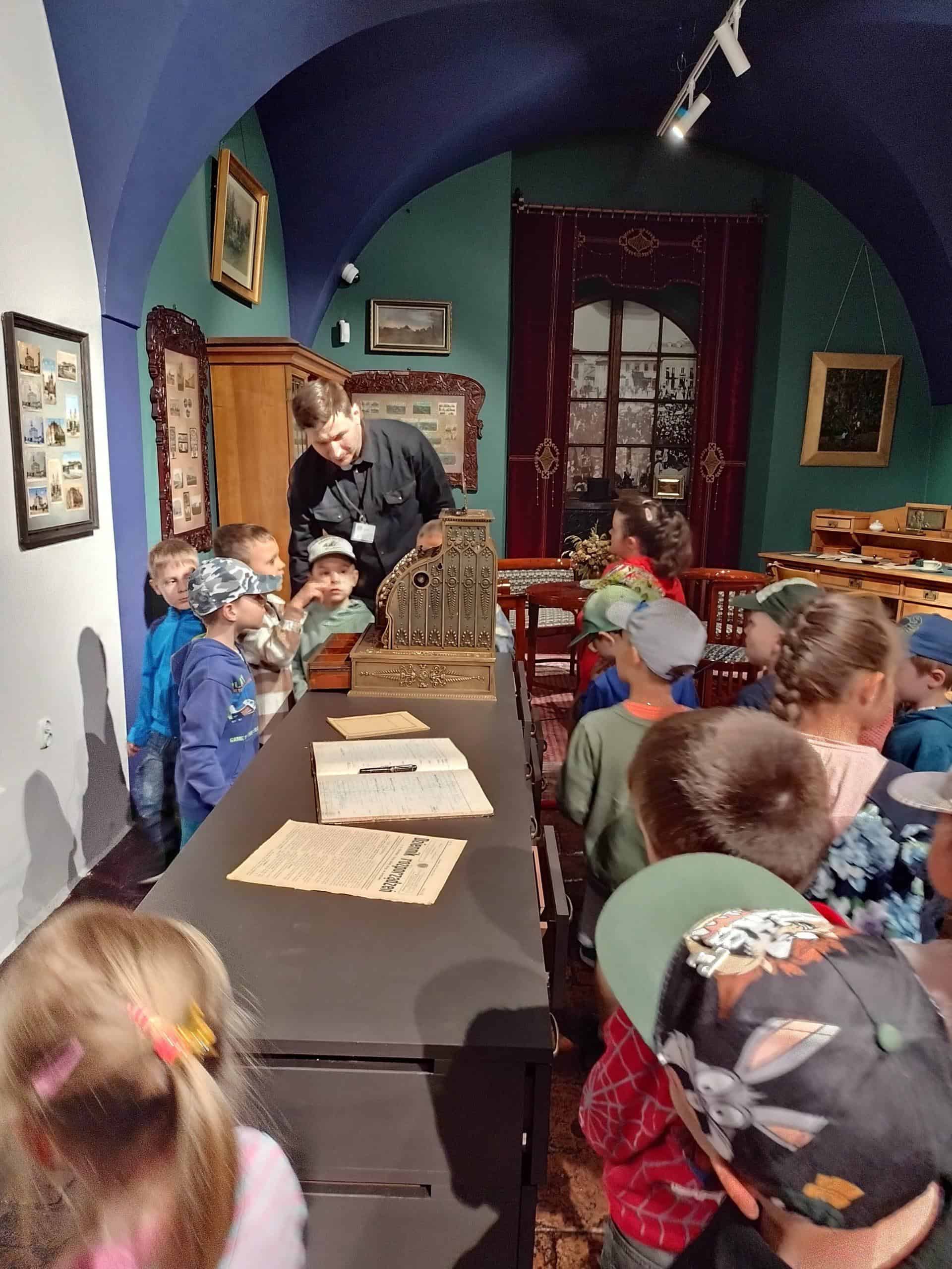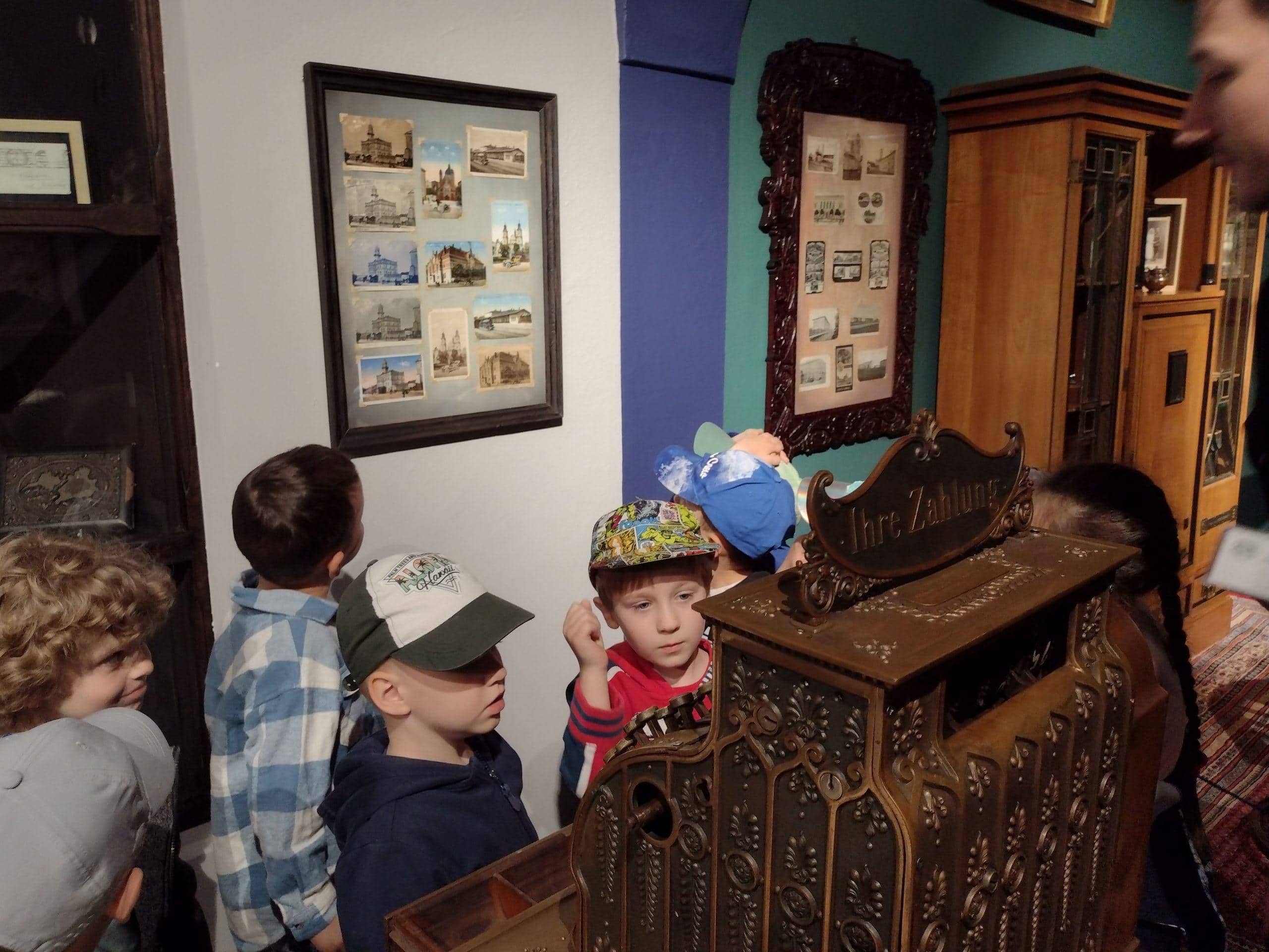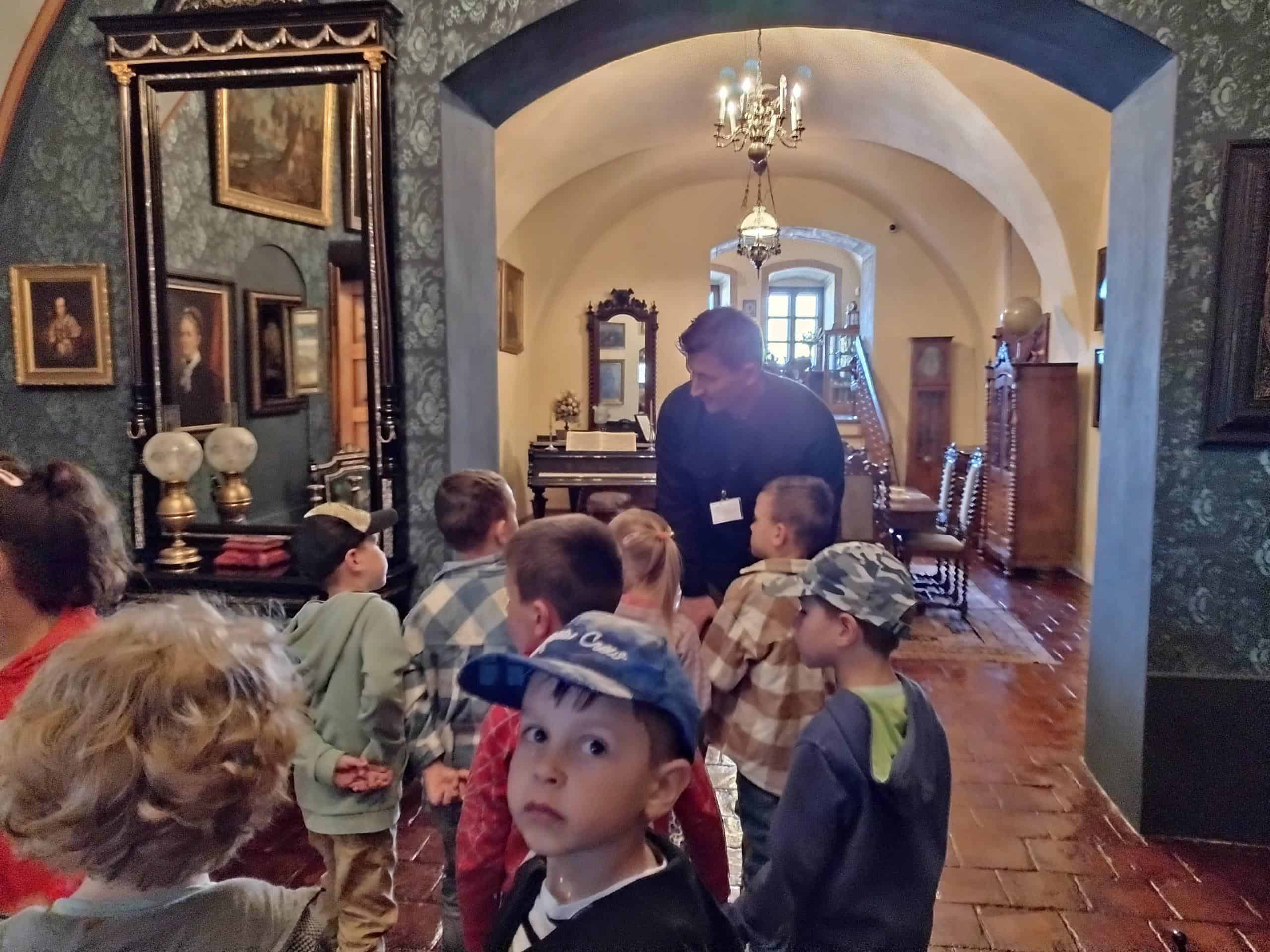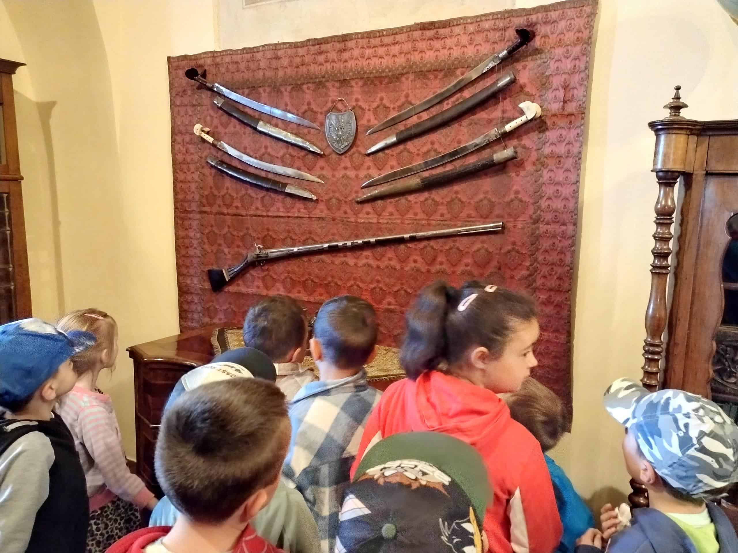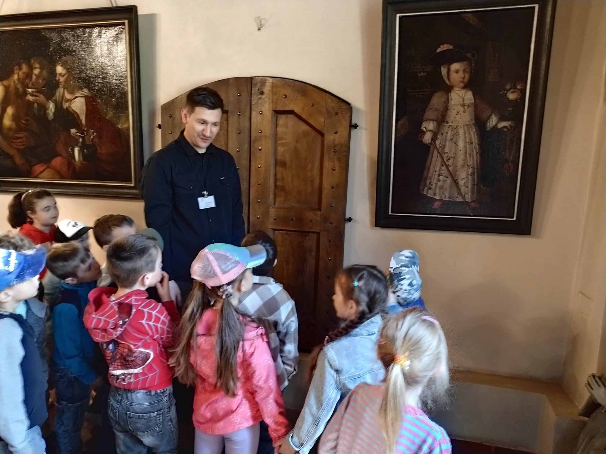 W dniu 19 maja starszaki z naszej grupy i grupy niebieskiej wybrały się razem na pieszą wycieczkę do jarosławskiego muzeum. Gdy dotarliśmy na rynek, nie mogliśmy się oprzeć urokowi pięknych, kolorowych kamieniczek otaczających rynek. Dzieci wypatrywały ozdobnych detali na fasadach kamienic, w różnych kształtach przypominających kwiaty i liście. Obejrzeliśmy także ratusz stojący w centralnym miejscu rynku, podziwialiśmy wieżę ratuszową i zegar na niej umieszczony. Największym zainteresowaniem cieszyła się jednak fontanna wyrzucająca raz po raz wodę. Gdy weszliśmy do muzeum, przywitała nas przewodnik, który oprowadzał dzieci po kupieckiej kamienicy Orsettich w Jarosławiu. Dzieci były zauroczone wnętrzami, zadawały dużo pytań i uważnie przyglądały się przedmiotom. Największą trudność sprawiło im nie dotykanie eksponatów, gdyż jak wiadomo dzieci, aby poznać – chcą dotknąć. Zwiedzaliśmy Wielką Izbę, gdzie właściciel gościł swoich partnerów w interesach i podpisywał ważne umowy kupieckie. Weszliśmy także na piętro, gdzie właściciele kamienicy mieli swoje prywatne pomieszczenia. Dzieci stwierdziły, że jest tam jak w zamku i dało się słyszeć głosy zachwytu nad wnętrzami. Co rusz odkrywały ciekawe przedmioty, które na pierwszy rzut oka nie zdradzały swojego przeznaczenia, dopiero po wyjaśnieniach pana przewodnika wszystko stawało się jasne. Na zakończenie dzieci mogły przenieść się starodawnego sklepu z zabytkową kasą, a także samodzielnie wykonać kartki pamiątkowe, a także otrzymały przewodniki dla dzieci „Jarosław (nie) do poznania. Wycieczka była bardzo udana i dzieci jeszcze do końca dnia wspominały, co ciekawego widziały w muzeum.