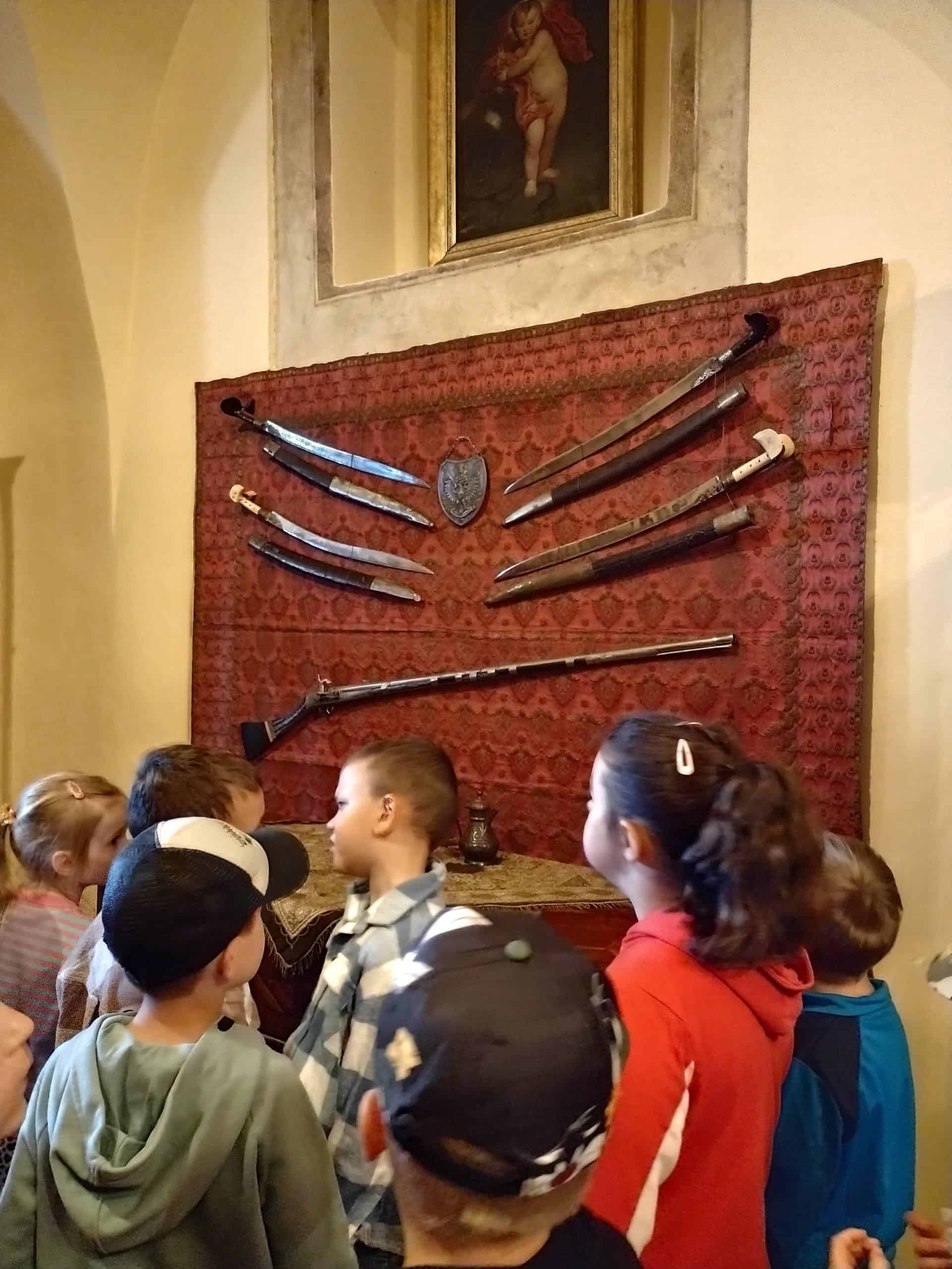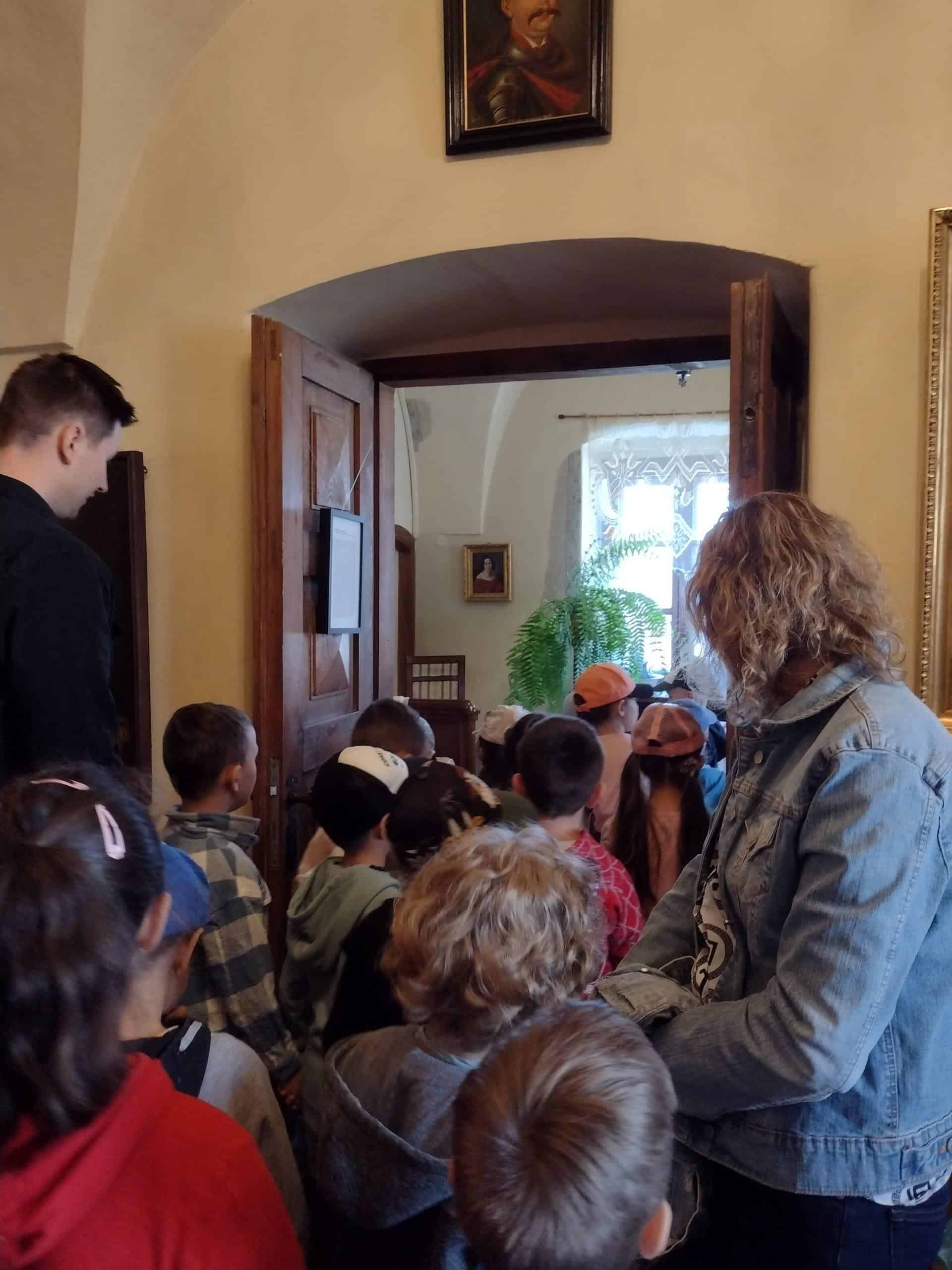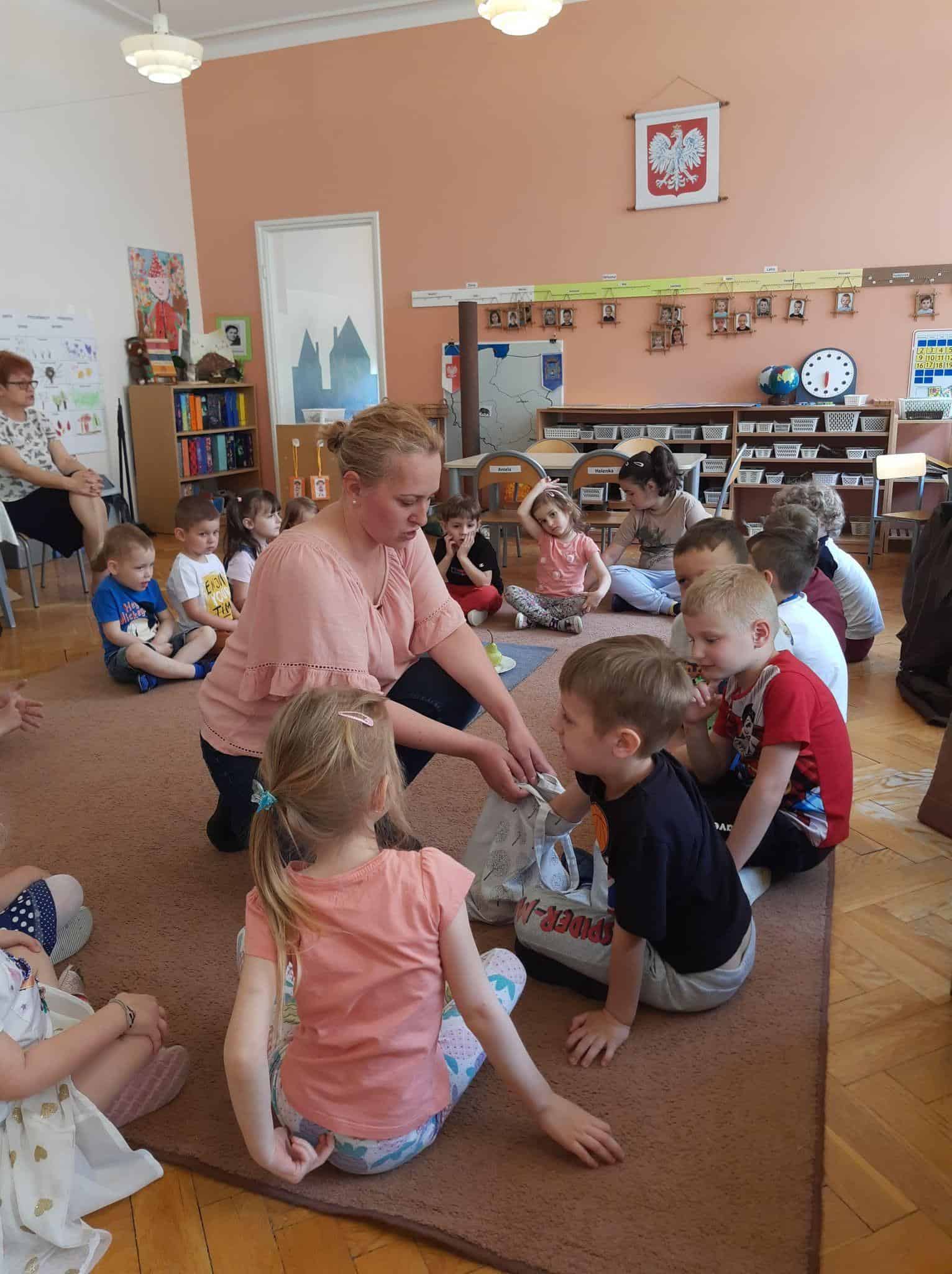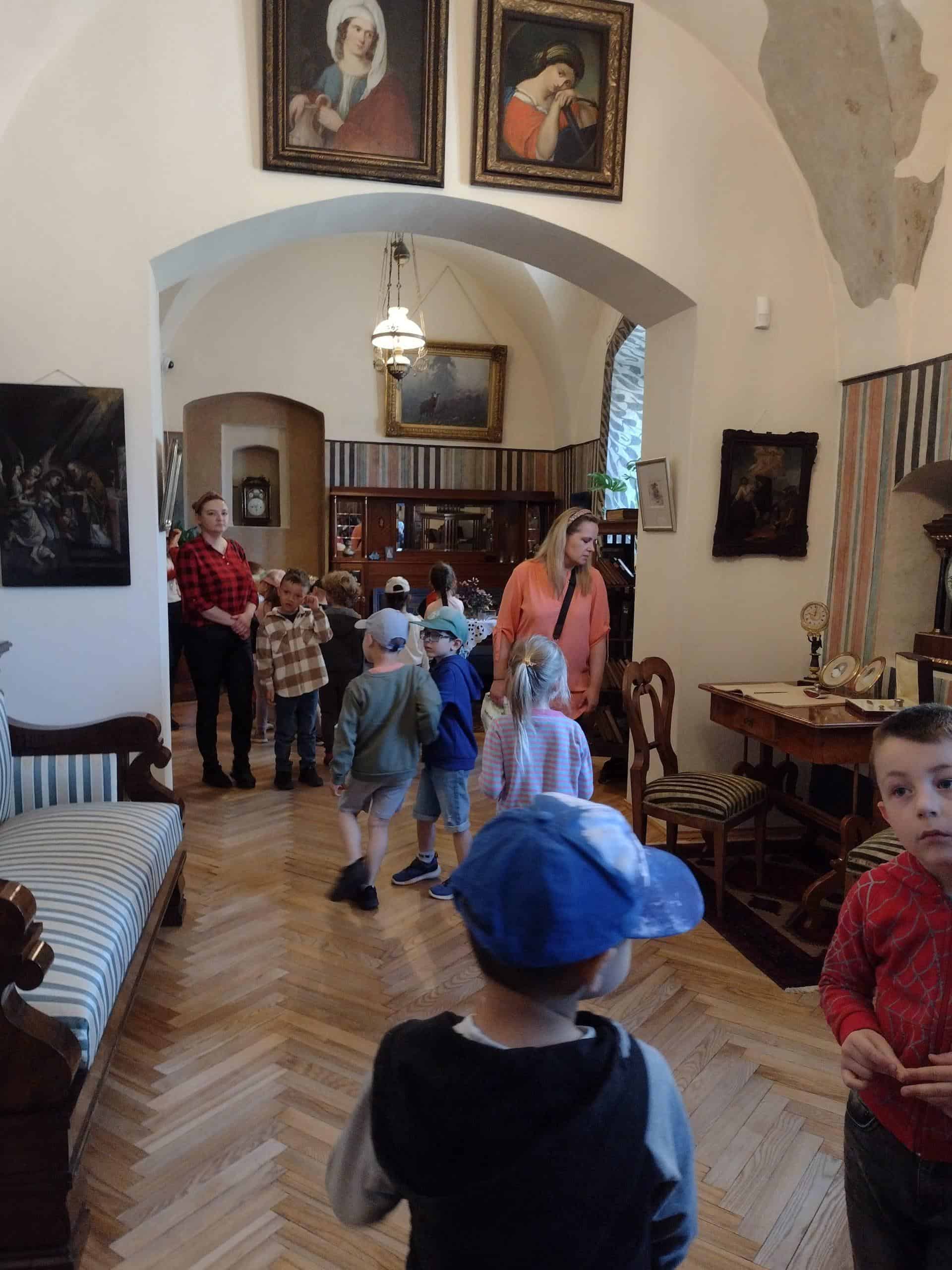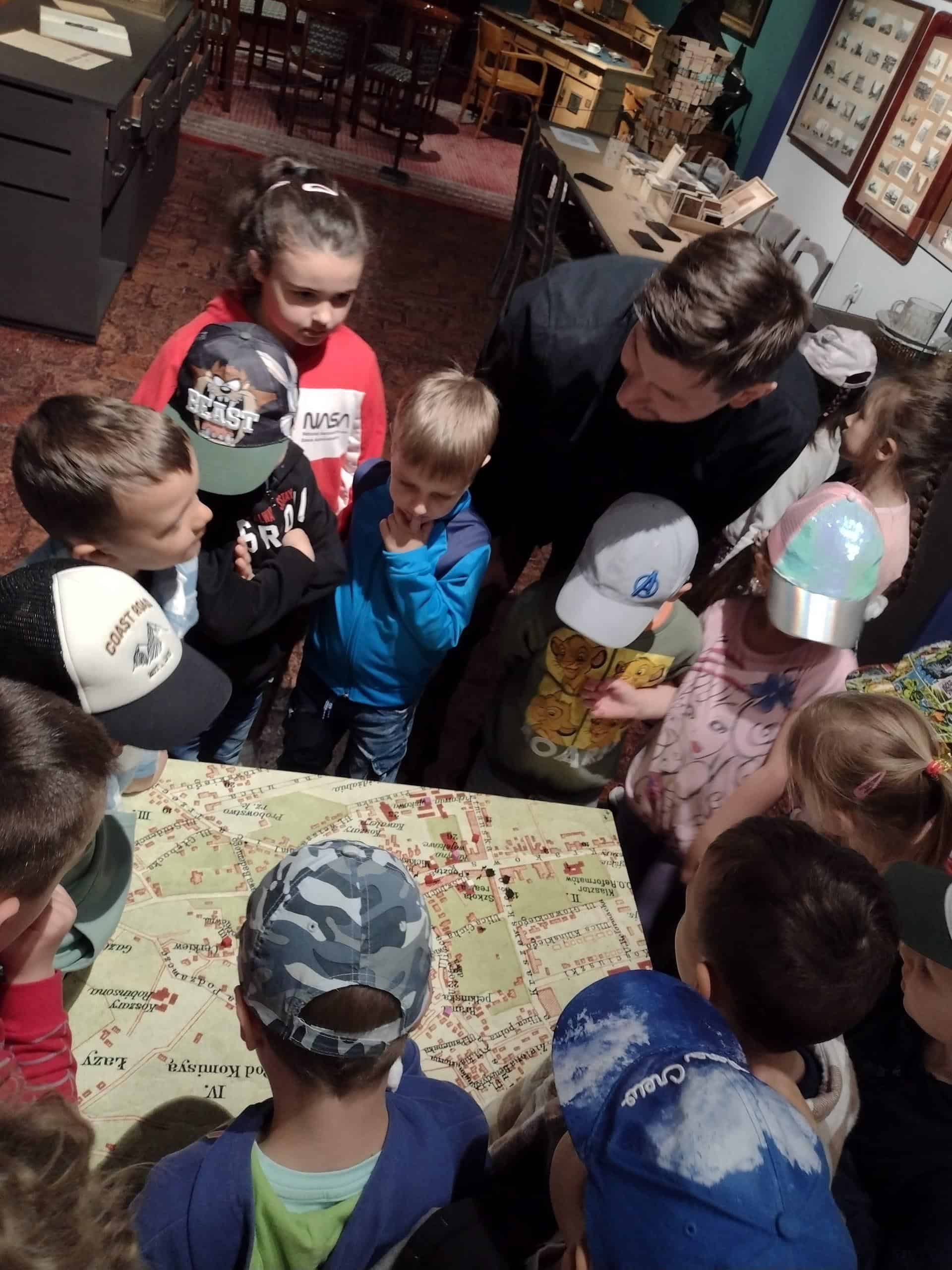 W dniu 19 maja starszaki z naszej grupy i grupy niebieskiej wybrały się razem na pieszą wycieczkę do jarosławskiego muzeum. Gdy dotarliśmy na rynek, nie mogliśmy się oprzeć urokowi pięknych, kolorowych kamieniczek otaczających rynek. Dzieci wypatrywały ozdobnych detali na fasadach kamienic, w różnych kształtach przypominających kwiaty i liście. Obejrzeliśmy także ratusz stojący w centralnym miejscu rynku, podziwialiśmy wieżę ratuszową i zegar na niej umieszczony. Największym zainteresowaniem cieszyła się jednak fontanna wyrzucająca raz po raz wodę. Gdy weszliśmy do muzeum, przywitała nas przewodnik, który oprowadzał dzieci po kupieckiej kamienicy Orsettich w Jarosławiu. Dzieci były zauroczone wnętrzami, zadawały dużo pytań i uważnie przyglądały się przedmiotom. Największą trudność sprawiło im nie dotykanie eksponatów, gdyż jak wiadomo dzieci, aby poznać – chcą dotknąć. Zwiedzaliśmy Wielką Izbę, gdzie właściciel gościł swoich partnerów w interesach i podpisywał ważne umowy kupieckie. Weszliśmy także na piętro, gdzie właściciele kamienicy mieli swoje prywatne pomieszczenia. Dzieci stwierdziły, że jest tam jak w zamku i dało się słyszeć głosy zachwytu nad wnętrzami. Co rusz odkrywały ciekawe przedmioty, które na pierwszy rzut oka nie zdradzały swojego przeznaczenia, dopiero po wyjaśnieniach pana przewodnika wszystko stawało się jasne. Na zakończenie dzieci mogły przenieść się starodawnego sklepu z zabytkową kasą, a także samodzielnie wykonać kartki pamiątkowe, a także otrzymały przewodniki dla dzieci „Jarosław (nie) do poznania. Wycieczka była bardzo udana i dzieci jeszcze do końca dnia wspominały, co ciekawego widziały w muzeum.