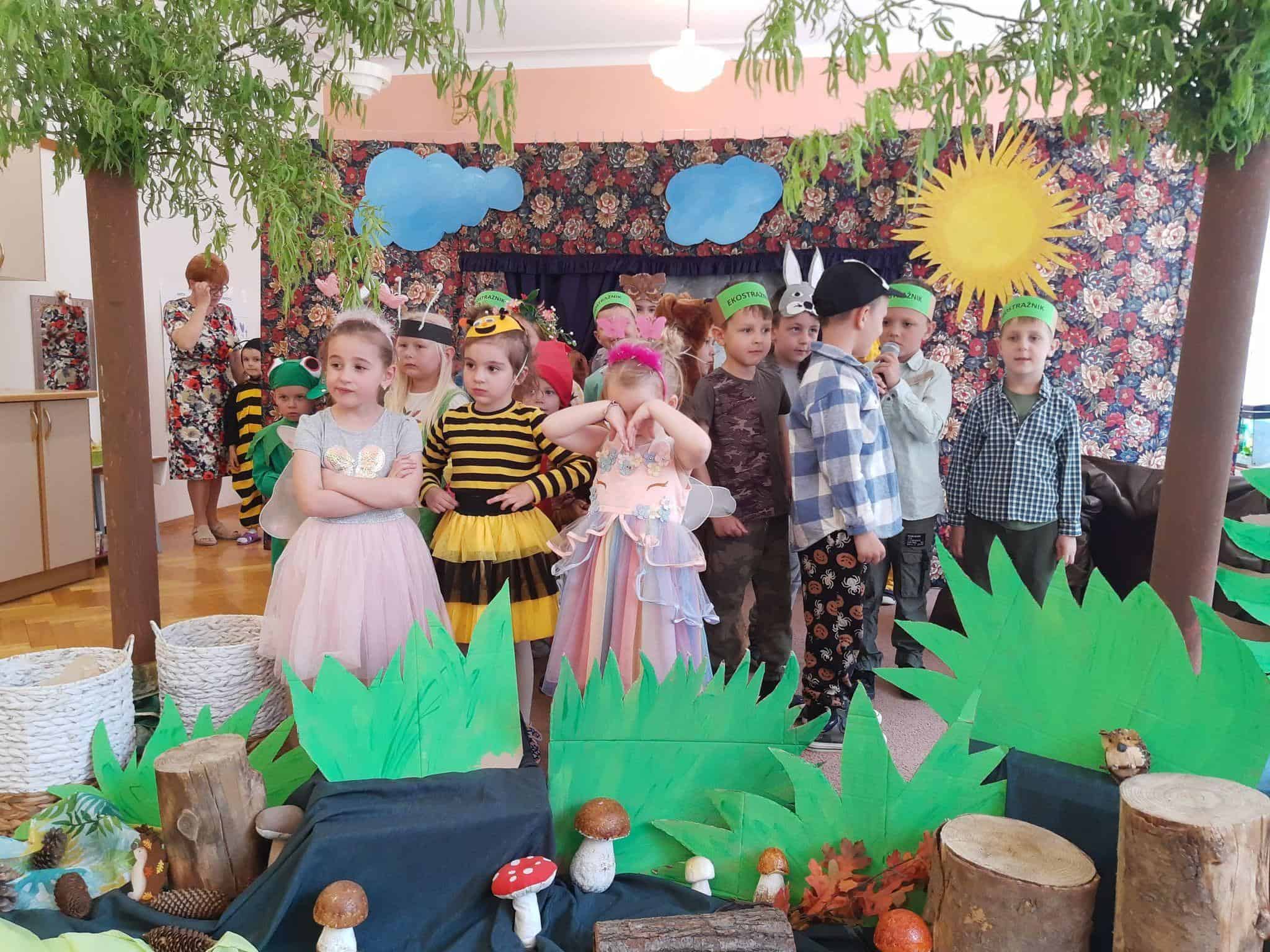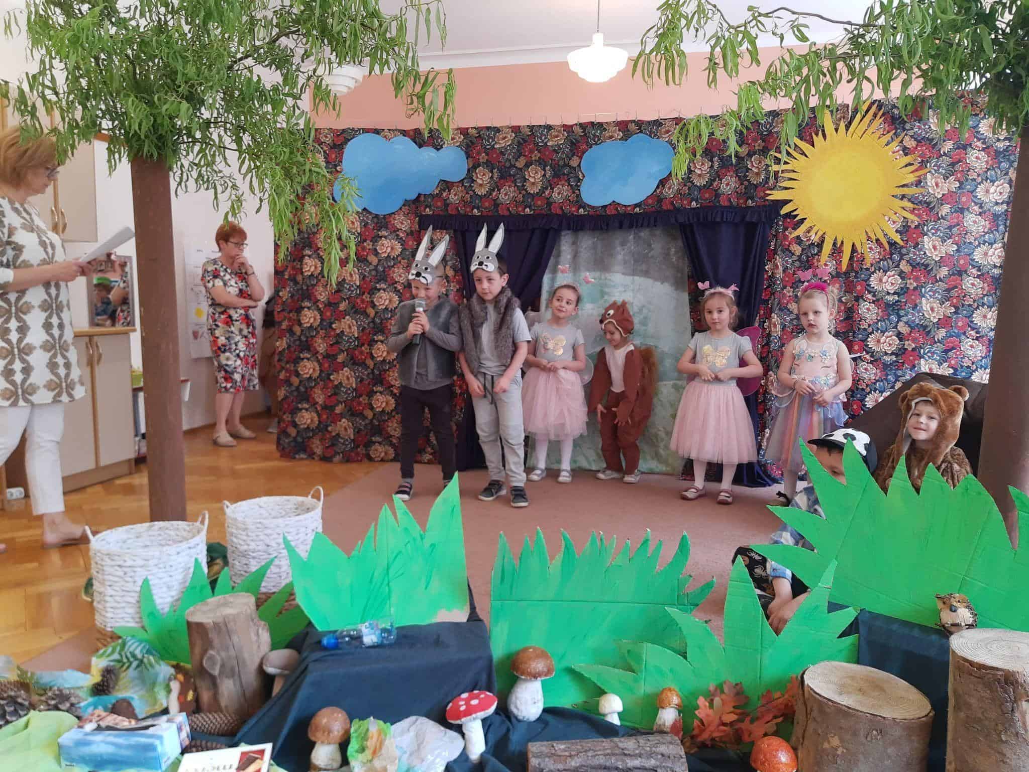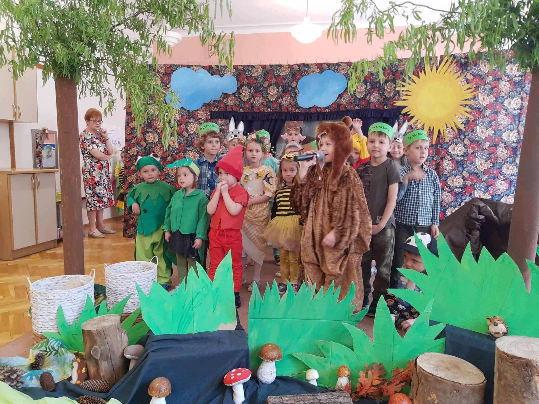W piątek 27 maja dzieci z grupy pomarańczowej zaprosiły swoich najbliższych na występ z okazji Święta Rodziny. Dzieci zaprezentowały program słowno – muzyczny dotyczącej tematyki ekologicznej. W lesie nie mogły żyć zwierzęta, bo wszędzie było dużo śmieci, a Pani Wiosna już zbliżała się do lasu wielkimi krokami. Z pomocą ekostrażników las został posprzątany, a zwierzęta mogły wrócić do pięknego, czystego domu jakim jest dla nich las. Dzieci bardzo wytrwale ćwiczyły swoje role przed przedstawieniem i w tym wielkim dniu, gdy ich rodziny zasiadły na widowni – mogły zaprezentować swoje umiejętności aktorskie poprzedzone ciężką pracą. Warto było, gdyż widownia doceniła wysiłki małych aktorów i na sali rozległy się gromkie brawa.