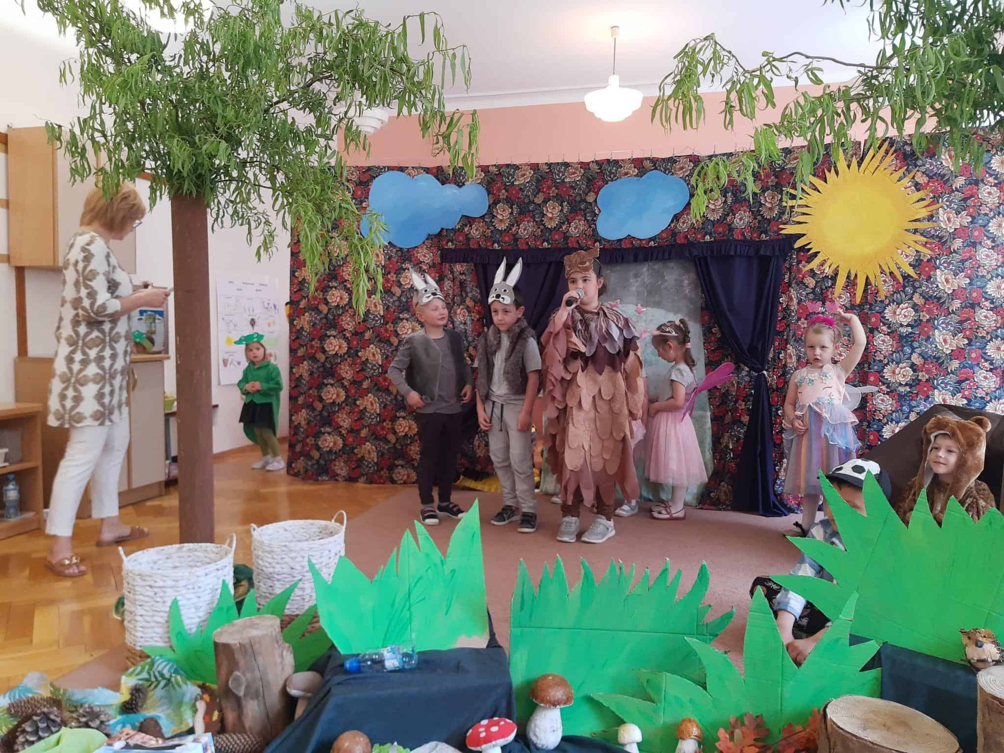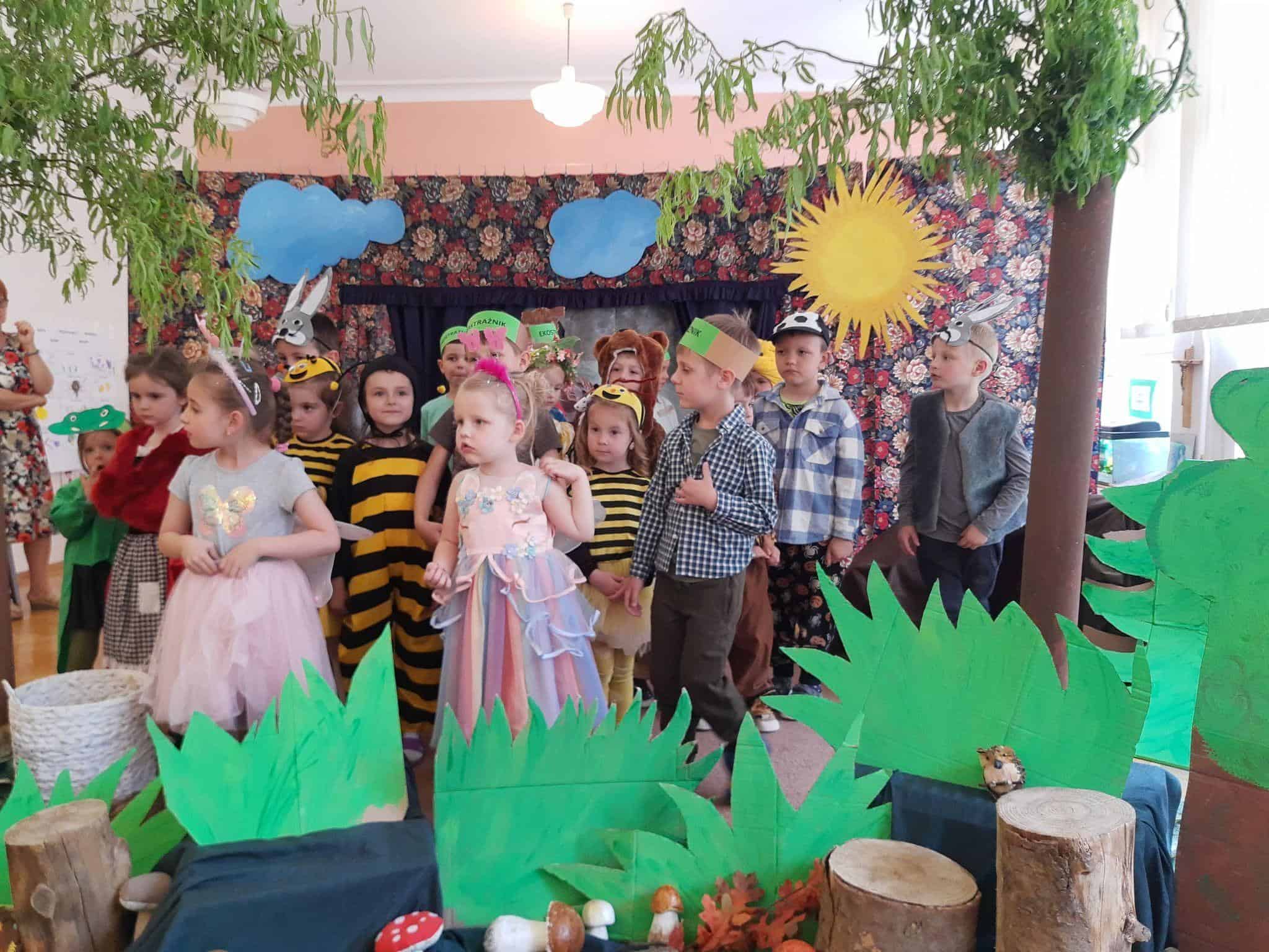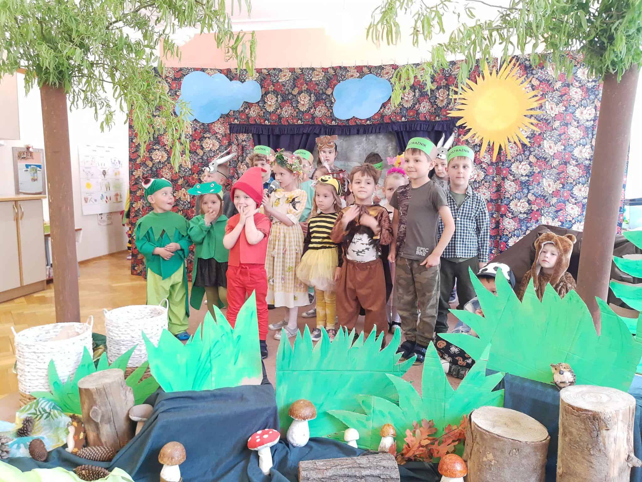 W piątek 27 maja dzieci z grupy pomarańczowej zaprosiły swoich najbliższych na występ z okazji Święta Rodziny. Dzieci zaprezentowały program słowno – muzyczny dotyczącej tematyki ekologicznej. W lesie nie mogły żyć zwierzęta, bo wszędzie było dużo śmieci, a Pani Wiosna już zbliżała się do lasu wielkimi krokami. Z pomocą ekostrażników las został posprzątany, a zwierzęta mogły wrócić do pięknego, czystego domu jakim jest dla nich las. Dzieci bardzo wytrwale ćwiczyły swoje role przed przedstawieniem i w tym wielkim dniu, gdy ich rodziny zasiadły na widowni – mogły zaprezentować swoje umiejętności aktorskie poprzedzone ciężką pracą. Warto było, gdyż widownia doceniła wysiłki małych aktorów i na sali rozległy się gromkie brawa.