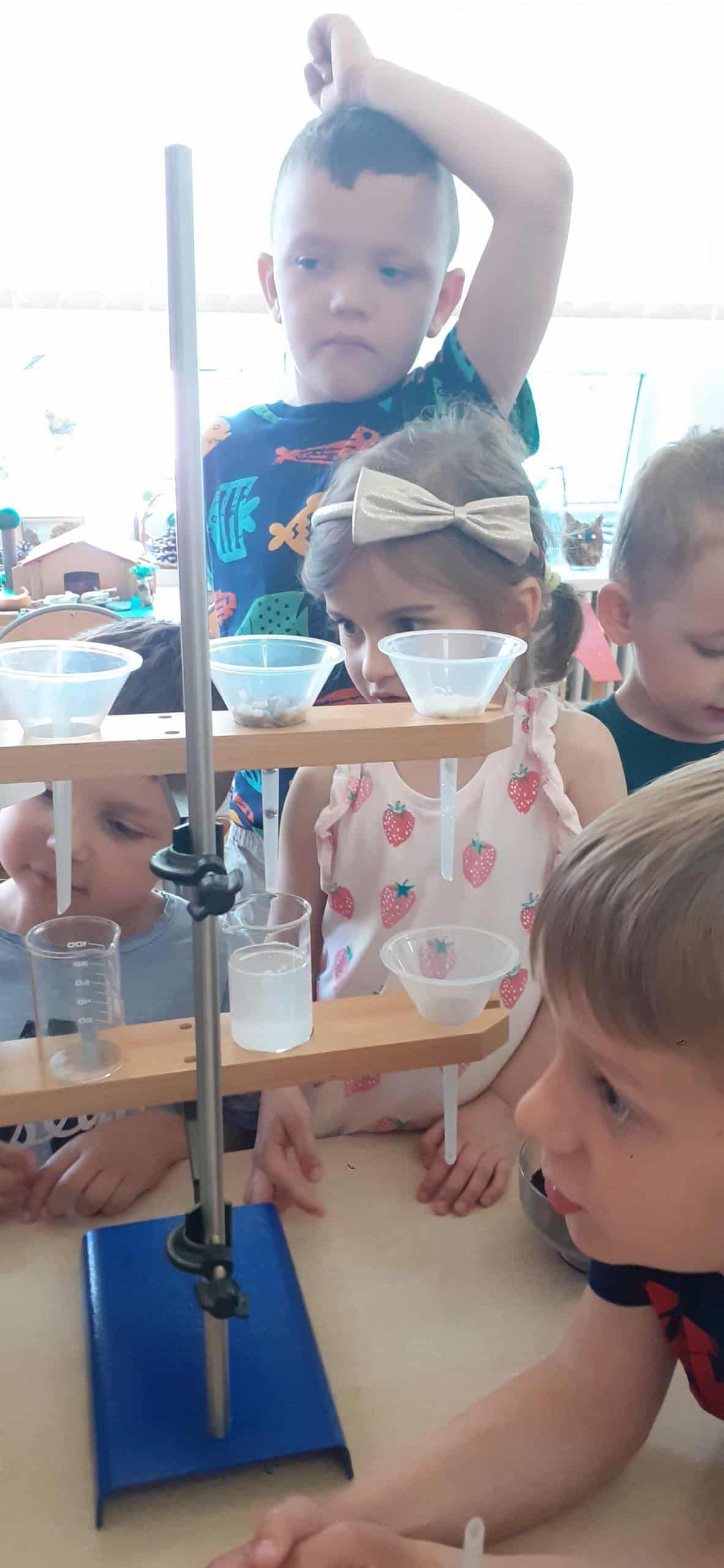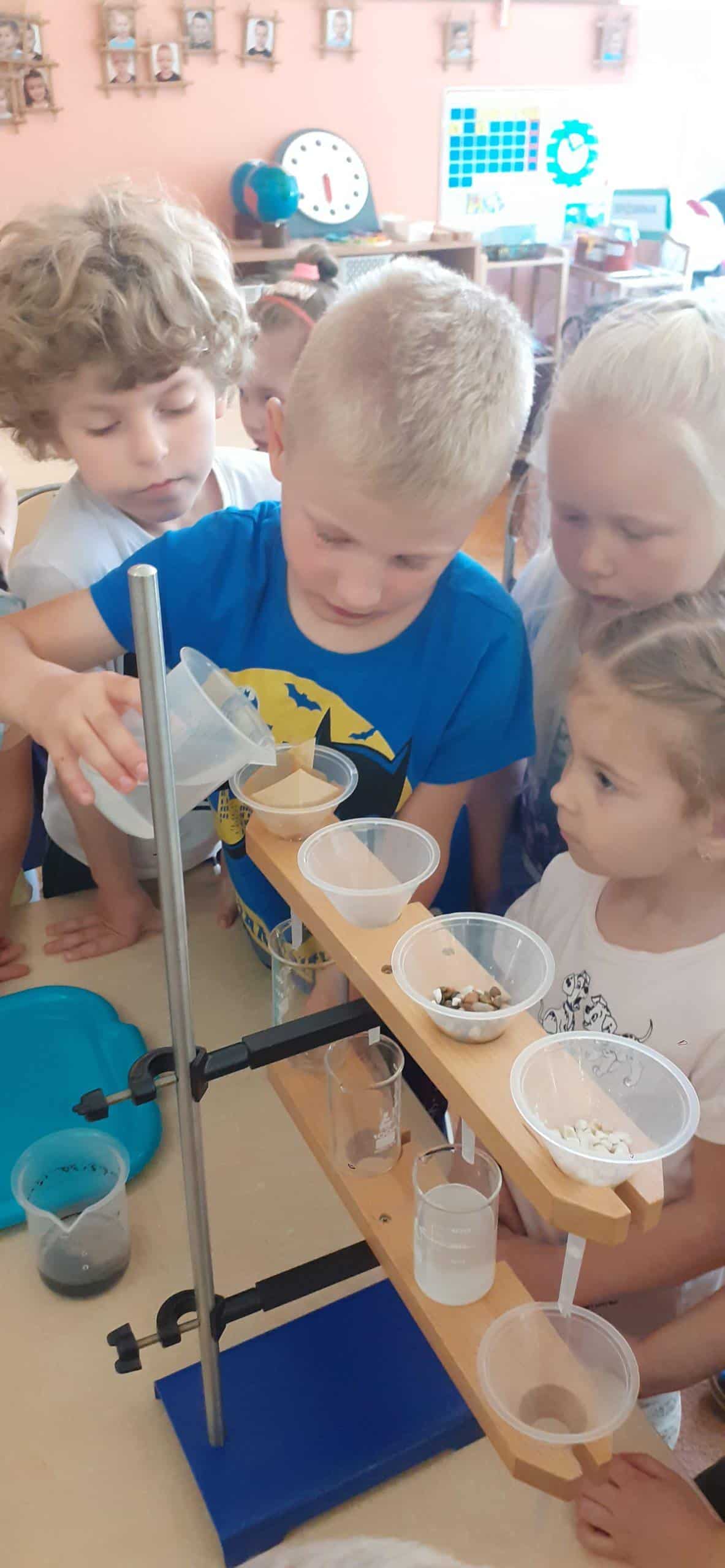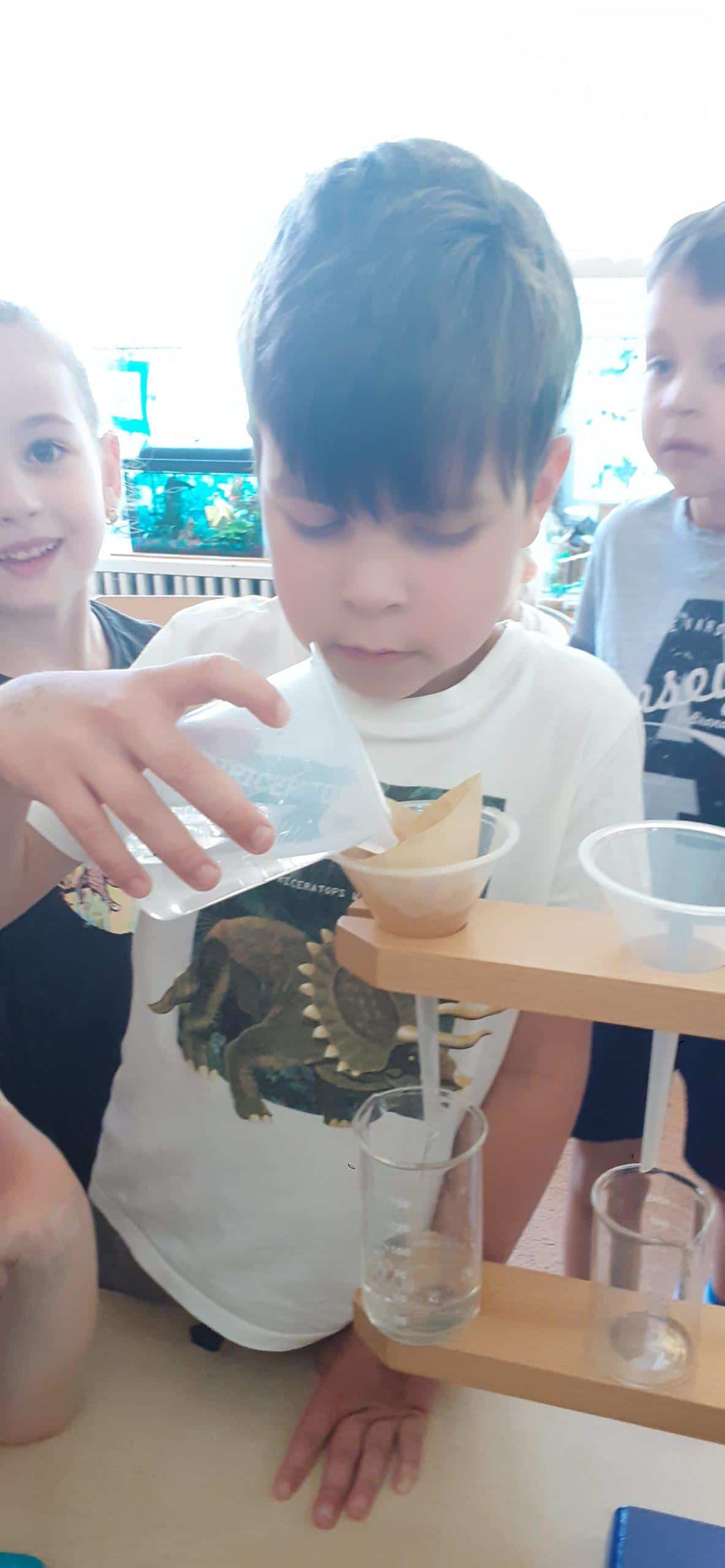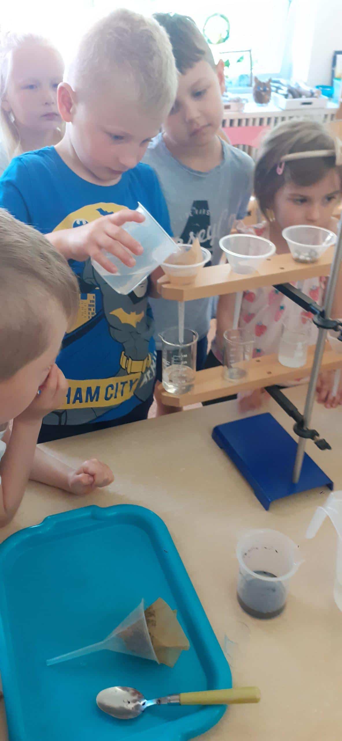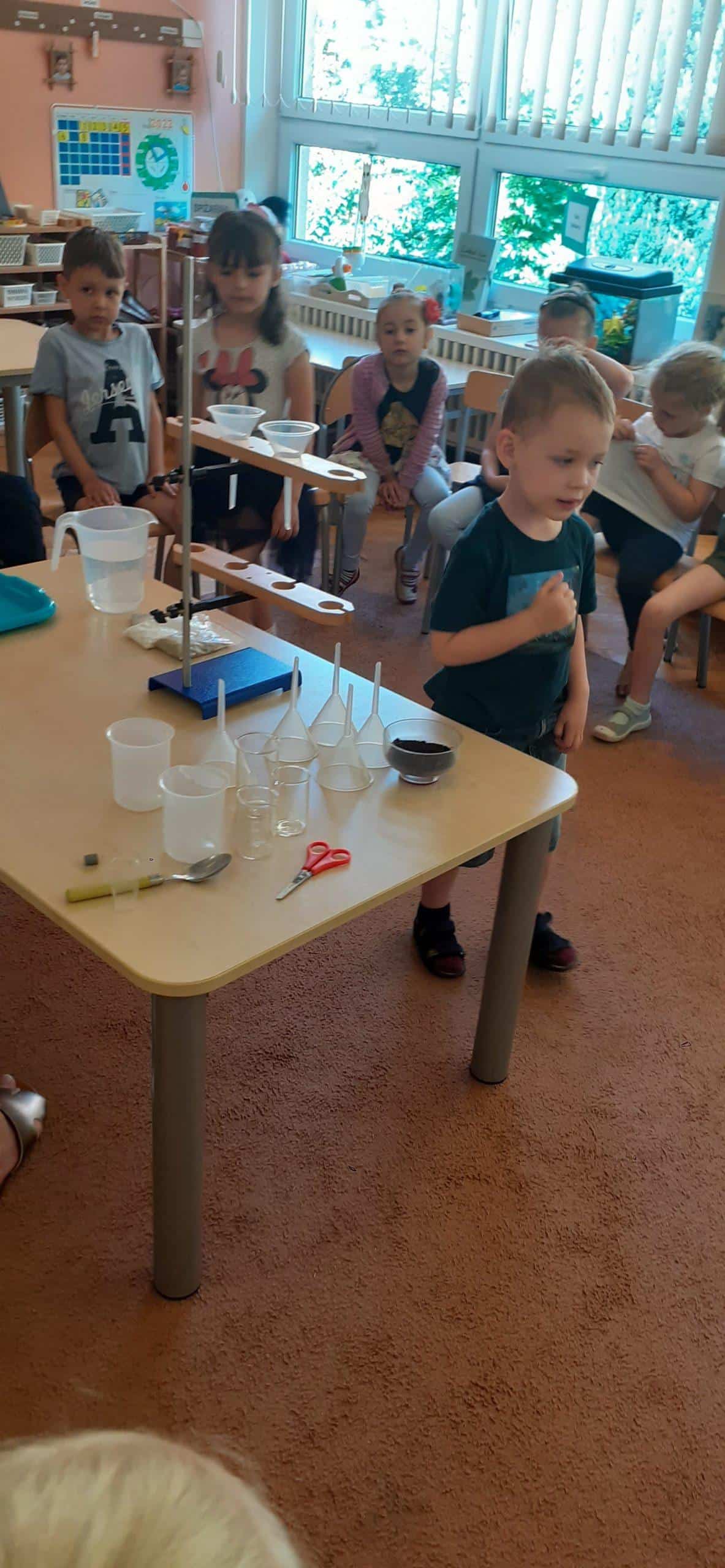 Debata ekologiczna przedszkolaka o zasobach leśnych i ich ochronie zainspirowała nas do zastanowienia się tym razem nad ochroną zasobów wodnych. Odbyła się lekcja dotycząca właściwości wody, wykorzystanie jej w życiu codziennym. W oparciu o serię obrazków omawialiśmy sytuacje pozytywne i negatywne w odniesieniu do ochrony czystości wód na kuli ziemskiej. Na zakończenie wykonaliśmy eksperyment, który przybliżył dzieciom kolejne właściwości wody. Najpierw z kilku elementów skręciliśmy specjalny statyw, na którym zawiesiliśmy lejki , które wypełniliśmy piaskiem , żwirkiem i większymi kamyczkami. W ten sposób badaliśmy , czy te surowce są przepuszczalne dla wody. Kolejny eksperyment dotyczył filtrowania wody. Czystą wodę zmieszaliśmy z ziemią, uzyskując w ten sposób wodę zanieczyszczoną, po czym zastosowaliśmy filtr papierowy do jej oczyszczenia. Dzieci szybko spostrzegły, że im więcej razy przepuścimy wodę przez filtr, tym woda będzie bardziej czysta.