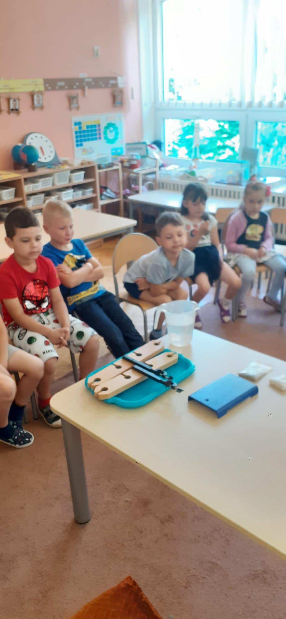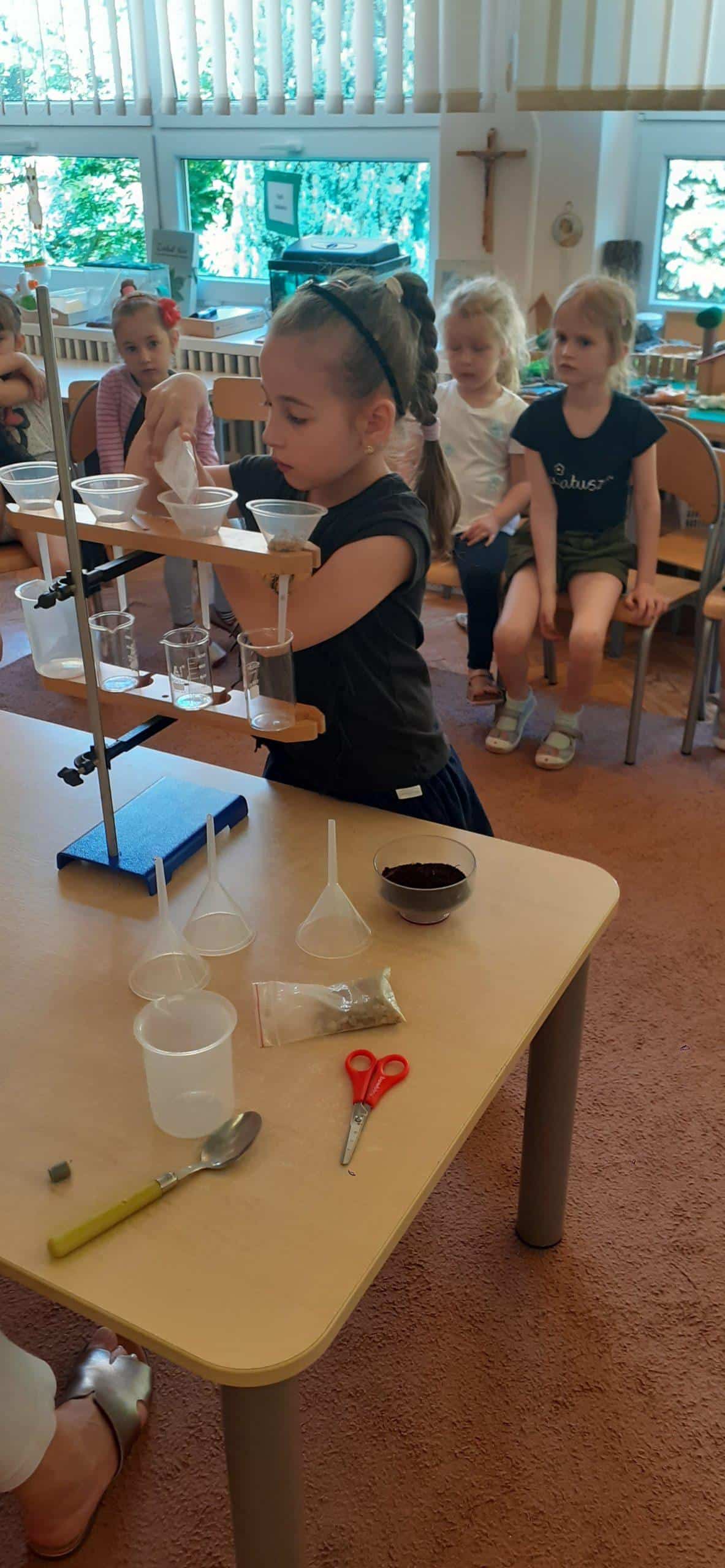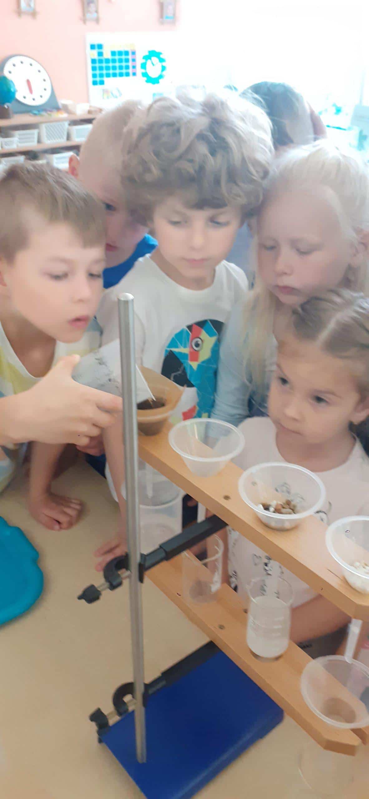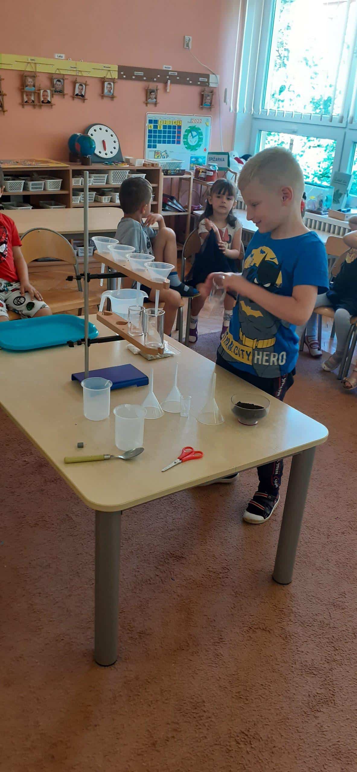 Debata ekologiczna przedszkolaka o zasobach leśnych i ich ochronie zainspirowała nas do zastanowienia się tym razem nad ochroną zasobów wodnych. Odbyła się lekcja dotycząca właściwości wody, wykorzystanie jej w życiu codziennym. W oparciu o serię obrazków omawialiśmy sytuacje pozytywne i negatywne w odniesieniu do ochrony czystości wód na kuli ziemskiej. Na zakończenie wykonaliśmy eksperyment, który przybliżył dzieciom kolejne właściwości wody. Najpierw z kilku elementów skręciliśmy specjalny statyw, na którym zawiesiliśmy lejki , które wypełniliśmy piaskiem , żwirkiem i większymi kamyczkami. W ten sposób badaliśmy , czy te surowce są przepuszczalne dla wody. Kolejny eksperyment dotyczył filtrowania wody. Czystą wodę zmieszaliśmy z ziemią, uzyskując w ten sposób wodę zanieczyszczoną, po czym zastosowaliśmy filtr papierowy do jej oczyszczenia. Dzieci szybko spostrzegły, że im więcej razy przepuścimy wodę przez filtr, tym woda będzie bardziej czysta.