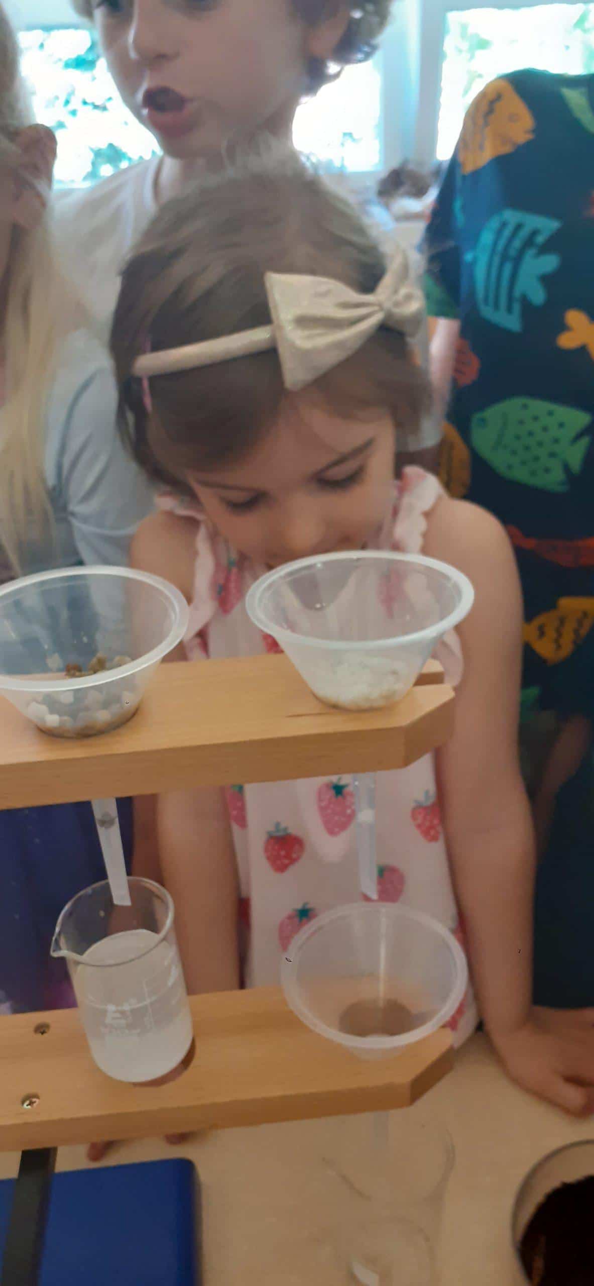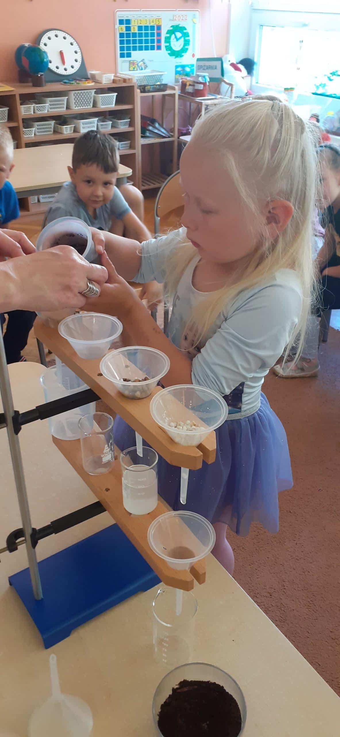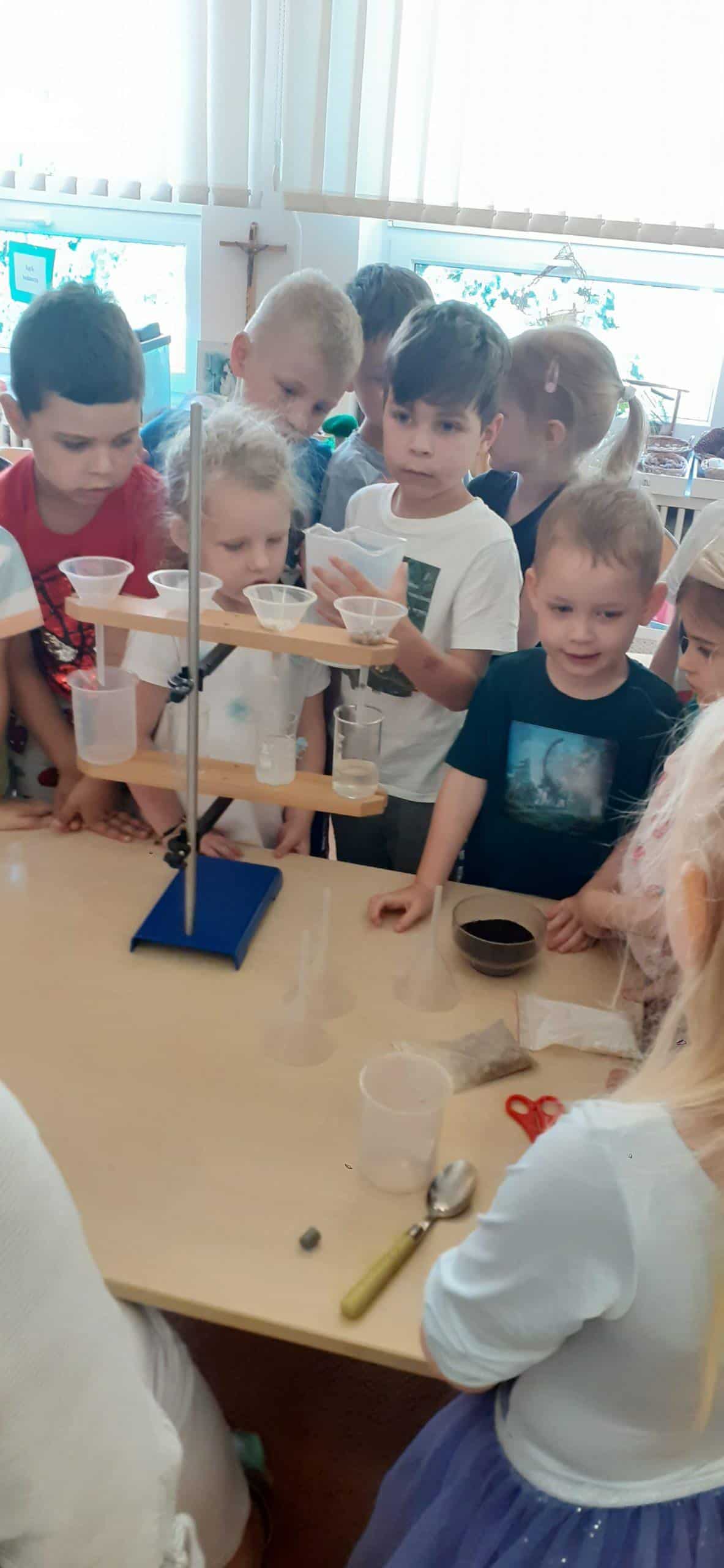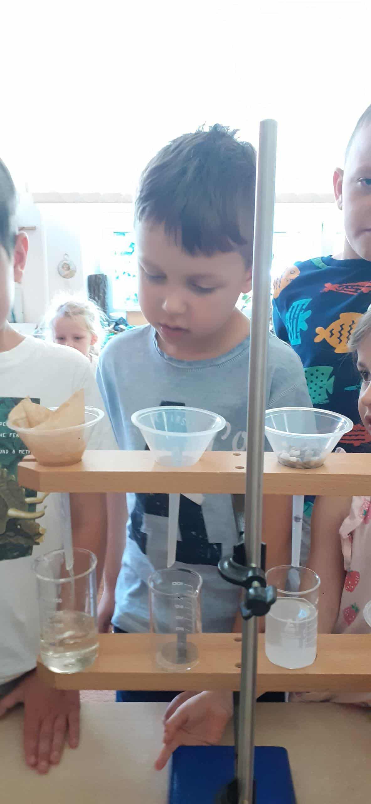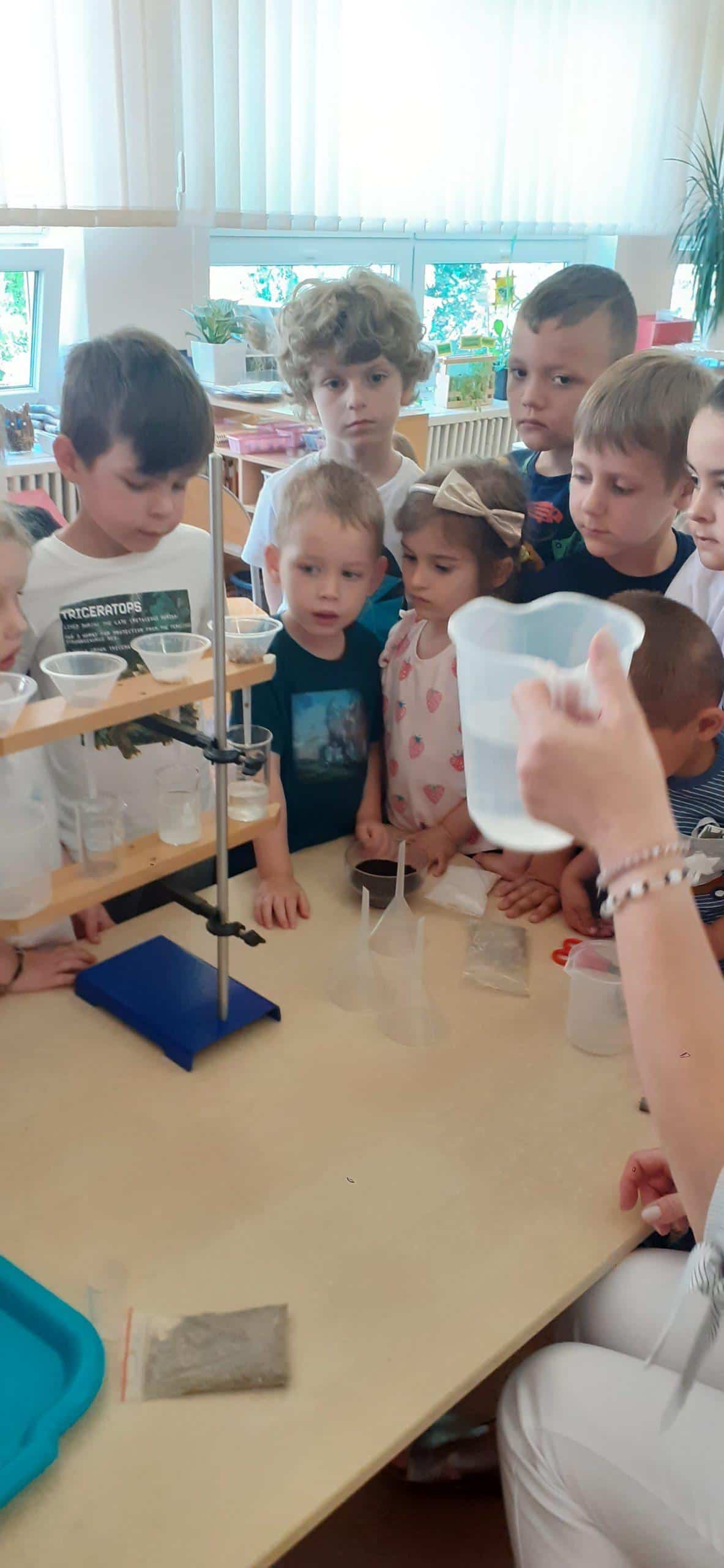 Debata ekologiczna przedszkolaka o zasobach leśnych i ich ochronie zainspirowała nas do zastanowienia się tym razem nad ochroną zasobów wodnych. Odbyła się lekcja dotycząca właściwości wody, wykorzystanie jej w życiu codziennym. W oparciu o serię obrazków omawialiśmy sytuacje pozytywne i negatywne w odniesieniu do ochrony czystości wód na kuli ziemskiej. Na zakończenie wykonaliśmy eksperyment, który przybliżył dzieciom kolejne właściwości wody. Najpierw z kilku elementów skręciliśmy specjalny statyw, na którym zawiesiliśmy lejki , które wypełniliśmy piaskiem , żwirkiem i większymi kamyczkami. W ten sposób badaliśmy , czy te surowce są przepuszczalne dla wody. Kolejny eksperyment dotyczył filtrowania wody. Czystą wodę zmieszaliśmy z ziemią, uzyskując w ten sposób wodę zanieczyszczoną, po czym zastosowaliśmy filtr papierowy do jej oczyszczenia. Dzieci szybko spostrzegły, że im więcej razy przepuścimy wodę przez filtr, tym woda będzie bardziej czysta.