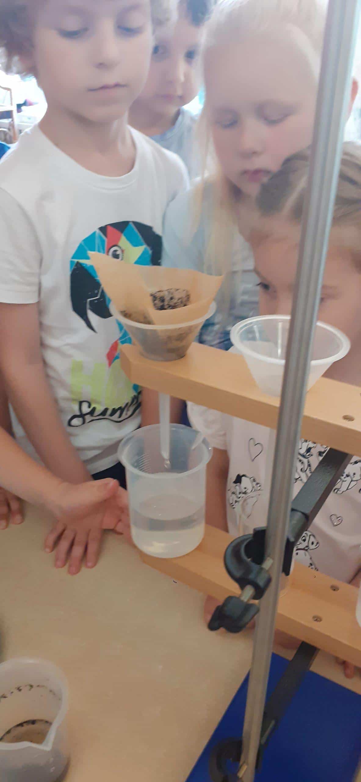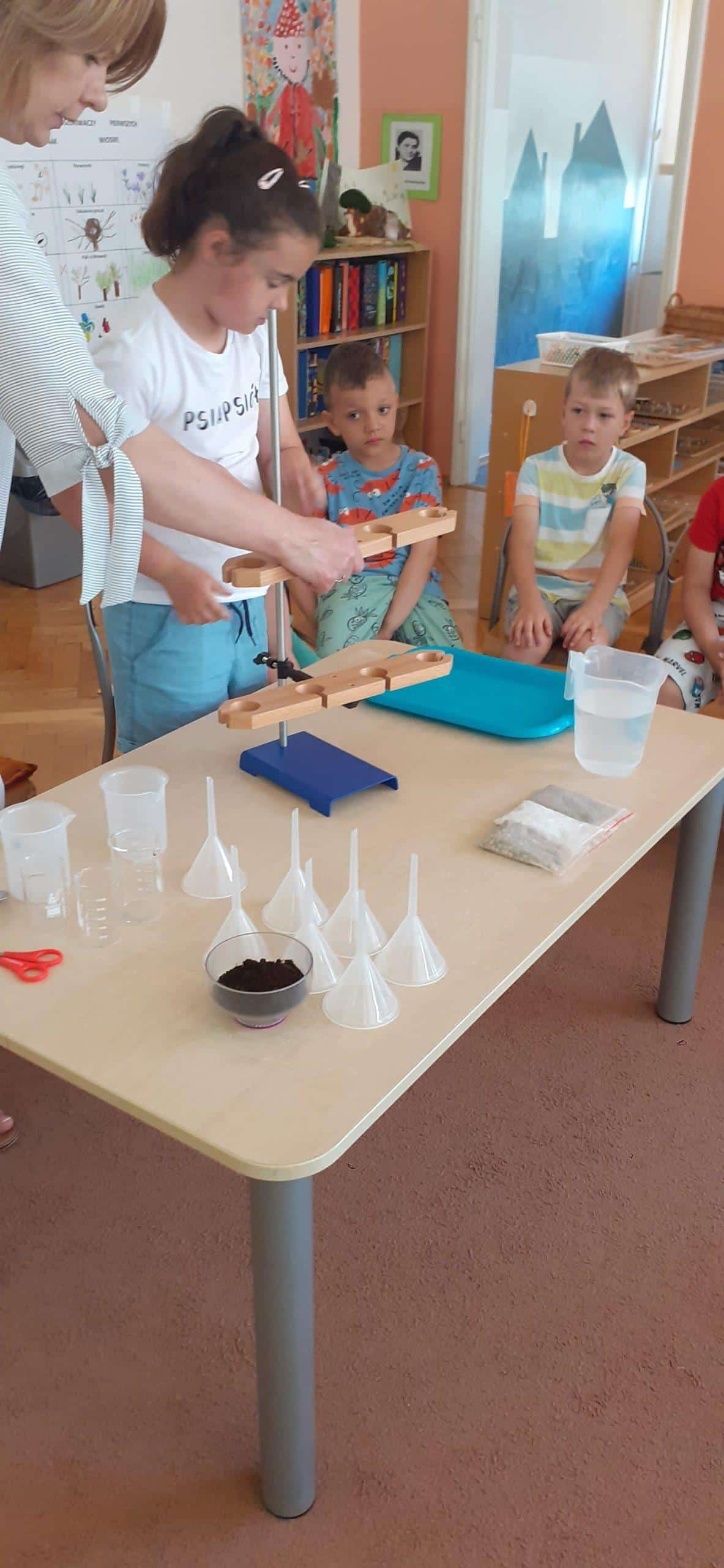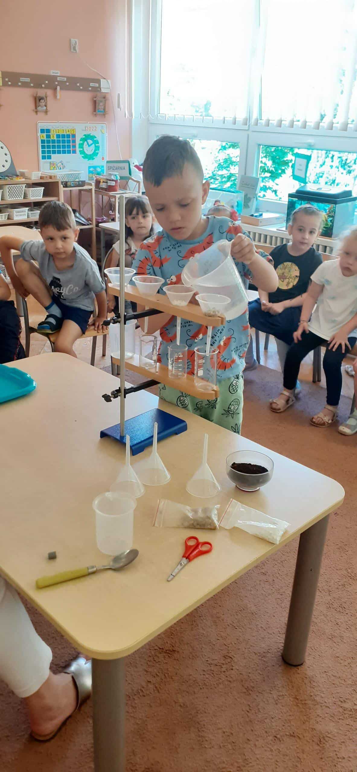 Debata ekologiczna przedszkolaka o zasobach leśnych i ich ochronie zainspirowała nas do zastanowienia się tym razem nad ochroną zasobów wodnych. Odbyła się lekcja dotycząca właściwości wody, wykorzystanie jej w życiu codziennym. W oparciu o serię obrazków omawialiśmy sytuacje pozytywne i negatywne w odniesieniu do ochrony czystości wód na kuli ziemskiej. Na zakończenie wykonaliśmy eksperyment, który przybliżył dzieciom kolejne właściwości wody. Najpierw z kilku elementów skręciliśmy specjalny statyw, na którym zawiesiliśmy lejki , które wypełniliśmy piaskiem , żwirkiem i większymi kamyczkami. W ten sposób badaliśmy , czy te surowce są przepuszczalne dla wody. Kolejny eksperyment dotyczył filtrowania wody. Czystą wodę zmieszaliśmy z ziemią, uzyskując w ten sposób wodę zanieczyszczoną, po czym zastosowaliśmy filtr papierowy do jej oczyszczenia. Dzieci szybko spostrzegły, że im więcej razy przepuścimy wodę przez filtr, tym woda będzie bardziej czysta.