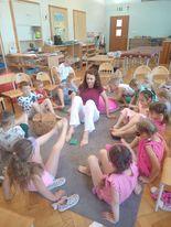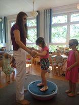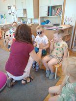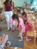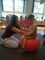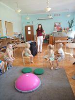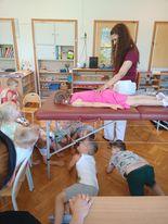 20 czerwca w naszej grupie gościliśmy mamę Mikołaja, która jest fizjoterapeutką. Na początku Pani Edyta Dobrzańska wyjaśniła czym zajmuje się rehabilitant. Wytłumaczyła, że do jej zadań należy: poprawienie sprawności ruchowej, zatrzymanie postępującej choroby poprzez stosowanie odpowiednich zabiegów, masaży i ćwiczeń. Następnie Pani fizjoterapeutka zaprezentowała swoje sprzęty niezbędne do jej pracy, a także wraz z dziećmi wykonała kilka ćwiczeń, które są bardzo ważne aby utrzymać zdrowy kręgosłup i stopy. Dużym powodzeniem cieszył się „stół ” do masażu i dyski sensoryczne. Zajęcia były bardzo ciekawe. Z niecierpliwością czekamy na następne zajęcia. Serdecznie dziękujemy mamie Mikołaja za poświęcony czas i wspaniałą atmosferę.