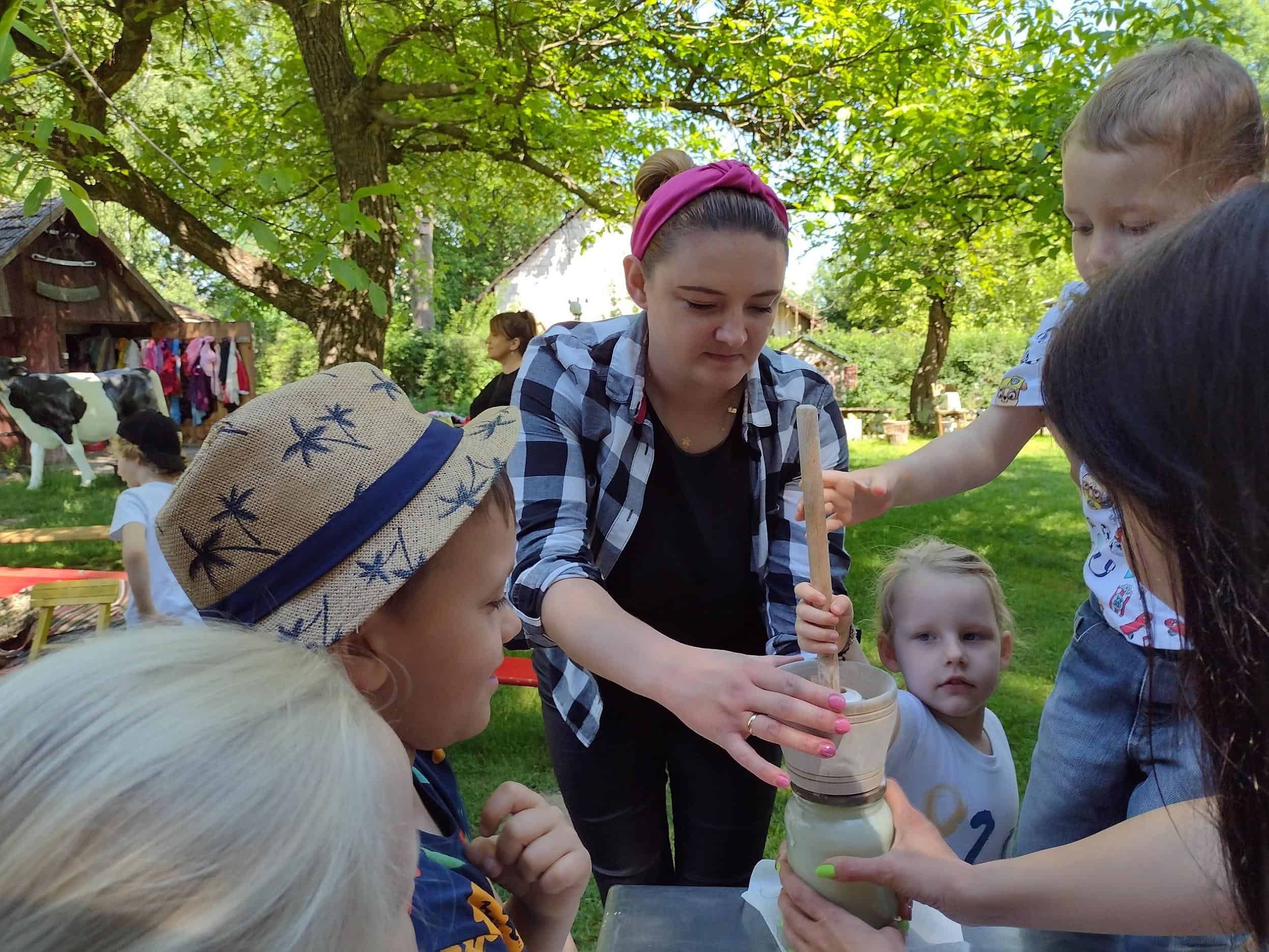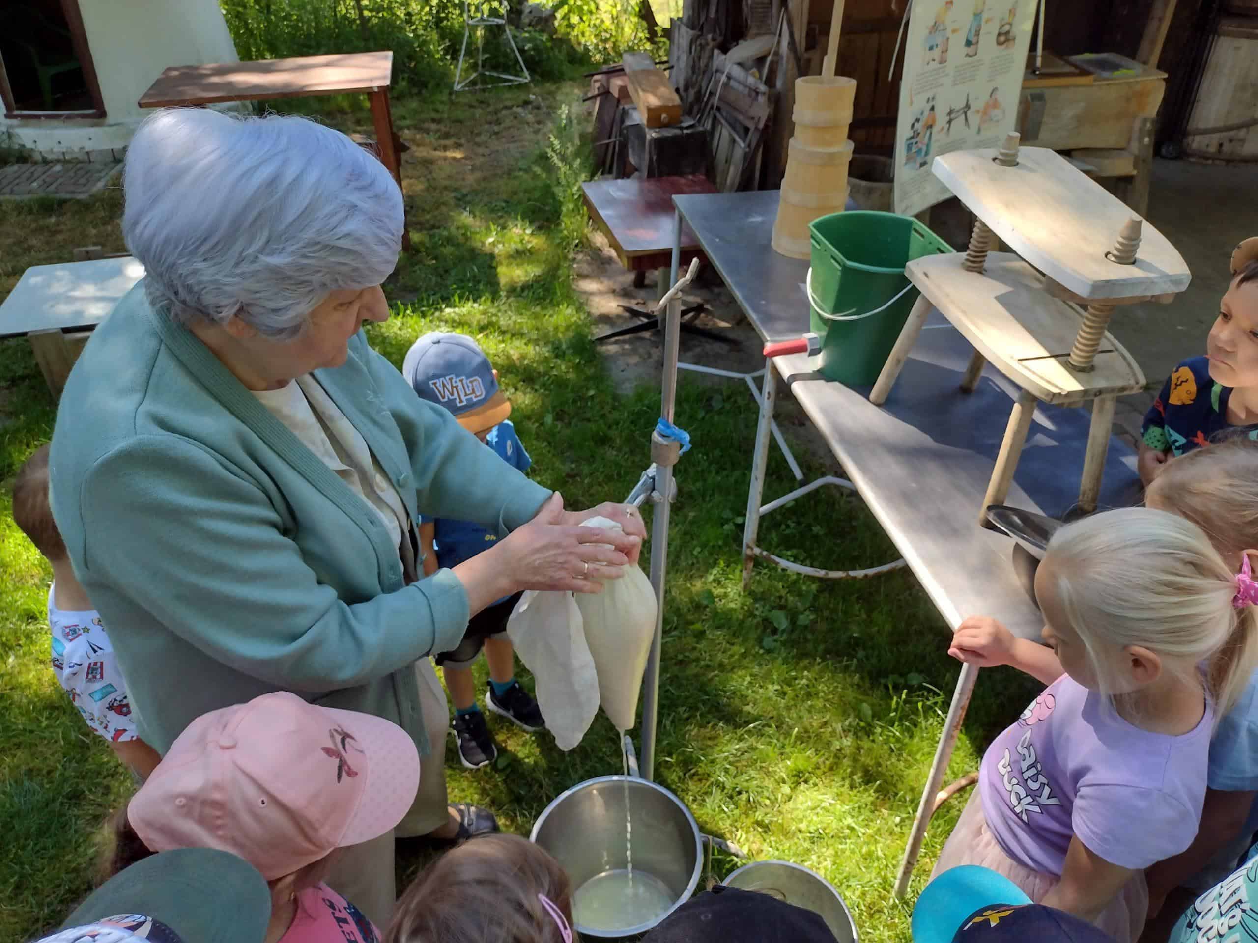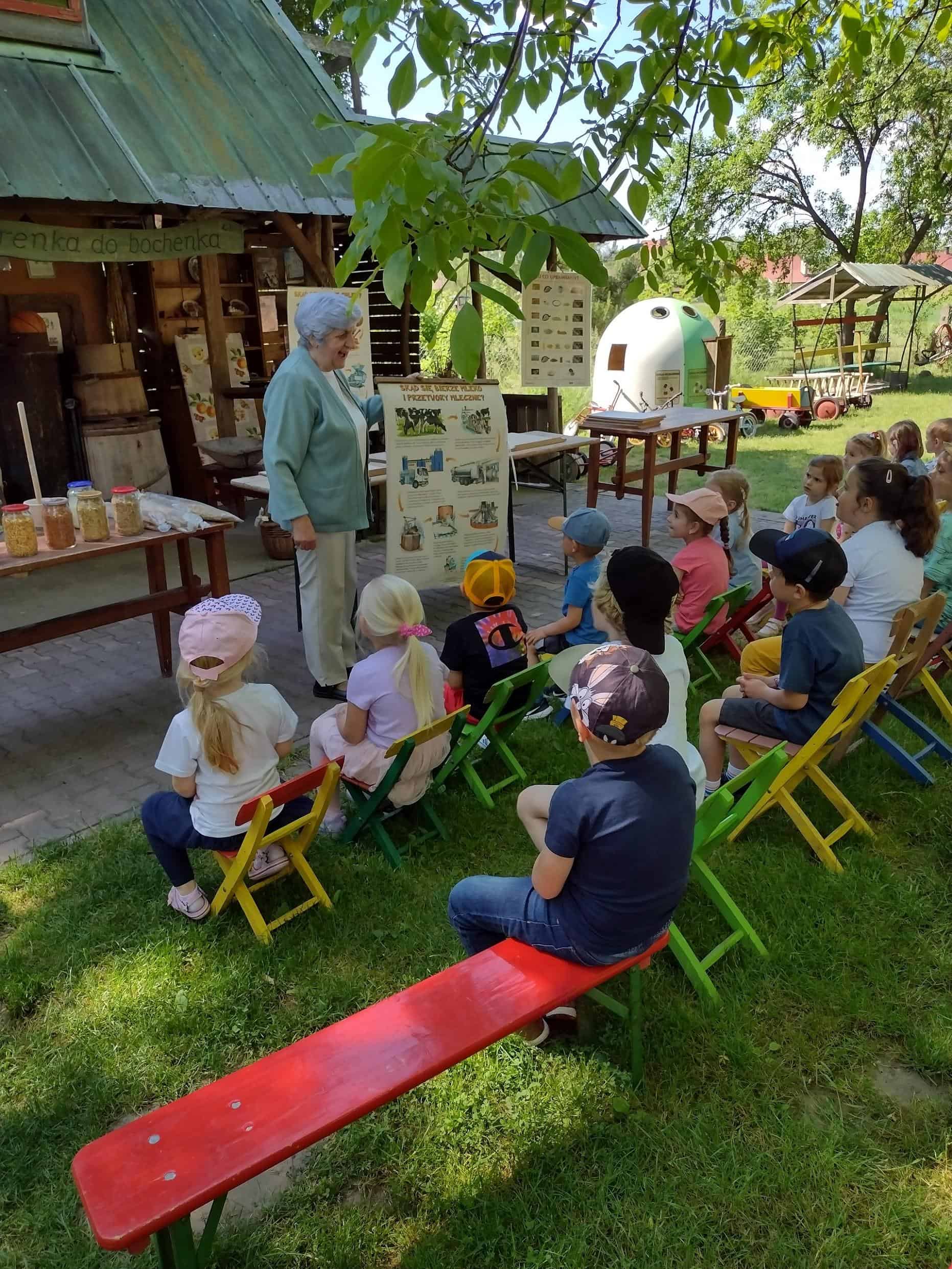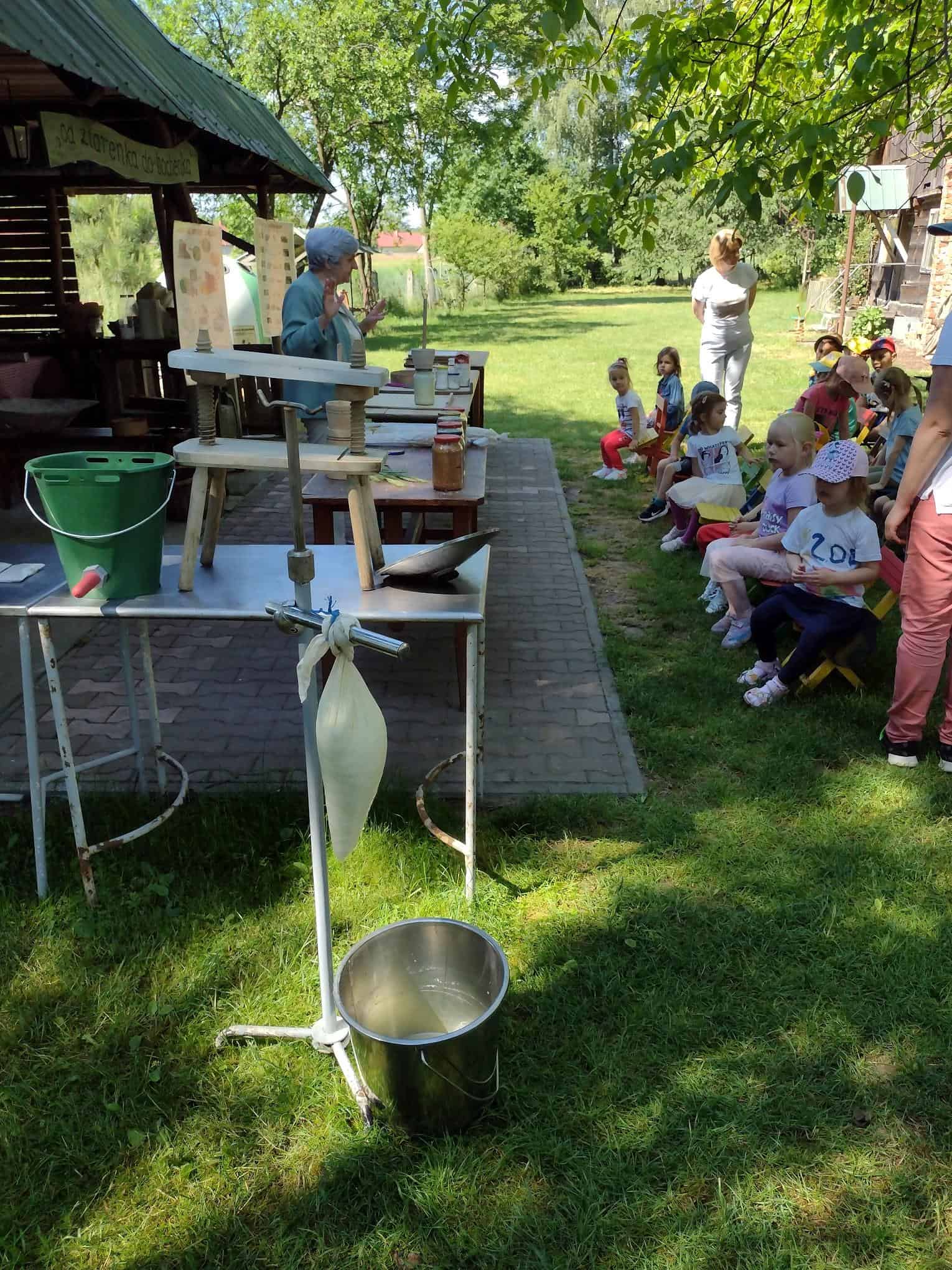 Dzieci coraz częściej rozmawiały na temat wycieczki, widać było że są przejęte i już nie mogą się doczekać wyjazdu. Dzień przed wycieczką, dzieci przypomniały sobie wszystkie zasady bezpieczeństwa, jakie obowiązują w czasie wycieczki. Wreszcie po śniadaniu wyruszyliśmy w podróż do gospodarstwa agroturystycznego „Pod Lipą” w Przychojcu koło Leżajska. Podróż zdawała się dłużyć bez końca, a gdy dotarliśmy na miejsce przywitała nas Gospodyni z Gospodarzem i ich pies. Na początku dzieci wzięły udział w zajęciach edukacyjnych „Mleczna droga” i „Od ziarenka do bochenka”, gdzie mogły wykazać się wiedzą na temat przetworów mlecznych i tego, jak powstaje pieczywo. Dzieci mogły samodzielnie wydoić krowę, z zebranej na powierzchni mleka śmietany ubić masło w maselniczce, ze zsiadłego mleka odcisnąć ser i włożyć go do prasy, zmielić ziarno przy pomocy żaren, przesiać mąkę, odważyć i zabrać do domu. Można było także zobaczyć kłosy i ziarna różnych rodzajów zbórz. Dzieci samodzielnie robiły proziaki, w których jednym ze składników była proza czyli soda. Mali kucharz ubrani w odpowiednie stroje starannie ugniatali ciasto i wycinali kształty. A wszystko to w cieniu sędziwego orzecha. Gdy proziaki znalazły się w piecu, był czas na dobrą zabawę: przebieranie się w kostiumy, jazdę na rowerkach biegowych czy też w wózkach – śmiechu było co nie miara 🙂 Później dzieci mogły zrobić degustację upieczonych smakołyków oraz samodzielnie zrobionego twarogu, które wszystkim bardzo smakowały. Zwiedzaliśmy także dawne chałupy, gdzie mogliśmy podejrzeć jak to się kiedyś mieszkało, poznać starodawne urządzenia i sprzęty oraz podziwiać mistrzostwo bibułkarstwa i rękodzieła ludowego. Na zakończenie nakarmiliśmy koziołka Bronka i pogłaskaliśmy króliki. Szkoda że miłe chwile tak szybko upływają… nadszedł czas wracać do naszego przedszkola.