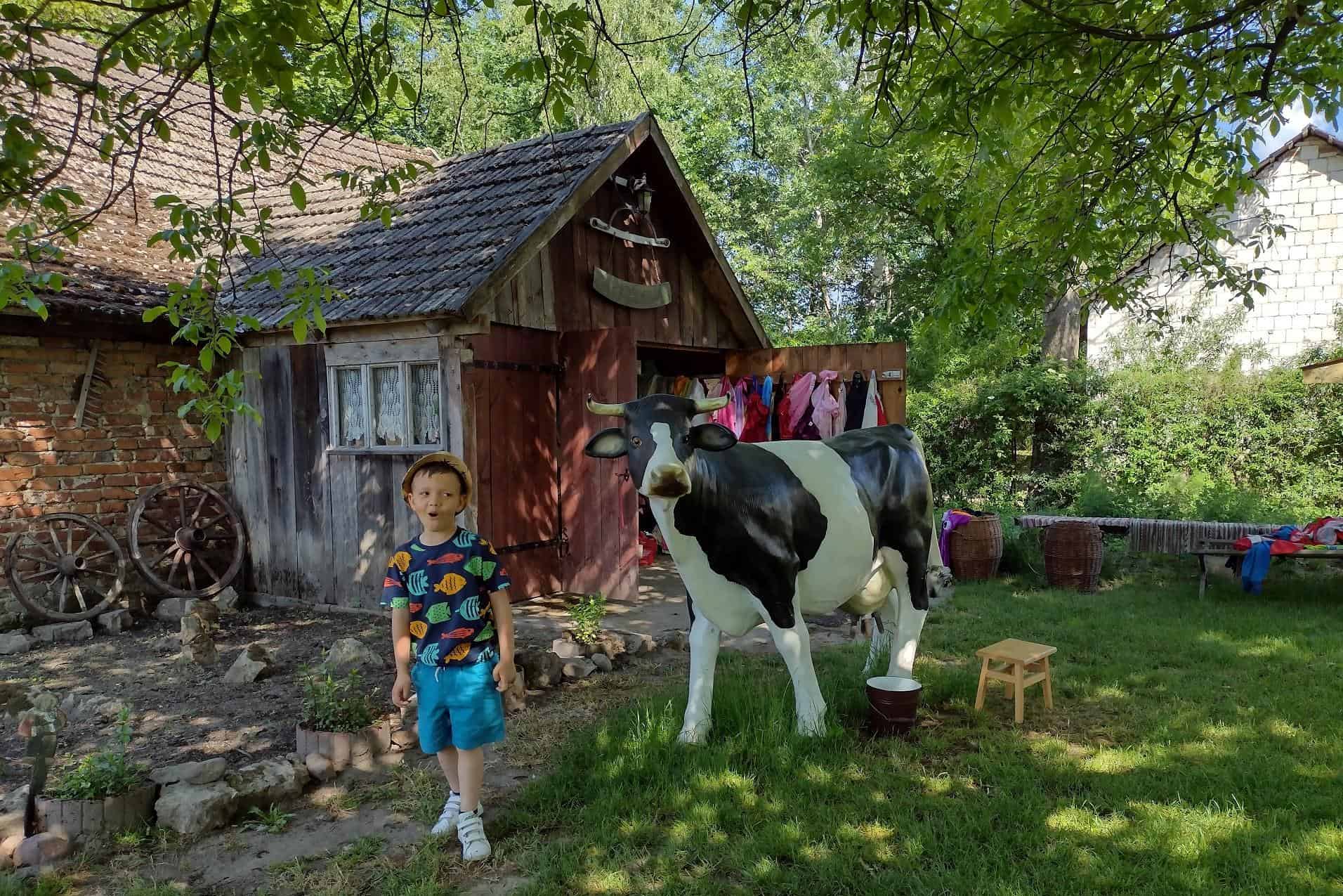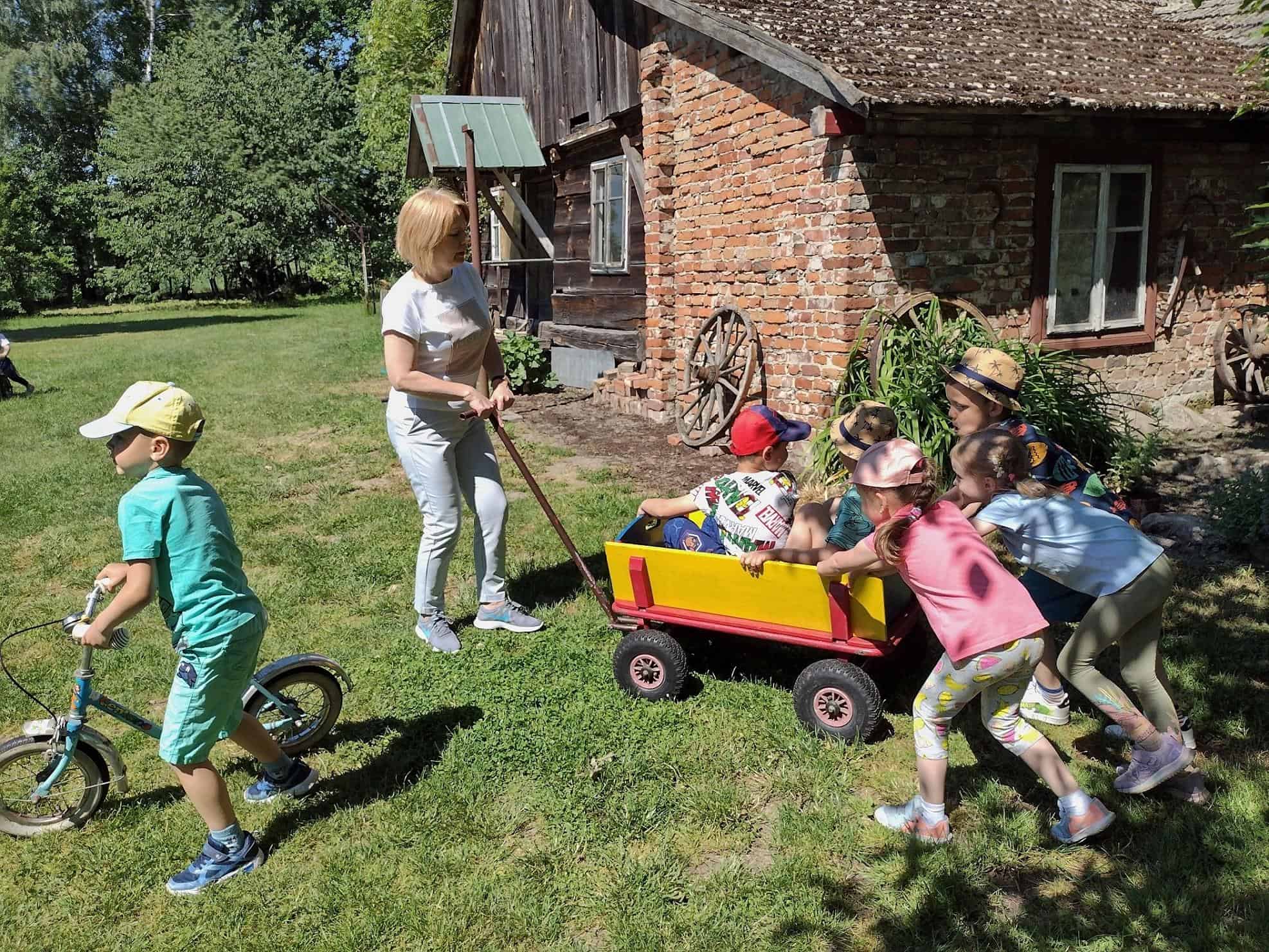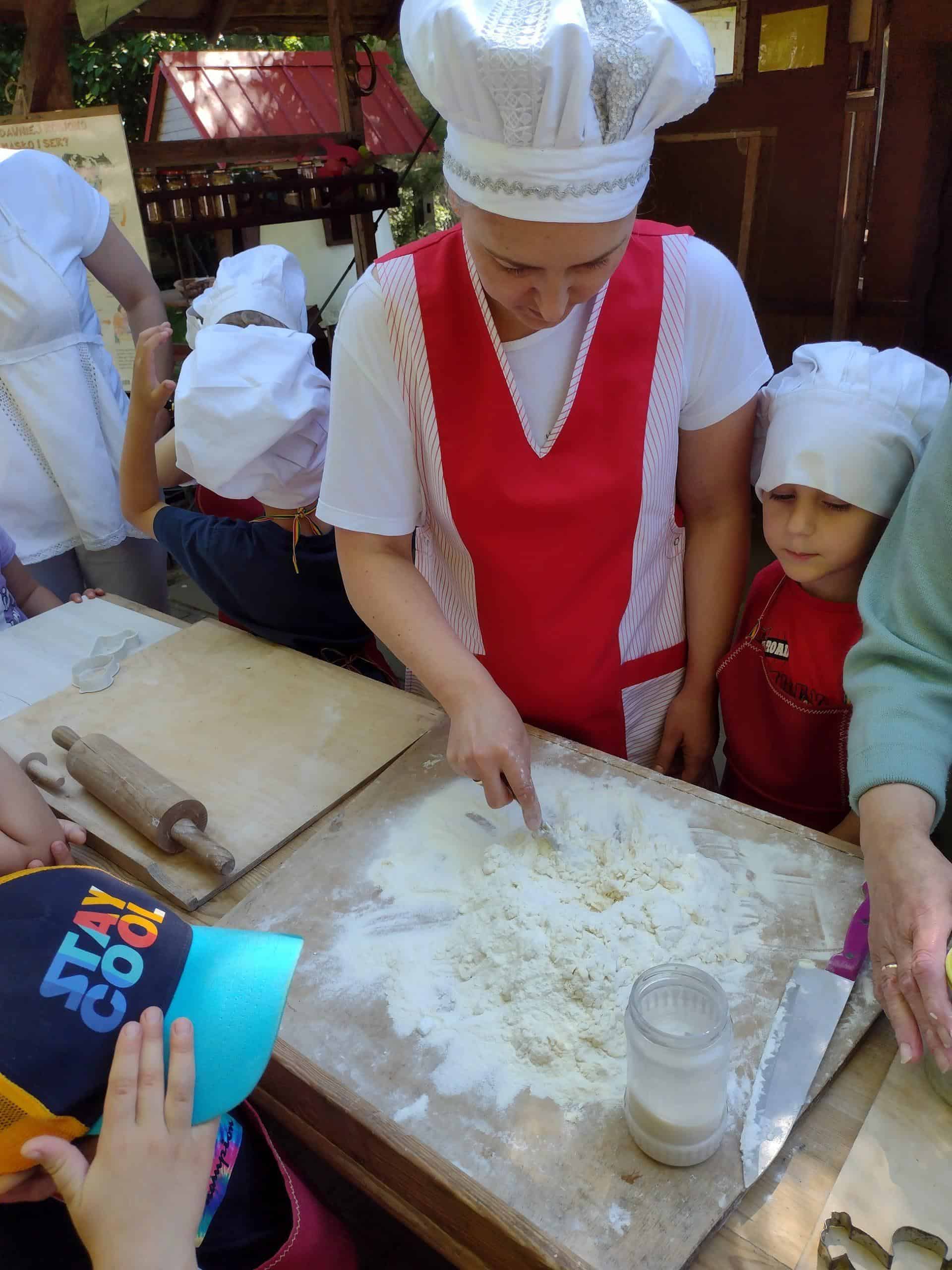Dzieci coraz częściej rozmawiały na temat wycieczki, widać było że są przejęte i już nie mogą się doczekać wyjazdu. Dzień przed wycieczką, dzieci przypomniały sobie wszystkie zasady bezpieczeństwa, jakie obowiązują w czasie wycieczki. Wreszcie po śniadaniu wyruszyliśmy w podróż do gospodarstwa agroturystycznego „Pod Lipą” w Przychojcu koło Leżajska. Podróż zdawała się dłużyć bez końca, a gdy dotarliśmy na miejsce przywitała nas Gospodyni z Gospodarzem i ich pies. Na początku dzieci wzięły udział w zajęciach edukacyjnych „Mleczna droga” i „Od ziarenka do bochenka”, gdzie mogły wykazać się wiedzą na temat przetworów mlecznych i tego, jak powstaje pieczywo. Dzieci mogły samodzielnie wydoić krowę, z zebranej na powierzchni mleka śmietany ubić masło w maselniczce, ze zsiadłego mleka odcisnąć ser i włożyć go do prasy, zmielić ziarno przy pomocy żaren, przesiać mąkę, odważyć i zabrać do domu. Można było także zobaczyć kłosy i ziarna różnych rodzajów zbórz. Dzieci samodzielnie robiły proziaki, w których jednym ze składników była proza czyli soda. Mali kucharz ubrani w odpowiednie stroje starannie ugniatali ciasto i wycinali kształty. A wszystko to w cieniu sędziwego orzecha. Gdy proziaki znalazły się w piecu, był czas na dobrą zabawę: przebieranie się w kostiumy, jazdę na rowerkach biegowych czy też w wózkach – śmiechu było co nie miara 🙂 Później dzieci mogły zrobić degustację upieczonych smakołyków oraz samodzielnie zrobionego twarogu, które wszystkim bardzo smakowały. Zwiedzaliśmy także dawne chałupy, gdzie mogliśmy podejrzeć jak to się kiedyś mieszkało, poznać starodawne urządzenia i sprzęty oraz podziwiać mistrzostwo bibułkarstwa i rękodzieła ludowego. Na zakończenie nakarmiliśmy koziołka Bronka i pogłaskaliśmy króliki. Szkoda że miłe chwile tak szybko upływają… nadszedł czas wracać do naszego przedszkola.