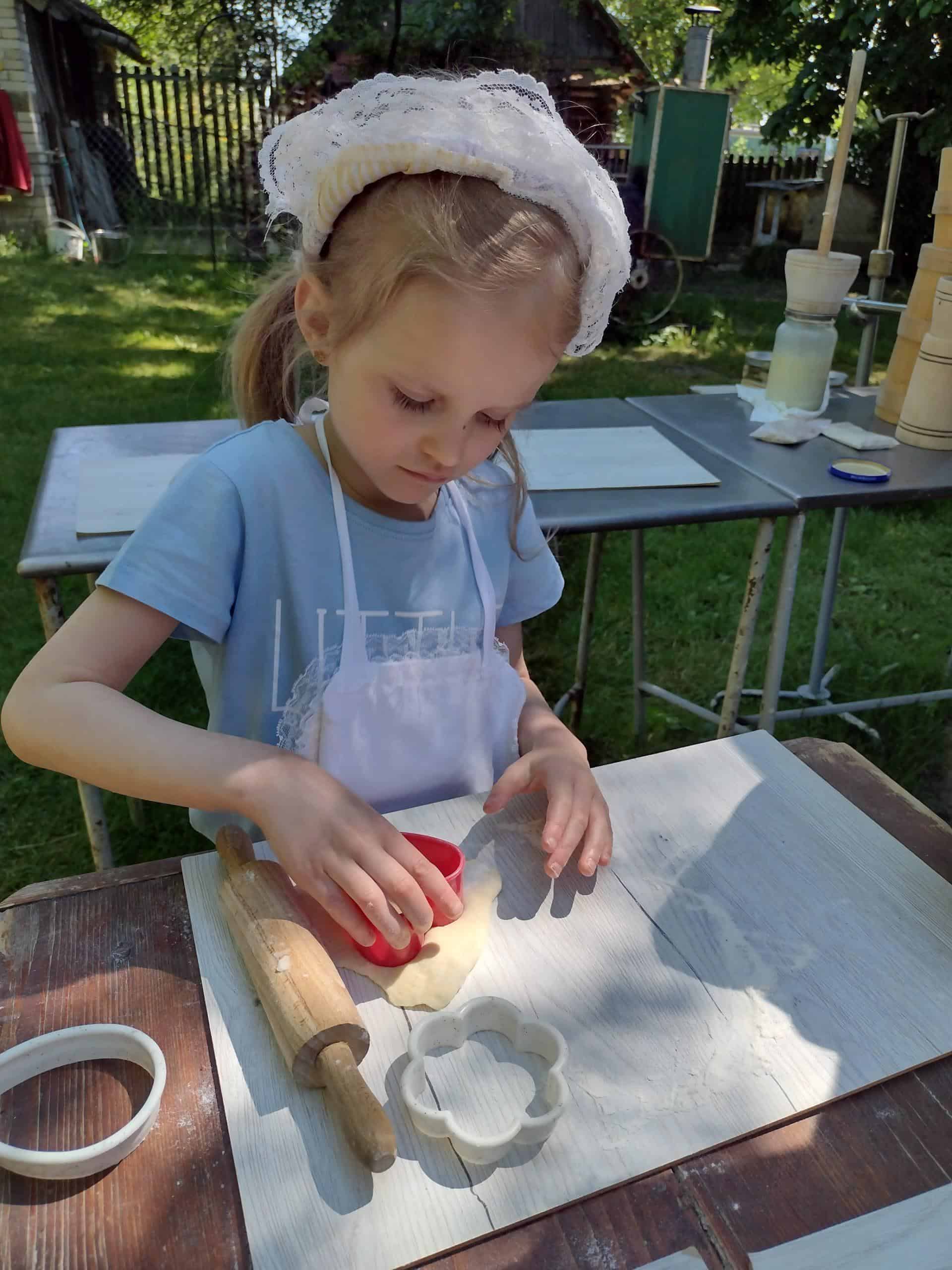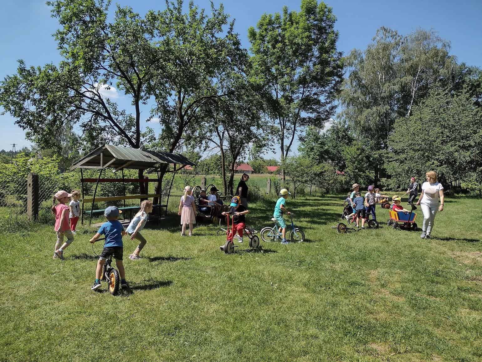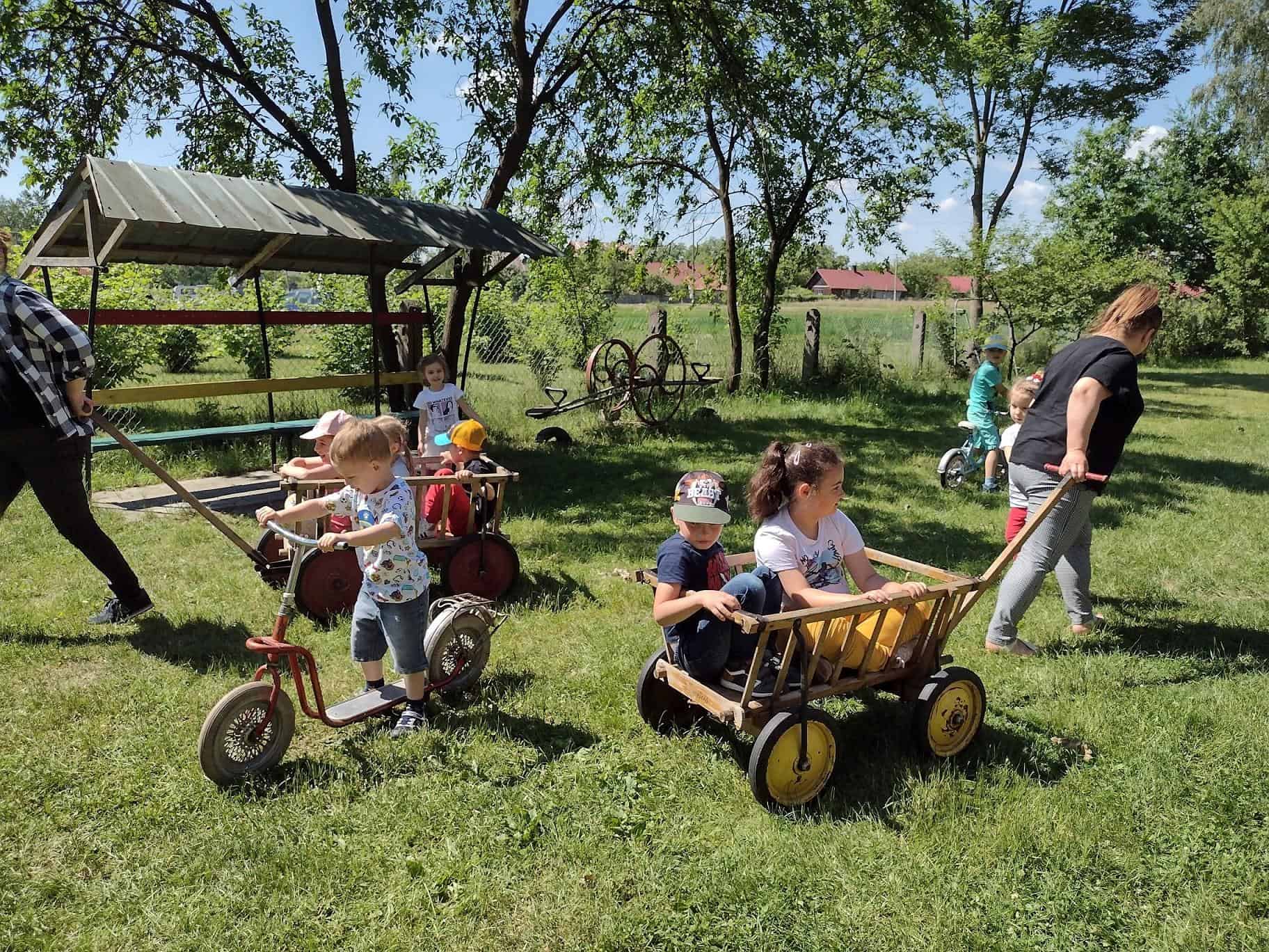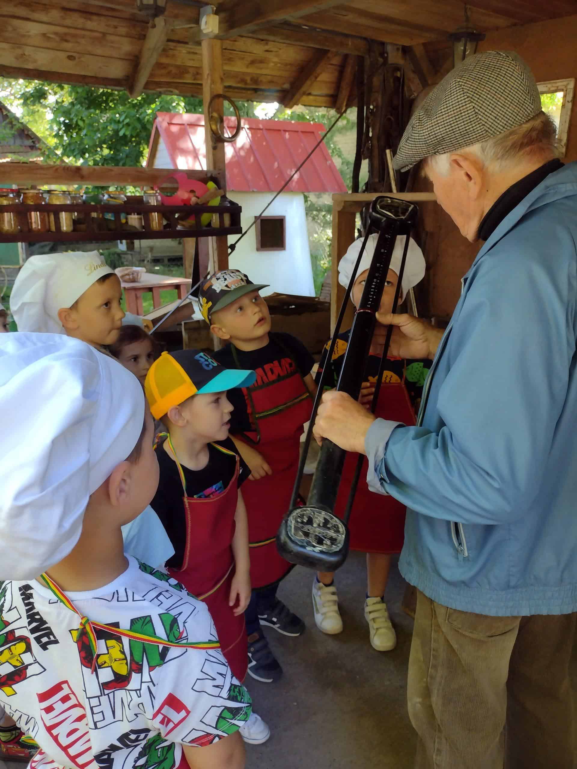 Dzieci coraz częściej rozmawiały na temat wycieczki, widać było że są przejęte i już nie mogą się doczekać wyjazdu. Dzień przed wycieczką, dzieci przypomniały sobie wszystkie zasady bezpieczeństwa, jakie obowiązują w czasie wycieczki. Wreszcie po śniadaniu wyruszyliśmy w podróż do gospodarstwa agroturystycznego „Pod Lipą” w Przychojcu koło Leżajska. Podróż zdawała się dłużyć bez końca, a gdy dotarliśmy na miejsce przywitała nas Gospodyni z Gospodarzem i ich pies. Na początku dzieci wzięły udział w zajęciach edukacyjnych „Mleczna droga” i „Od ziarenka do bochenka”, gdzie mogły wykazać się wiedzą na temat przetworów mlecznych i tego, jak powstaje pieczywo. Dzieci mogły samodzielnie wydoić krowę, z zebranej na powierzchni mleka śmietany ubić masło w maselniczce, ze zsiadłego mleka odcisnąć ser i włożyć go do prasy, zmielić ziarno przy pomocy żaren, przesiać mąkę, odważyć i zabrać do domu. Można było także zobaczyć kłosy i ziarna różnych rodzajów zbórz. Dzieci samodzielnie robiły proziaki, w których jednym ze składników była proza czyli soda. Mali kucharz ubrani w odpowiednie stroje starannie ugniatali ciasto i wycinali kształty. A wszystko to w cieniu sędziwego orzecha. Gdy proziaki znalazły się w piecu, był czas na dobrą zabawę: przebieranie się w kostiumy, jazdę na rowerkach biegowych czy też w wózkach – śmiechu było co nie miara 🙂 Później dzieci mogły zrobić degustację upieczonych smakołyków oraz samodzielnie zrobionego twarogu, które wszystkim bardzo smakowały. Zwiedzaliśmy także dawne chałupy, gdzie mogliśmy podejrzeć jak to się kiedyś mieszkało, poznać starodawne urządzenia i sprzęty oraz podziwiać mistrzostwo bibułkarstwa i rękodzieła ludowego. Na zakończenie nakarmiliśmy koziołka Bronka i pogłaskaliśmy króliki. Szkoda że miłe chwile tak szybko upływają… nadszedł czas wracać do naszego przedszkola.