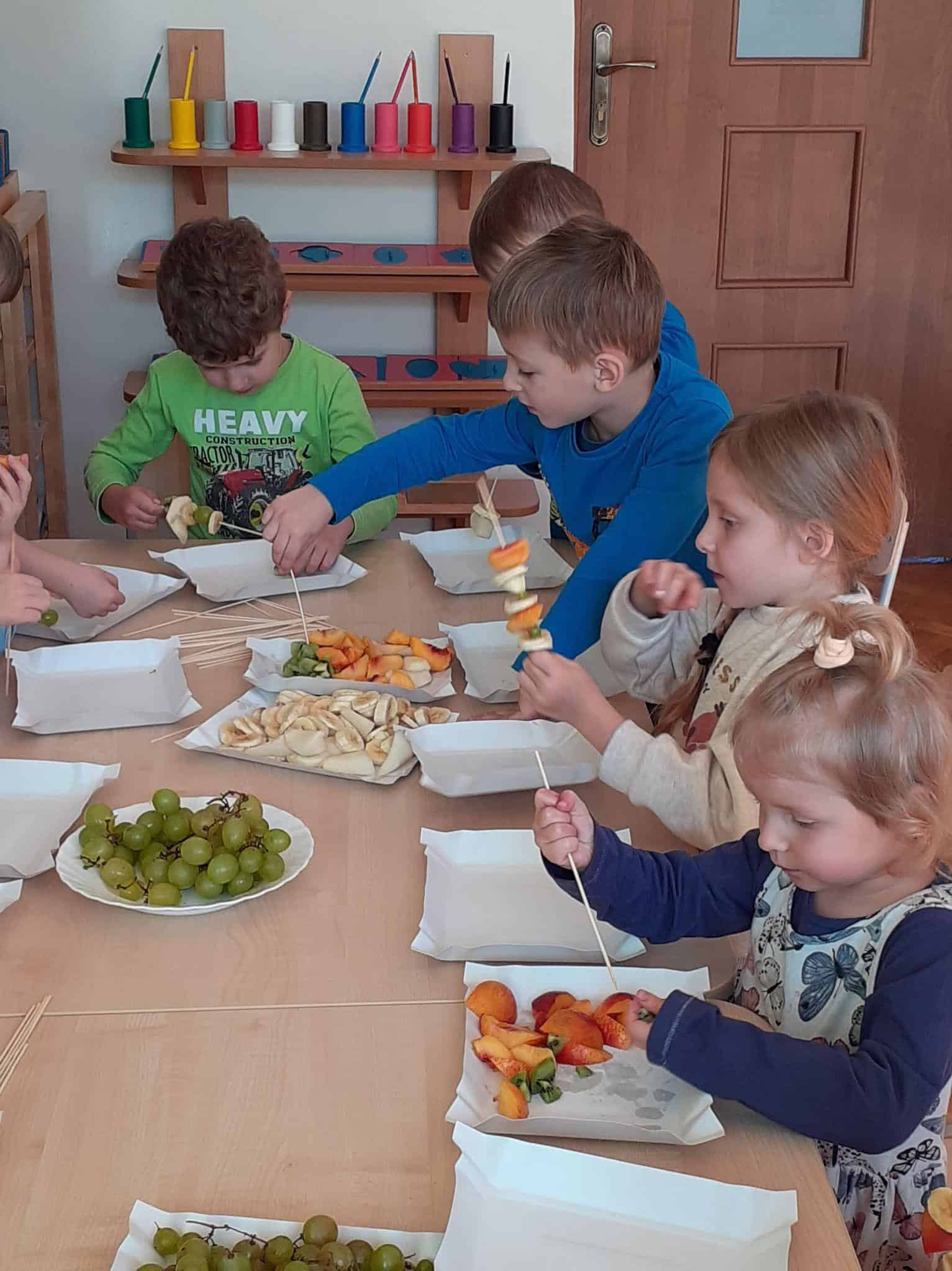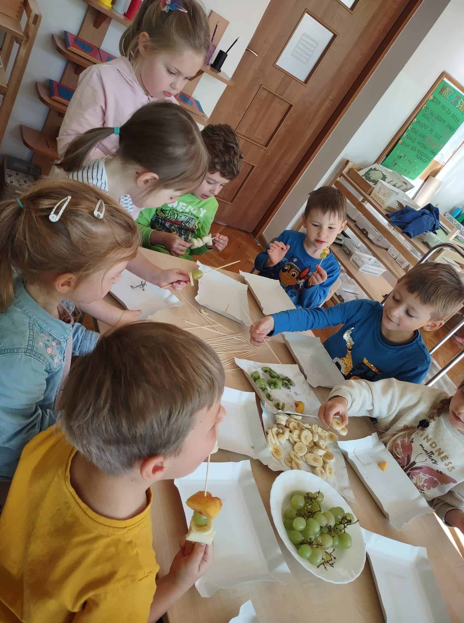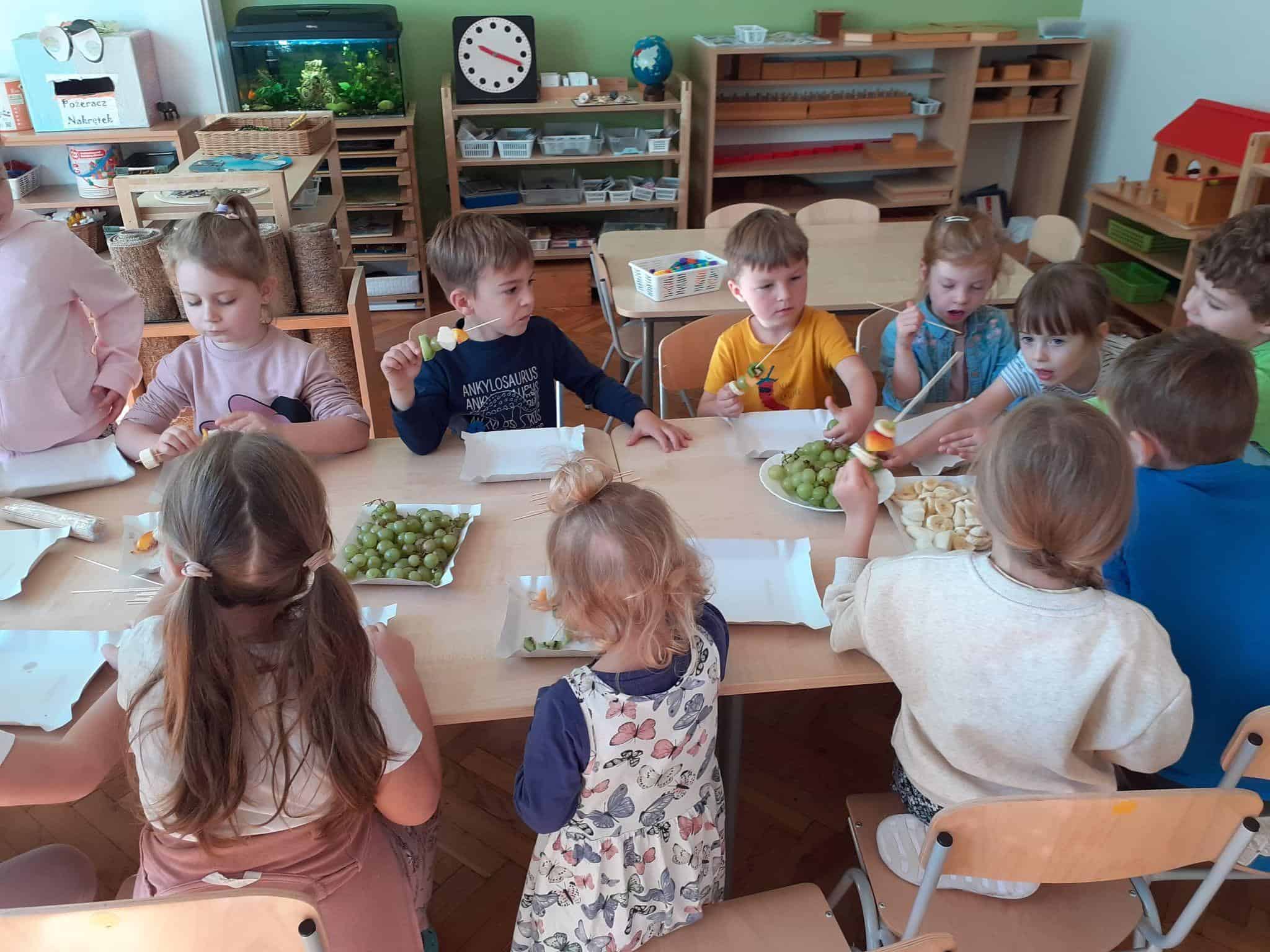 Doskonale wiemy, że należy jeść dużo warzyw i owoców. W przedszkolu poznajemy ich nazwy, badamy wygląd i smak – dotykamy, wąchamy, opisujemy. Działanie przez doświadczenie pozwala szybciej i łatwiej zapamiętać dzieciom nabywane wiadomości. Po serii zajęć z warzywami i owocami przedszkolaki z naszej grupy miały okazję wykonać smakowite przekąski – szaszłyki owocowe. Dzieciom bardzo spodobał się ten pomysł i z ochotą zabrały się do pracy. Tworzenie naszych owocowych szaszłyków było doskonałą okazją do utrwalania i kształtowania prawidłowych nawyków żywieniowych opartych na zdrowych produktach, u nas były to owoce. Wykonywanie przez dzieci owocowych szaszłyków doskonale „wbiło” się w ramy naszych montessoriańskich ćwiczeń dnia praktycznego: mycie owoców, wycieranie, nauka krojenia, bezpieczne posługiwanie się nożem. To kompetencje, które stopniowo pozwalają dzieciom stawać się samodzielnymi. Dzieci pracowały z wielkim zaangażowaniem. Szaszłyki wszystkim bardzo smakowały, pewnie dlatego, że były samodzielnie wykonane przez każdego przedszkolaka 🙂