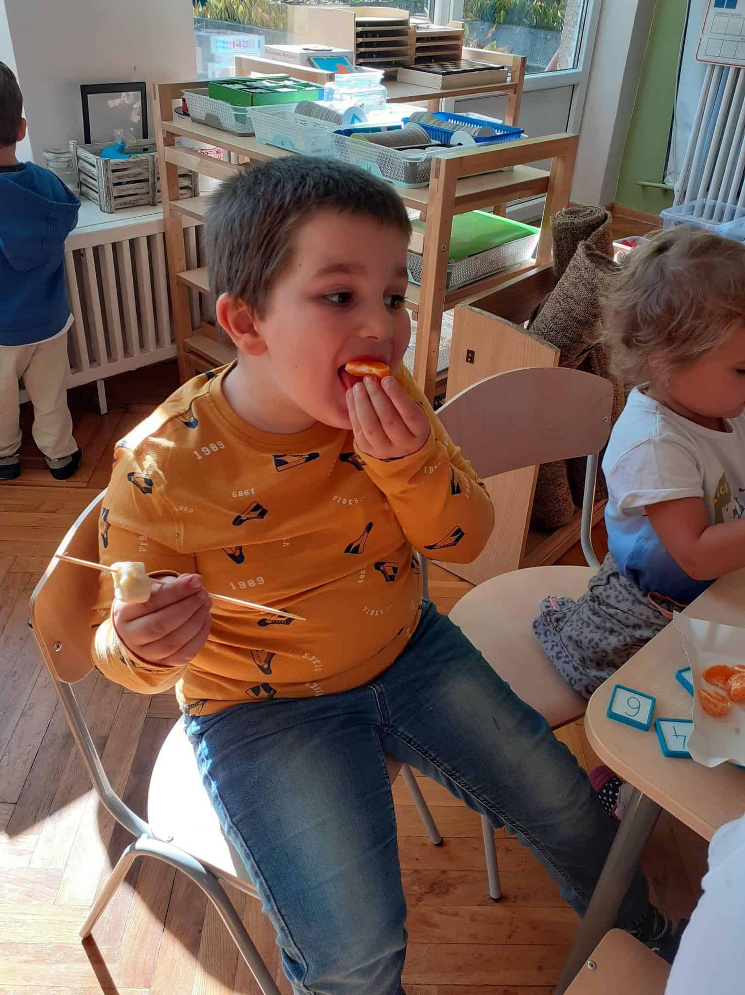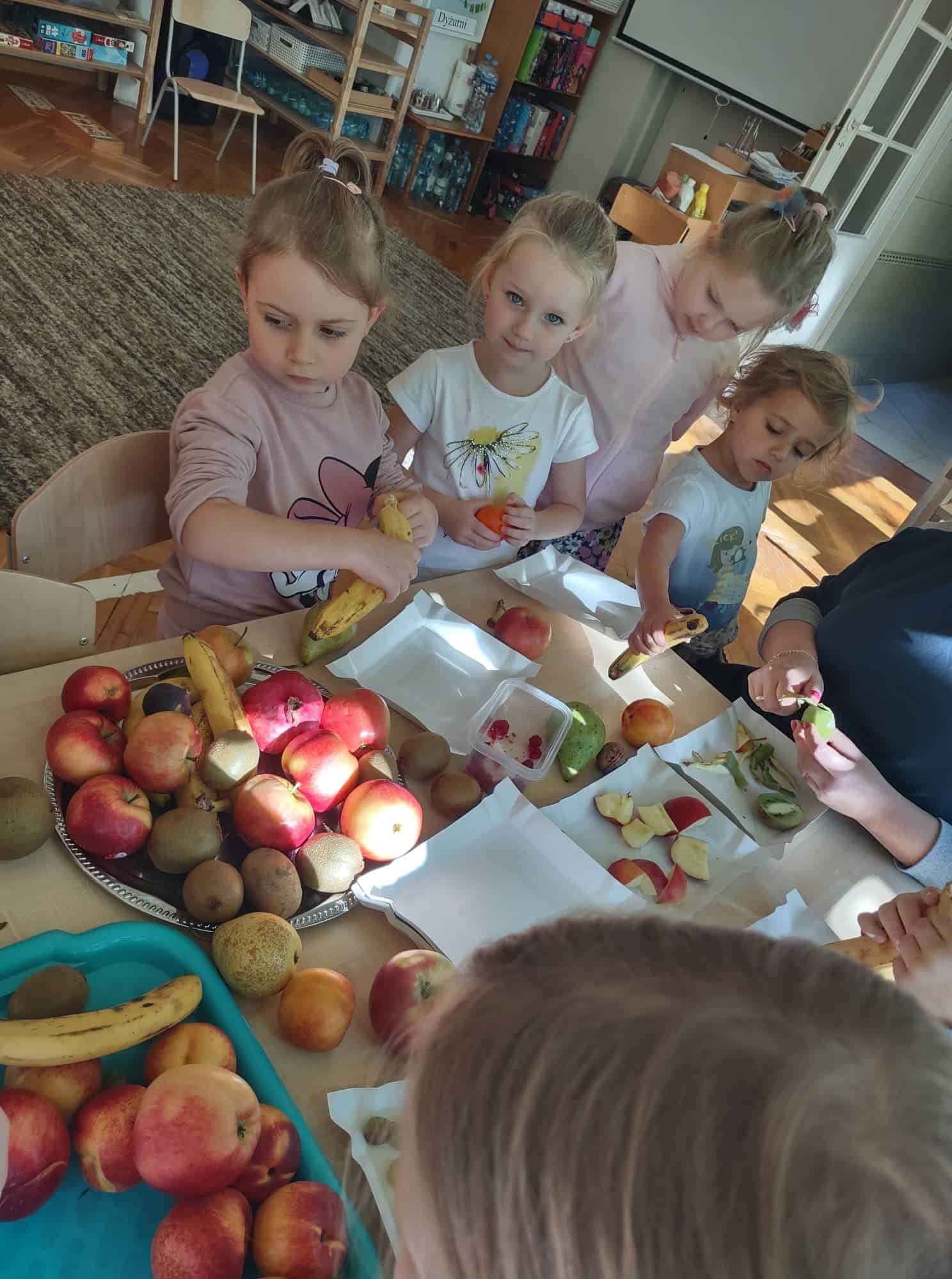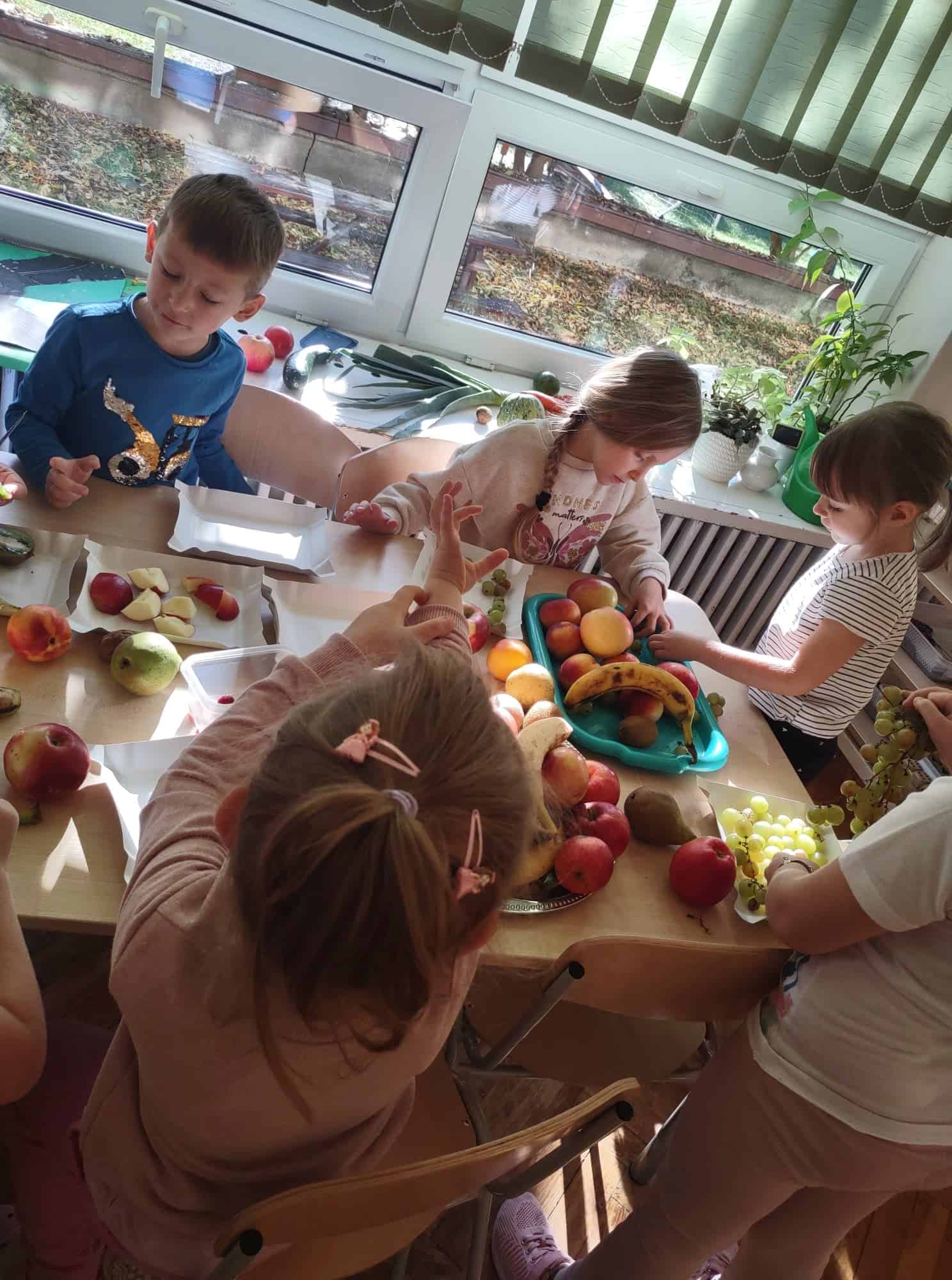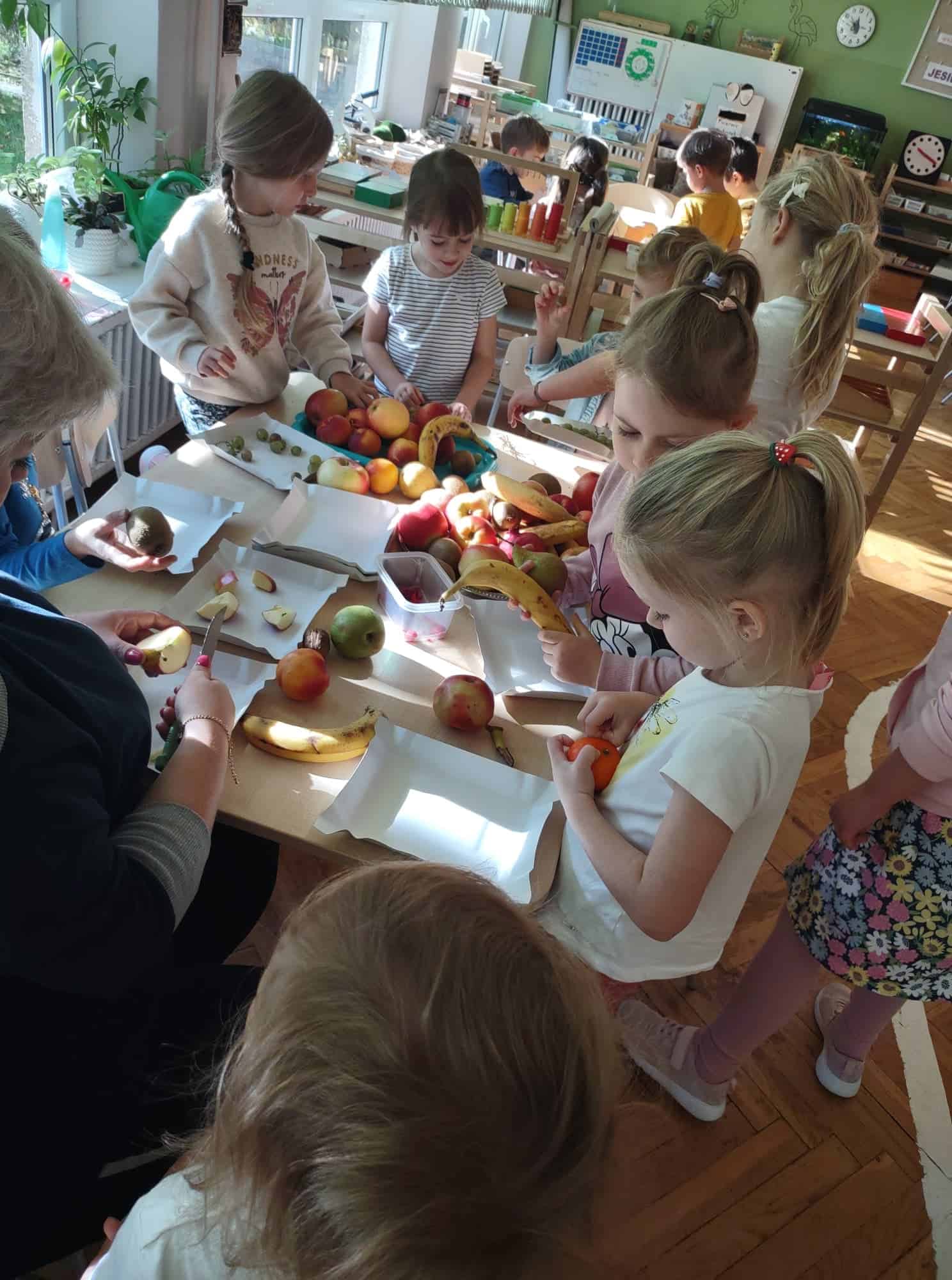 Doskonale wiemy, że należy jeść dużo warzyw i owoców. W przedszkolu poznajemy ich nazwy, badamy wygląd i smak – dotykamy, wąchamy, opisujemy. Działanie przez doświadczenie pozwala szybciej i łatwiej zapamiętać dzieciom nabywane wiadomości. Po serii zajęć z warzywami i owocami przedszkolaki z naszej grupy miały okazję wykonać smakowite przekąski – szaszłyki owocowe. Dzieciom bardzo spodobał się ten pomysł i z ochotą zabrały się do pracy. Tworzenie naszych owocowych szaszłyków było doskonałą okazją do utrwalania i kształtowania prawidłowych nawyków żywieniowych opartych na zdrowych produktach, u nas były to owoce. Wykonywanie przez dzieci owocowych szaszłyków doskonale „wbiło” się w ramy naszych montessoriańskich ćwiczeń dnia praktycznego: mycie owoców, wycieranie, nauka krojenia, bezpieczne posługiwanie się nożem. To kompetencje, które stopniowo pozwalają dzieciom stawać się samodzielnymi. Dzieci pracowały z wielkim zaangażowaniem. Szaszłyki wszystkim bardzo smakowały, pewnie dlatego, że były samodzielnie wykonane przez każdego przedszkolaka 🙂
