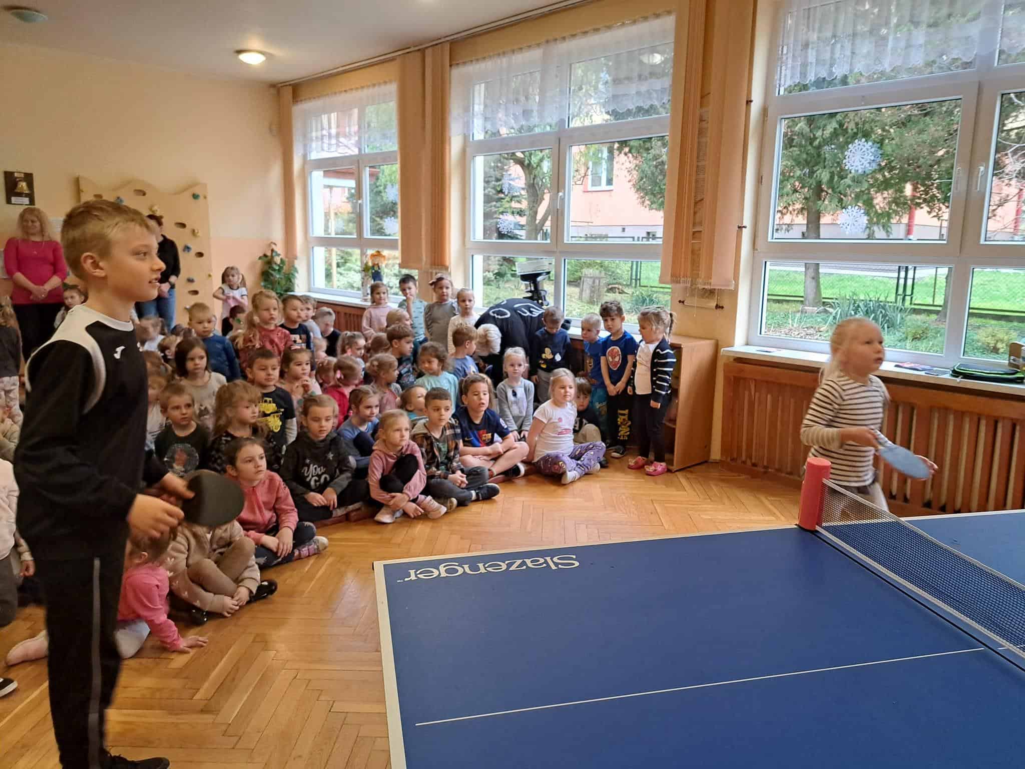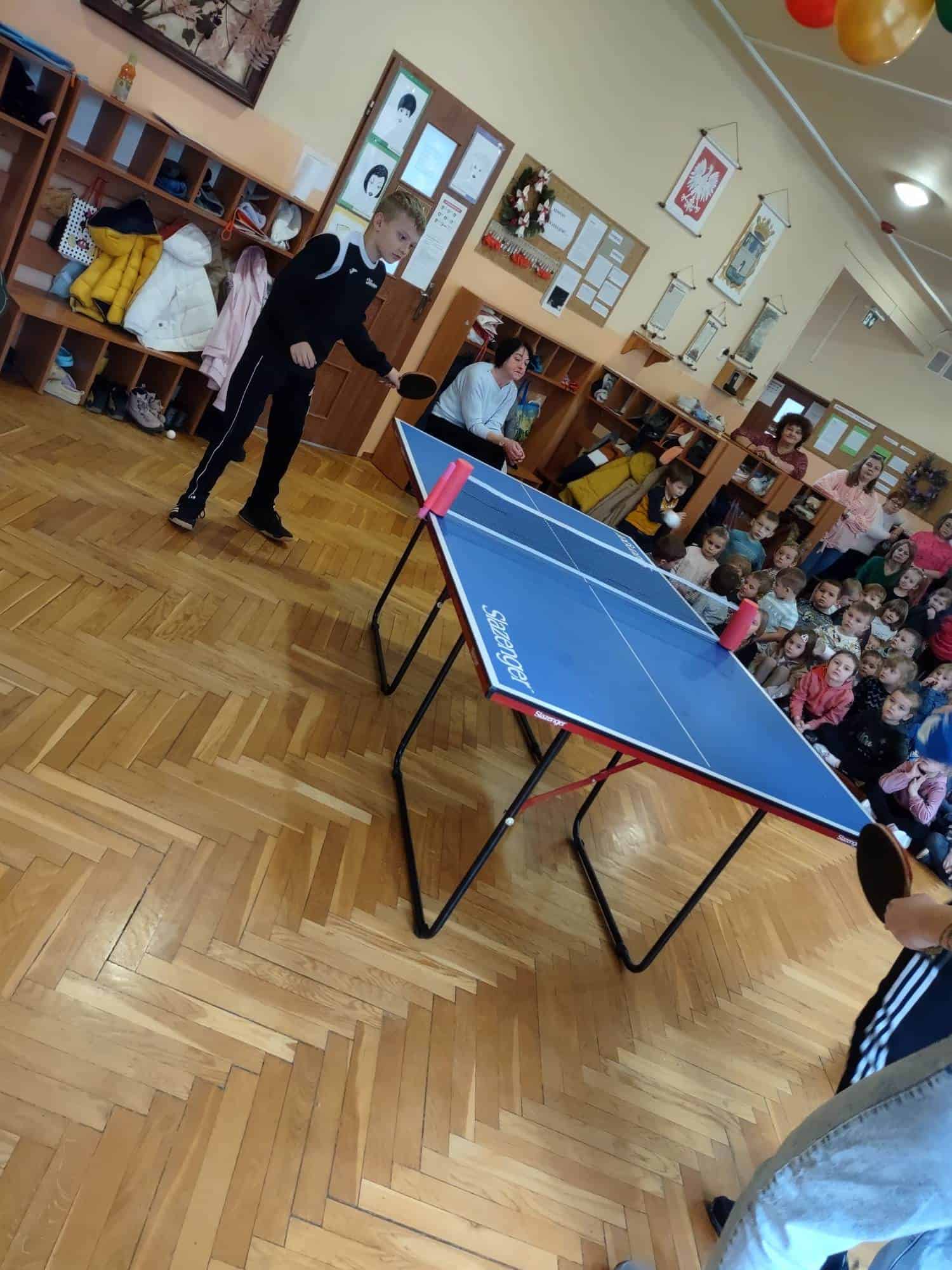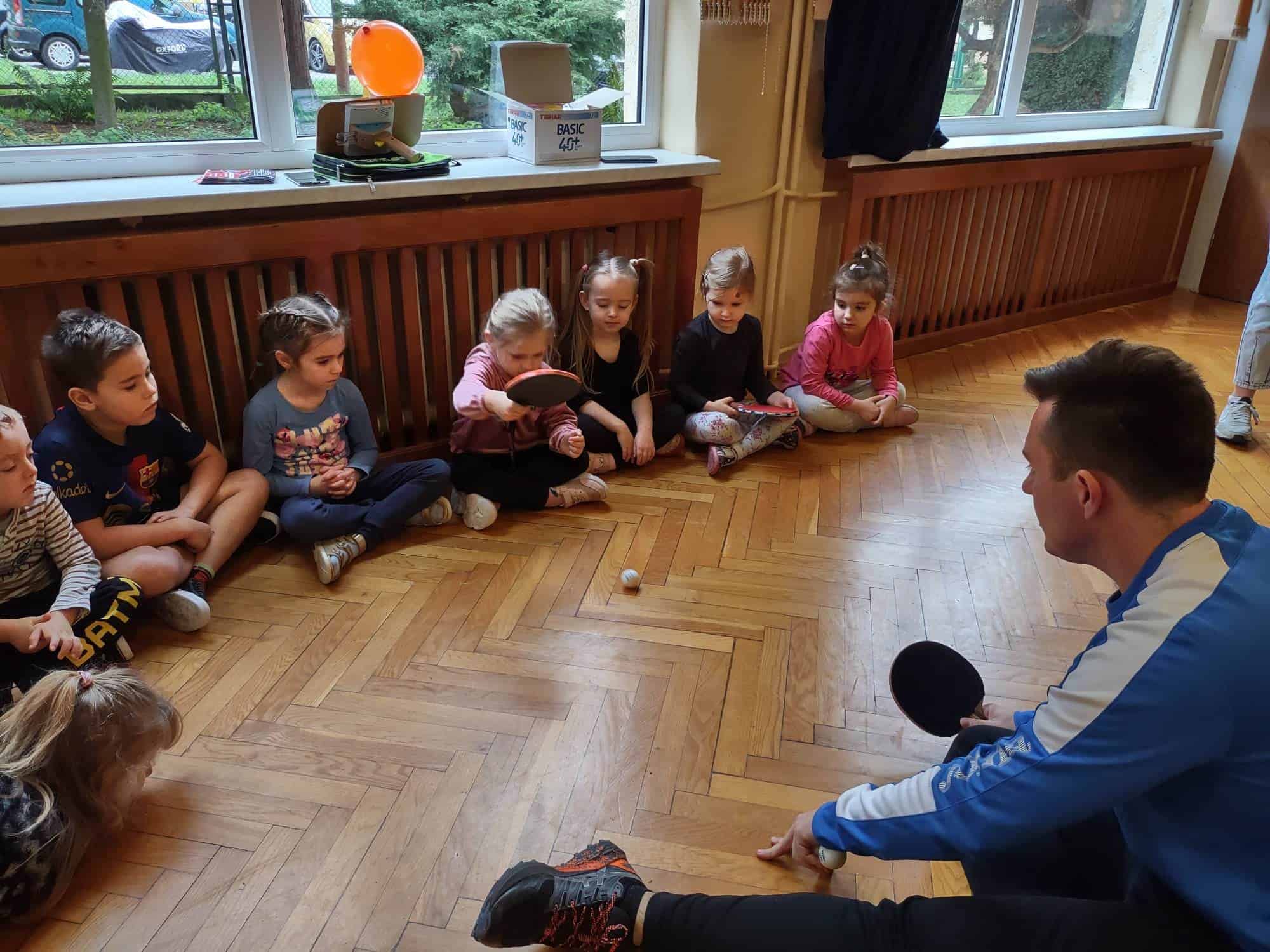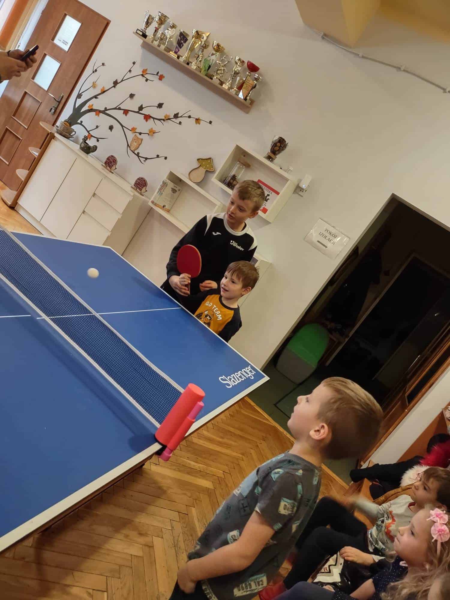 To fantastyczne spotkanie dało dzieciom możliwość poznania tajników gry w tenisa stołowego; co niektórzy próbowali nawet swoich sił przy stole. Pan Mateusz bardzo rzeczowo i ciekawie opowiadał wszystkim zebranym o treningach, o sposobie gry, o możliwościach rozwojowych jakie niesie ze sobą ten właśnie sport. Dzieci z dużym zaciekawieniem słuchały trenera, który zapraszał ich do aktywności i urozmaicał dzieciom czas różnorodnymi zabawami przy stole pingpongowym.