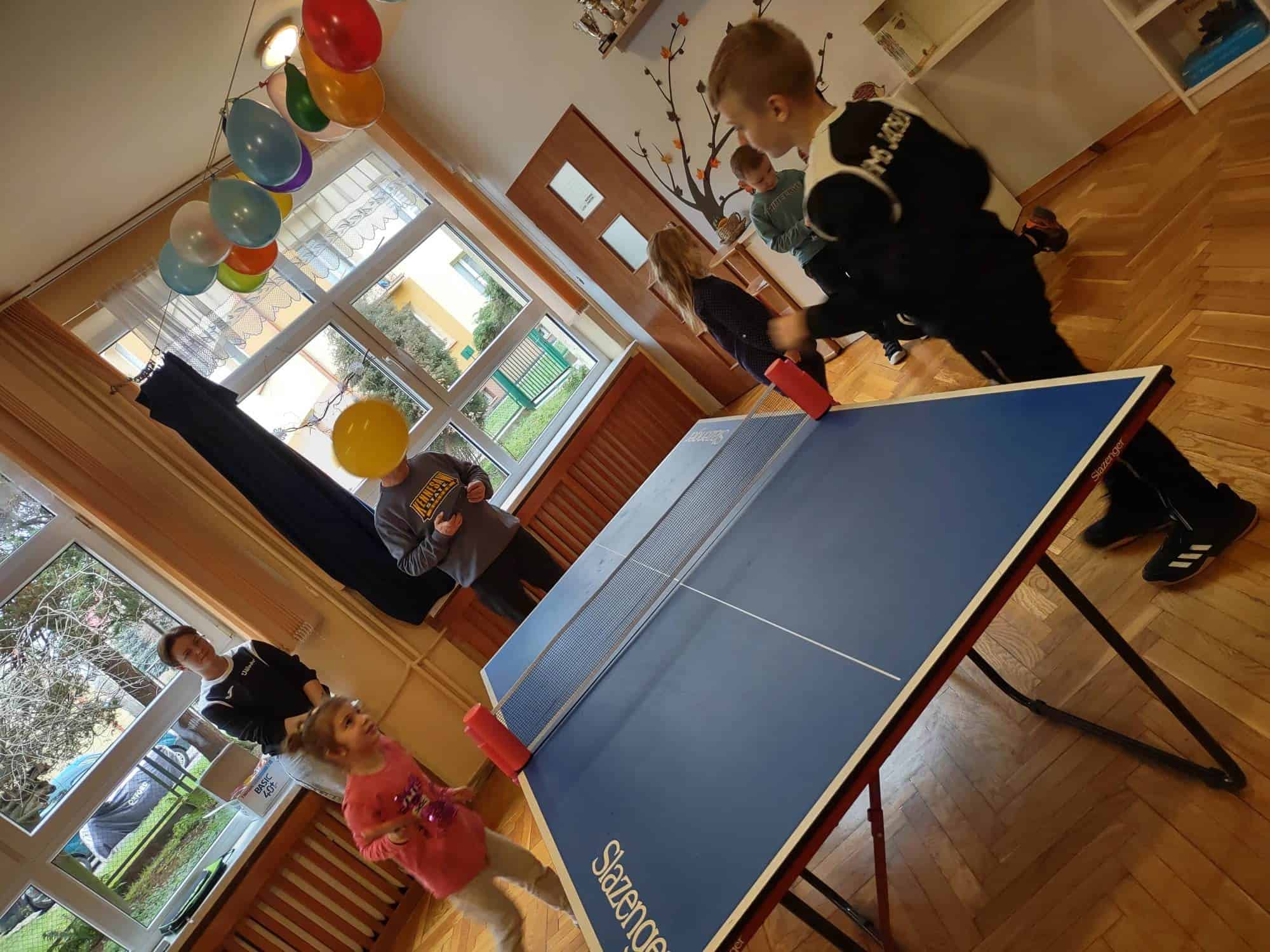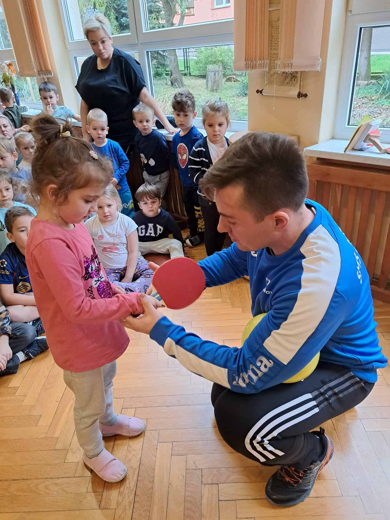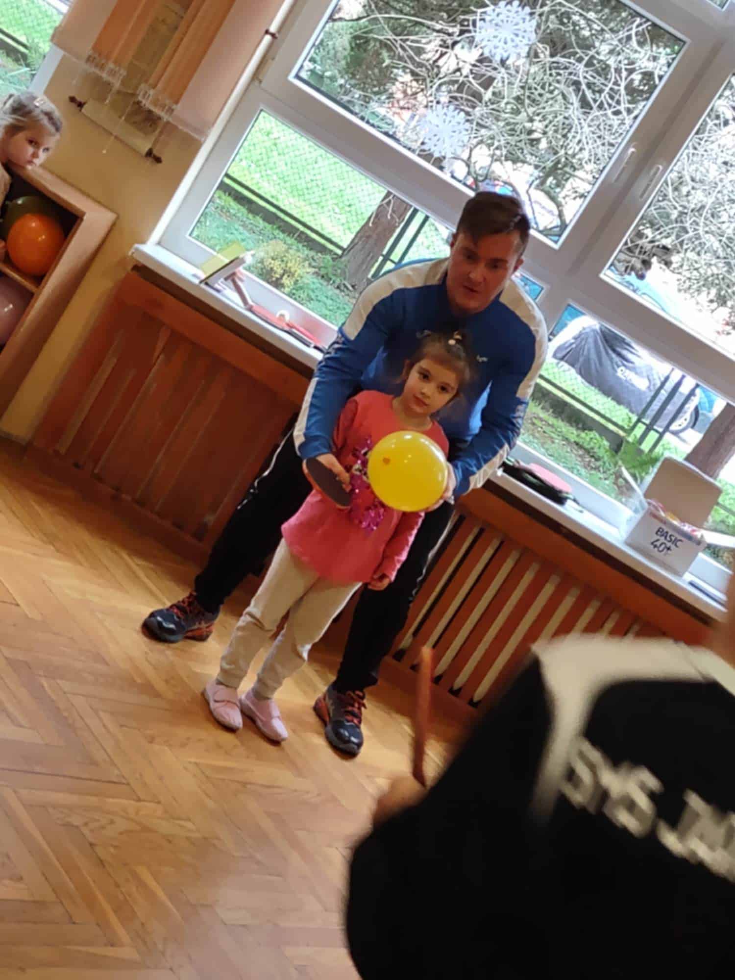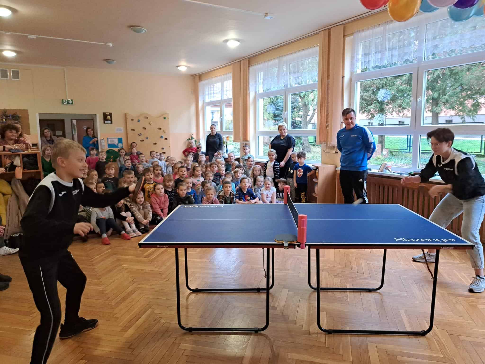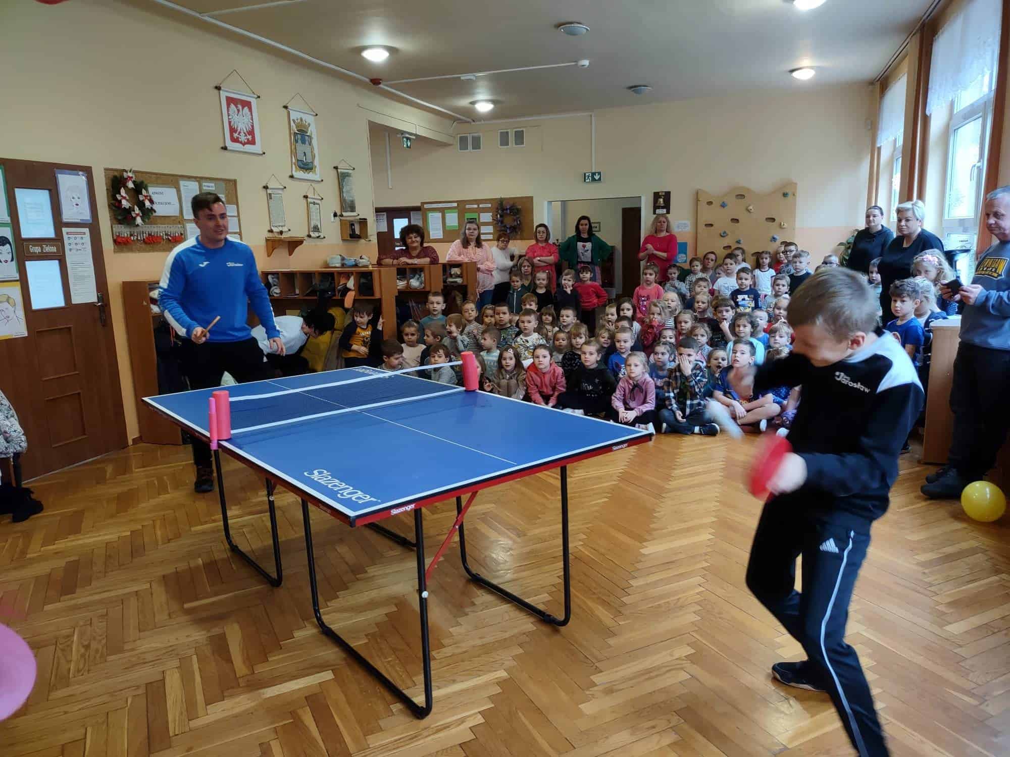 To fantastyczne spotkanie dało dzieciom możliwość poznania tajników gry w tenisa stołowego; co niektórzy próbowali nawet swoich sił przy stole. Pan Mateusz bardzo rzeczowo i ciekawie opowiadał wszystkim zebranym o treningach, o sposobie gry, o możliwościach rozwojowych jakie niesie ze sobą ten właśnie sport. Dzieci z dużym zaciekawieniem słuchały trenera, który zapraszał ich do aktywności i urozmaicał dzieciom czas różnorodnymi zabawami przy stole pingpongowym.