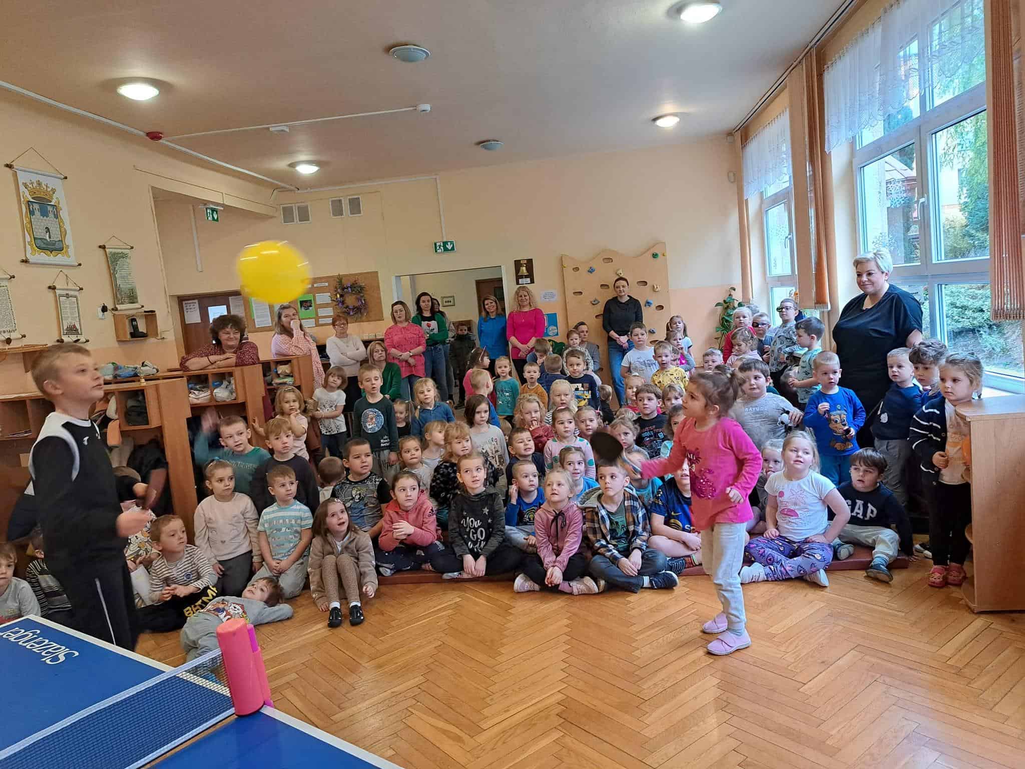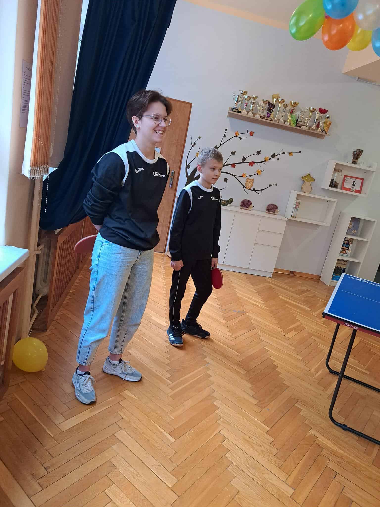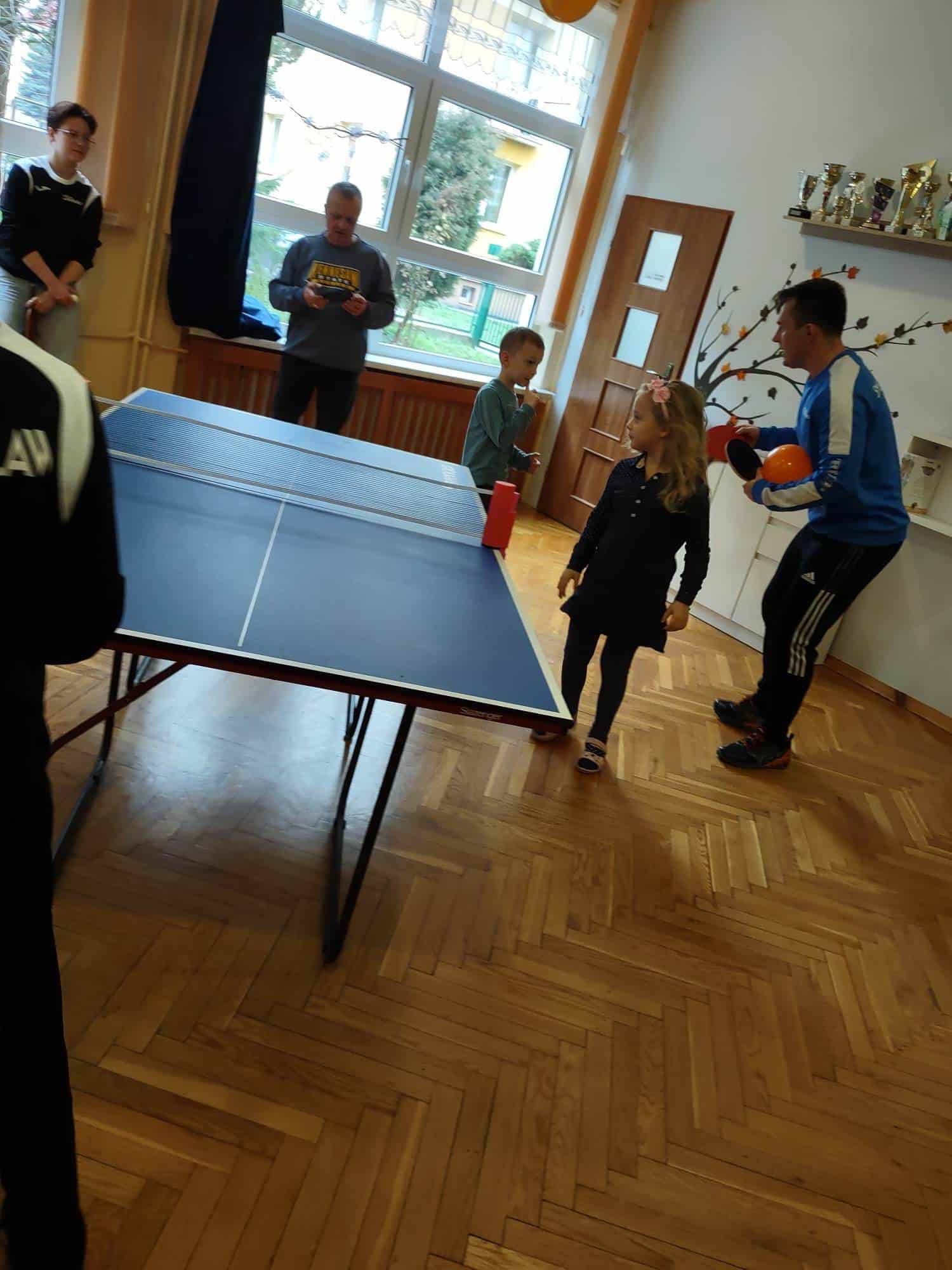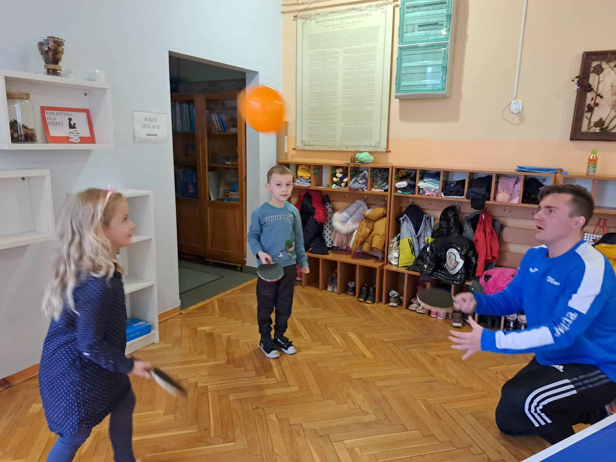 To fantastyczne spotkanie dało dzieciom możliwość poznania tajników gry w tenisa stołowego; co niektórzy próbowali nawet swoich sił przy stole. Pan Mateusz bardzo rzeczowo i ciekawie opowiadał wszystkim zebranym o treningach, o sposobie gry, o możliwościach rozwojowych jakie niesie ze sobą ten właśnie sport. Dzieci z dużym zaciekawieniem słuchały trenera, który zapraszał ich do aktywności i urozmaicał dzieciom czas różnorodnymi zabawami przy stole pingpongowym.