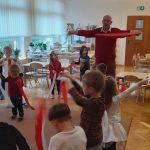 Kolejna grupa – grupa Żółta – zaprezentowała wszystkim niepowtarzalny i niezwykle barwny taniec narodowy – KRAKOWIAK. Grupa taneczna zachwyciła publiczność swoim talentem. Mali tancerze prezentowali się pięknie w krakowskich strojach.