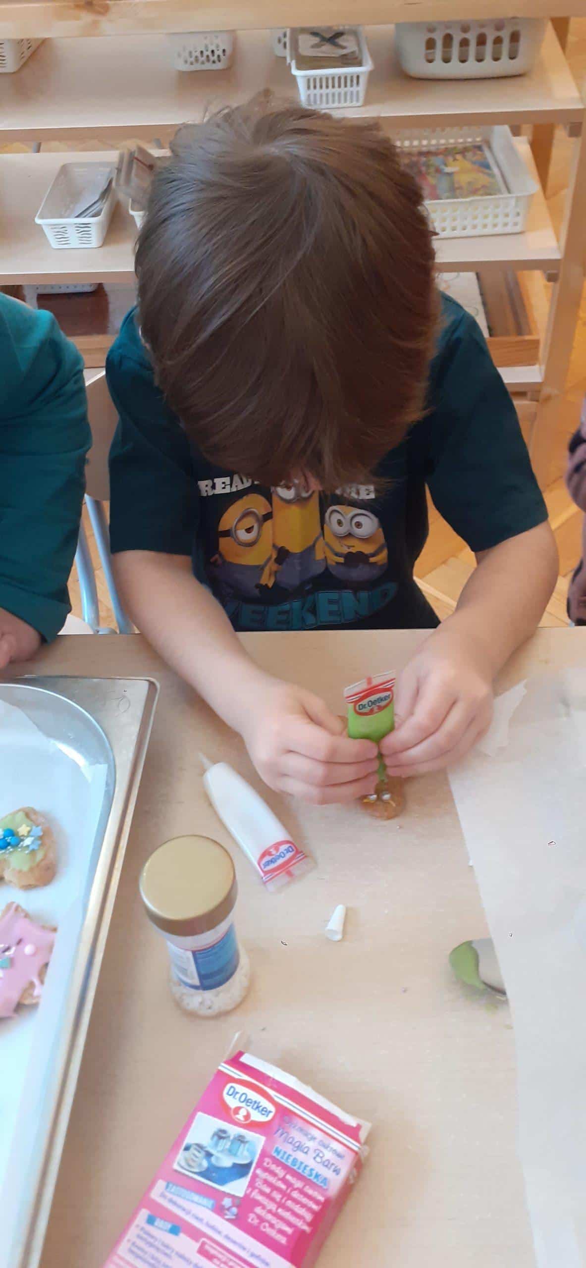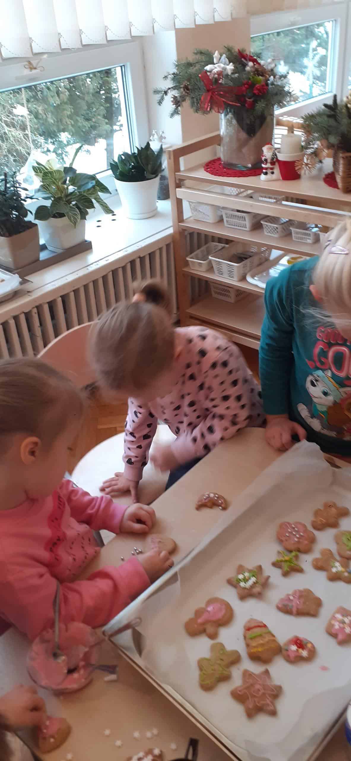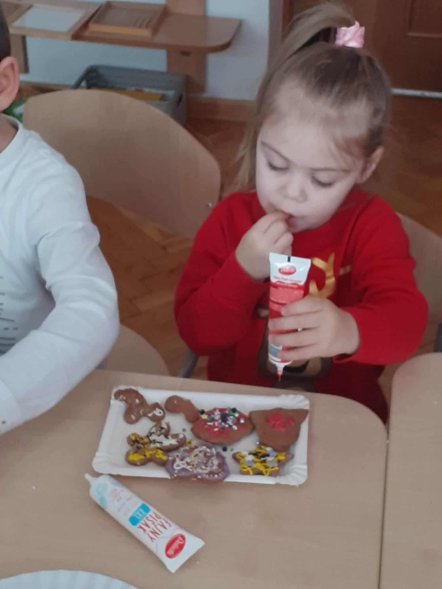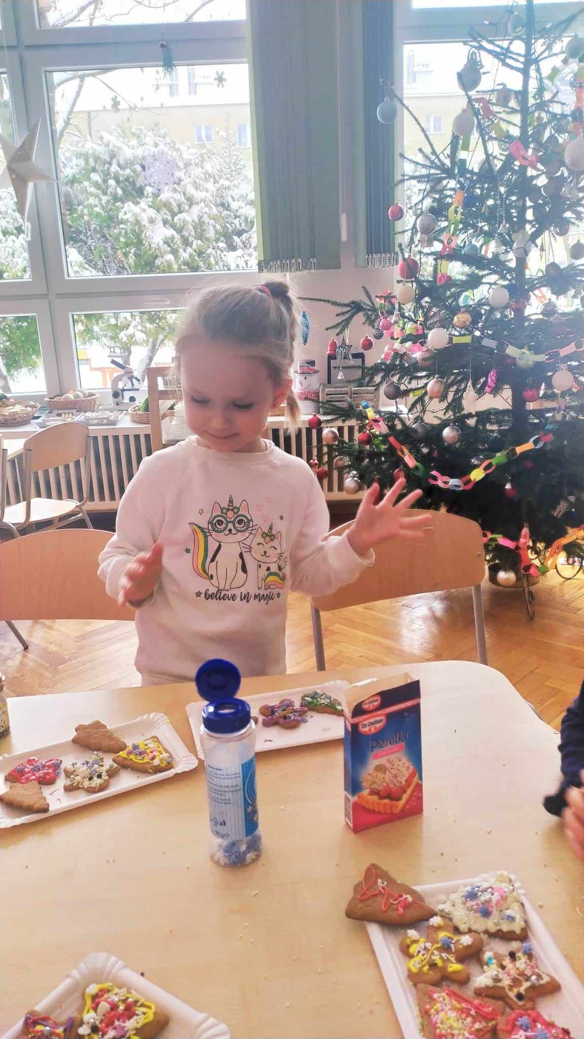13 grudnia odwiedziły nas Mamusie Mii, Laury, Kubusia i Oli, dzięki którym dzieci mogły osobiście doświadczać świątecznych przygotowań, podczas dekorowania pierniczków. Było radośnie i miło, a rąk do pracy nie brakowało, gdyż do grona świątecznych pomocników dołączyły także siostrzyczka Oli, Mii i Laury 🙂 Przy dźwiękach kolęd zaczęliśmy swoje działania. Na stołach pojawił się kolorowy lukier, różnobarwne posypki, rysiki dekoracyjne oraz pisaki cukrowe, które pomogły nam w samodzielnym dekorowaniu pierników. Każdy wyglądał inaczej, był wyjątkowy i niepowtarzalny.