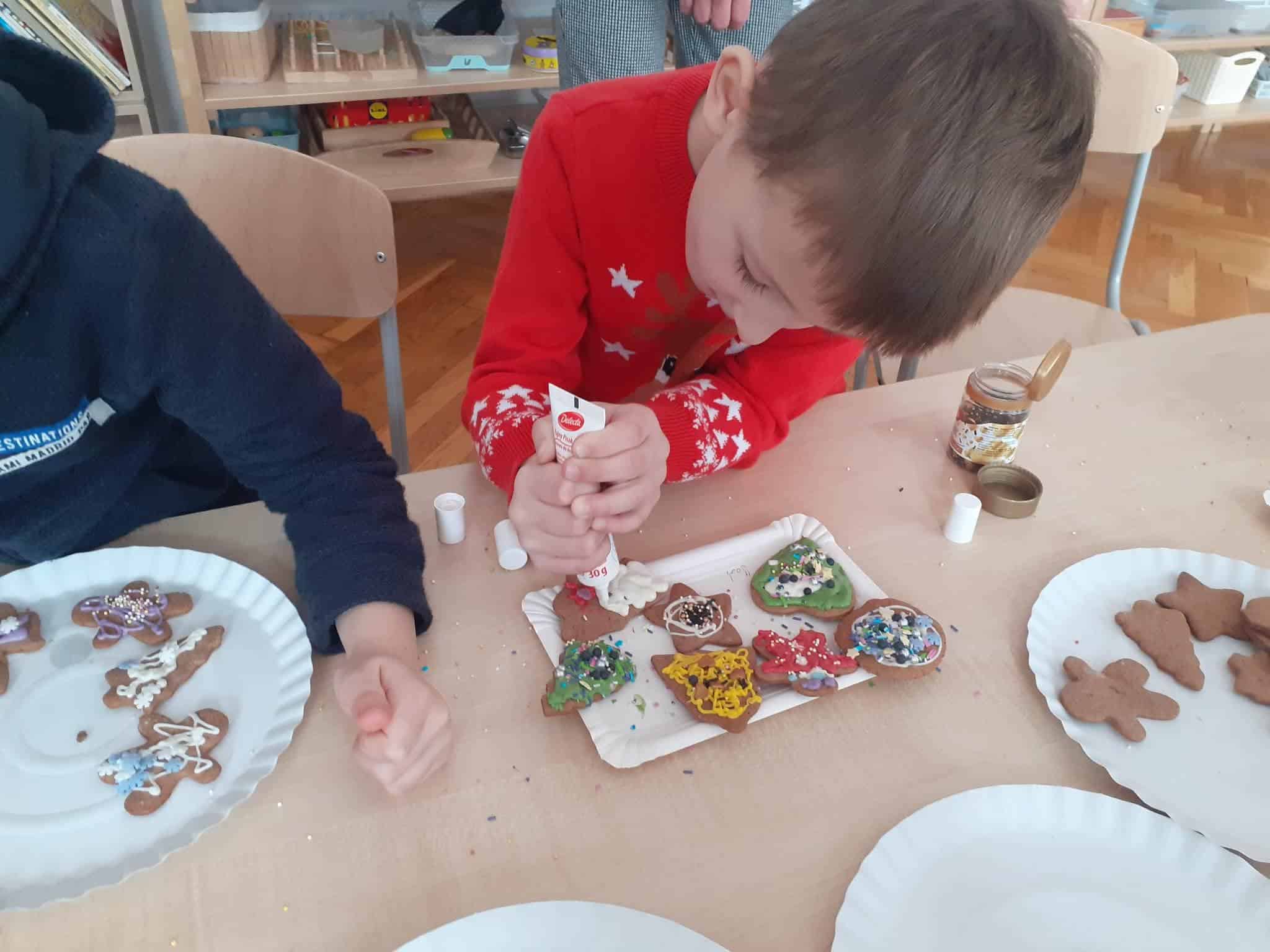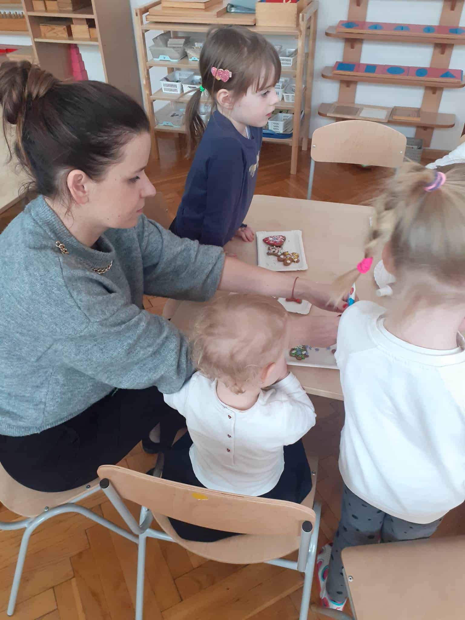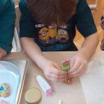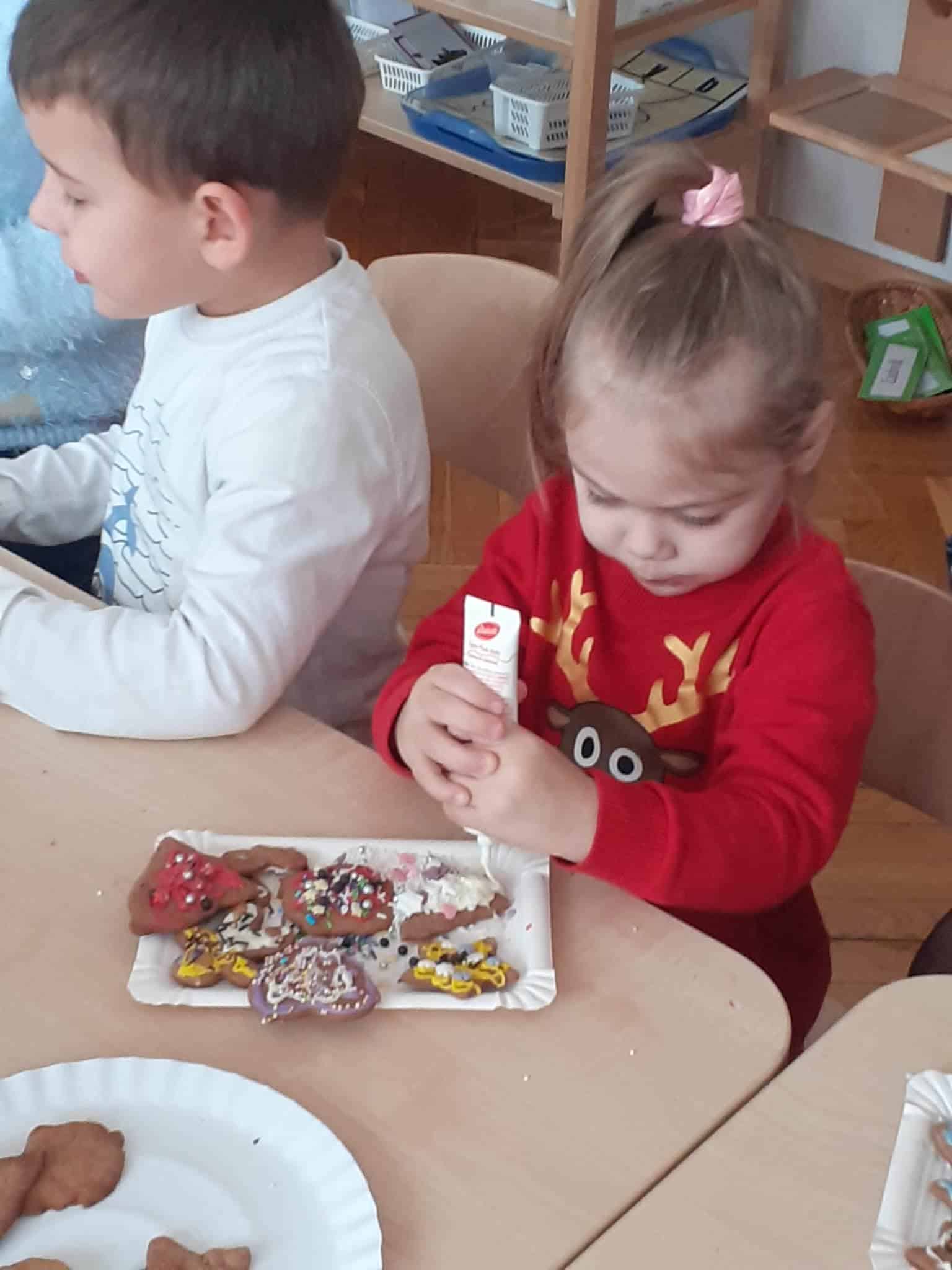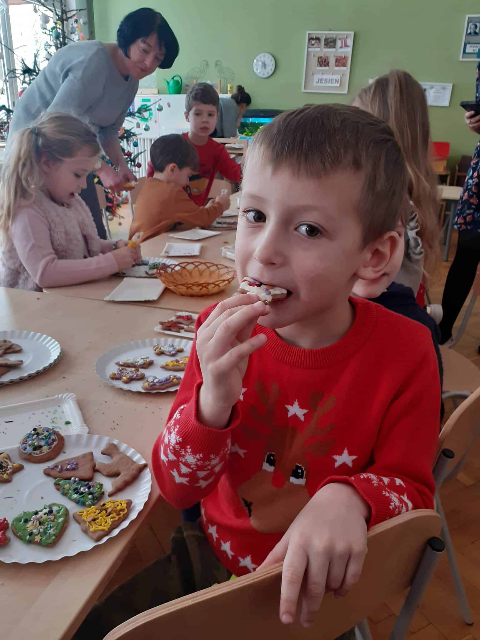 13 grudnia odwiedziły nas Mamusie Mii, Laury, Kubusia i Oli, dzięki którym dzieci mogły osobiście doświadczać świątecznych przygotowań, podczas dekorowania pierniczków. Było radośnie i miło, a rąk do pracy nie brakowało, gdyż do grona świątecznych pomocników dołączyły także siostrzyczka Oli, Mii i Laury 🙂 Przy dźwiękach kolęd zaczęliśmy swoje działania. Na stołach pojawił się kolorowy lukier, różnobarwne posypki, rysiki dekoracyjne oraz pisaki cukrowe, które pomogły nam w samodzielnym dekorowaniu pierników. Każdy wyglądał inaczej, był wyjątkowy i niepowtarzalny.