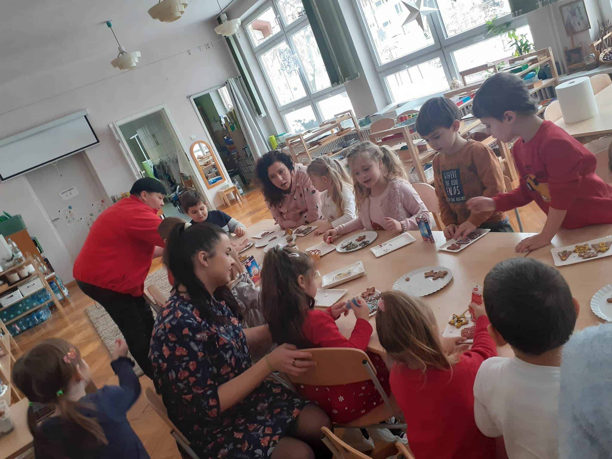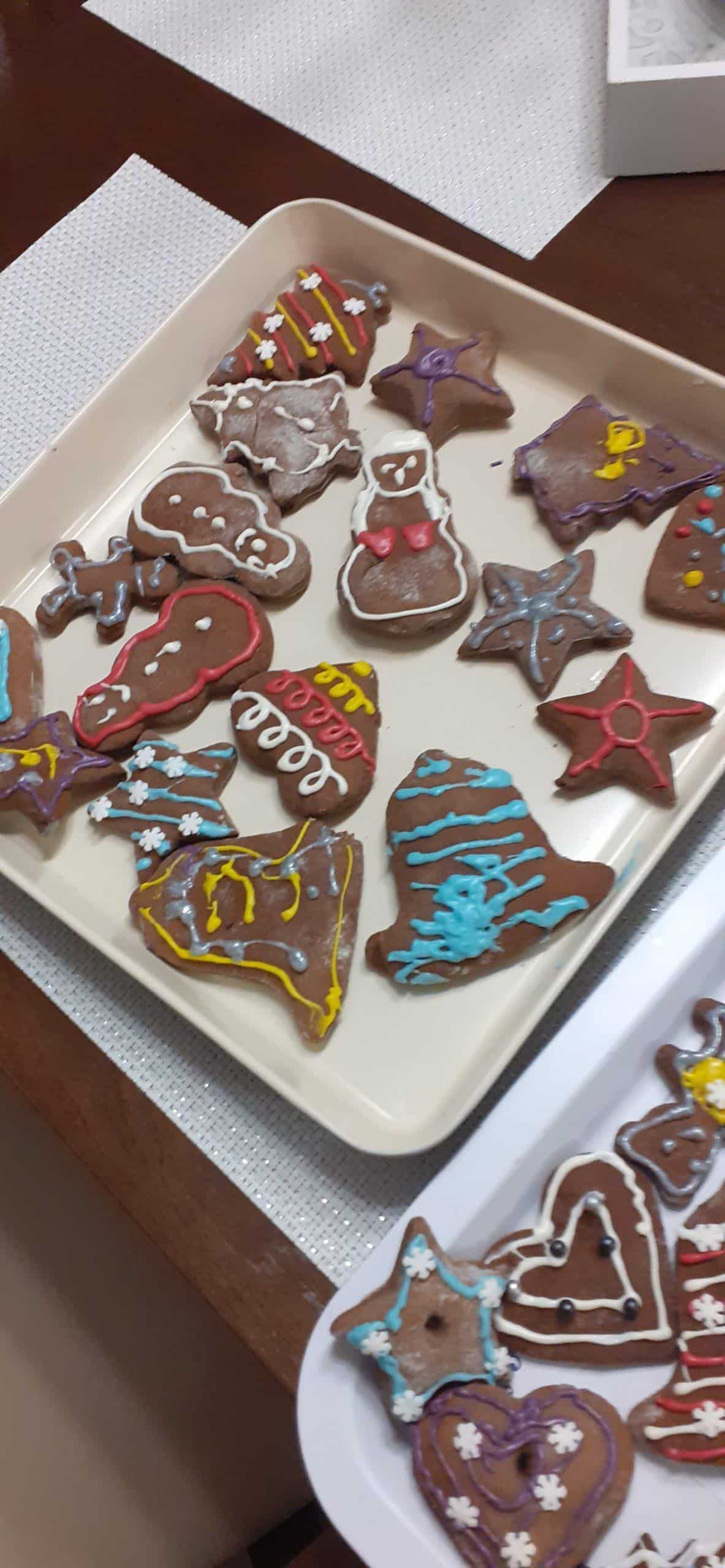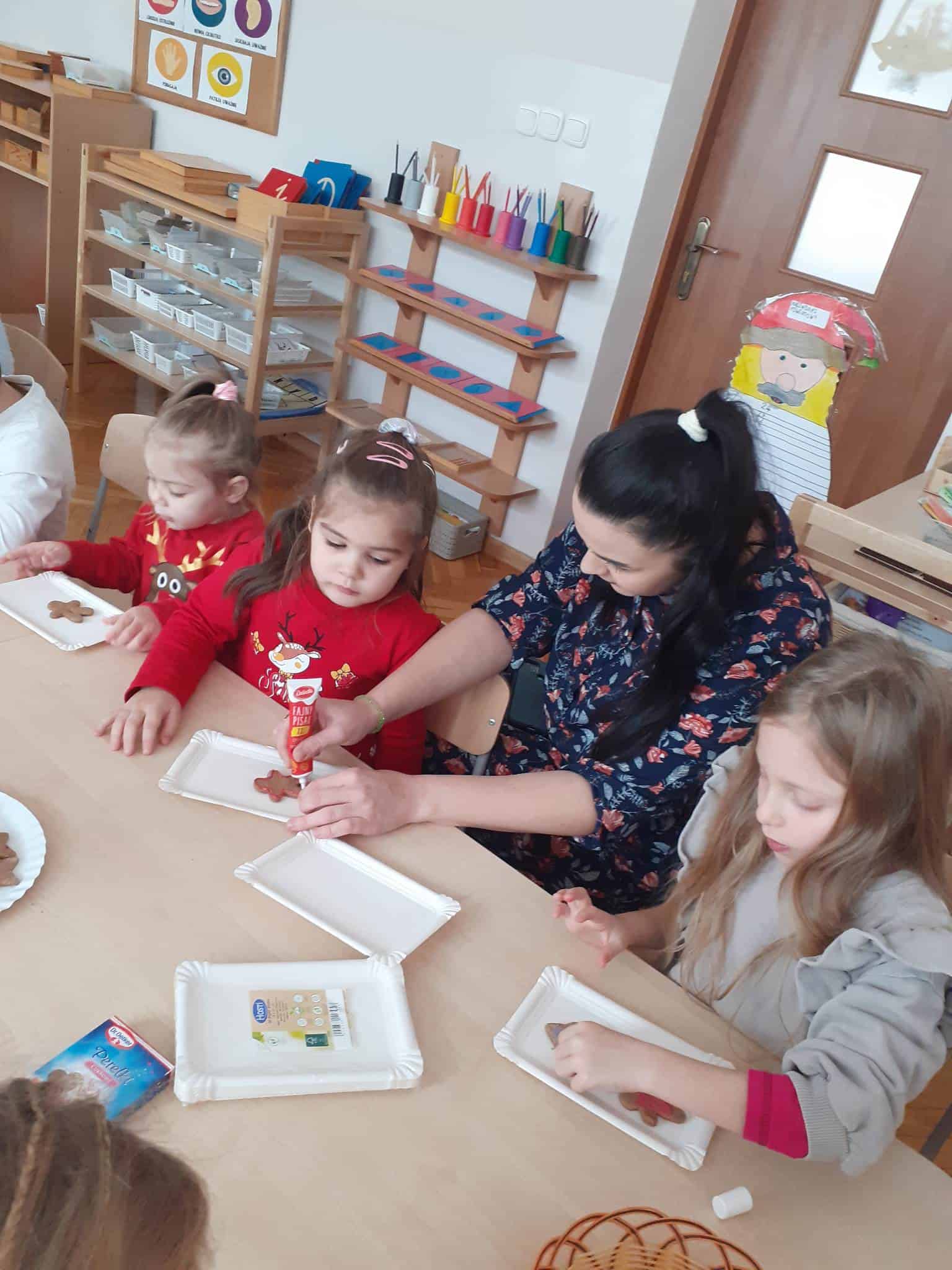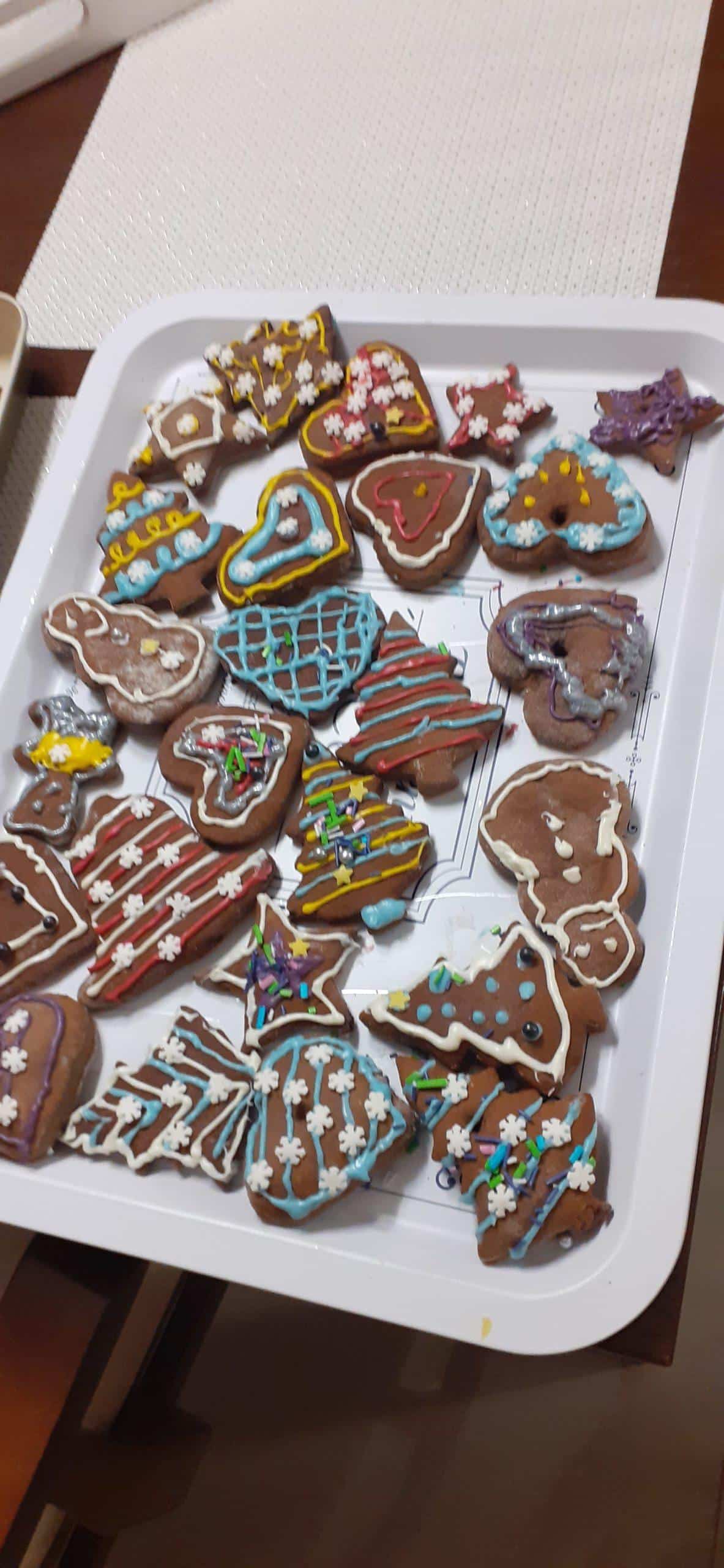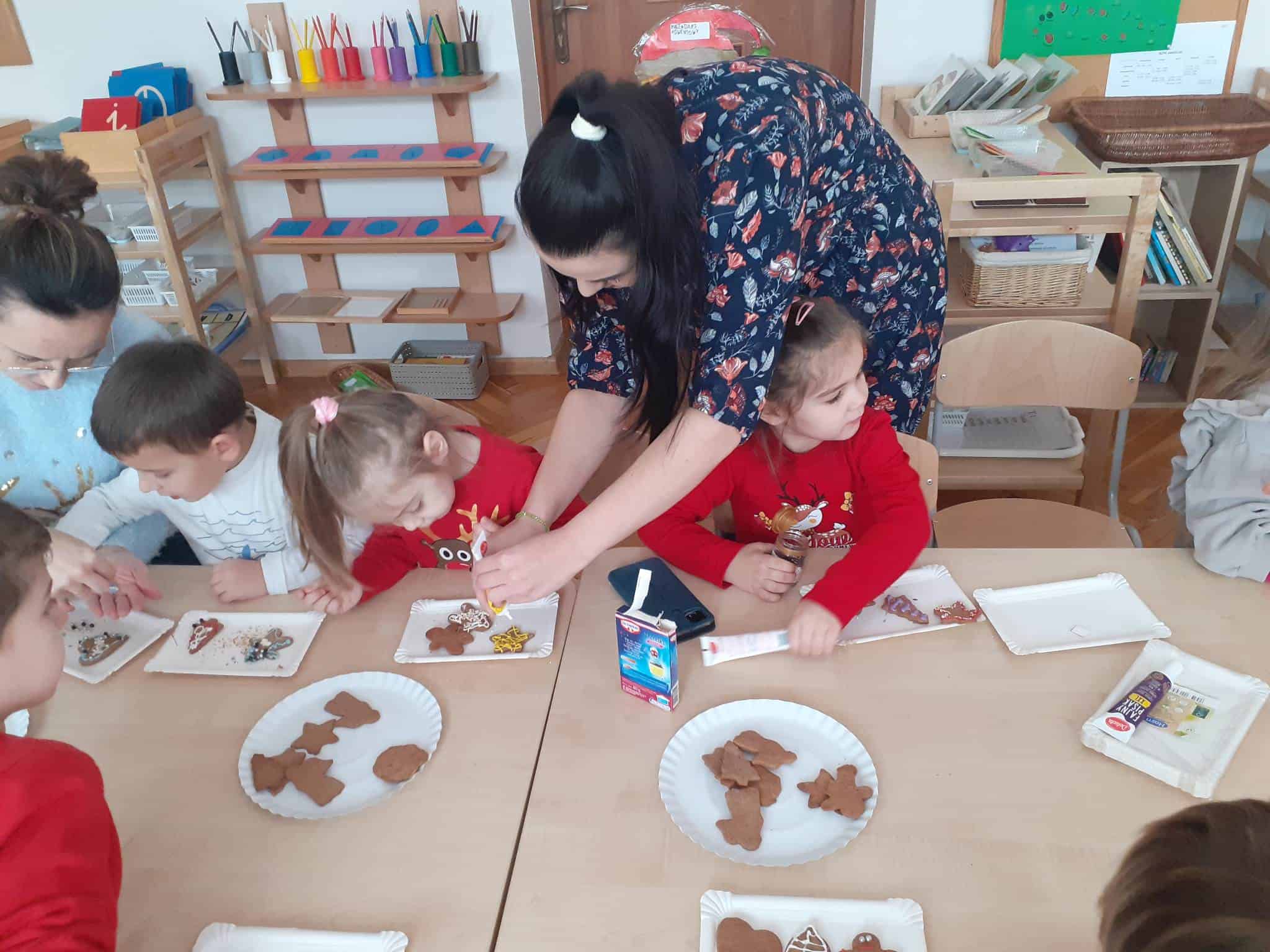 13 grudnia odwiedziły nas Mamusie Mii, Laury, Kubusia i Oli, dzięki którym dzieci mogły osobiście doświadczać świątecznych przygotowań, podczas dekorowania pierniczków. Było radośnie i miło, a rąk do pracy nie brakowało, gdyż do grona świątecznych pomocników dołączyły także siostrzyczka Oli, Mii i Laury 🙂 Przy dźwiękach kolęd zaczęliśmy swoje działania. Na stołach pojawił się kolorowy lukier, różnobarwne posypki, rysiki dekoracyjne oraz pisaki cukrowe, które pomogły nam w samodzielnym dekorowaniu pierników. Każdy wyglądał inaczej, był wyjątkowy i niepowtarzalny.