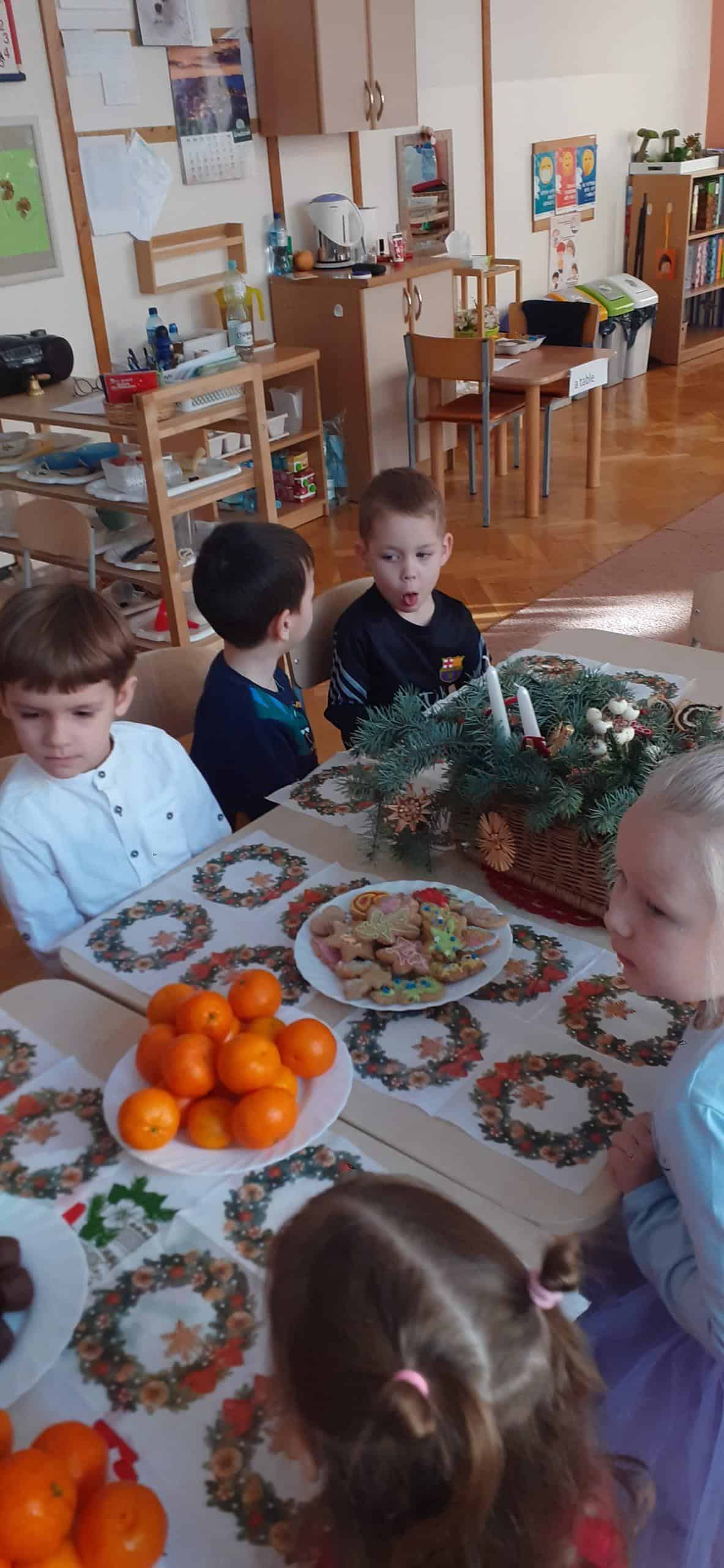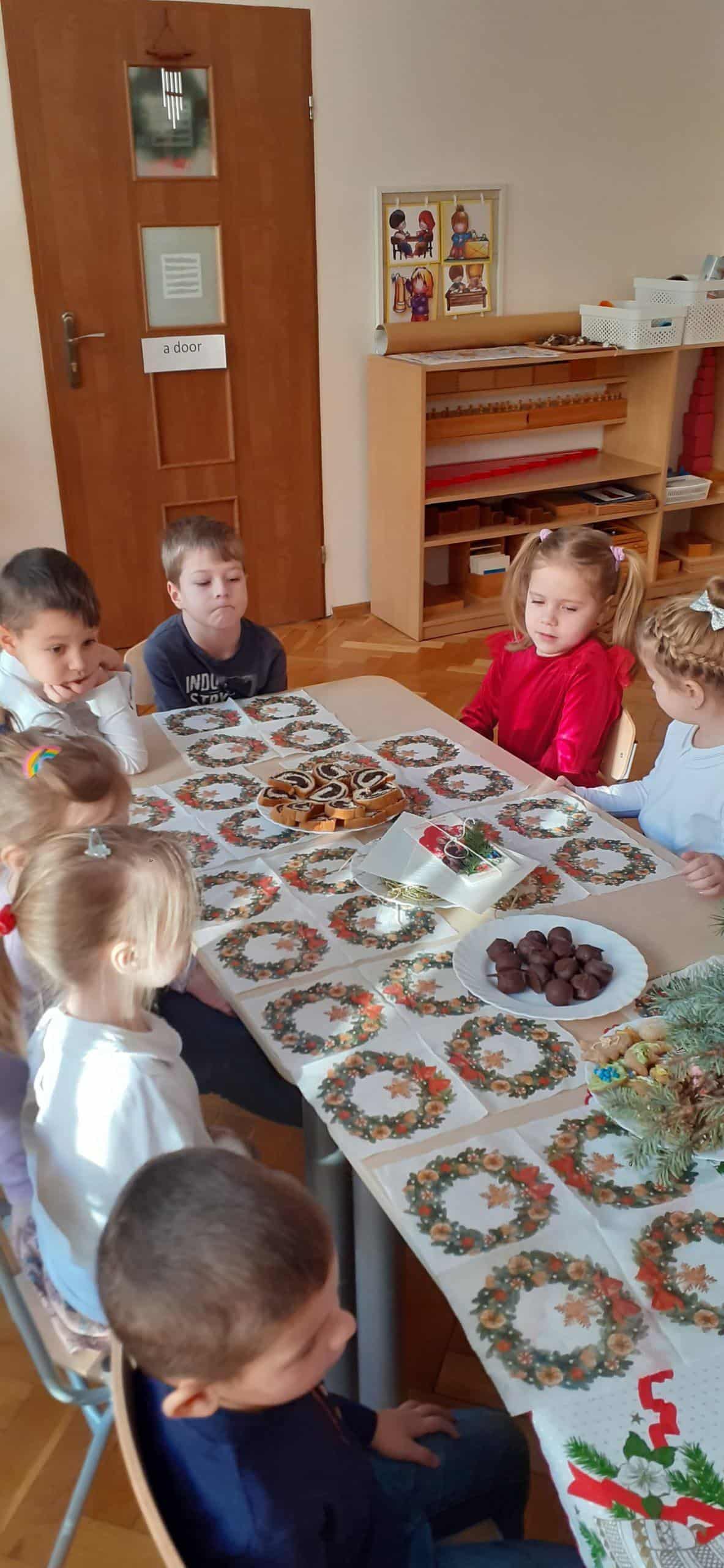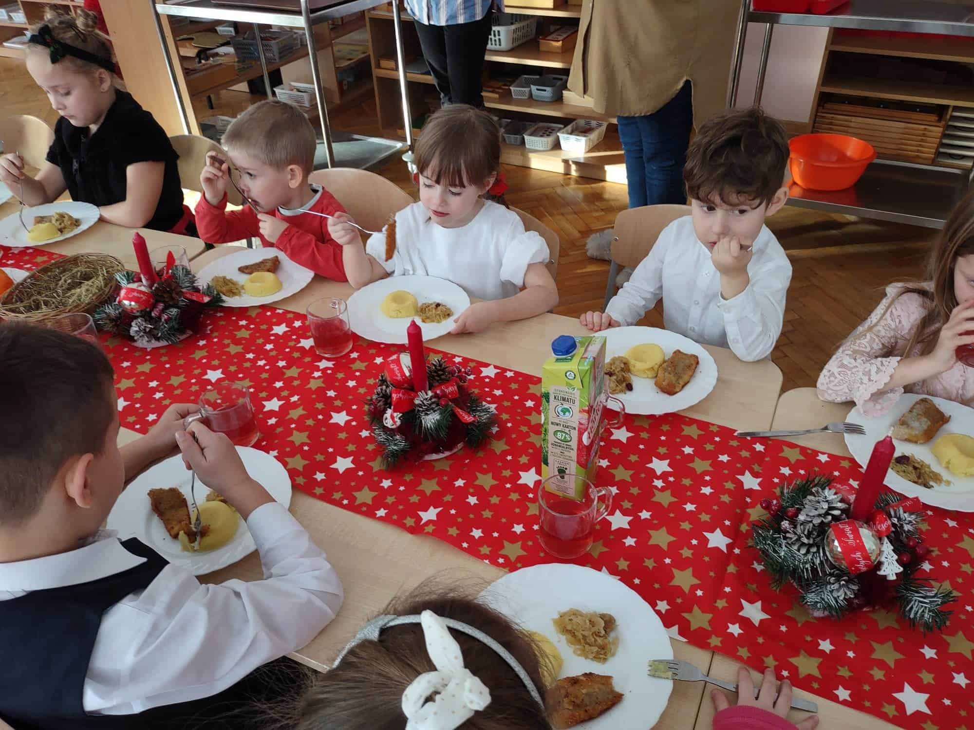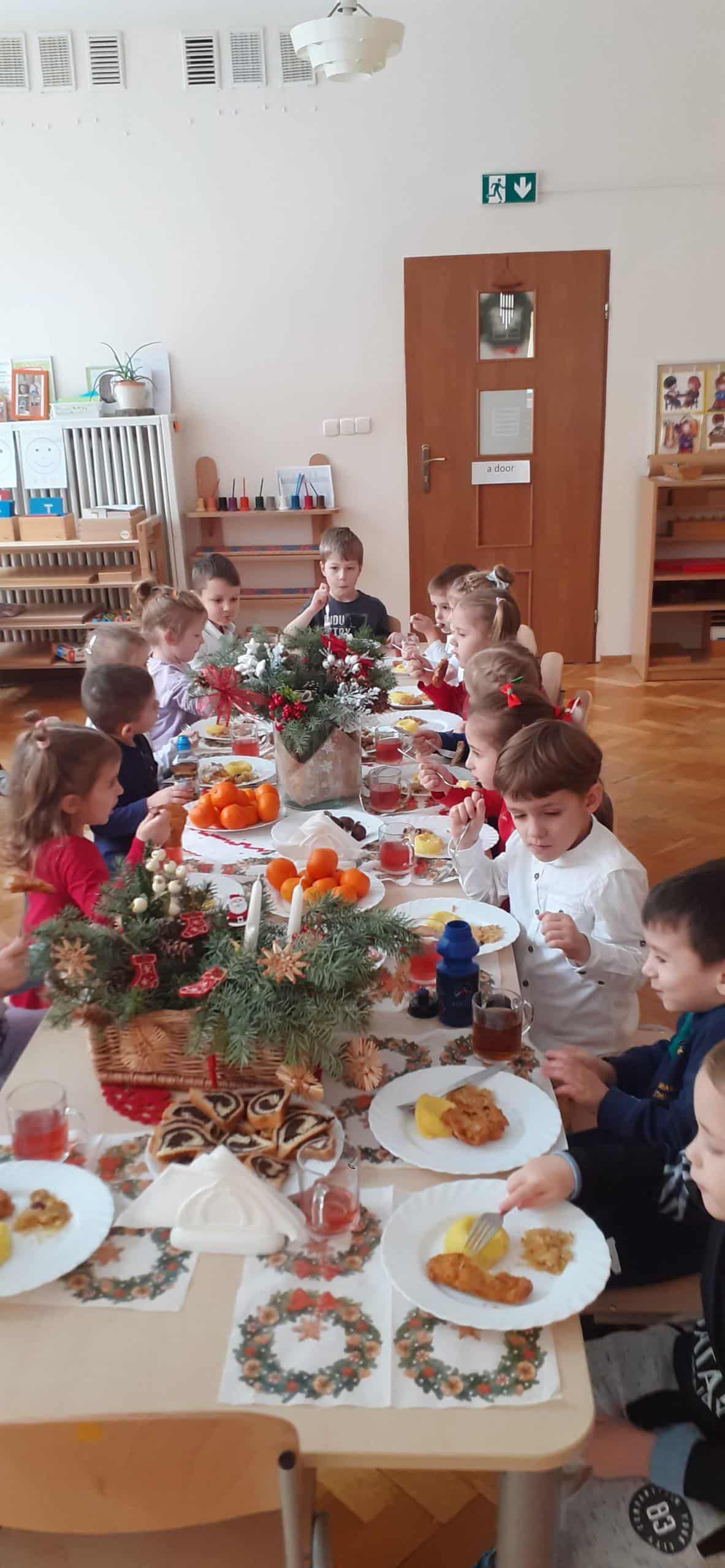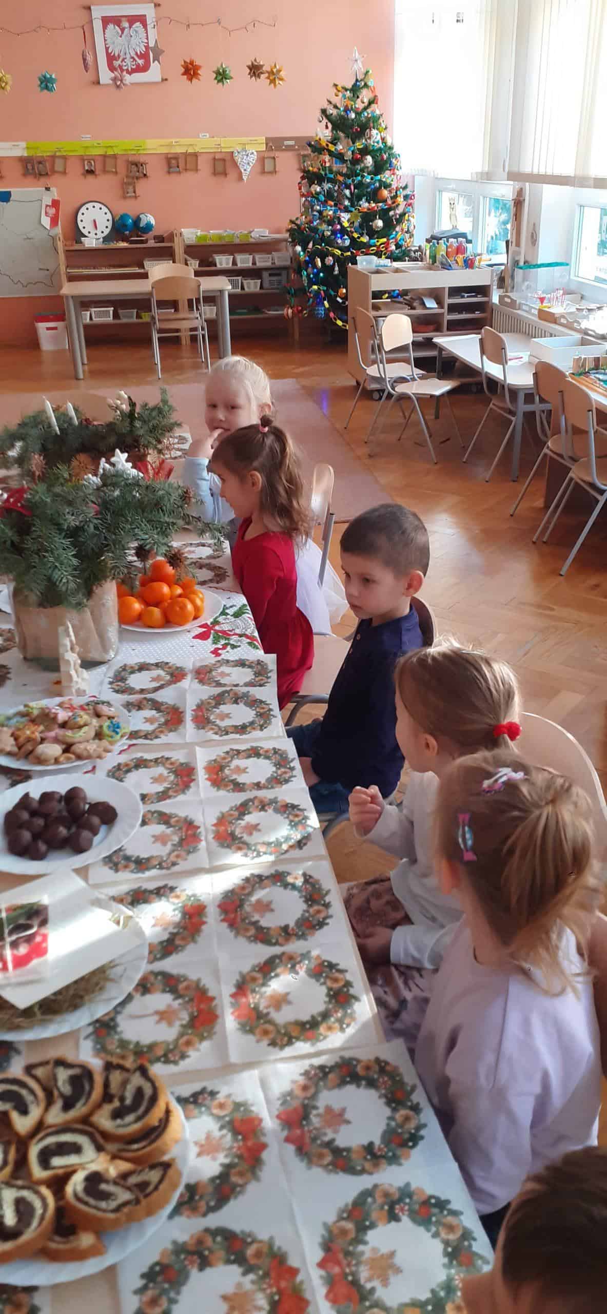 Czas przygotowania do świąt Bożego Narodzenia jest zwykle bardzo intensywnym okresem. Rozpoczynamy go od zawieszenia kalendarza adwentowego i odliczania ile dni zostało do Bożego Narodzenia. W tym czasie realizujemy tzw. godzinki adwentowe, stroimy choinkę, poznajemy historię kartek świątecznych, sami wykonujemy kartki świąteczne, ozdoby choinkowe stroiki na stół. Poznajemy zwyczaje świąteczne dawniej i dziś. Bardzo pomocna okazała się wiedza zawarta w Księdze Bożego Narodzenia jak i Encyklopedia Tradycji Polskiej. W tym czasie odbywamy także spotkanie opłatkowe w przedszkolu. Poprzedzone jest ono zwykle jasełkami w wykonaniu dzieci. Rano zgodnie z tradycją przygotowujemy odświętny stół, a dzieci aktywnie w tym uczestniczą. Pielęgnowanie tradycji związanej ze świętami Bożego Narodzenia jest bardzo ważne, to wyjątkowy czas dla całej społeczności przedszkolnej.