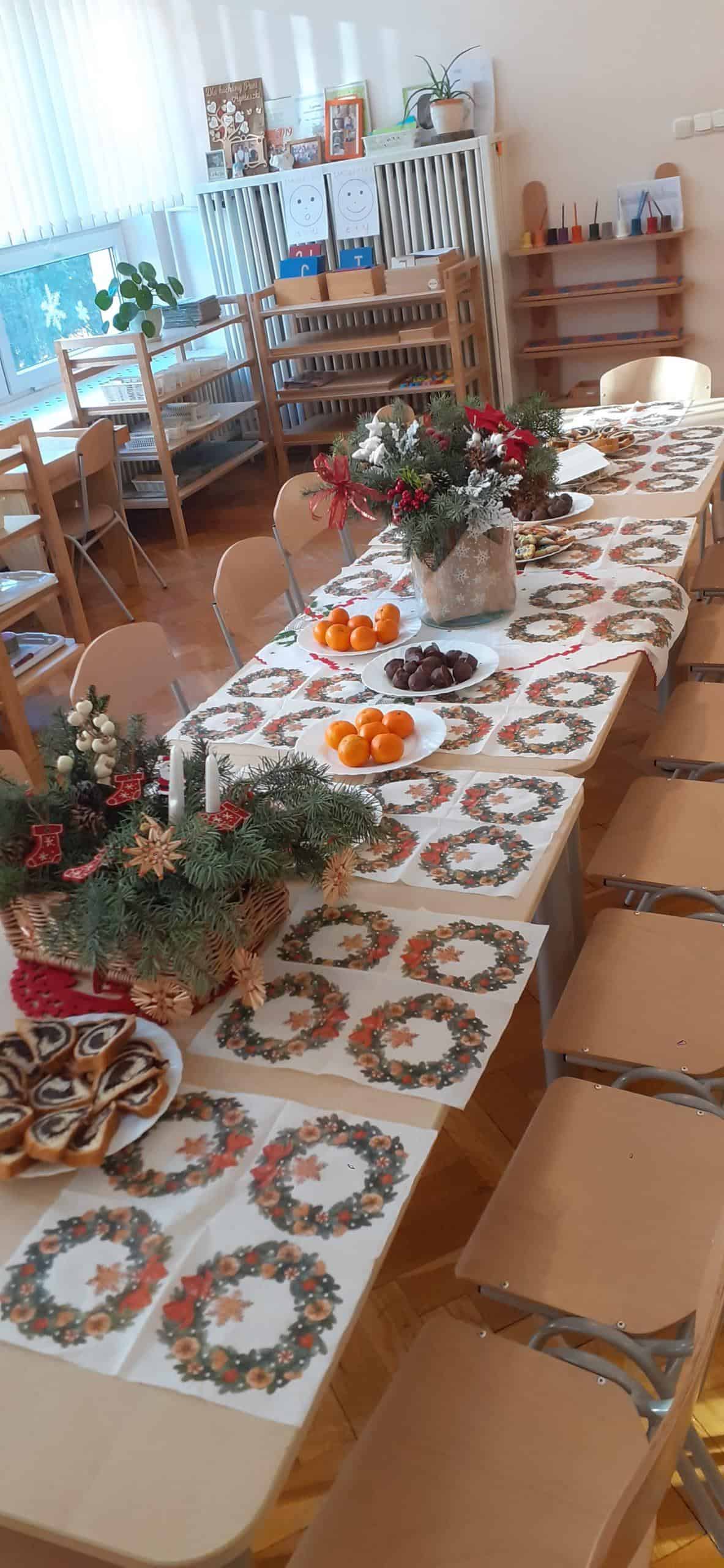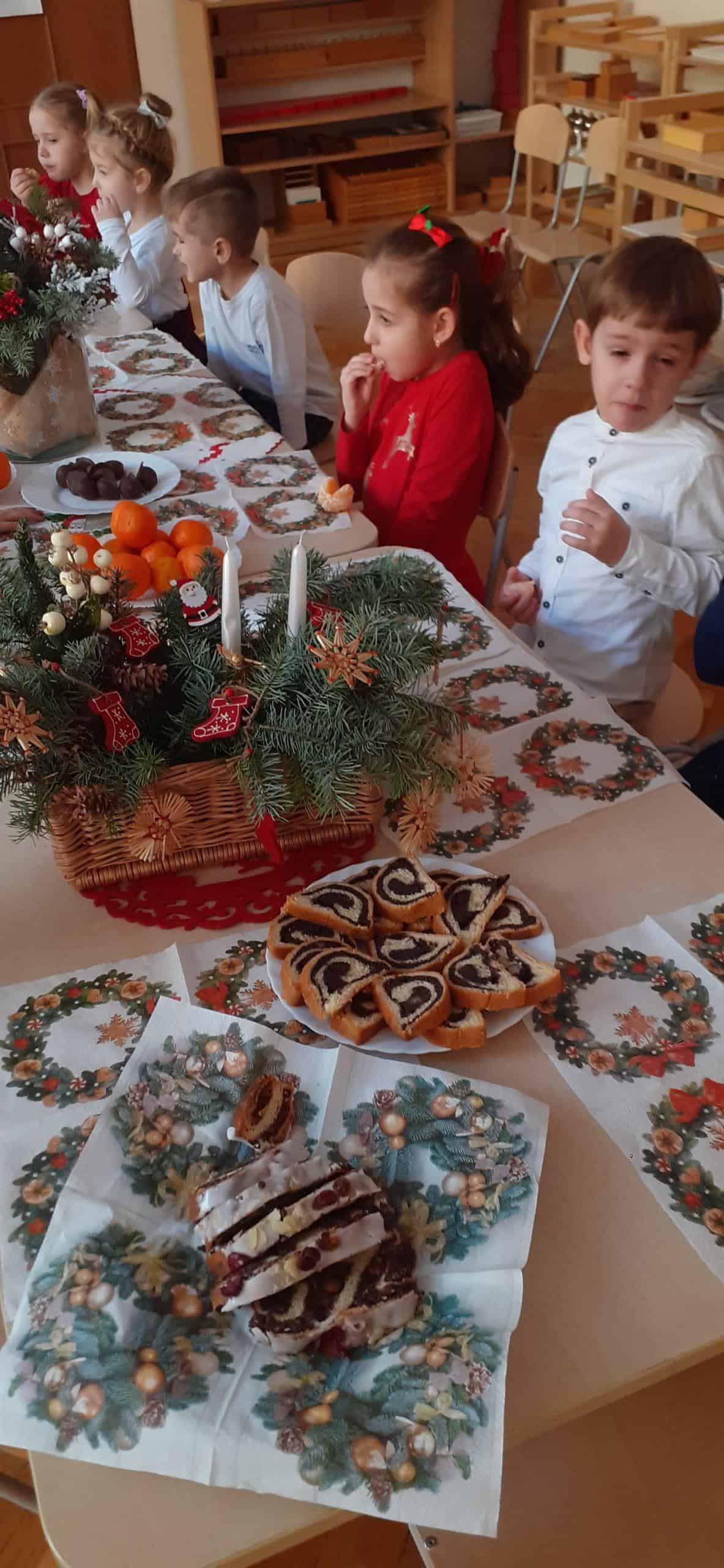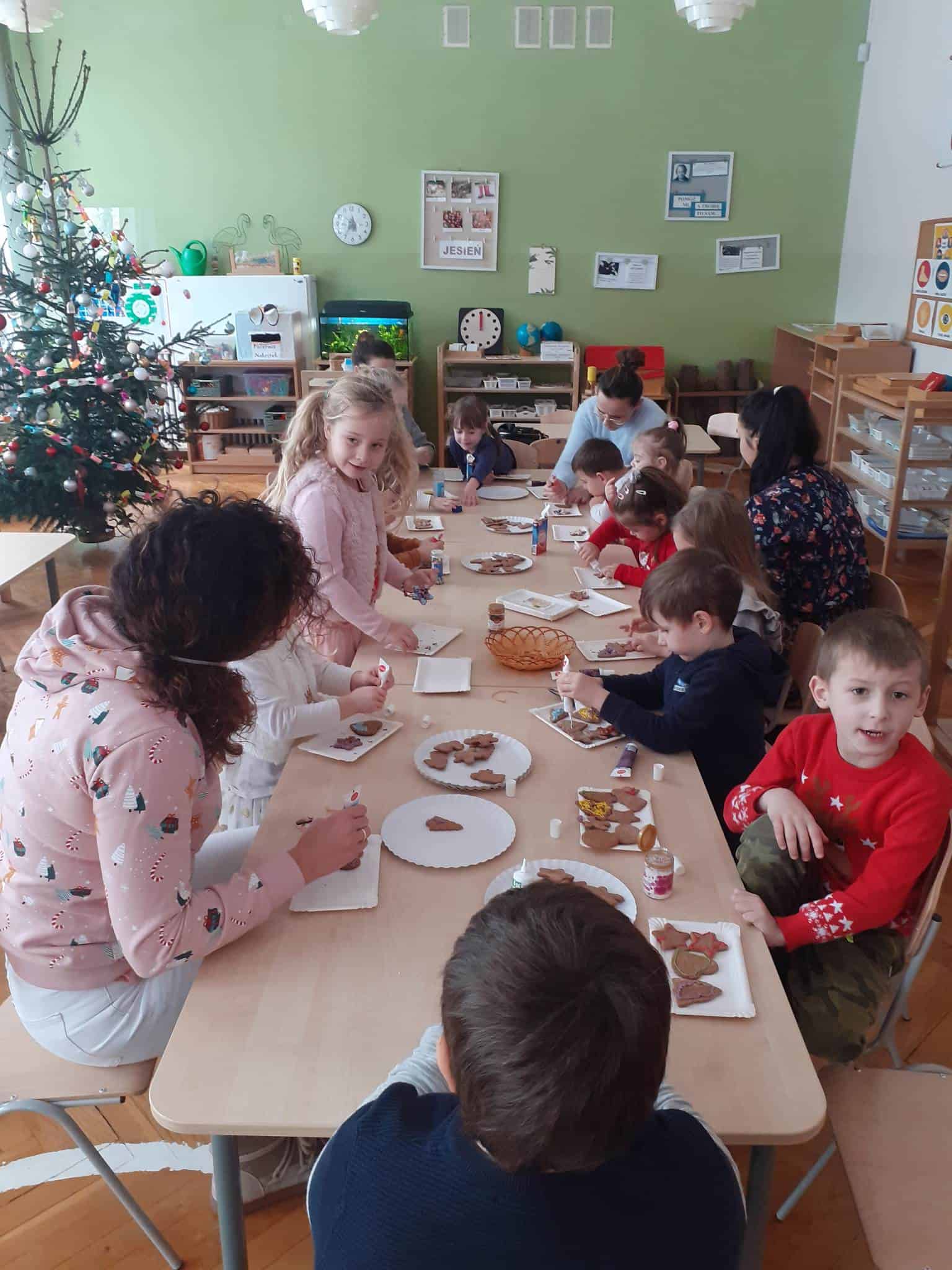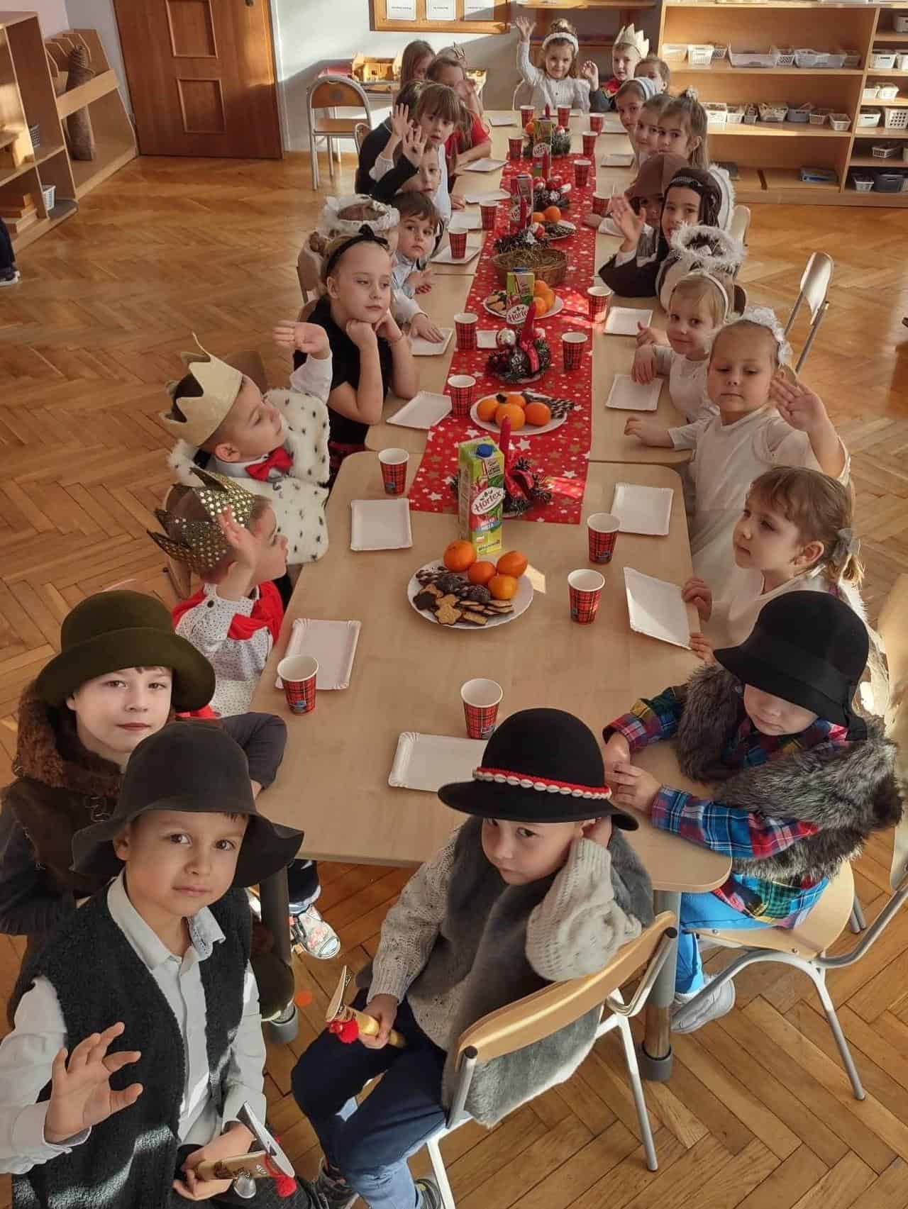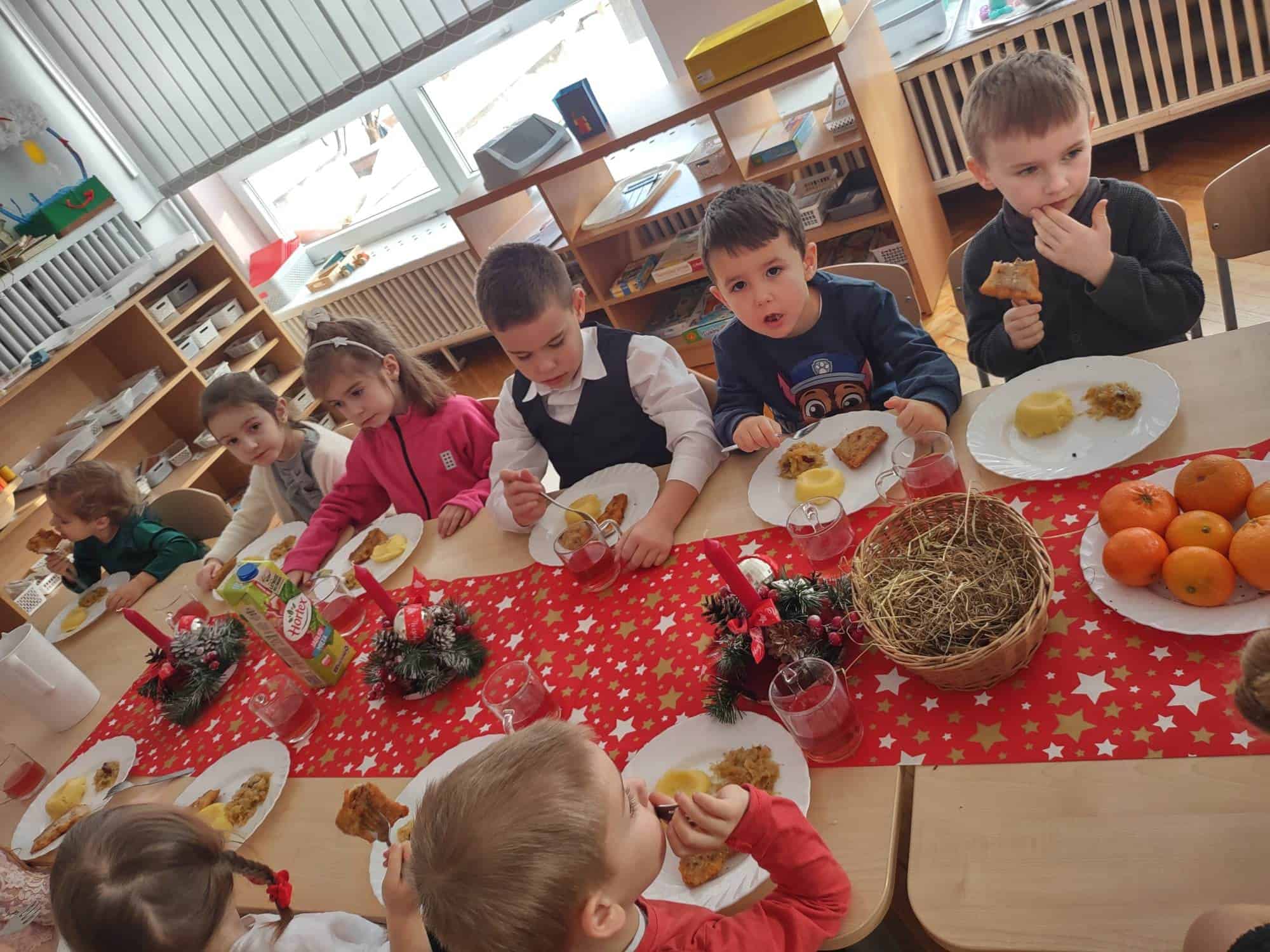 Czas przygotowania do świąt Bożego Narodzenia jest zwykle bardzo intensywnym okresem. Rozpoczynamy go od zawieszenia kalendarza adwentowego i odliczania ile dni zostało do Bożego Narodzenia. W tym czasie realizujemy tzw. godzinki adwentowe, stroimy choinkę, poznajemy historię kartek świątecznych, sami wykonujemy kartki świąteczne, ozdoby choinkowe stroiki na stół. Poznajemy zwyczaje świąteczne dawniej i dziś. Bardzo pomocna okazała się wiedza zawarta w Księdze Bożego Narodzenia jak i Encyklopedia Tradycji Polskiej. W tym czasie odbywamy także spotkanie opłatkowe w przedszkolu. Poprzedzone jest ono zwykle jasełkami w wykonaniu dzieci. Rano zgodnie z tradycją przygotowujemy odświętny stół, a dzieci aktywnie w tym uczestniczą. Pielęgnowanie tradycji związanej ze świętami Bożego Narodzenia jest bardzo ważne, to wyjątkowy czas dla całej społeczności przedszkolnej.