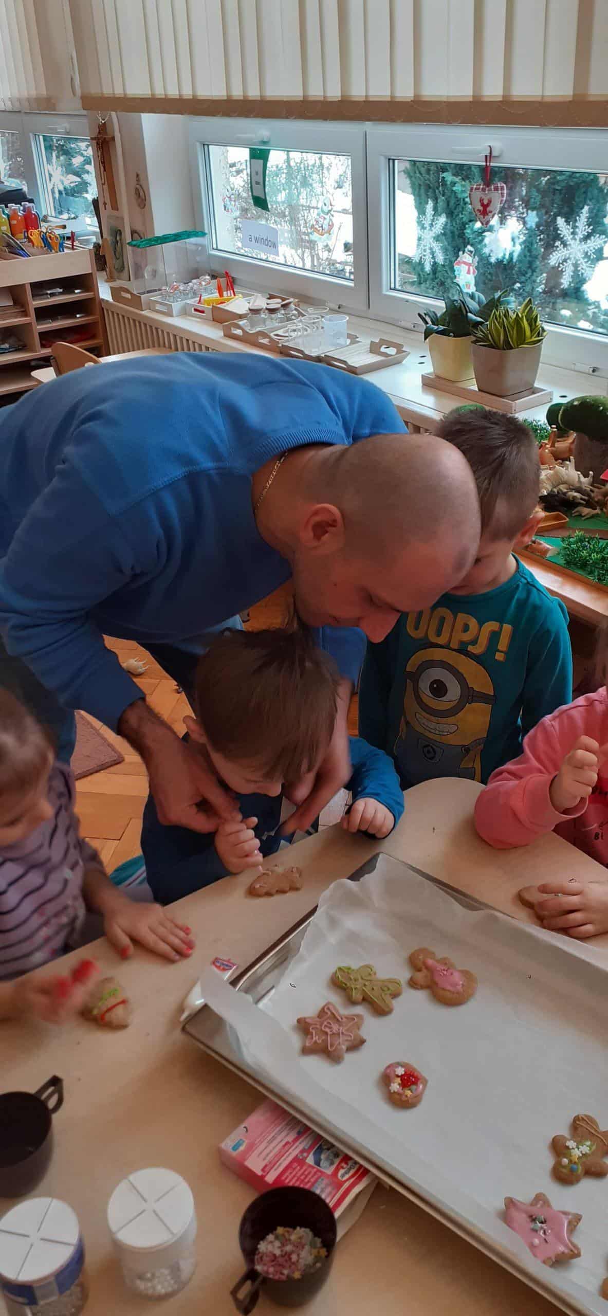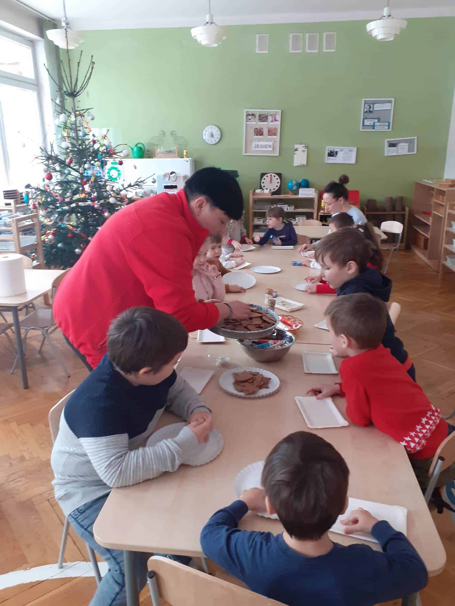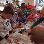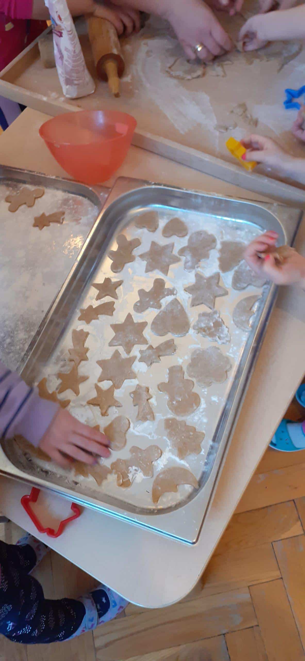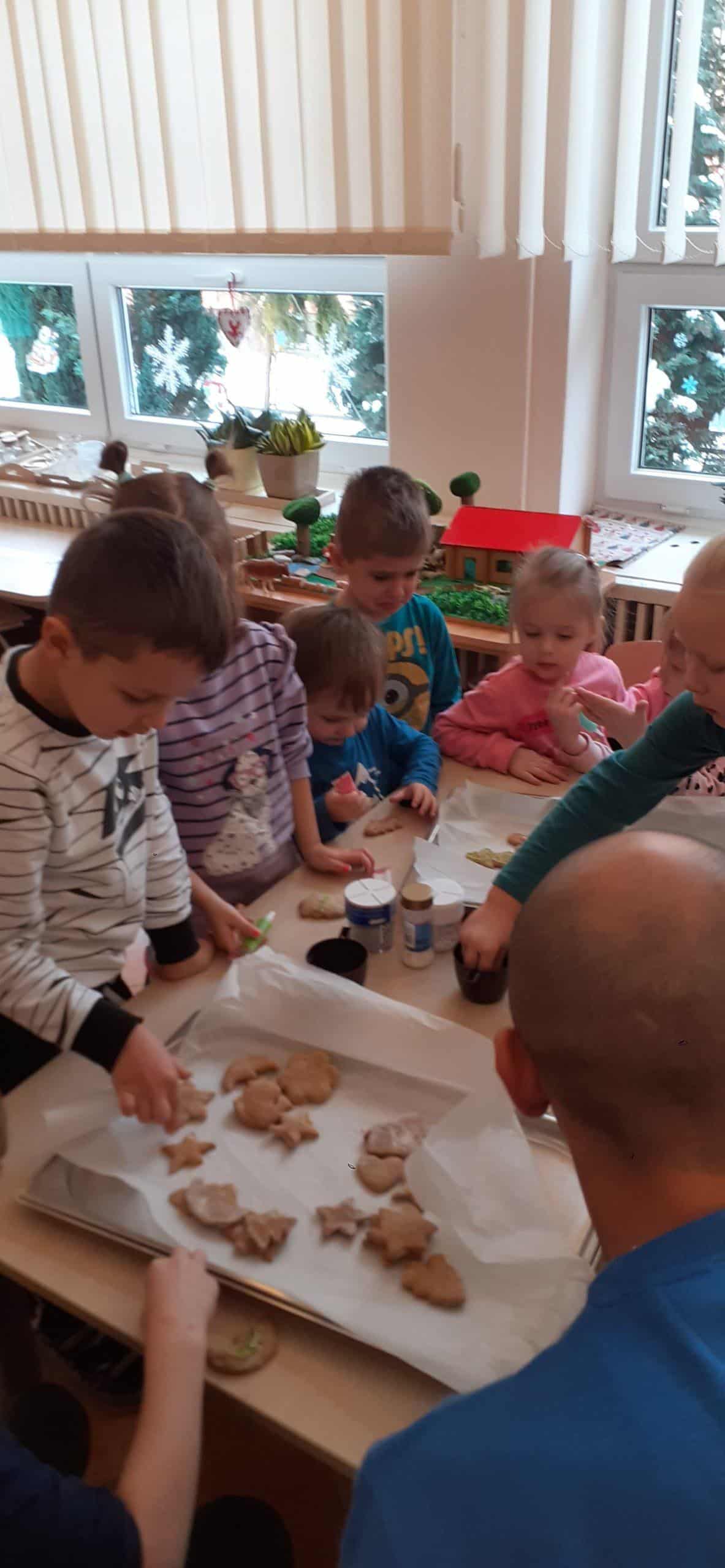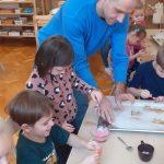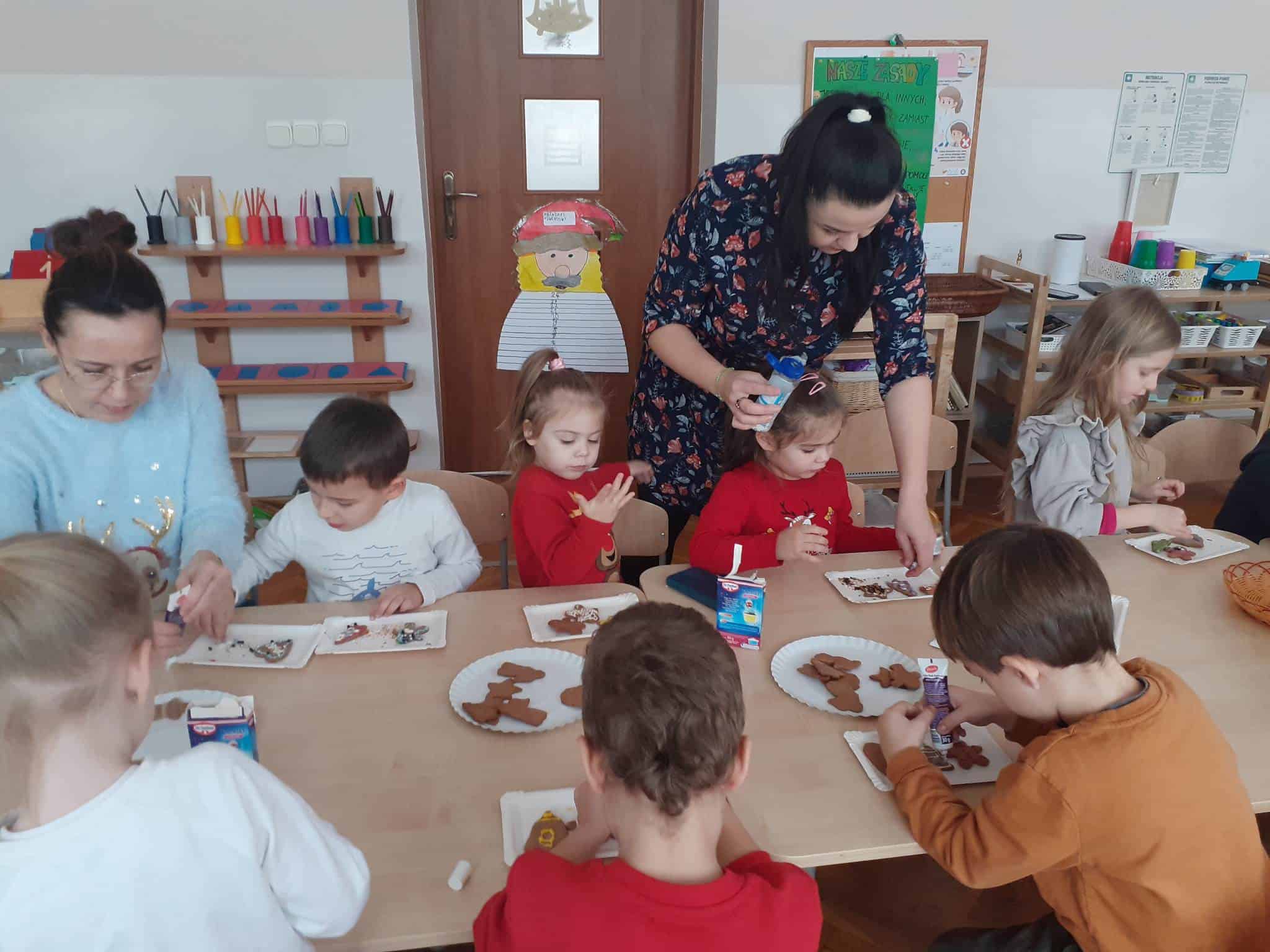 Wypiek pierników tuż przed świętami Bożego Narodzenia stał się już tradycją naszej grupy. W tym roku nie mogło być inaczej – zapach pieczonych pierników roznosił się po naszym przedszkolu. Nazwa ciastek pochodzi od pieprzu i pikantnych, korzennych przypraw. Najstarszy Polski przepis pochodzi z XVII wieku i został zapisany w poradniku medycznym jako specyfik na przeziębienie i niestrawności. Pieczenie pierników to ulubione zajęcie dzieci przed świętami Bożego Narodzenia. Tym razem też towarzyszyli nam Rodzice. Dzieci doskonale wiedziały jakie składniki trzeba wymieszać, aby powstały pierniki. Powstały miękkie i aromatyczne ciasteczka, które potem ozdobiono kolorowym lukrem, posypkami , gwiazdeczkami. To była dobra zabawa i zapowiedź świątecznego nastroju. Dziękuję Rodzicom Antka, Klary , Wiktora i Nikodema za udział w zajęciach i aktywne wspieranie dzieci.