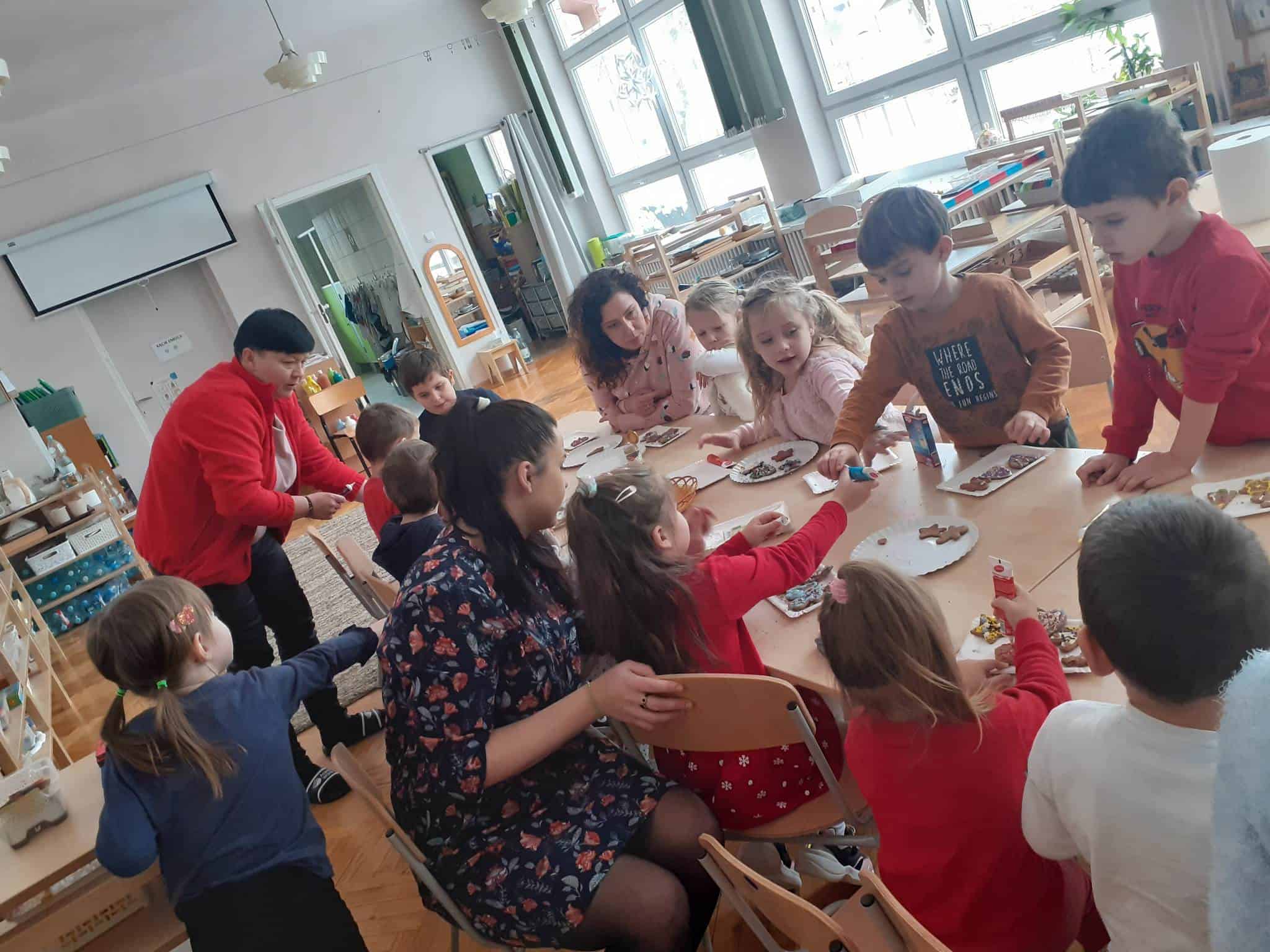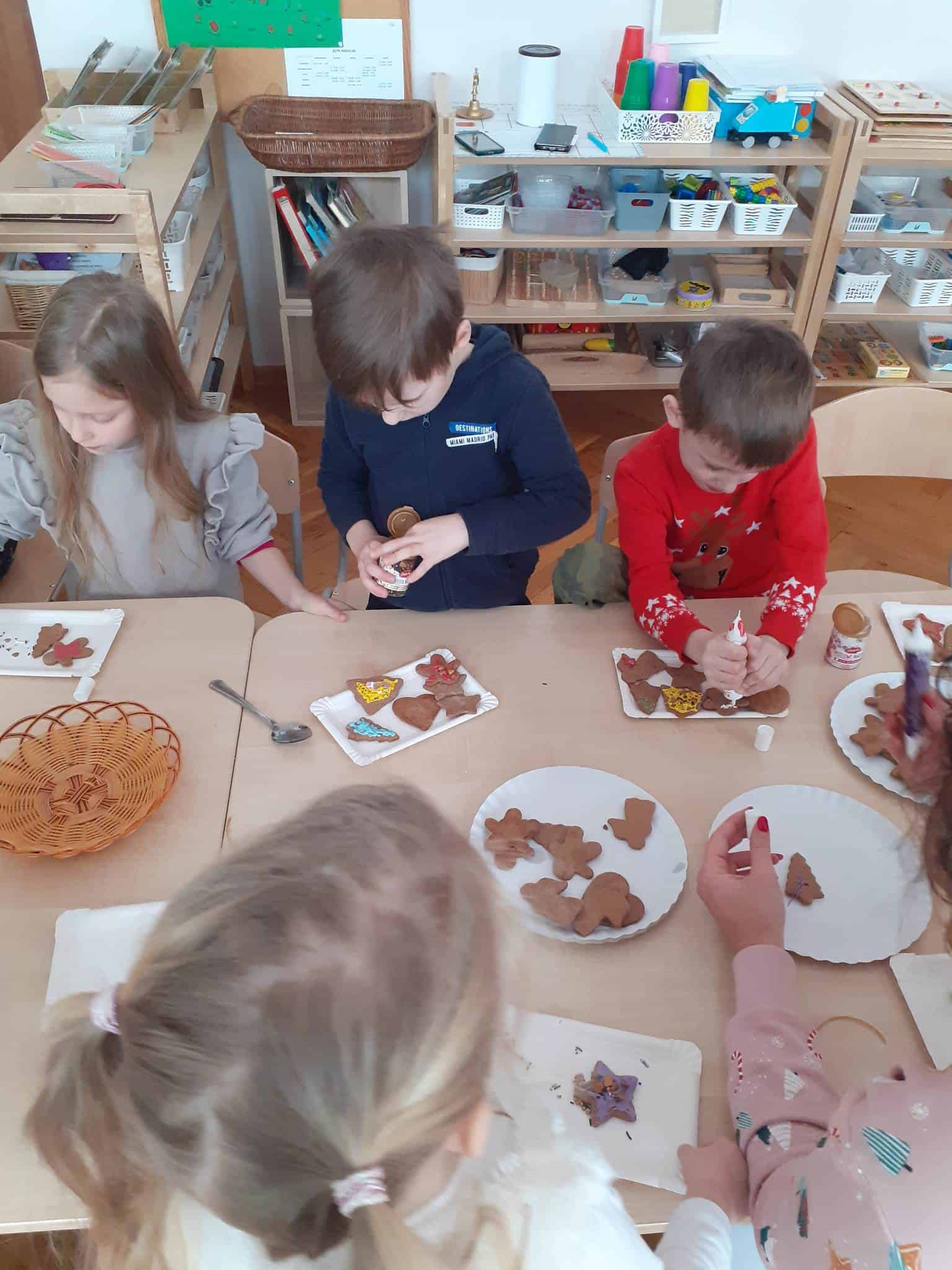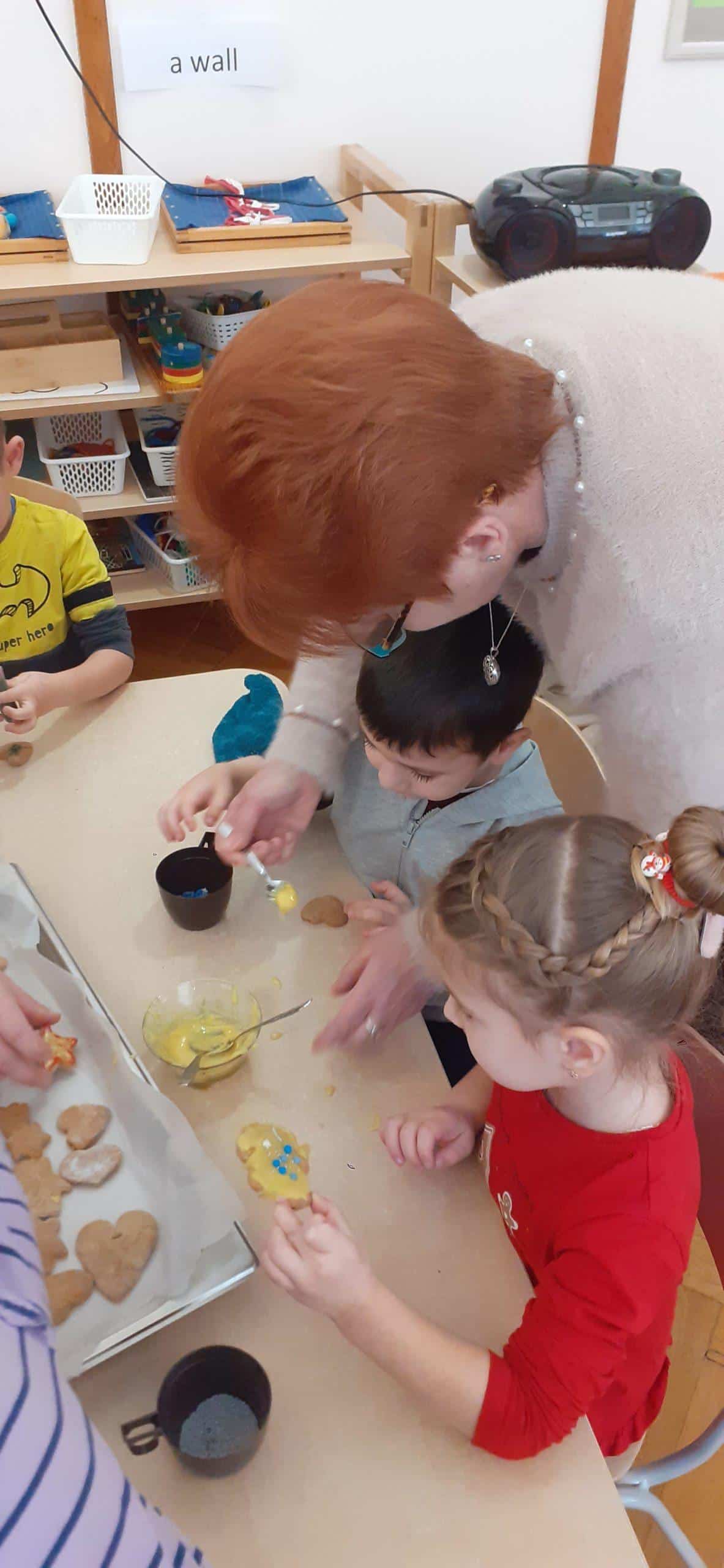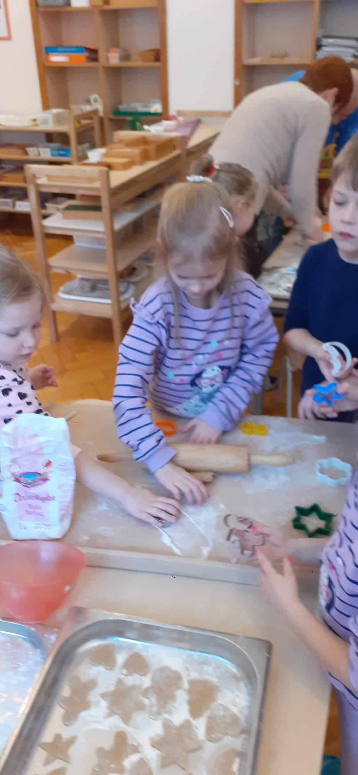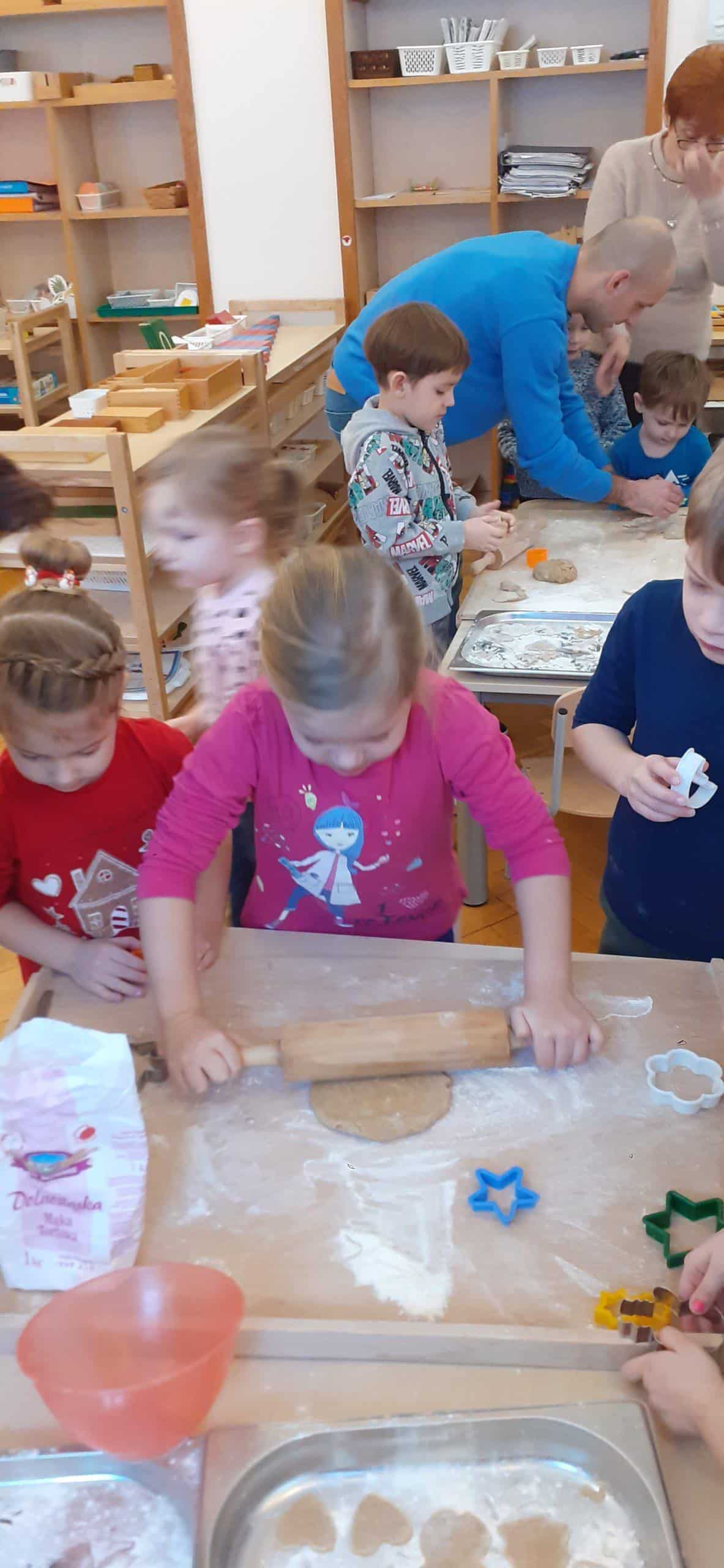 Wypiek pierników tuż przed świętami Bożego Narodzenia stał się już tradycją naszej grupy. W tym roku nie mogło być inaczej – zapach pieczonych pierników roznosił się po naszym przedszkolu. Nazwa ciastek pochodzi od pieprzu i pikantnych, korzennych przypraw. Najstarszy Polski przepis pochodzi z XVII wieku i został zapisany w poradniku medycznym jako specyfik na przeziębienie i niestrawności. Pieczenie pierników to ulubione zajęcie dzieci przed świętami Bożego Narodzenia. Tym razem też towarzyszyli nam Rodzice. Dzieci doskonale wiedziały jakie składniki trzeba wymieszać, aby powstały pierniki. Powstały miękkie i aromatyczne ciasteczka, które potem ozdobiono kolorowym lukrem, posypkami , gwiazdeczkami. To była dobra zabawa i zapowiedź świątecznego nastroju. Dziękuję Rodzicom Antka, Klary , Wiktora i Nikodema za udział w zajęciach i aktywne wspieranie dzieci.