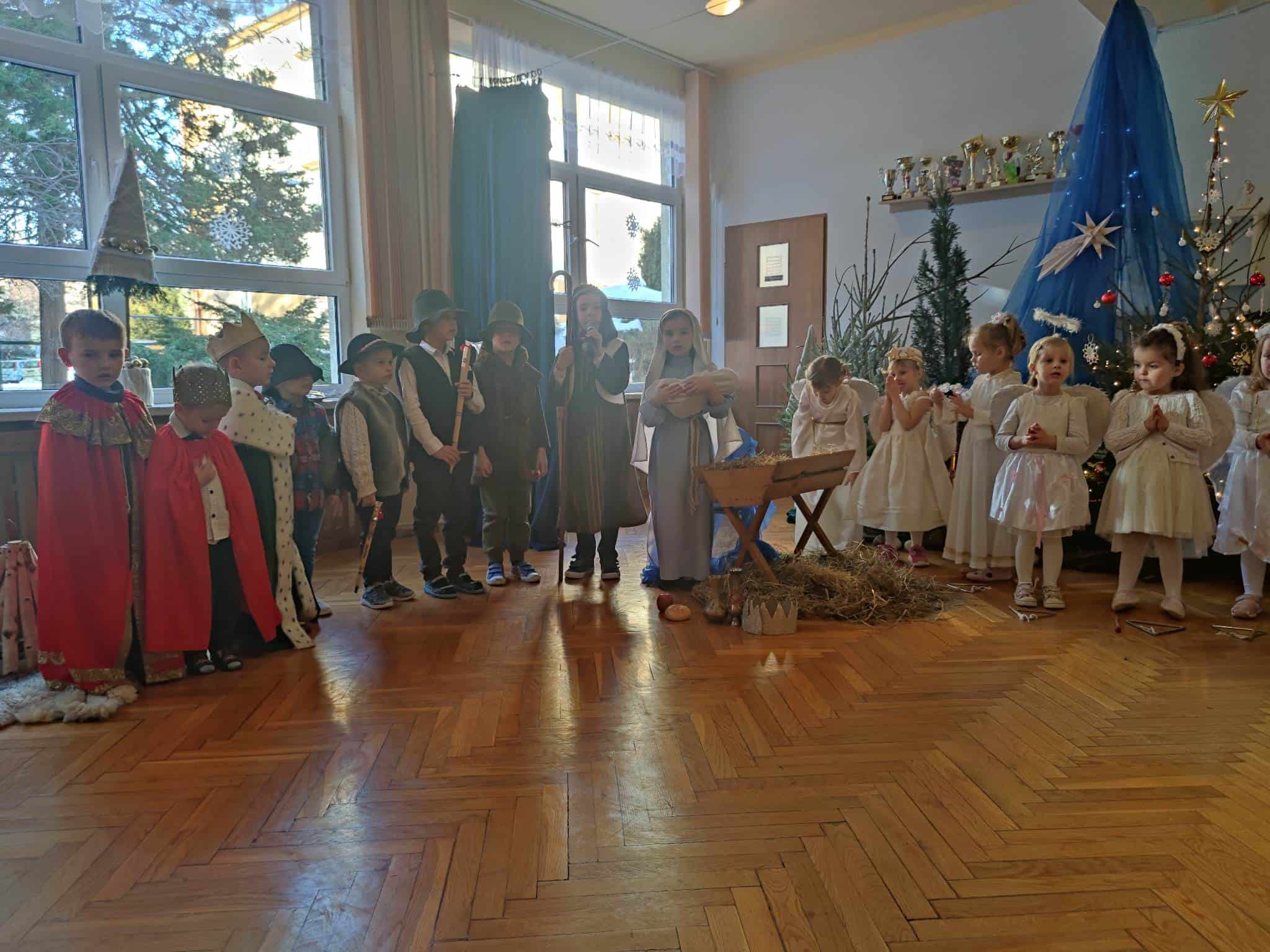 Wigilia Bożego Narodzenia to jeden z najpiękniejszych dni w roku, dlatego w naszej przedszkolnej społeczności przeżywamy go bardzo uroczyście. W tym dniu w każdej grupie, jak i w całym przedszkolu, już od samego rana panowała radosna, ożywiona atmosfera. Dzieci bardzo chętnie pomagały w przygotowaniach. Wspólnie nakrywały do stołu, ustawiały krzesła, rozkładały serwetki. O wyznaczonej godzinie wszystkie grupy zebrały się w holu naszego przedszkola, aby wziąć udział w uroczystej godzince adwentowej, przygotowanej przez Grupę Czerwoną z gościnnym udziałem dzieci z Grupy Zielonej i Pomarańczowej. Godzinka ta miała formę przedstawienia jasełkowego i swoją tematyką nawiązywała do historii narodzenia Pana Jezusa.