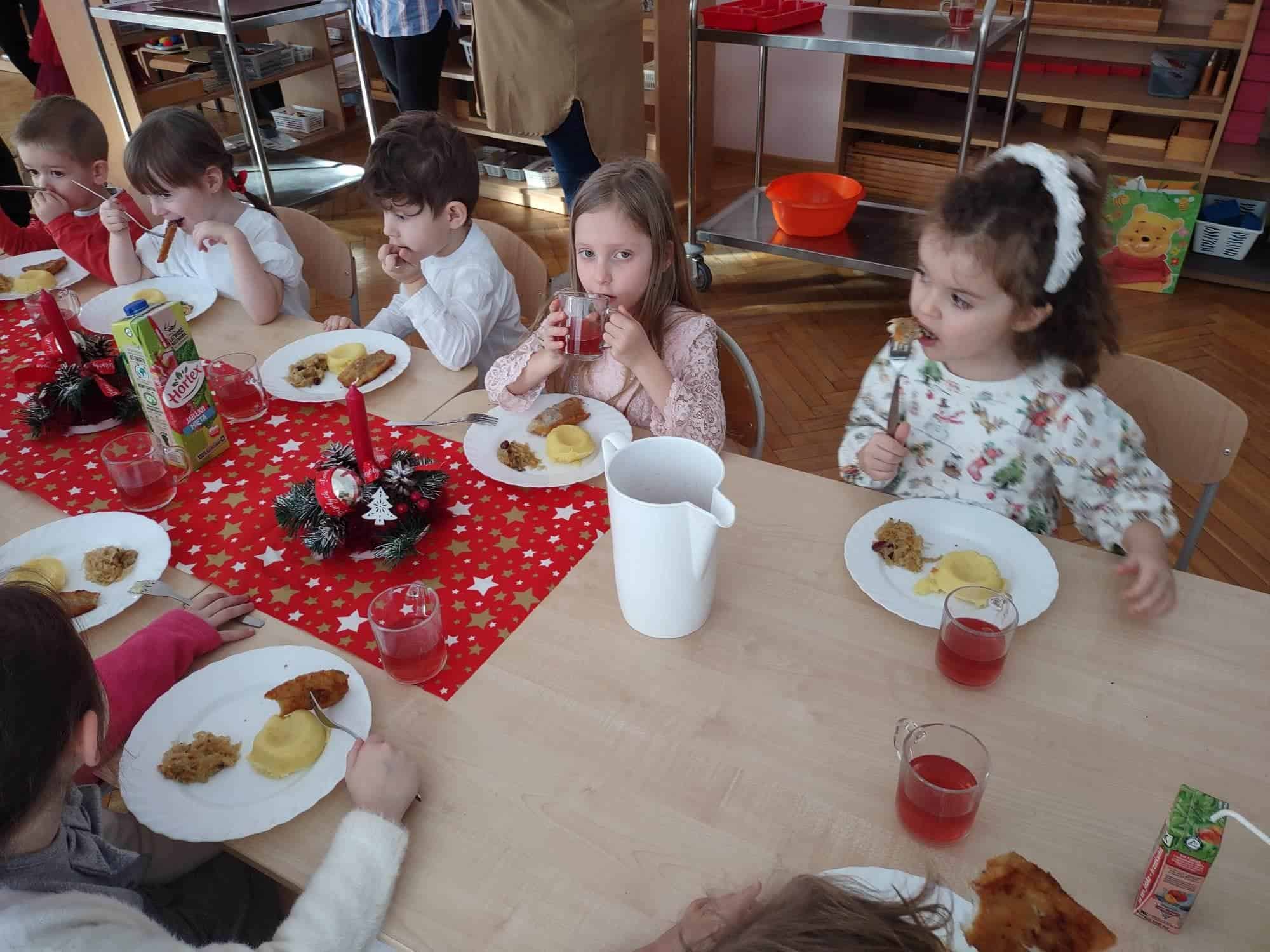 Po występie, Pani Dyrektor złożyła dzieciom, rodzicom i wszystkim pracownikom przedszkola najlepsze, bożonarodzeniowe i noworoczne życzenia, po czym wspólnie dzielono się opłatkiem, składając sobie przy tym najserdeczniejsze życzenia. Po opłatku wszyscy zasiedli przy stole, aby posmakować tradycyjnej zupy grzybowej i wigilijnej ryby. Na naszym stole nie zabrakło także pysznych, świątecznych słodkości, za przygotowanie których serdecznie dziękujemy mamusiom z trójek grupowych.