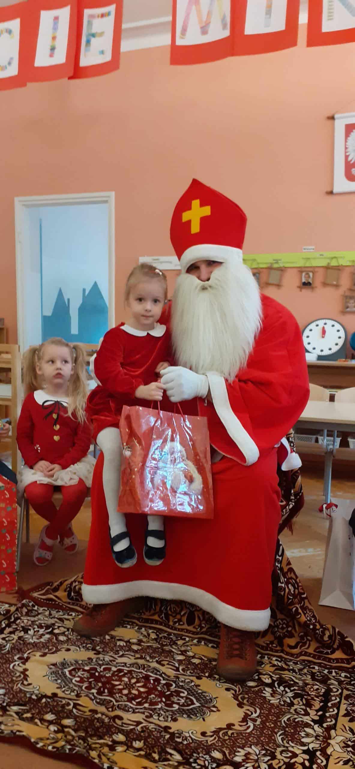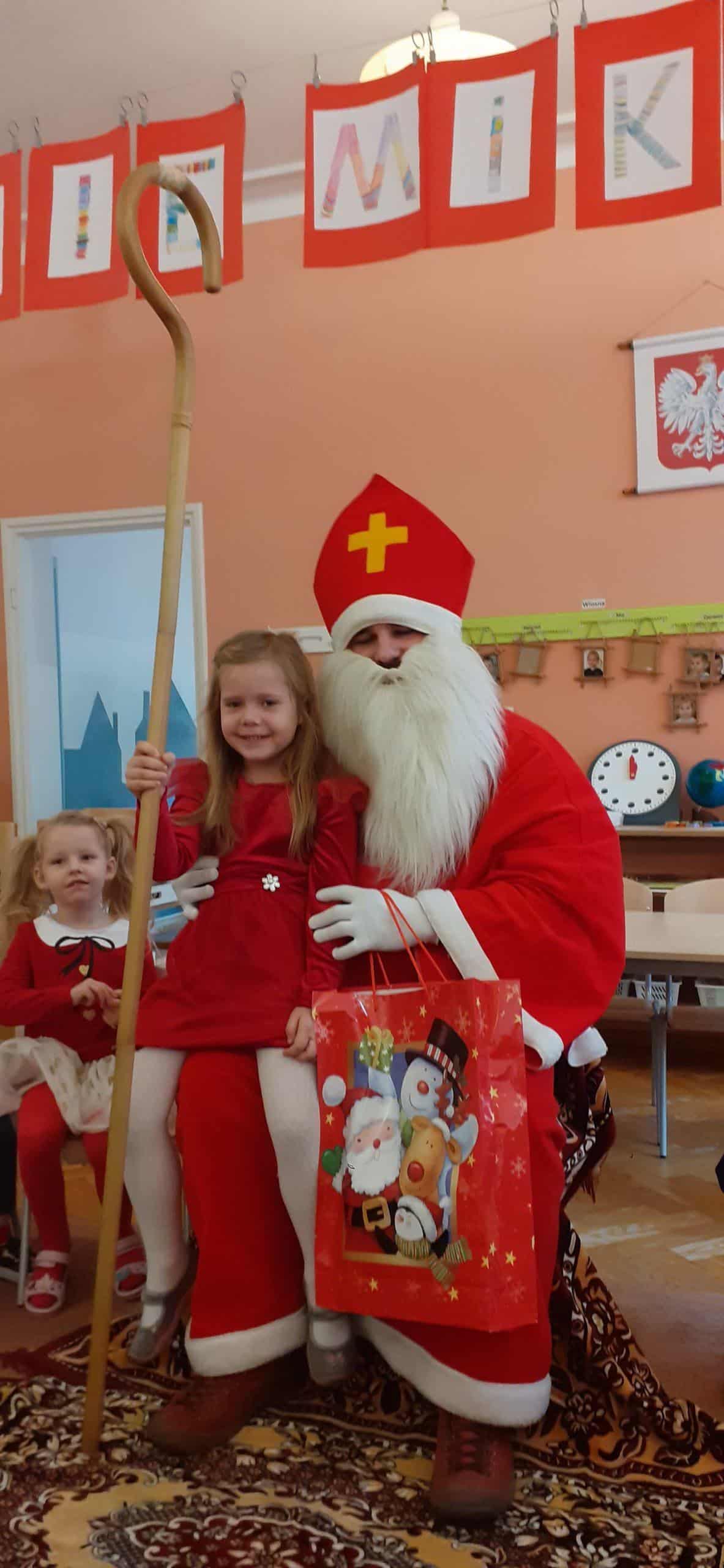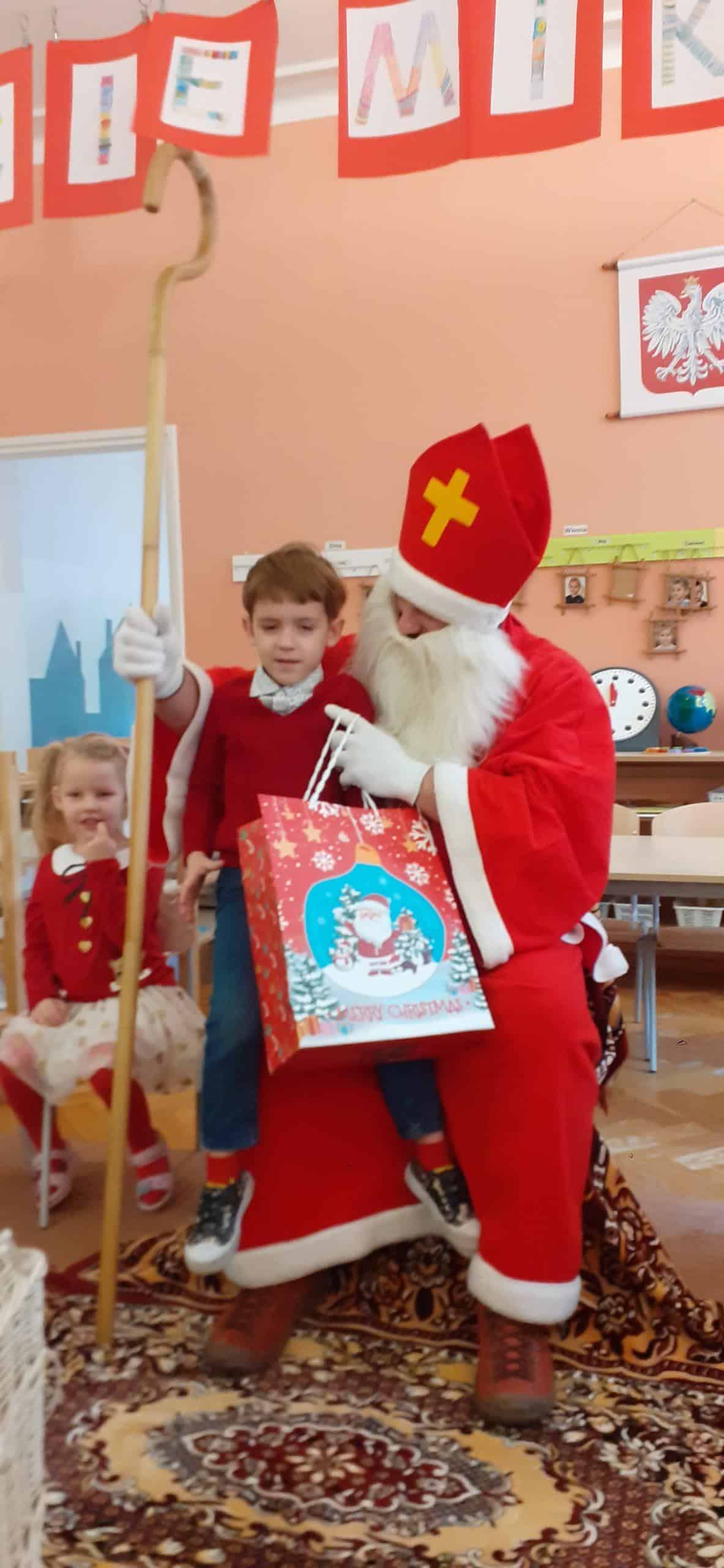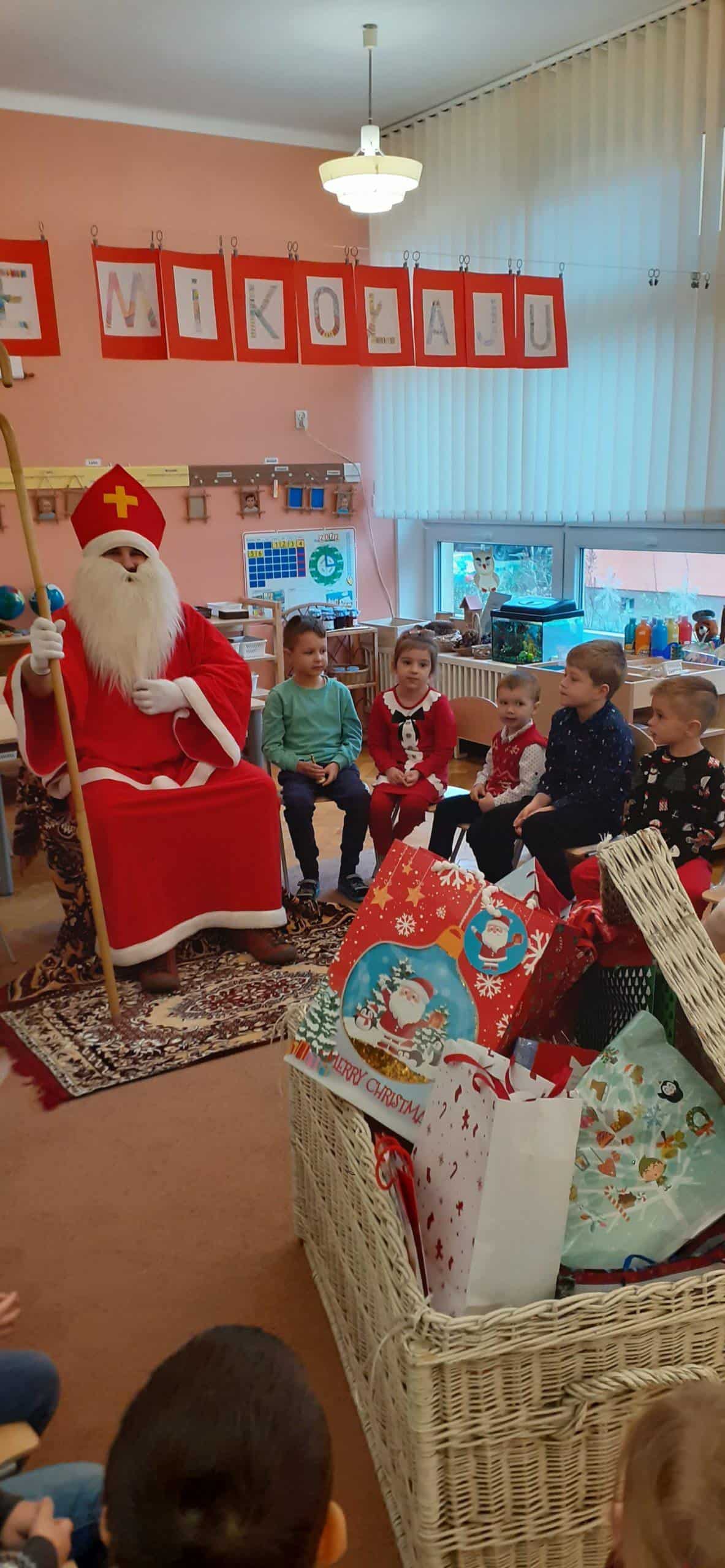 Od rana w całym przedszkolu ogromne poruszenie, wszyscy czekali na wizytę świętego Mikołaja. W odświętnych ubraniach dzieci oczywiście dominował kolor czerwony. Dzień wcześniej dzieci przygotowały piękny powitalny napis „Witamy Cię święty Mikołaju” oraz przygotowały wygodny tron. Zaraz po śniadaniu rozległ się dźwięk dzwoneczka- wszystkie dzieci zareagowały na niego bardzo emocjonalnie. Zaśpiewały powitalną piosenkę. Pojawienie się Mikołaja w sali zajęć zaparło dzieciom dech w piersiach, nastała chwilowa cisza, wszyscy przyglądali się jemu z uwagą. Wyglądał bardzo dostojnie i dość szybko nawiązał z dziećmi serdeczny kontakt. Każde dziecko otrzymało wymarzony prezent, wszyscy byli zachwyceni. Iga w imieniu całej grupy razem z babcią upiekła przepyszne pierniczki i obdarowała nimi nie tylko Mikołaja, ale także inne dzieci. To bardzo serdeczny gest. Na koniec wykonano pamiątkowe zdjęcia indywidualnie i grupowo. A po południu kolejna niespodzianka, wizyta pani Dyrektor i mikołajkowy prezent – ogromny zestaw klocków „Lego Coding Ekspress”do nauki kodowania. Dzieci również były zachwycone. To kolejny wspaniały dzień w naszym przedszkolu. Dziękujemy mamusi Łukasza- pani Milenie za pomoc w organizacji wizyty świętego Mikołaja. To było fantastyczne spotkanie.